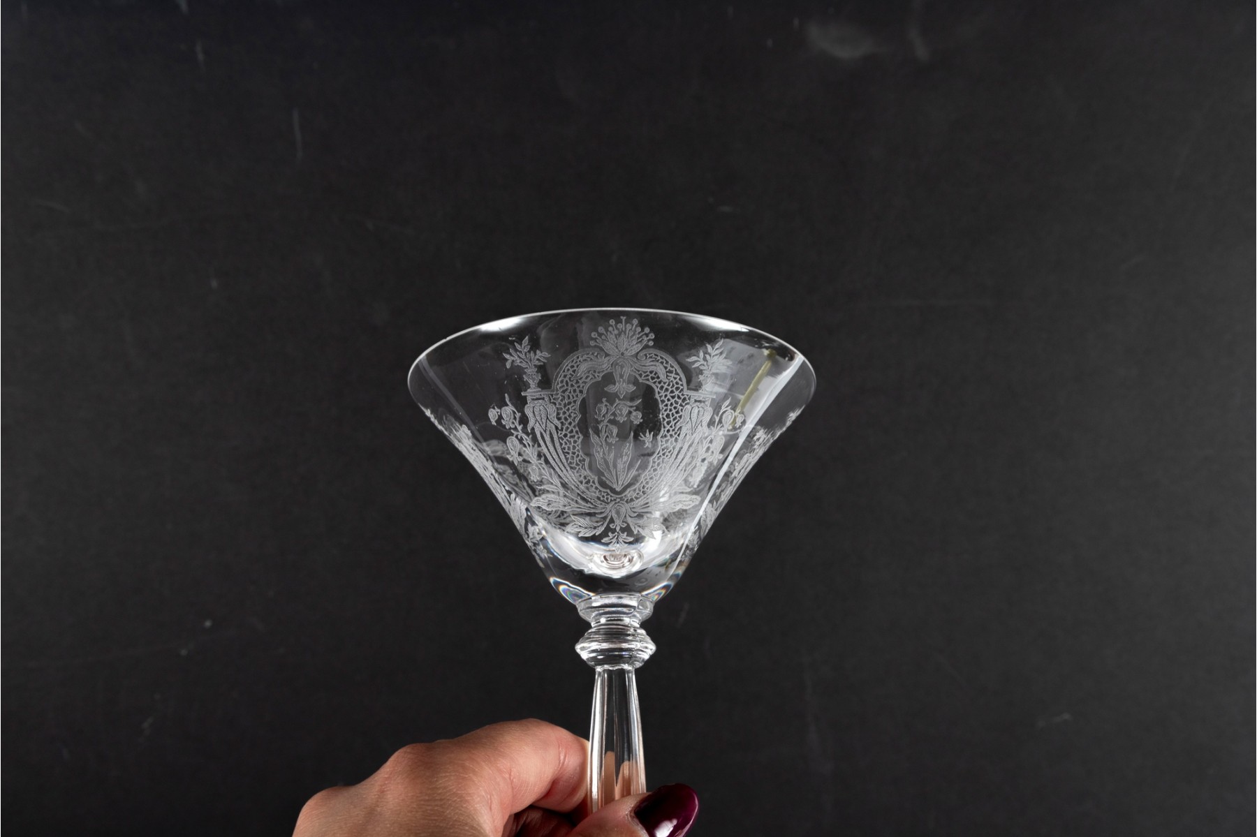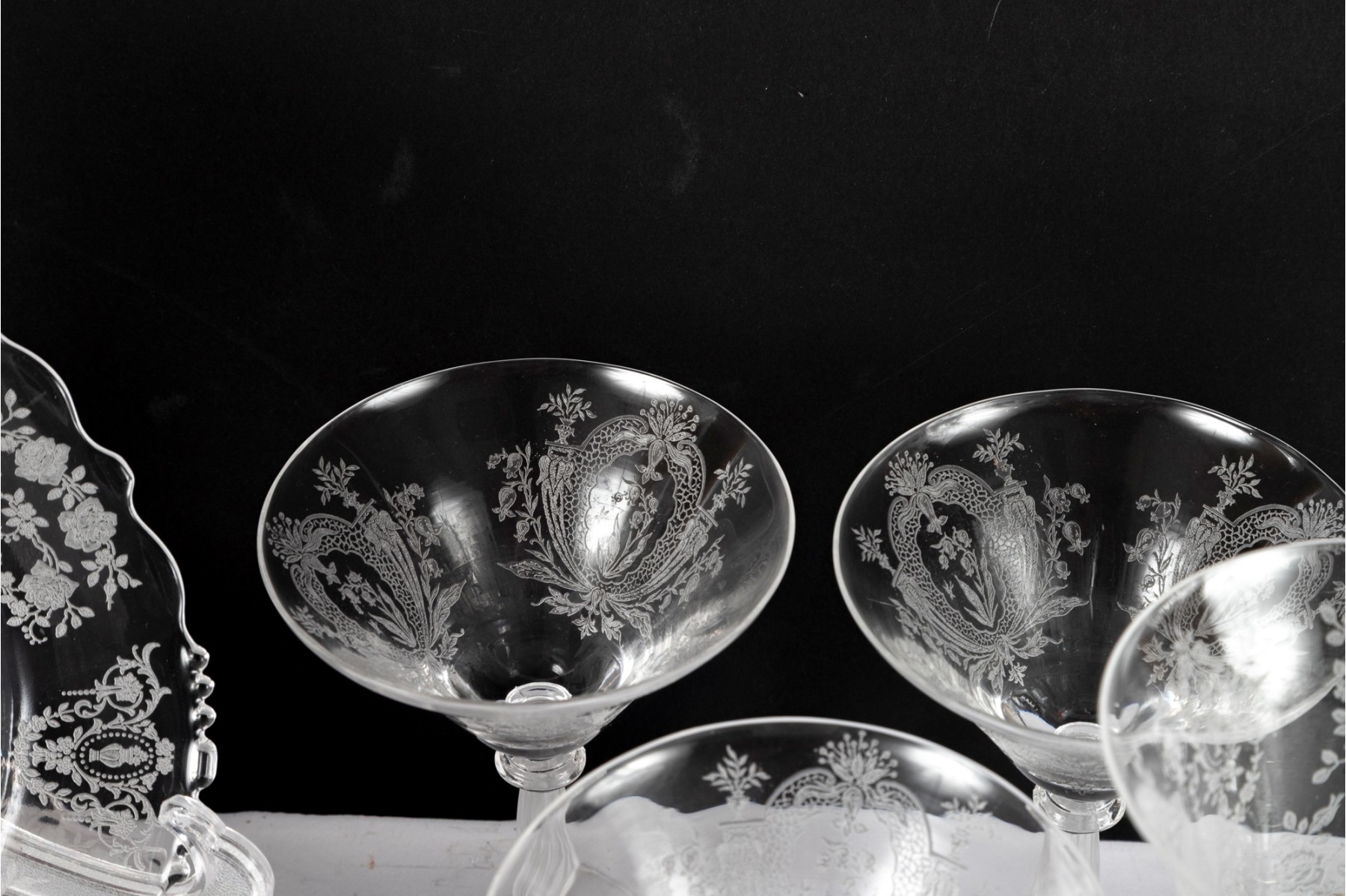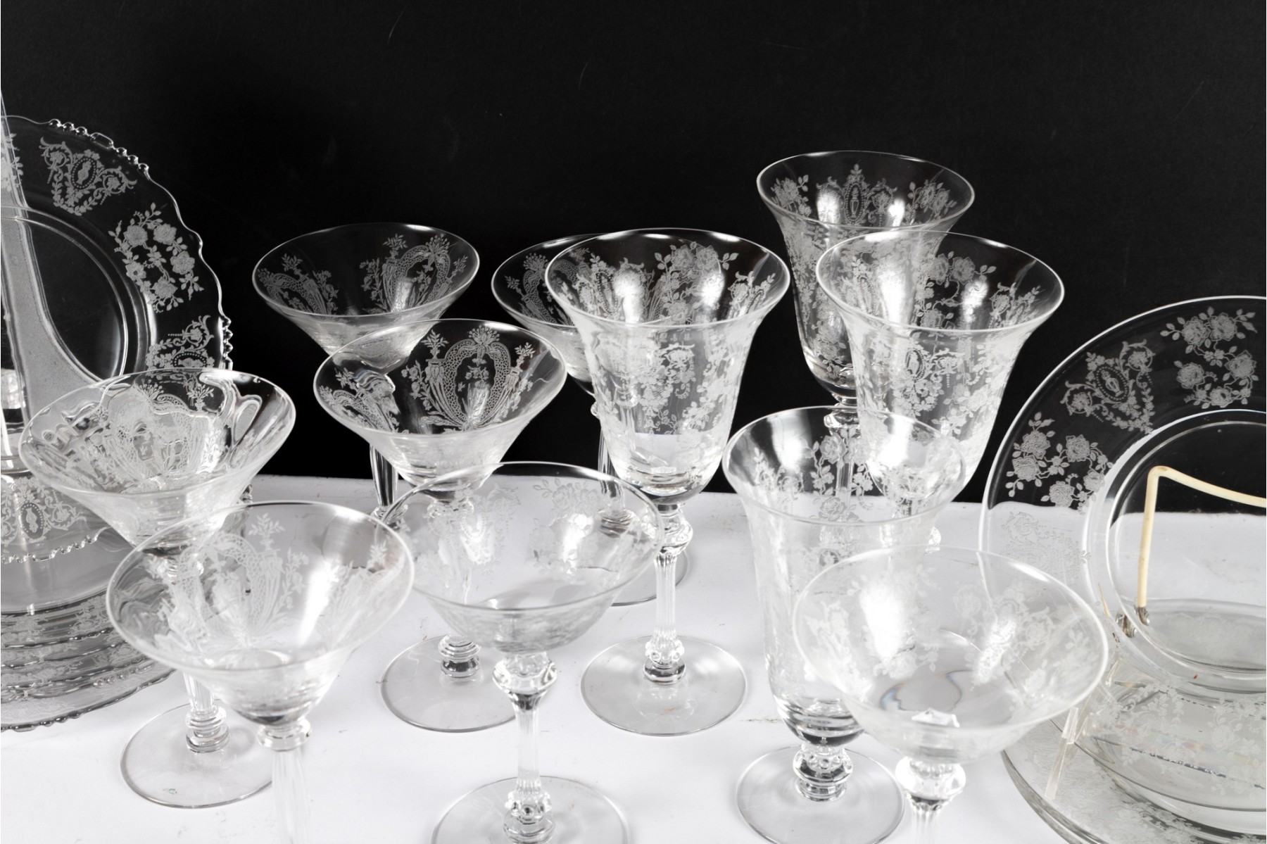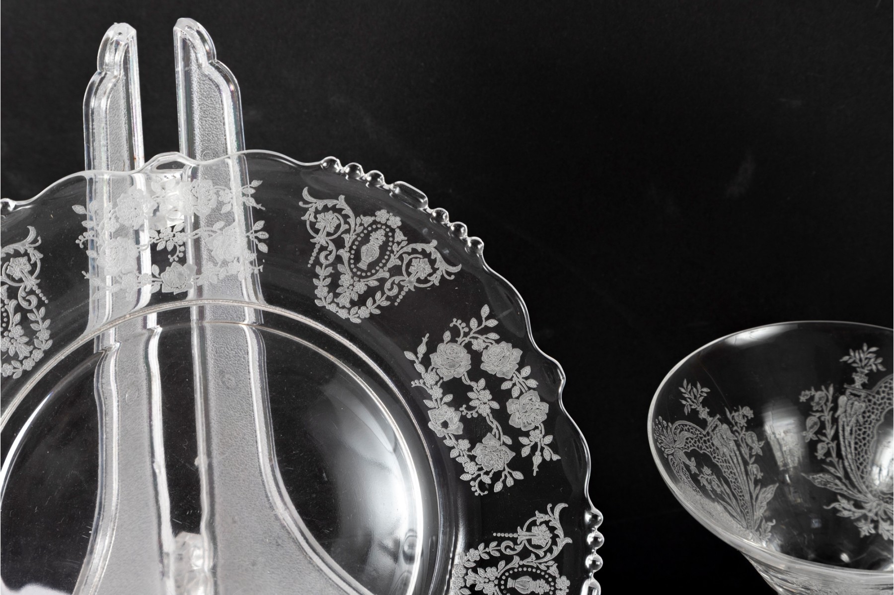 An excellent Tiffin-Franciscan "Cherokee Rose" pattern clear glass luncheon service with lavish etched foliate motifs, scrolled medallions, and beaded accents making for an elegant design. Contents as shown and sold as is.