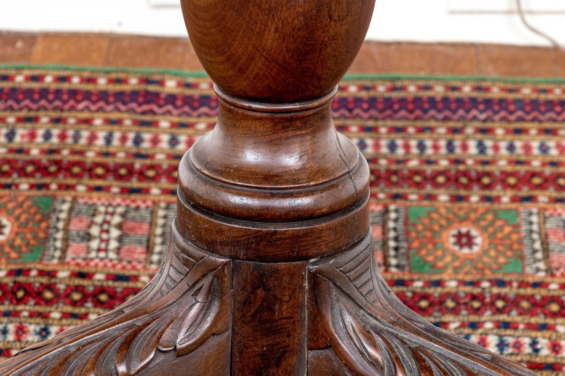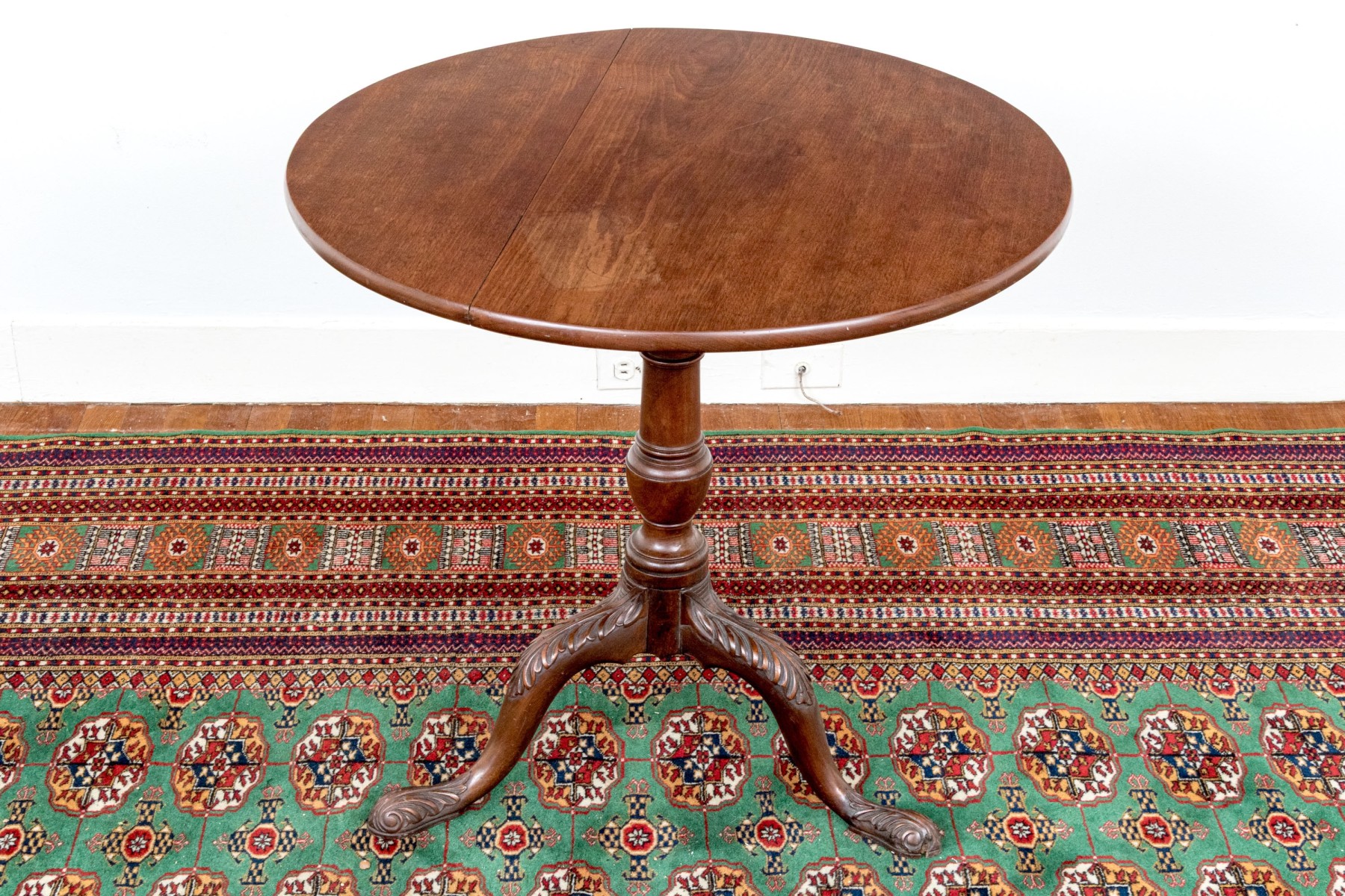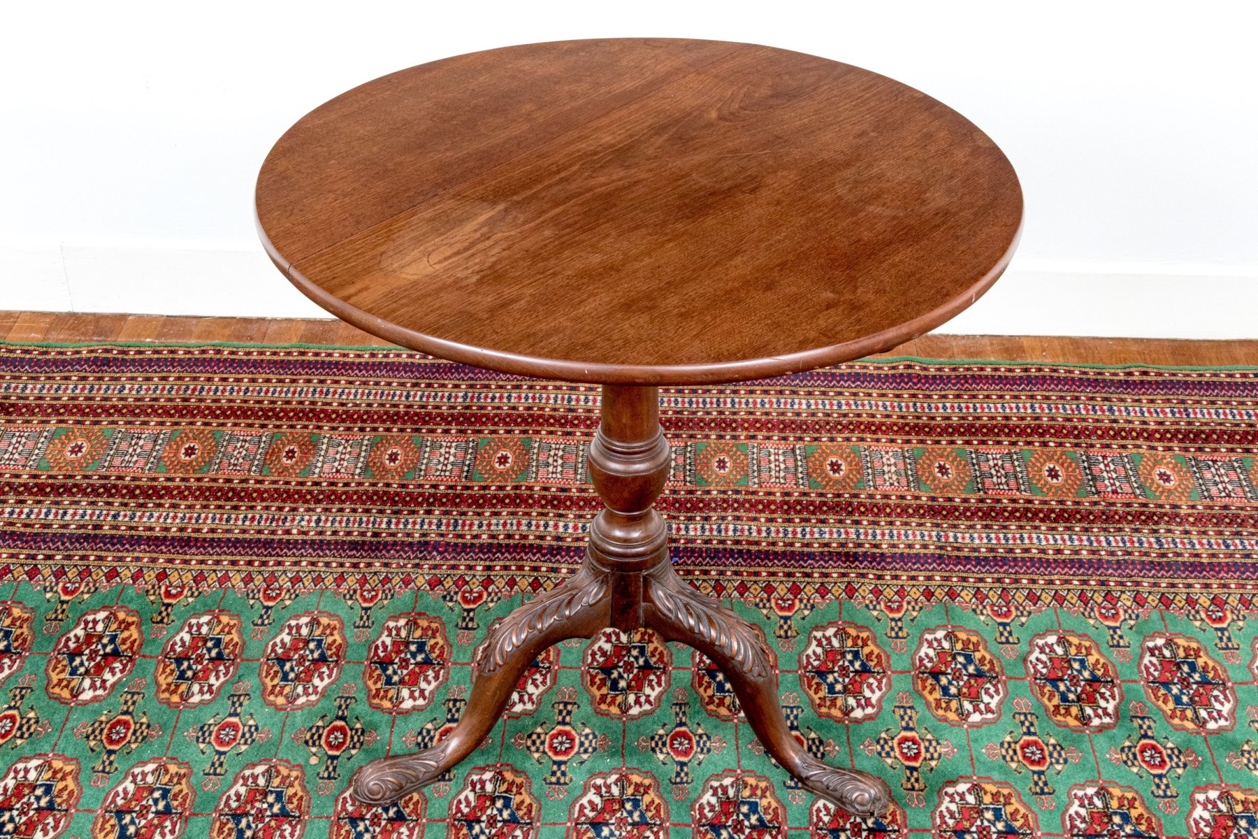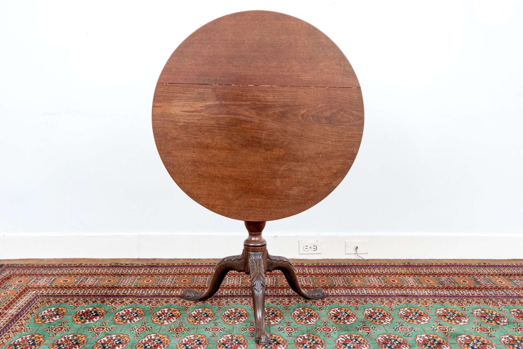 A delightful Chippendale occasional tea table sporting a large circular tilt top supported by a cylindrical pedestal column with an urn form knop heralding a tripod of cabriole legs with gorgeous foliate carved knees and slipper feet.