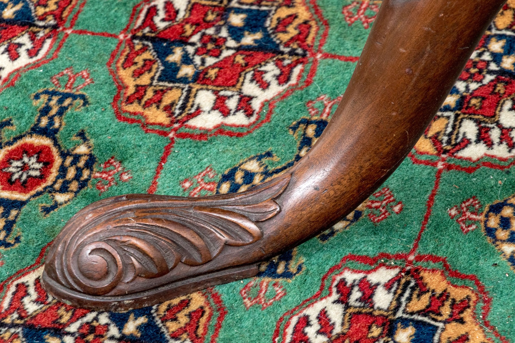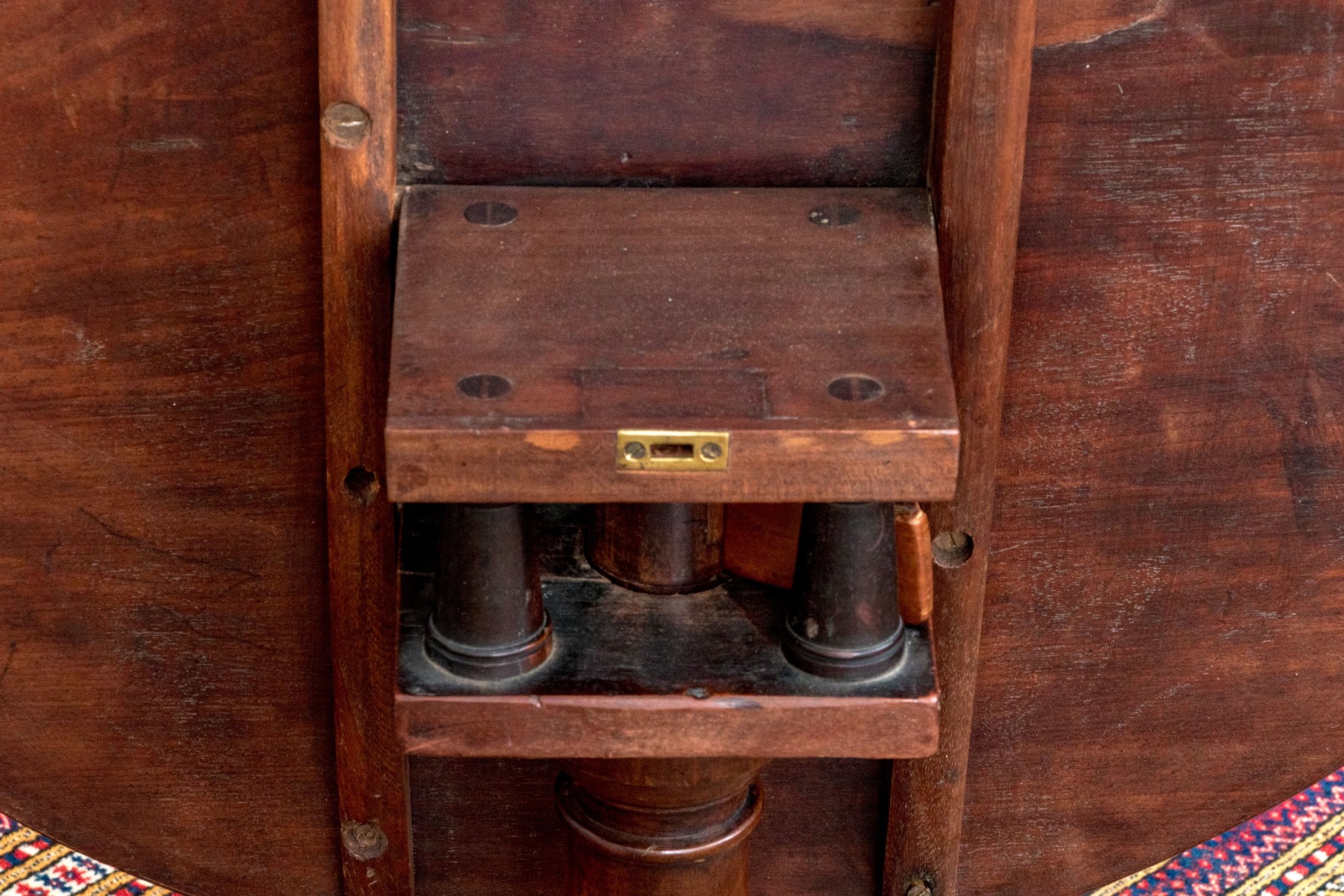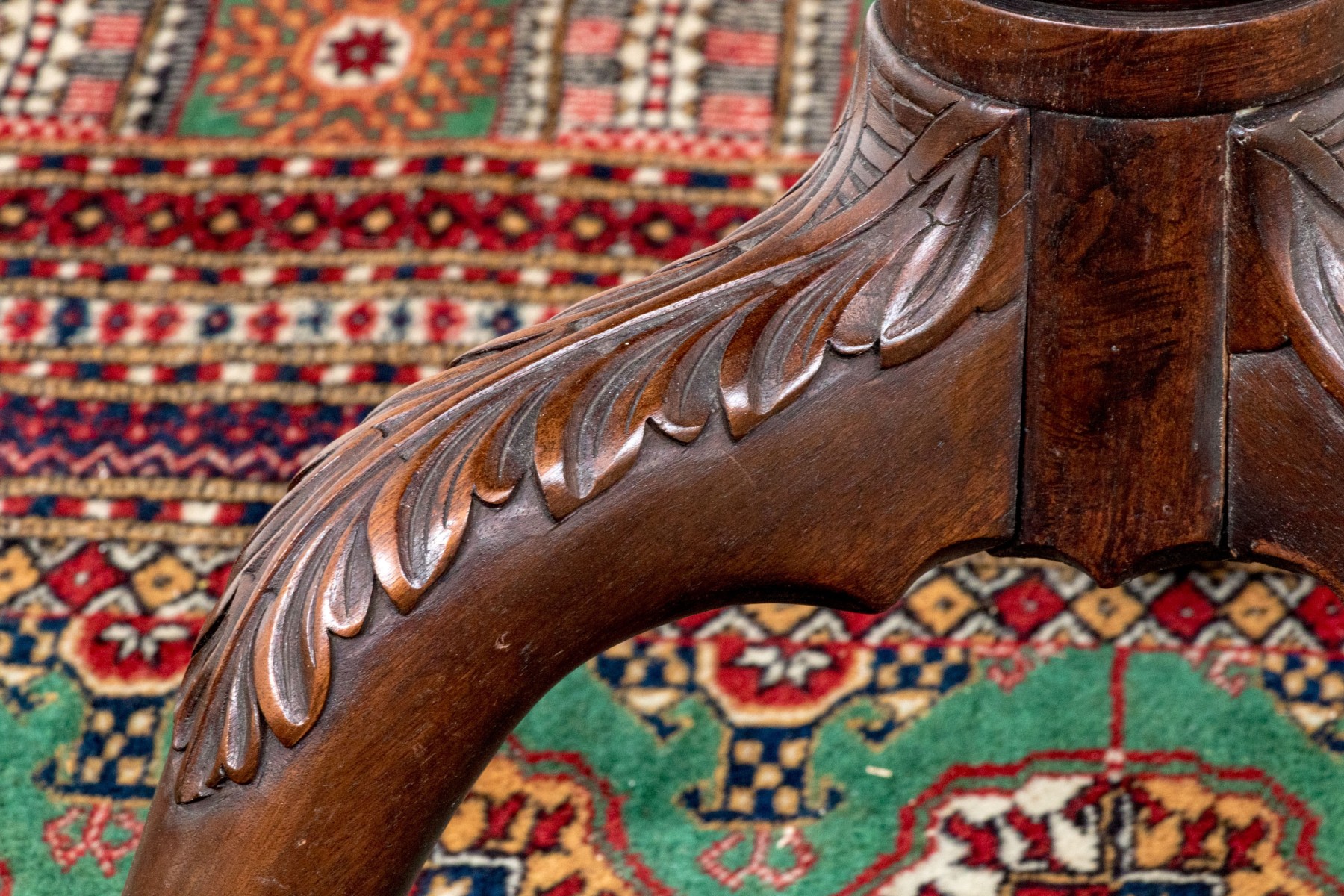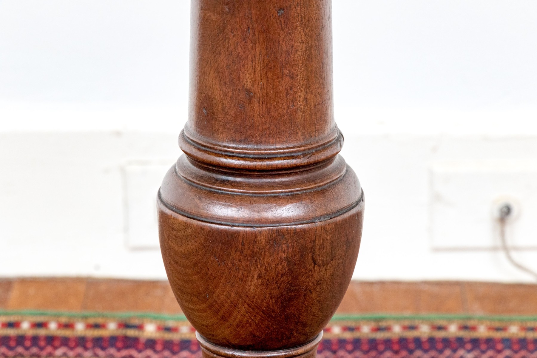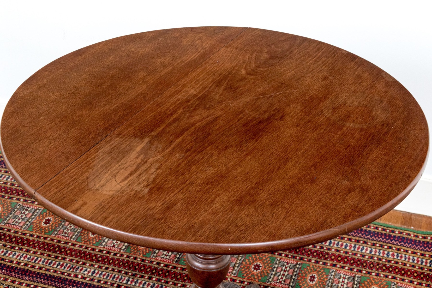 A delightful Chippendale occasional tea table sporting a large circular tilt top supported by a cylindrical pedestal column with an urn form knop heralding a tripod of cabriole legs with gorgeous foliate carved knees and slipper feet.