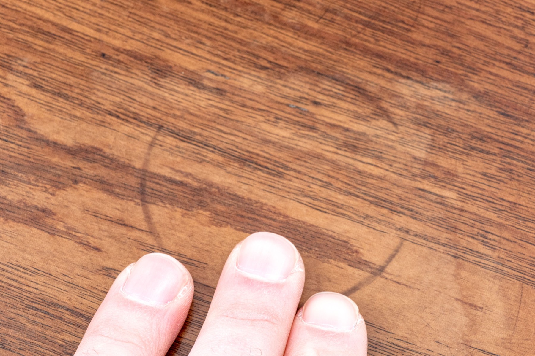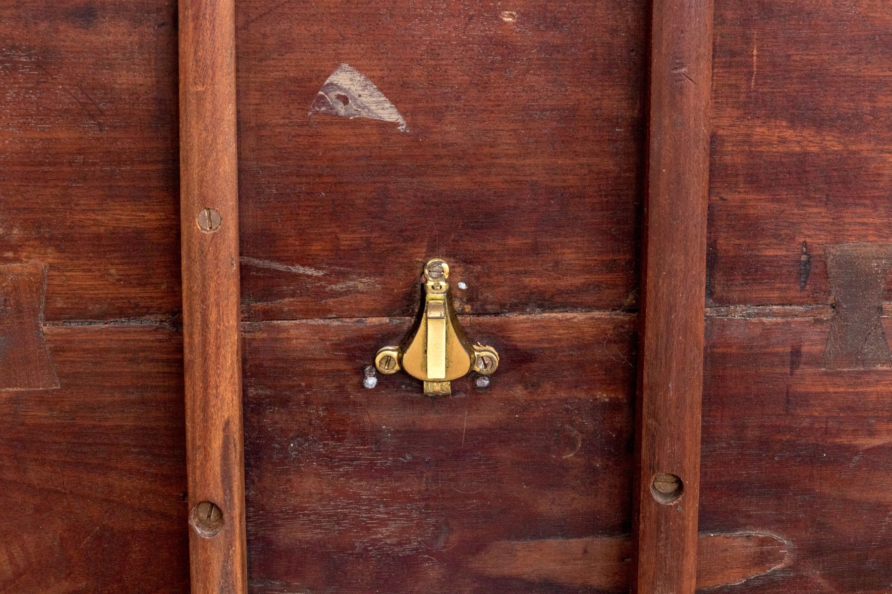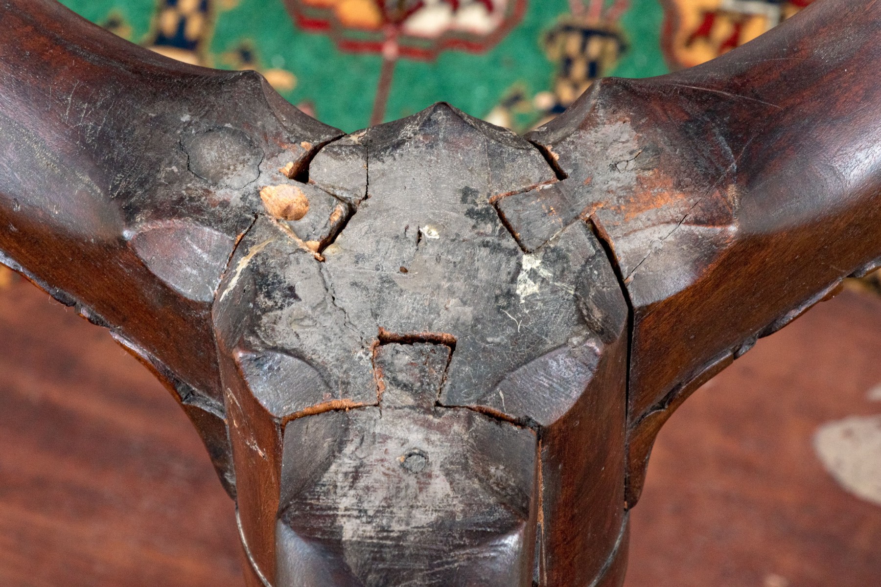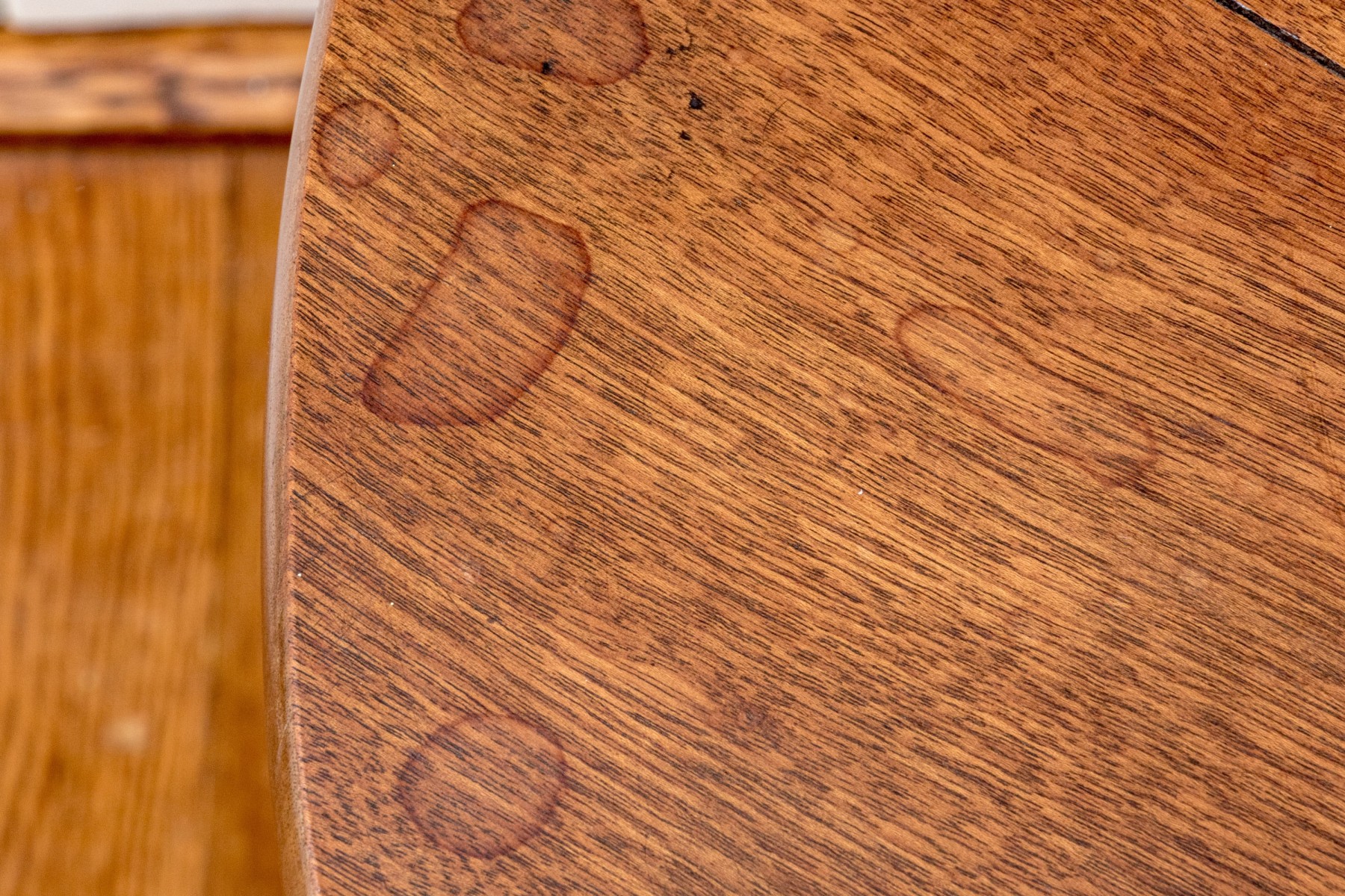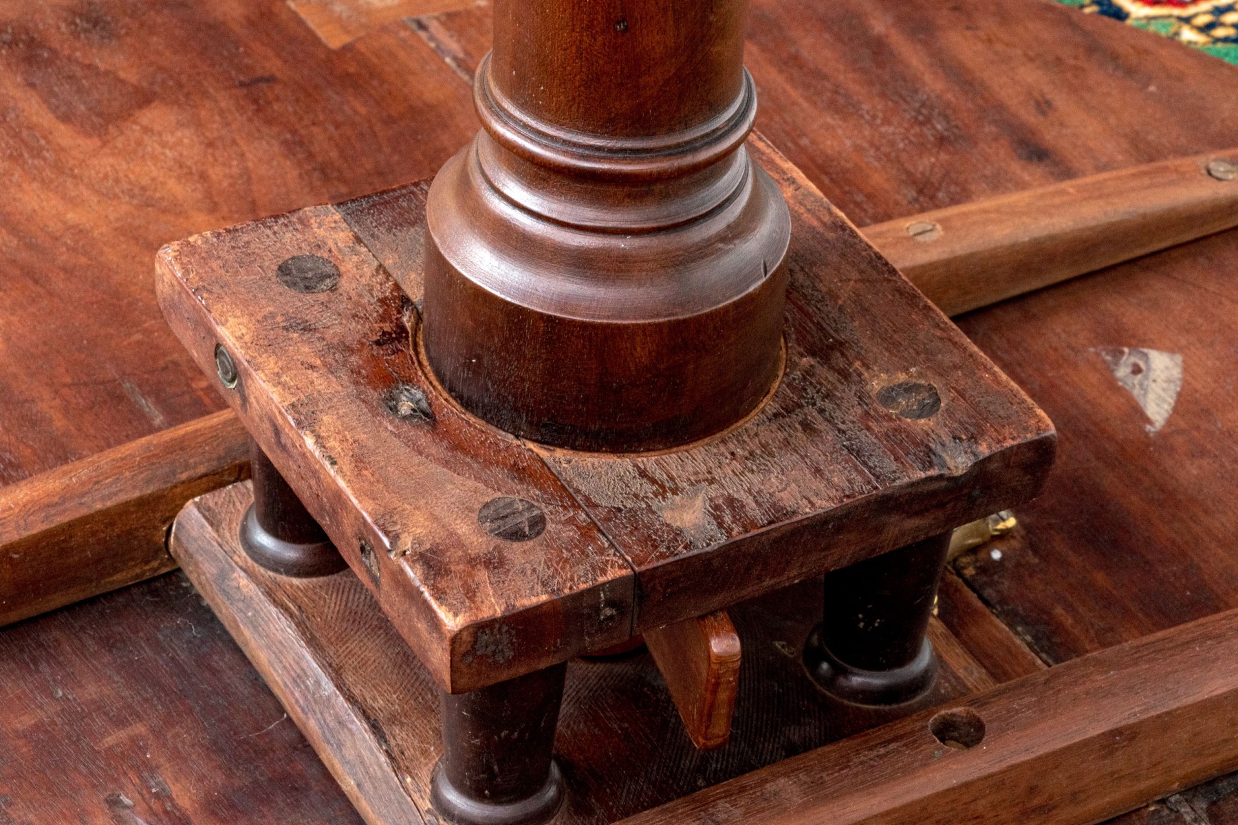 Top has a crack and is in two pieces which are braced by the cross double stretchers underneath. Wear to the foot with slight chipping and scuffs.