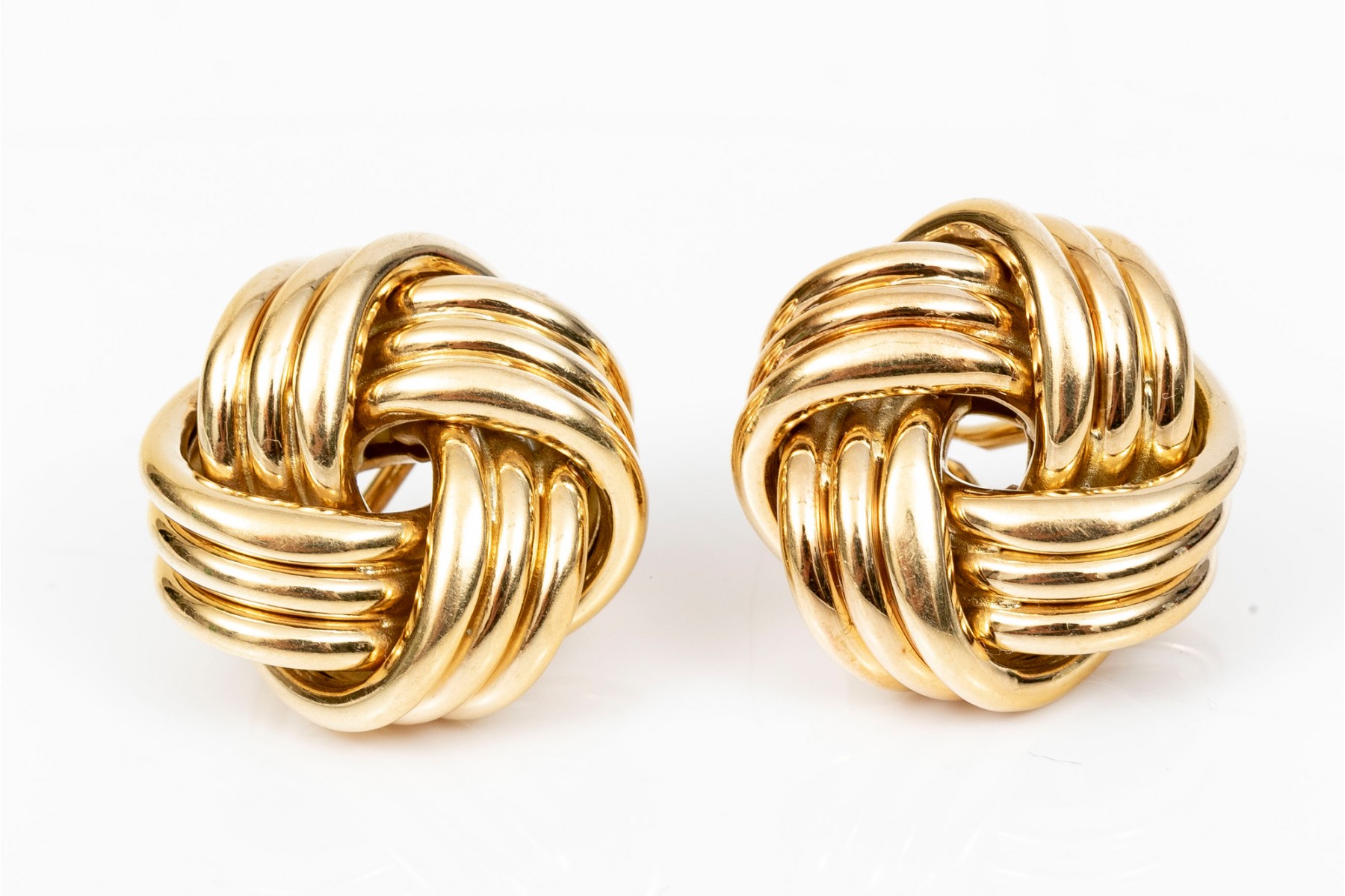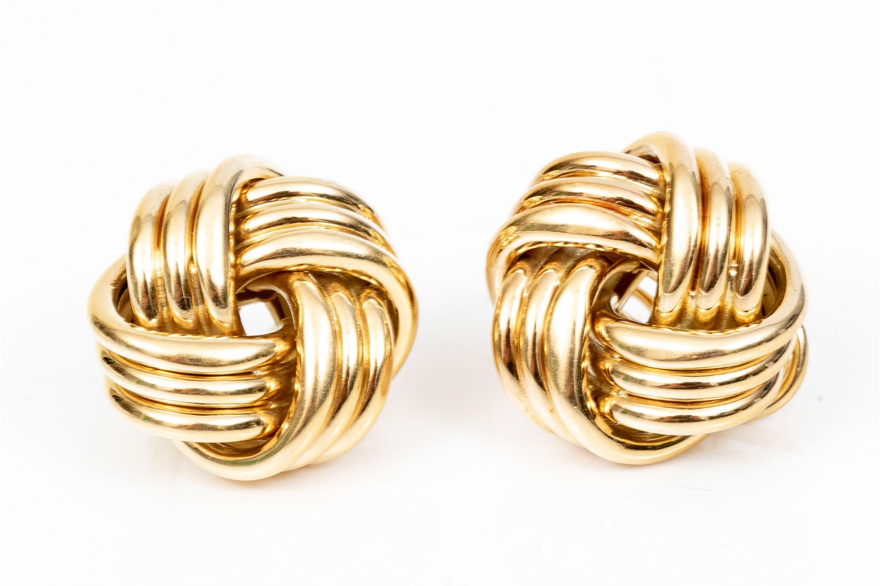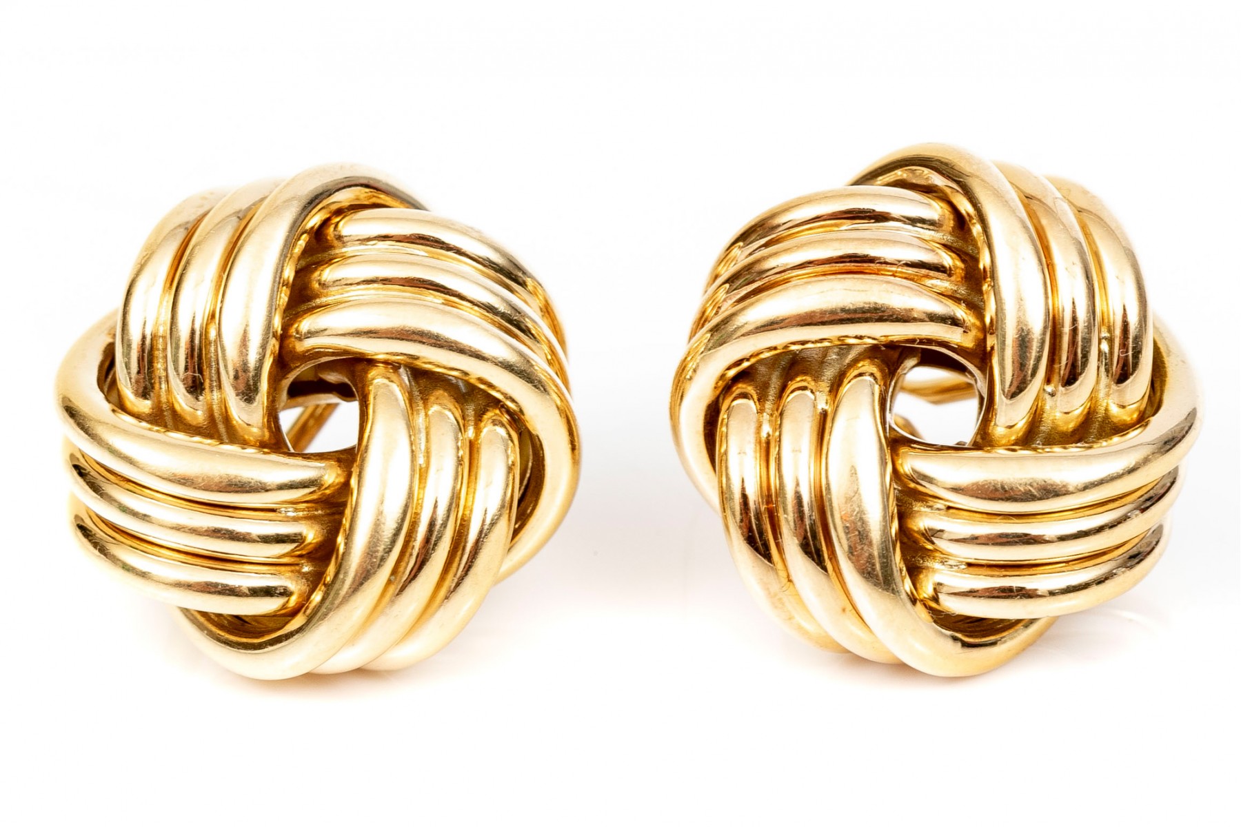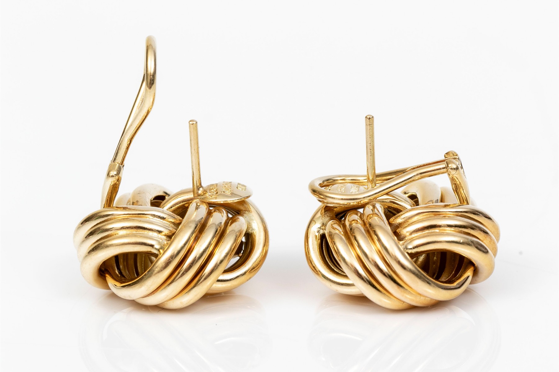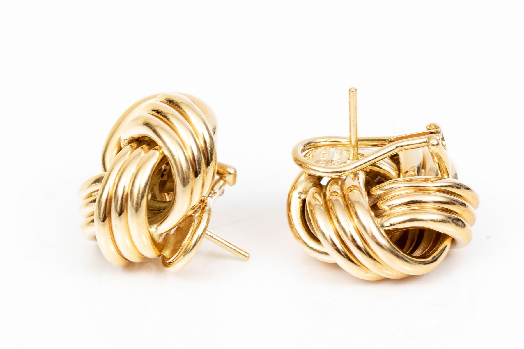 Timeless pair of Tiffany & Company 18K yellow gold knot earrings. Post and omega backings.