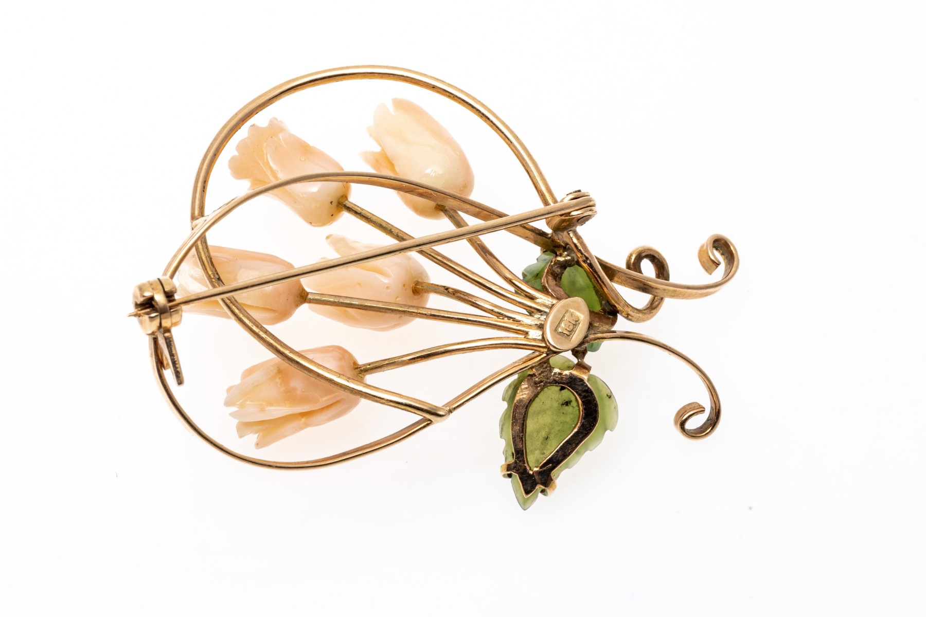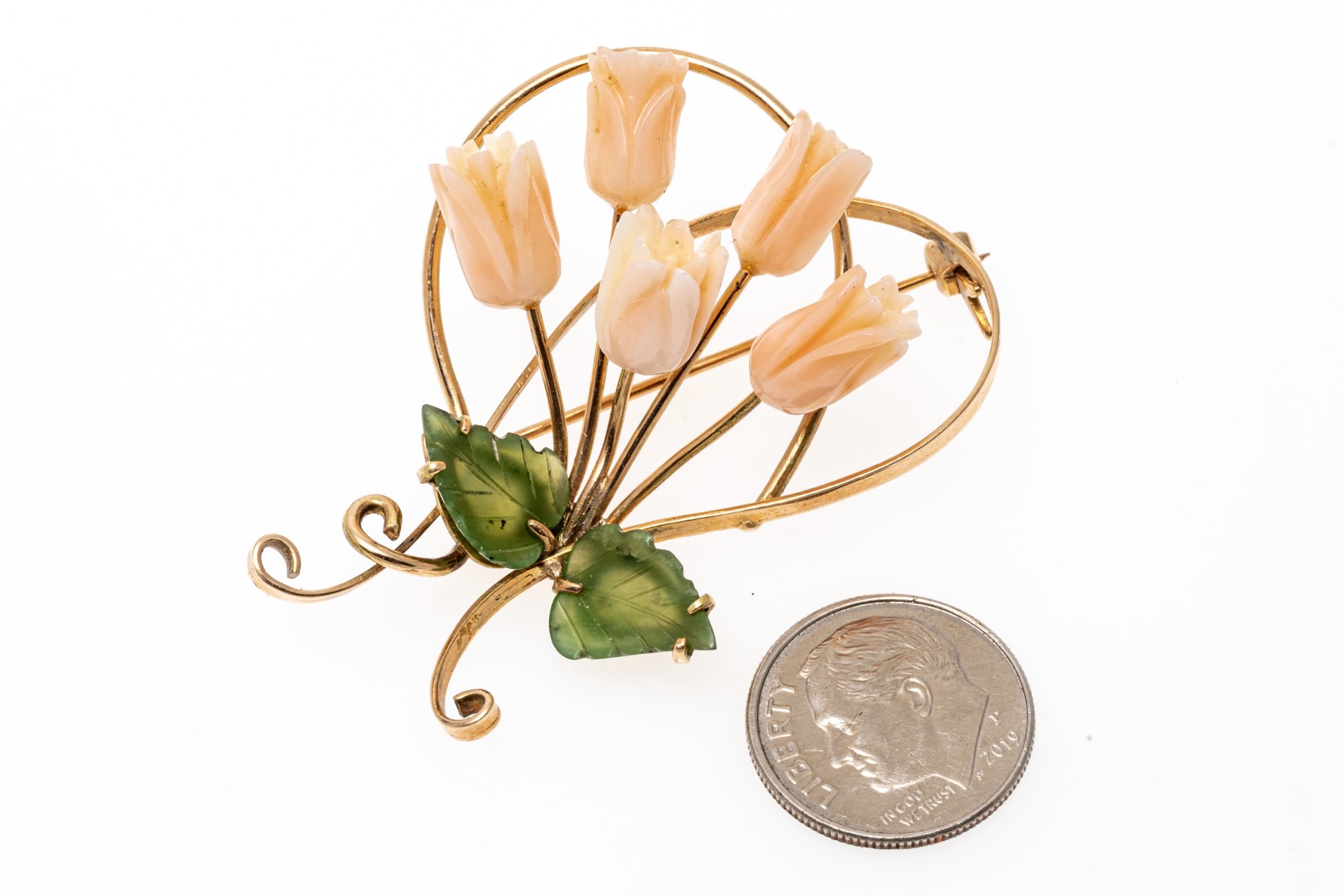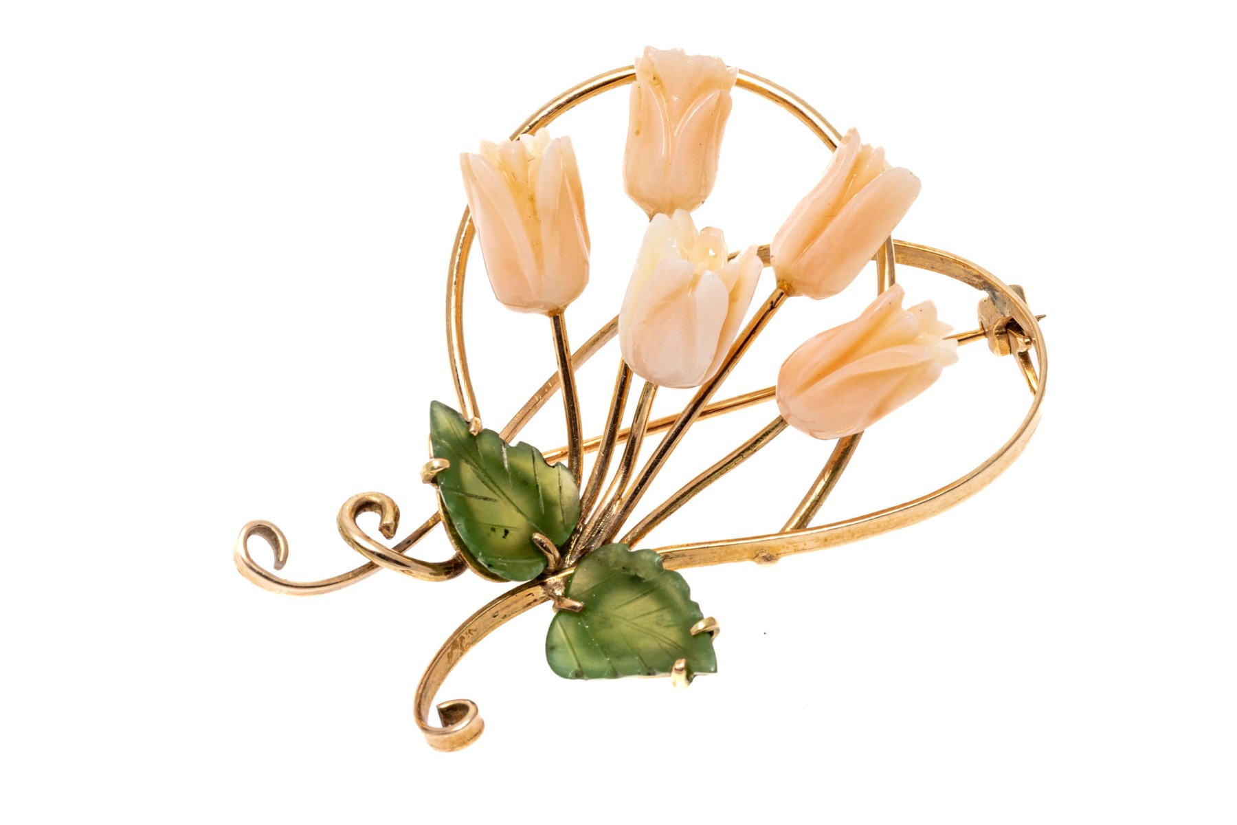 Timeless 18K yellow gold brooch. The brooch displays a bouquet of carved palest pink coral flowers with nephrite leaves.