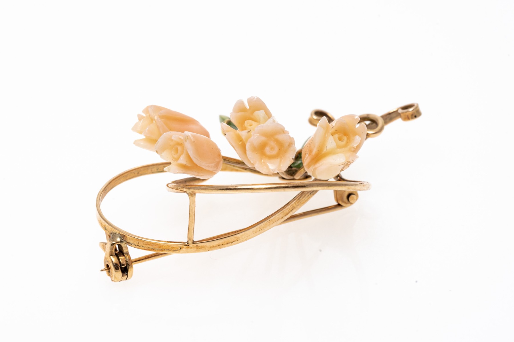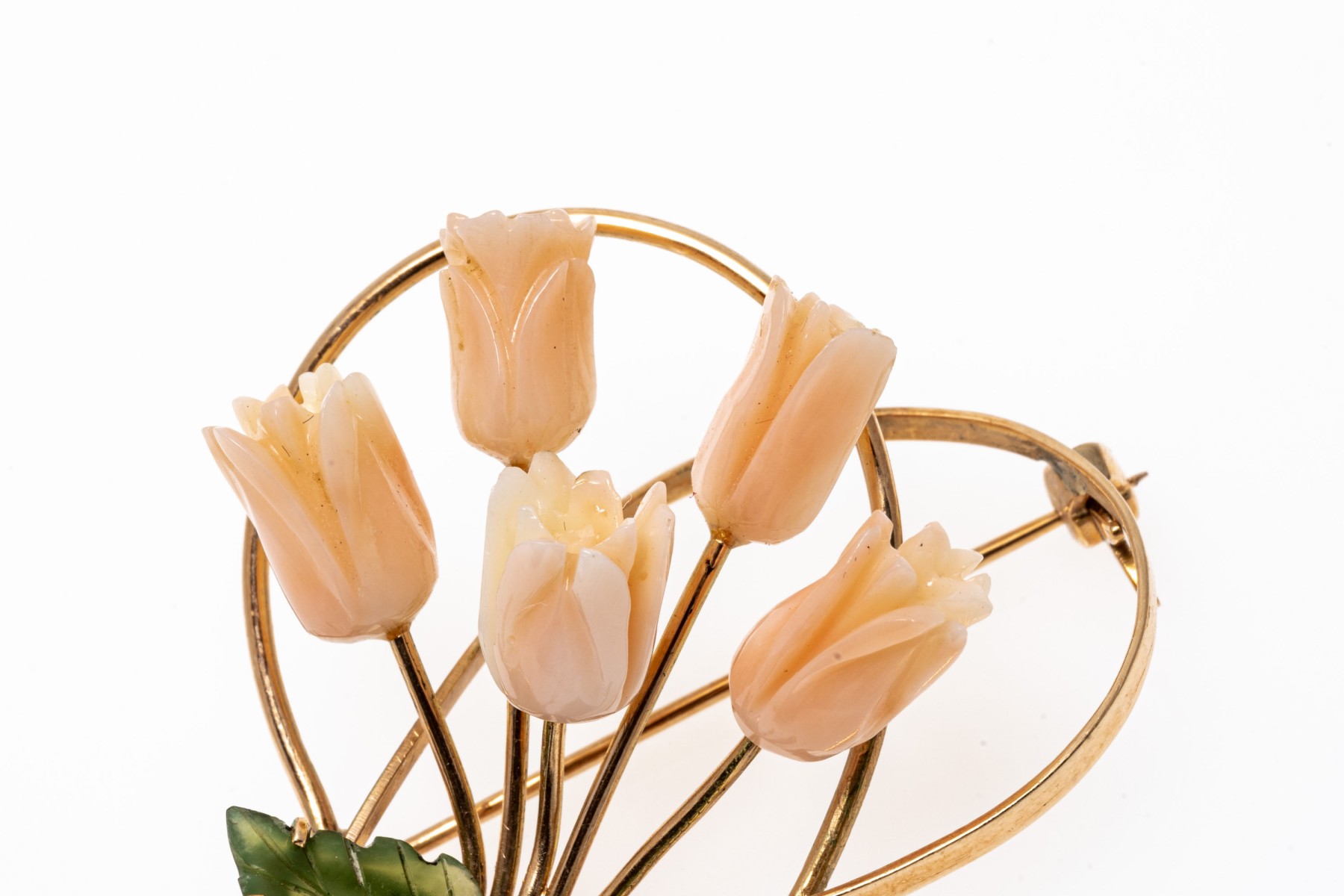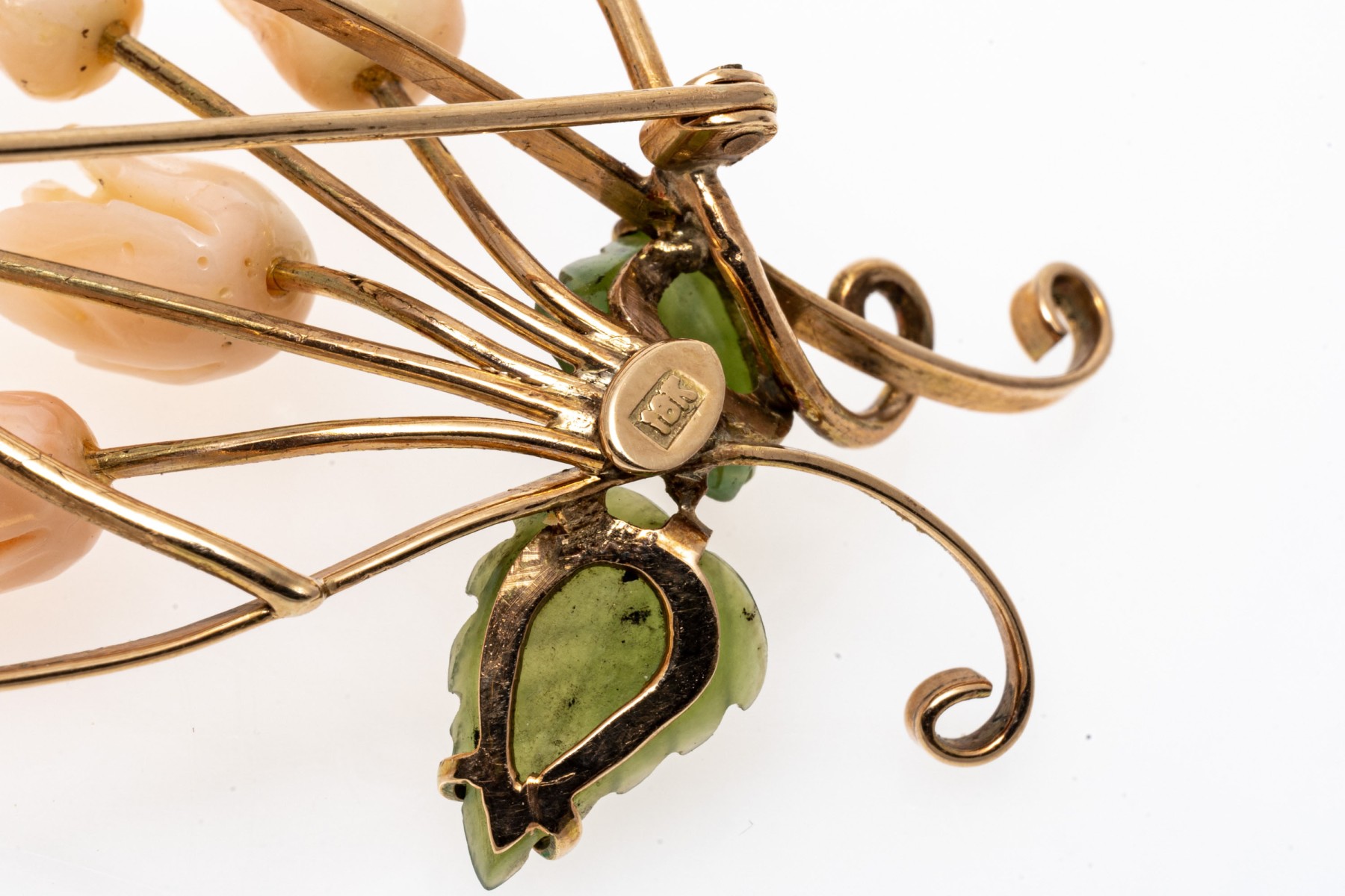 Timeless 18K yellow gold brooch. The brooch displays a bouquet of carved palest pink coral flowers with nephrite leaves.