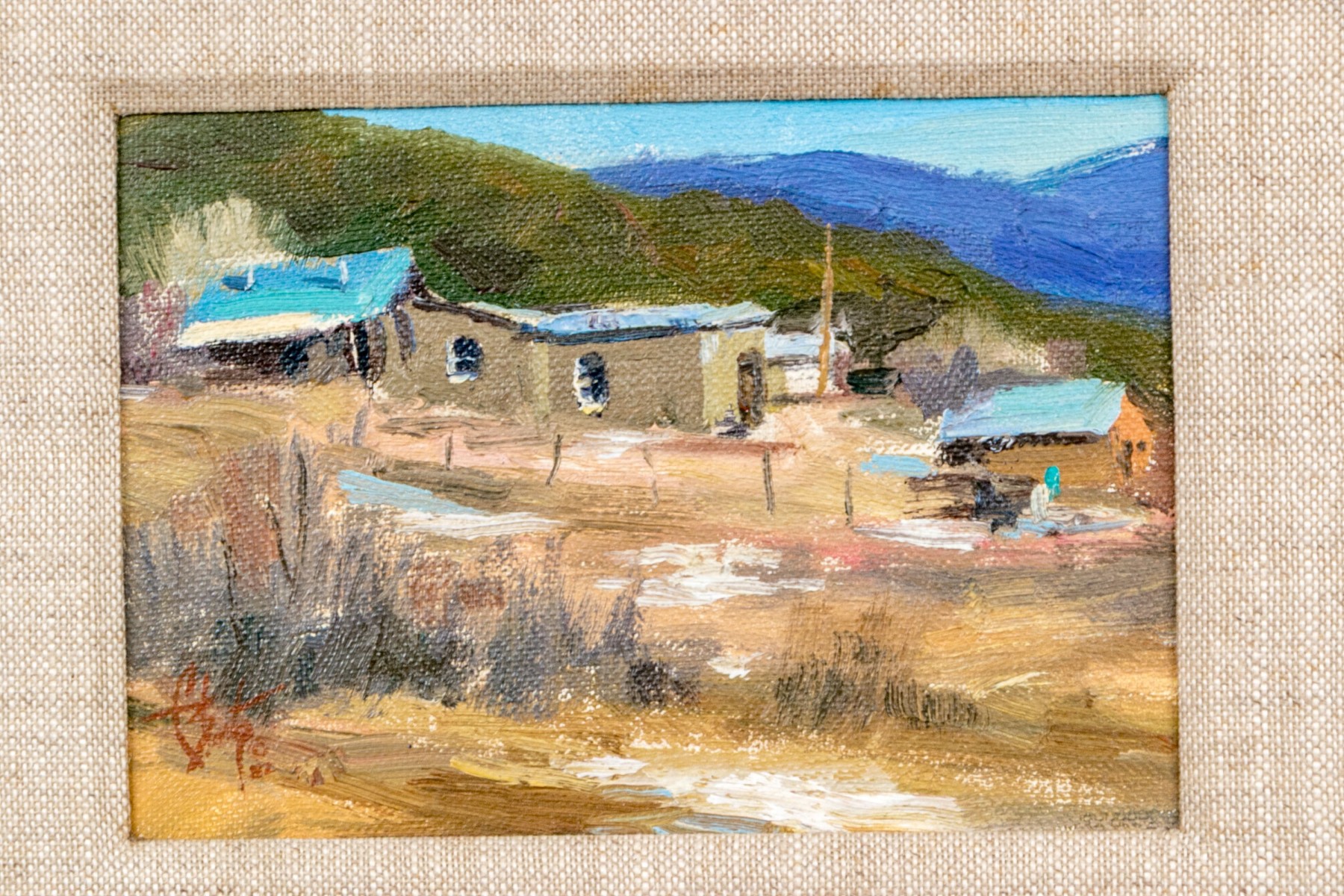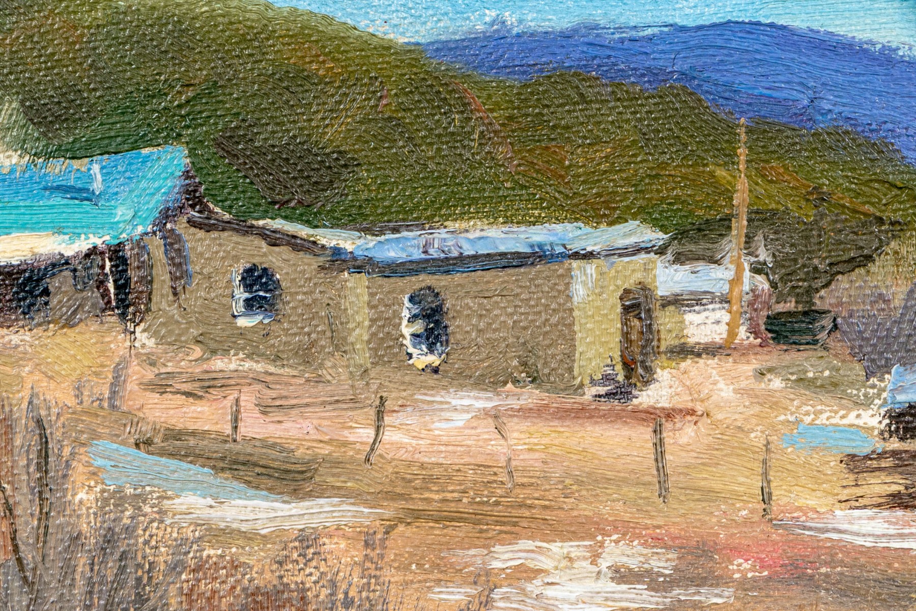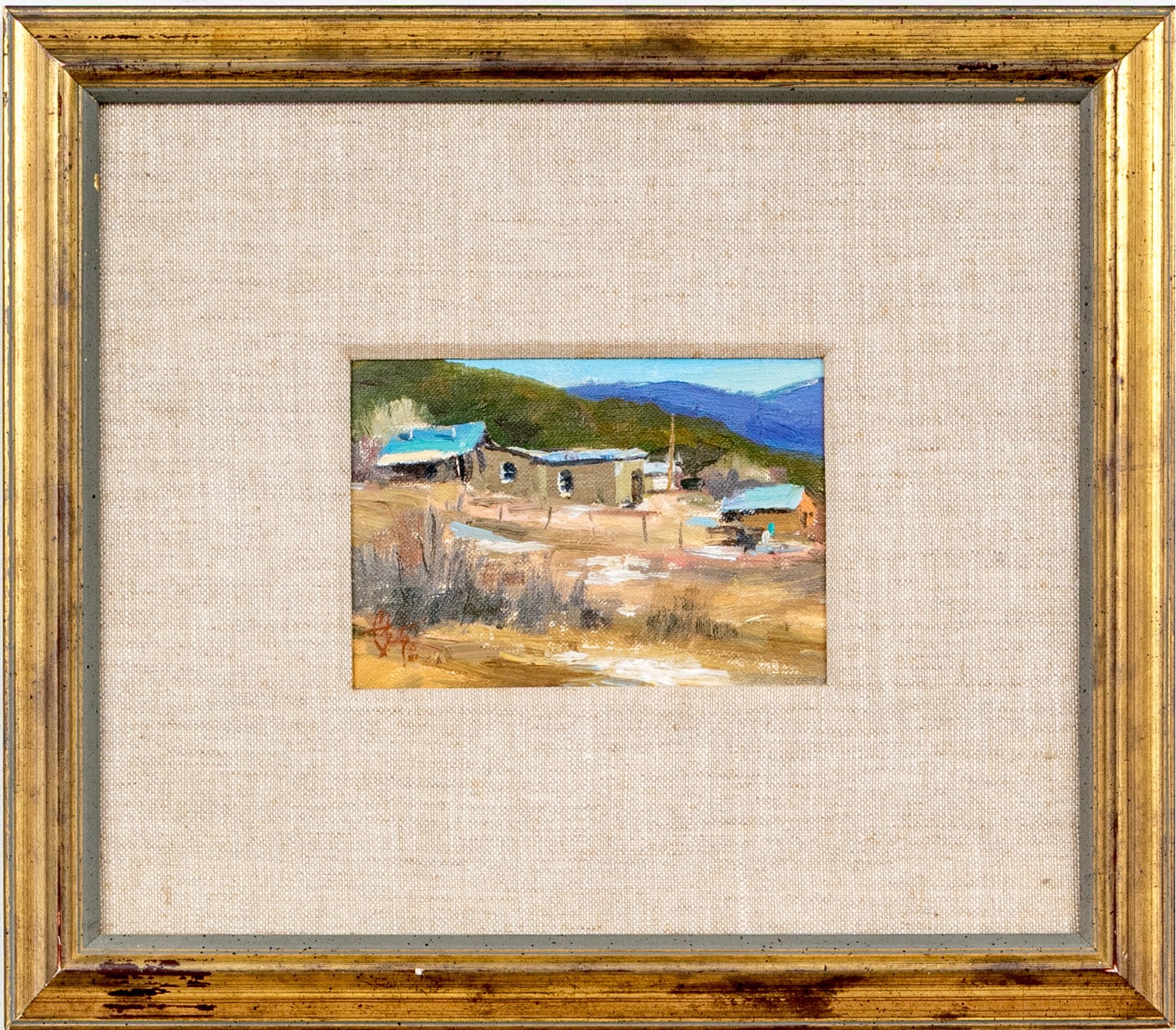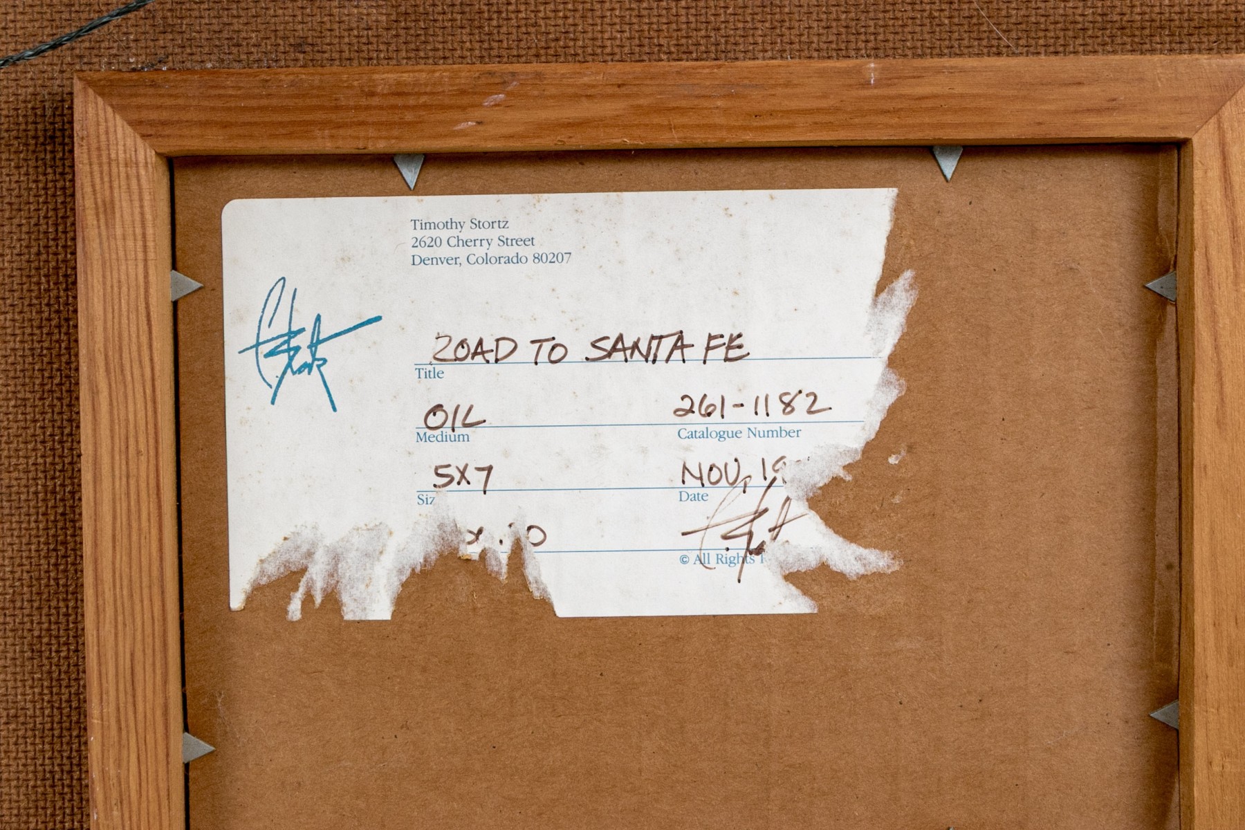 Timothy E. Stortz (American, b. 1952) "Road To Santa Fe" oil painting on board depicting a rural homestead with buildings topped by bright blue roofs contrasting warm orange and green foliage leading to blue mountains and the clear sky above in the background. Signed lower left and affixed with a sticker label to the verso.