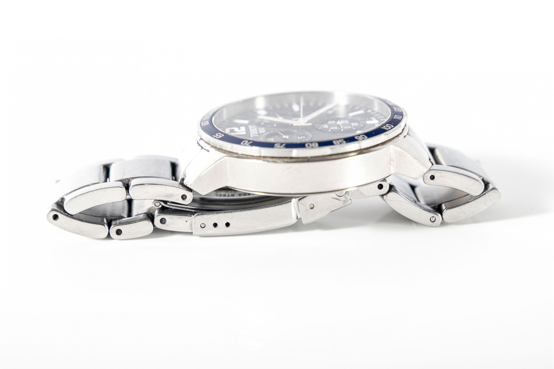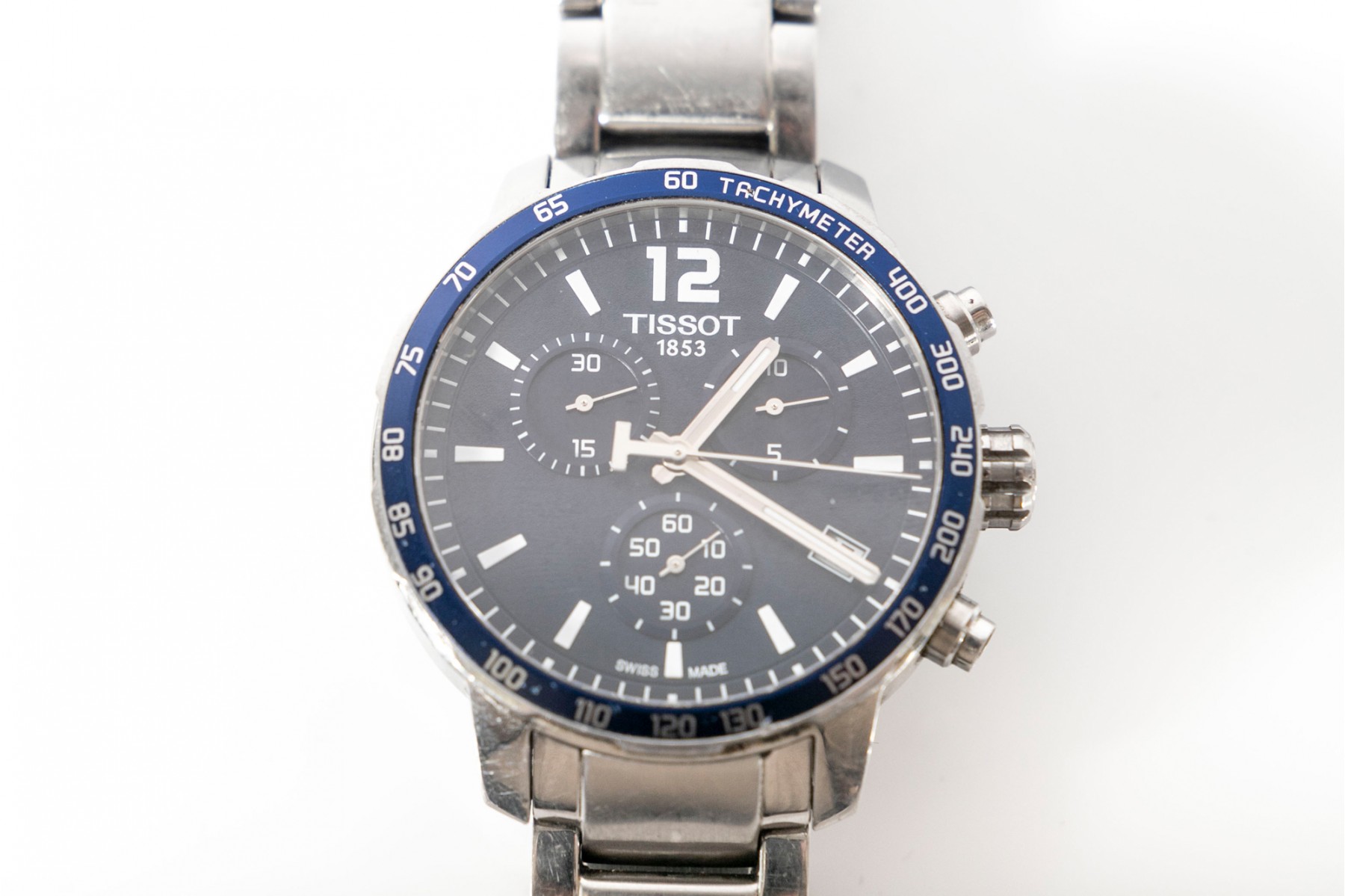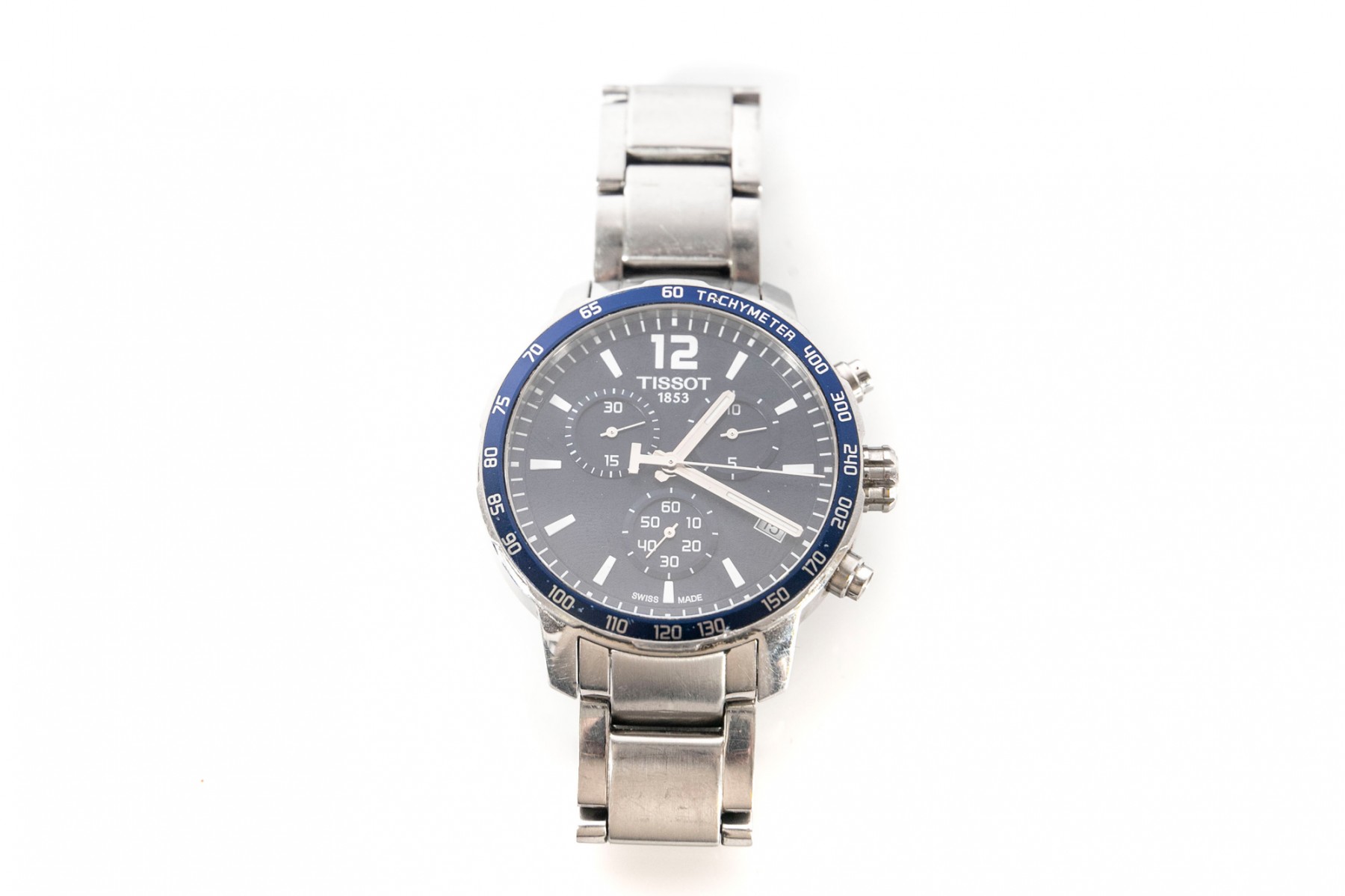 Tissot T-Sport Quickster handsome wristwatch displaying a navy blue dial with three subdials, white minimal hour markers, and sleek gray hands with white center stripes. The bezel sports a cobalt blue finish with tachymeter labeling, leading to sturdy lugs on a stainless steel strap.