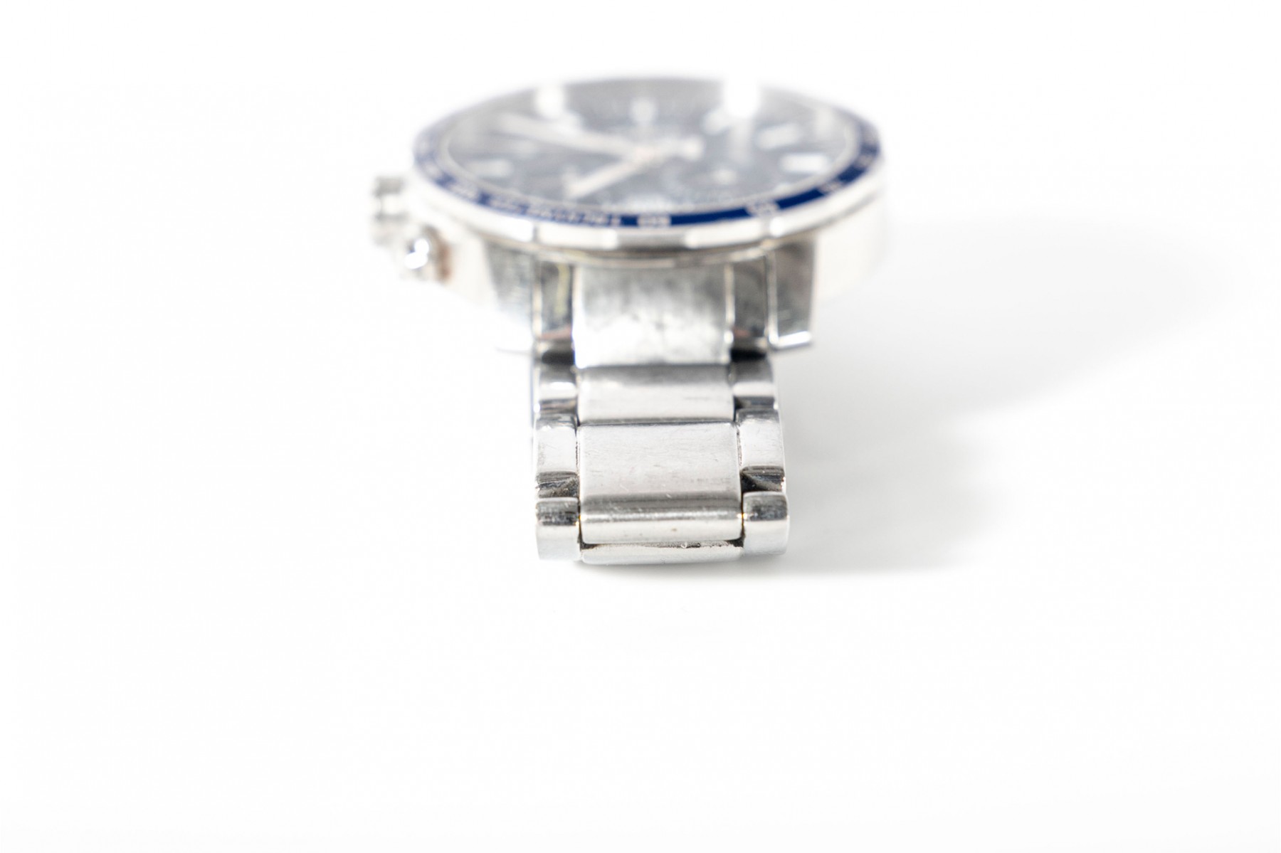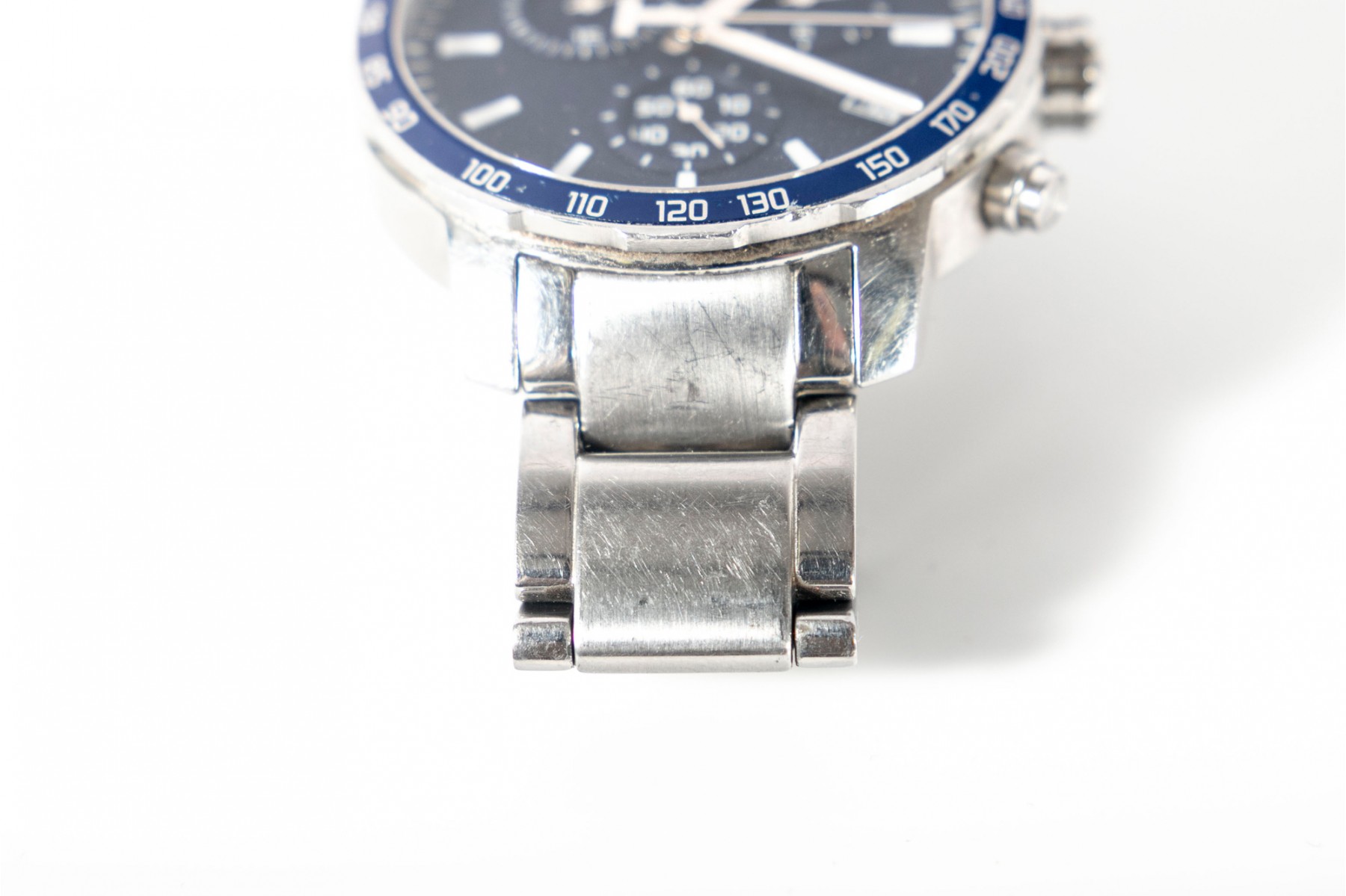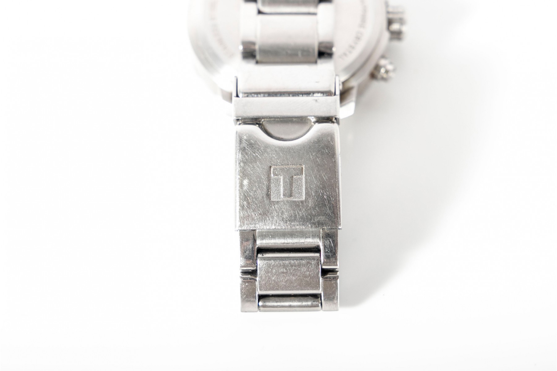 Tissot T-Sport Quickster handsome wristwatch displaying a navy blue dial with three subdials, white minimal hour markers, and sleek gray hands with white center stripes. The bezel sports a cobalt blue finish with tachymeter labeling, leading to sturdy lugs on a stainless steel strap.
