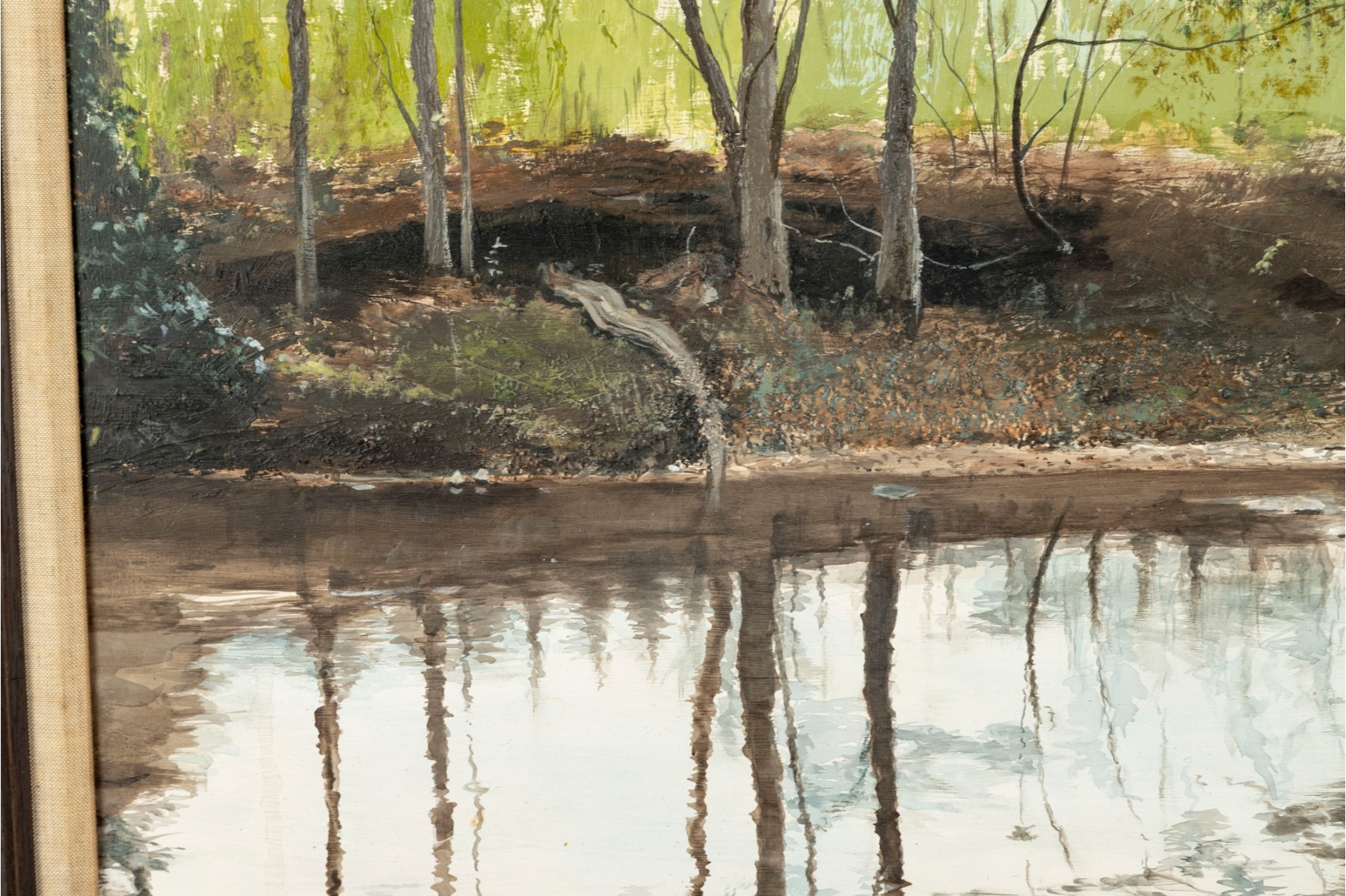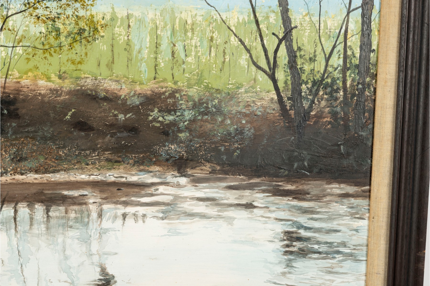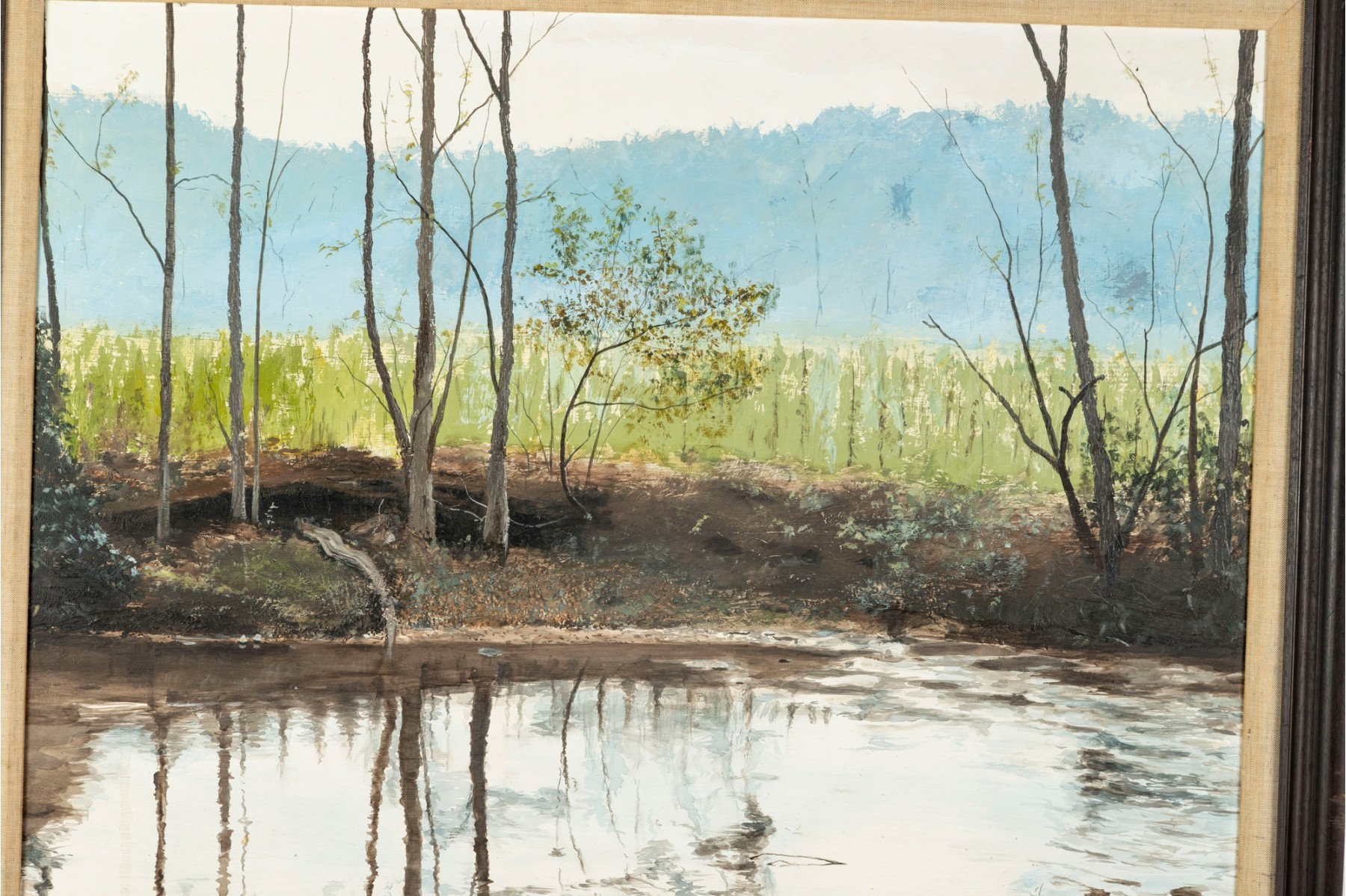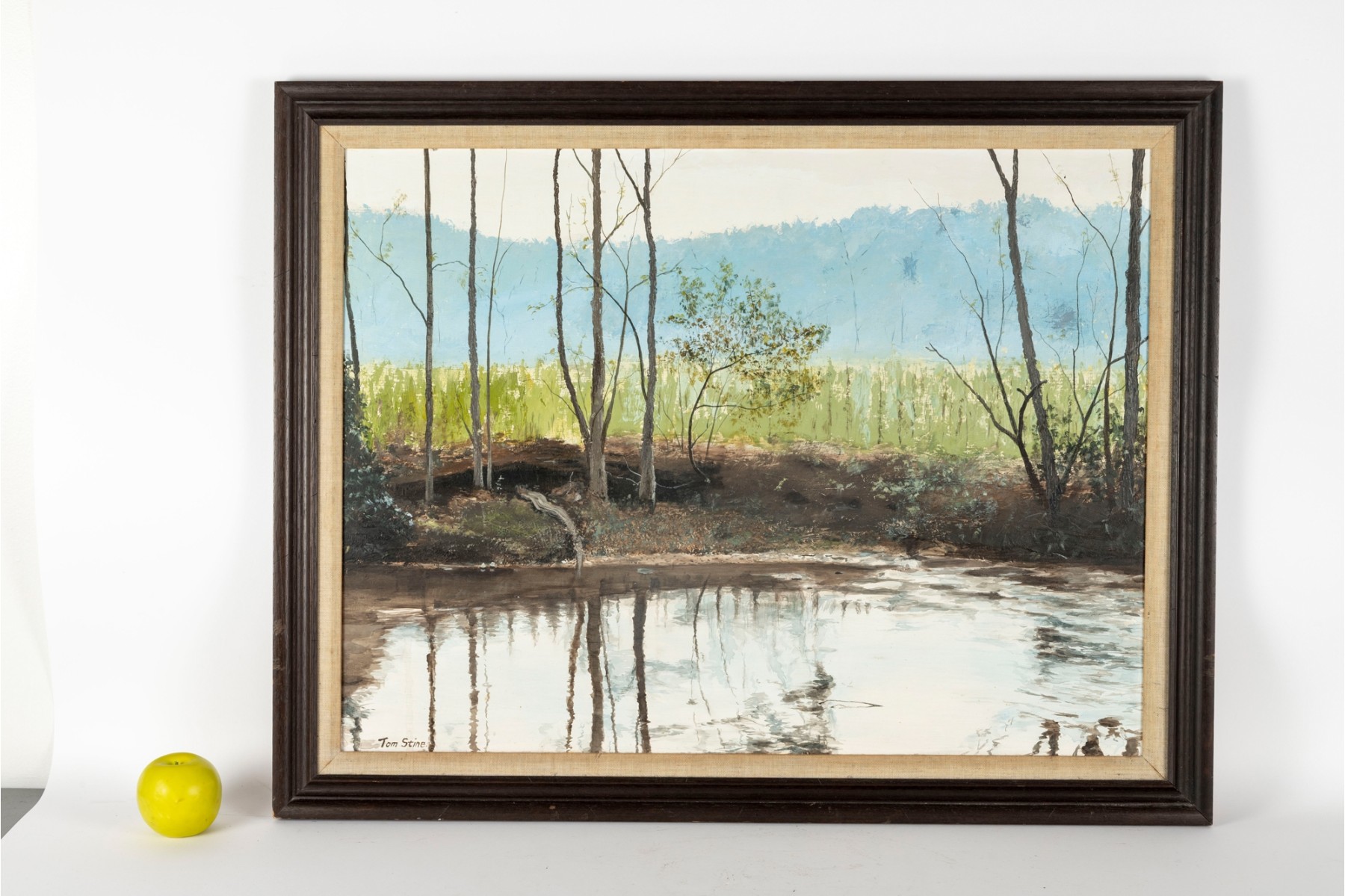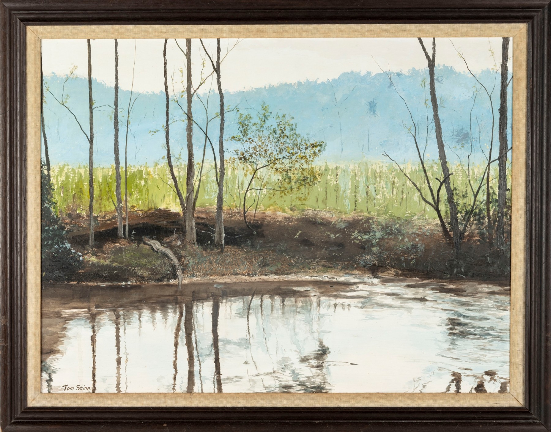A richly textured oil on board painting by Tom Stine, depicting a quiet, atmospheric swamp landscape and displayed openly within a plain wood frame.