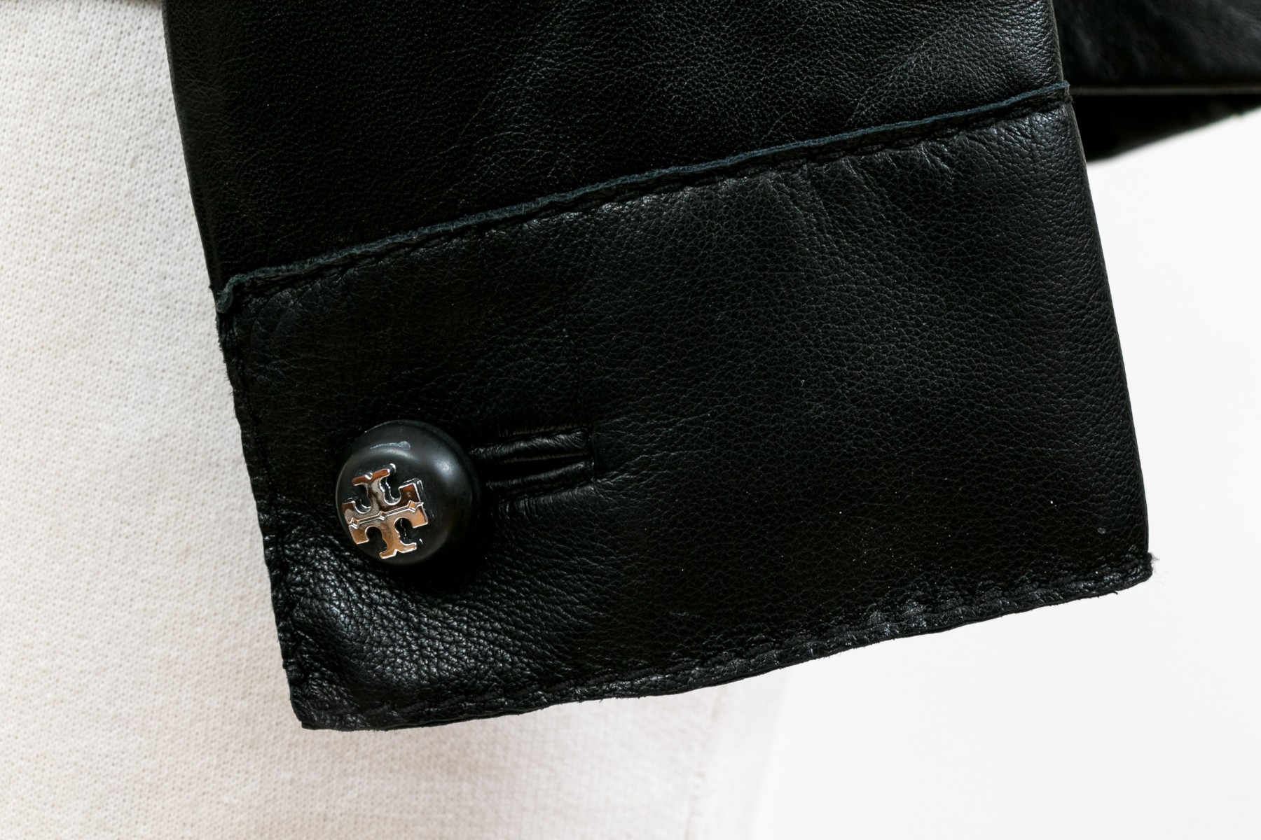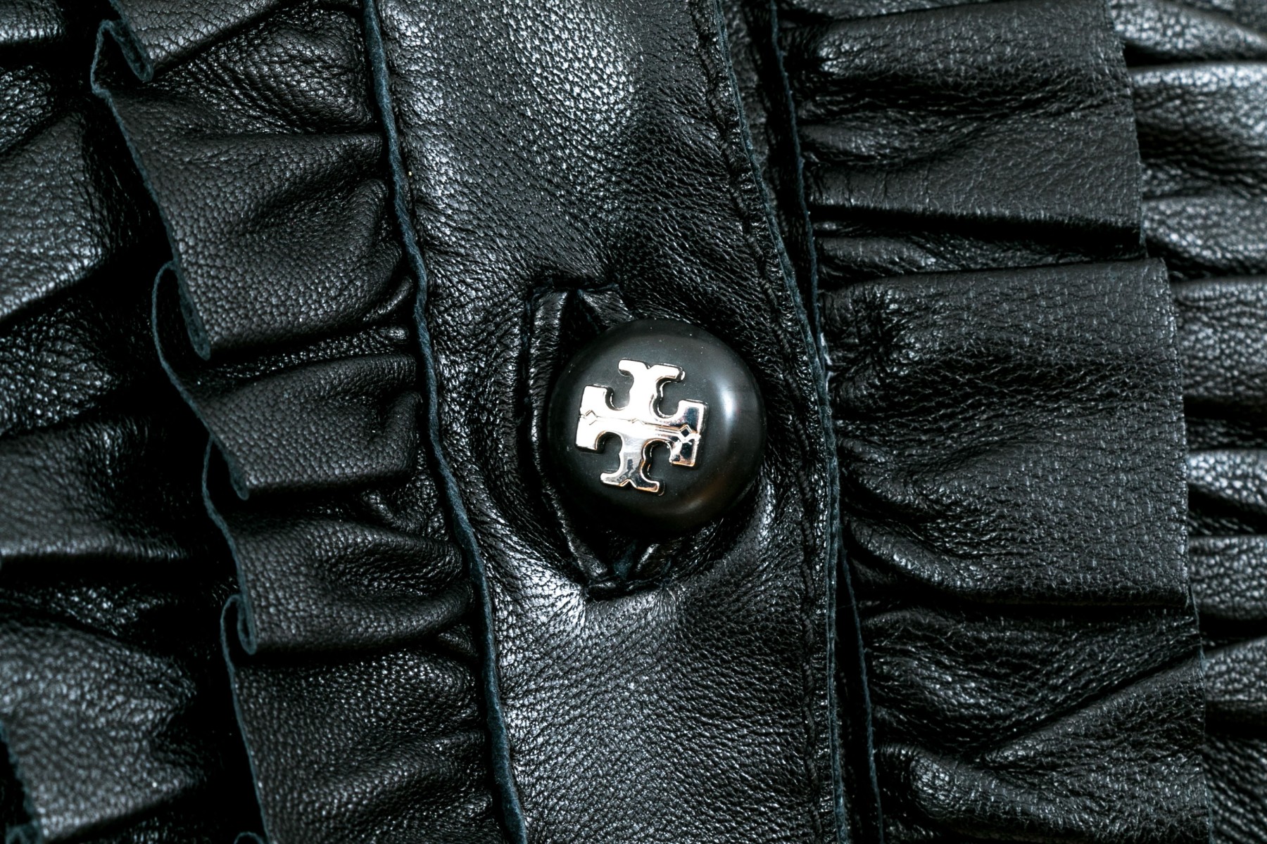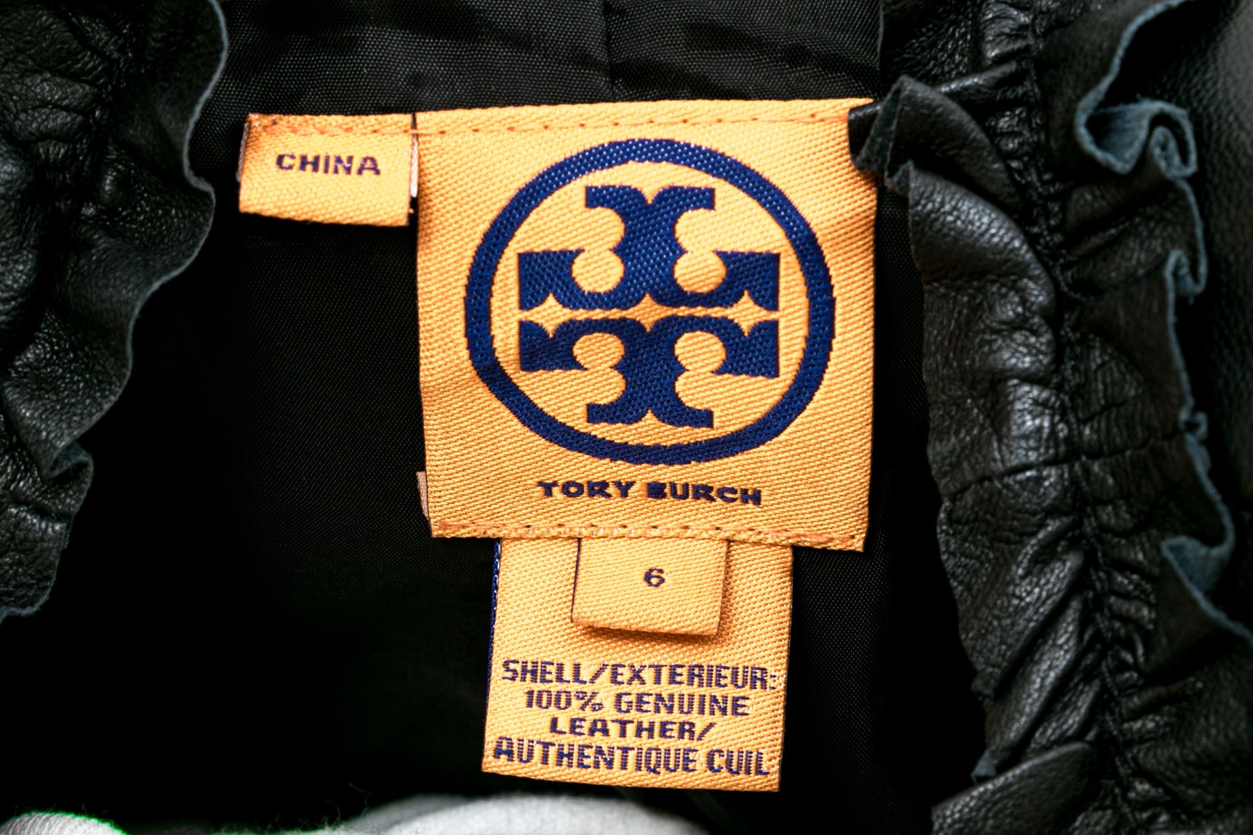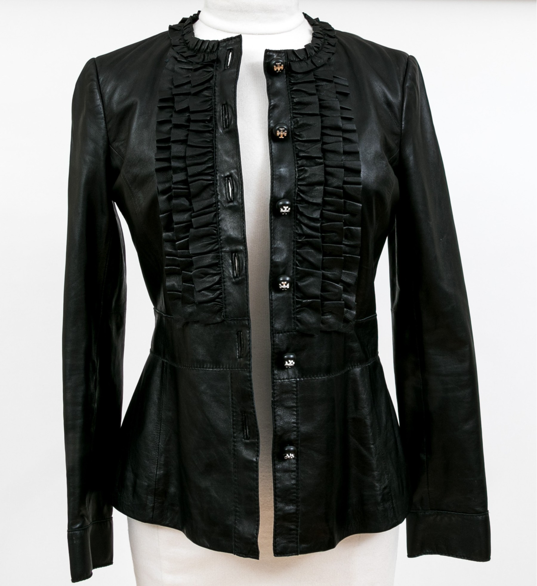 Tory Burch beautiful black leather ruffled button front leather jacket, size 6