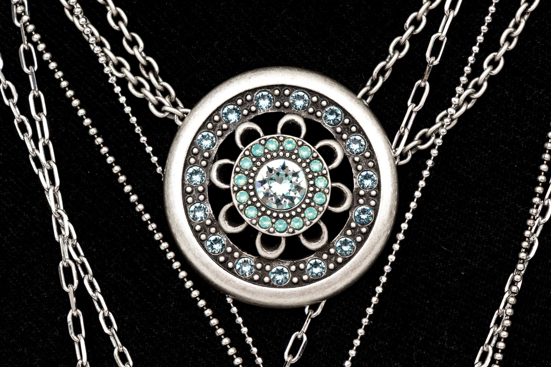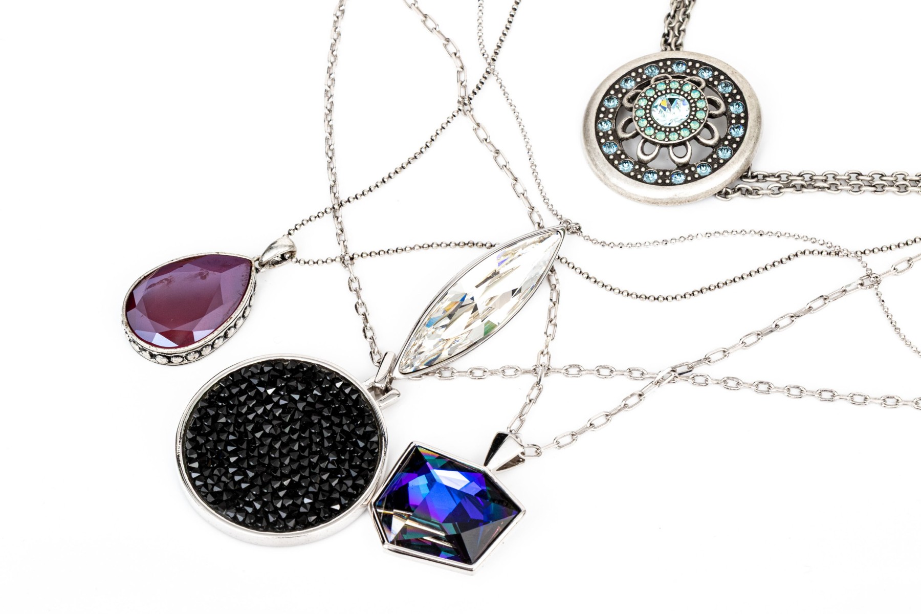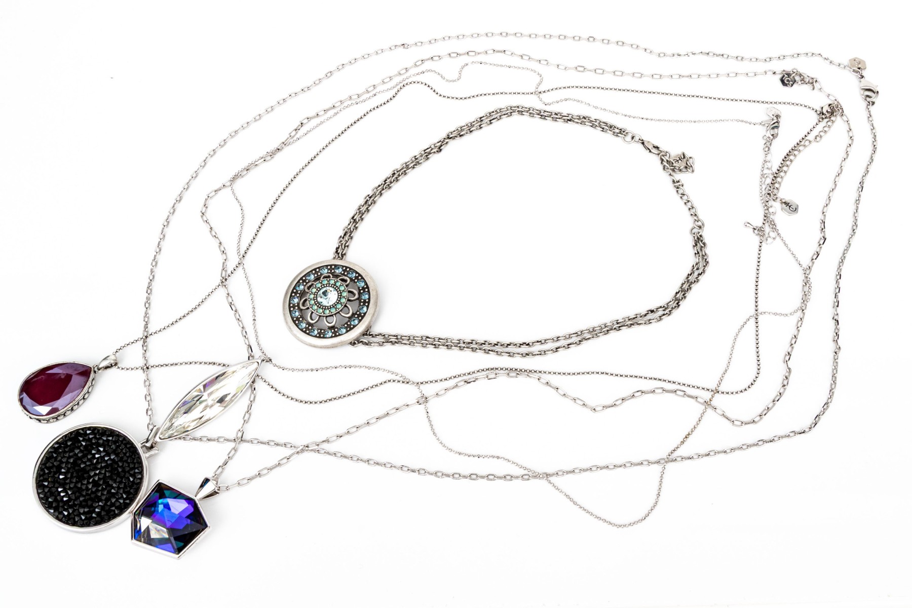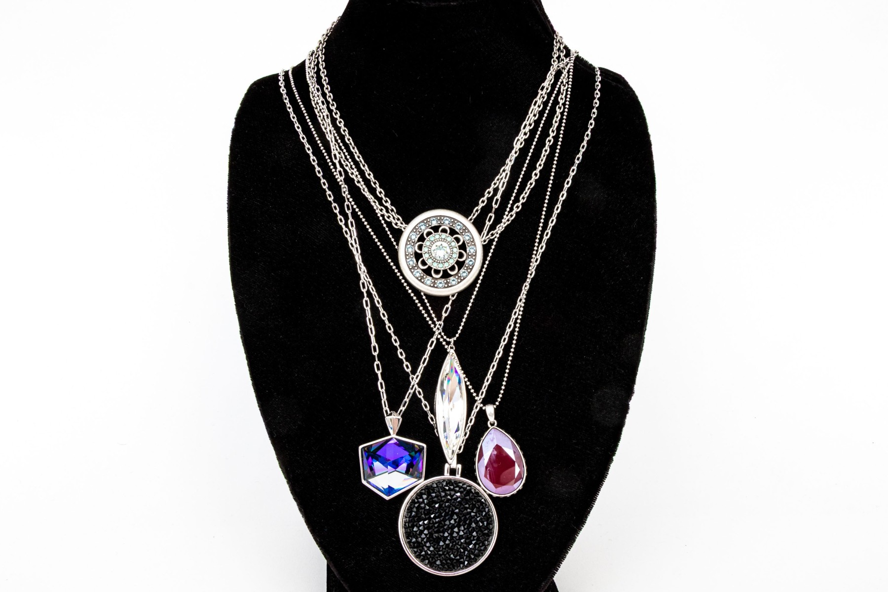 Touchstone Crystal by Swarovski collection of five chunky crystal set necklaces, featuring one shield shaped on an adjustable 15" to 18" chain, and four opera length chains with crystal set pendants (one reversible). All are finished with lobster claw style clasps