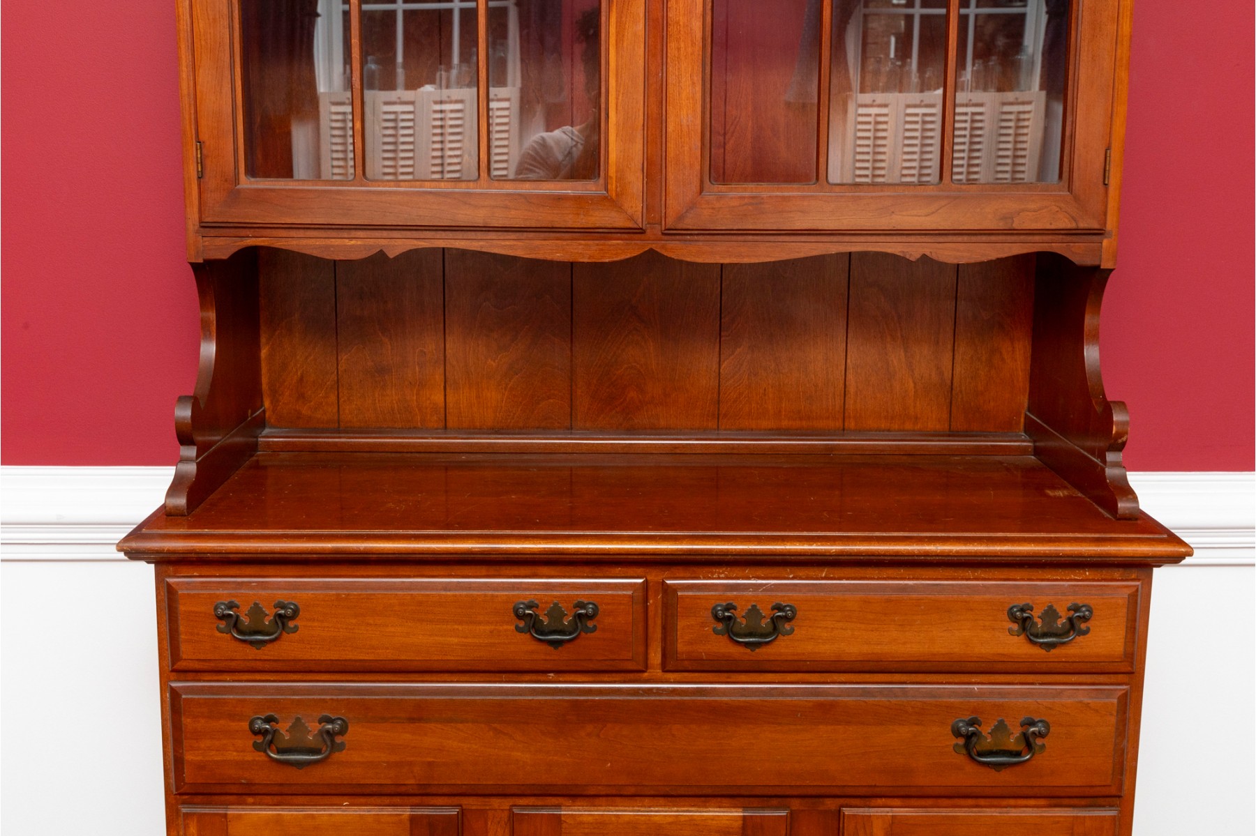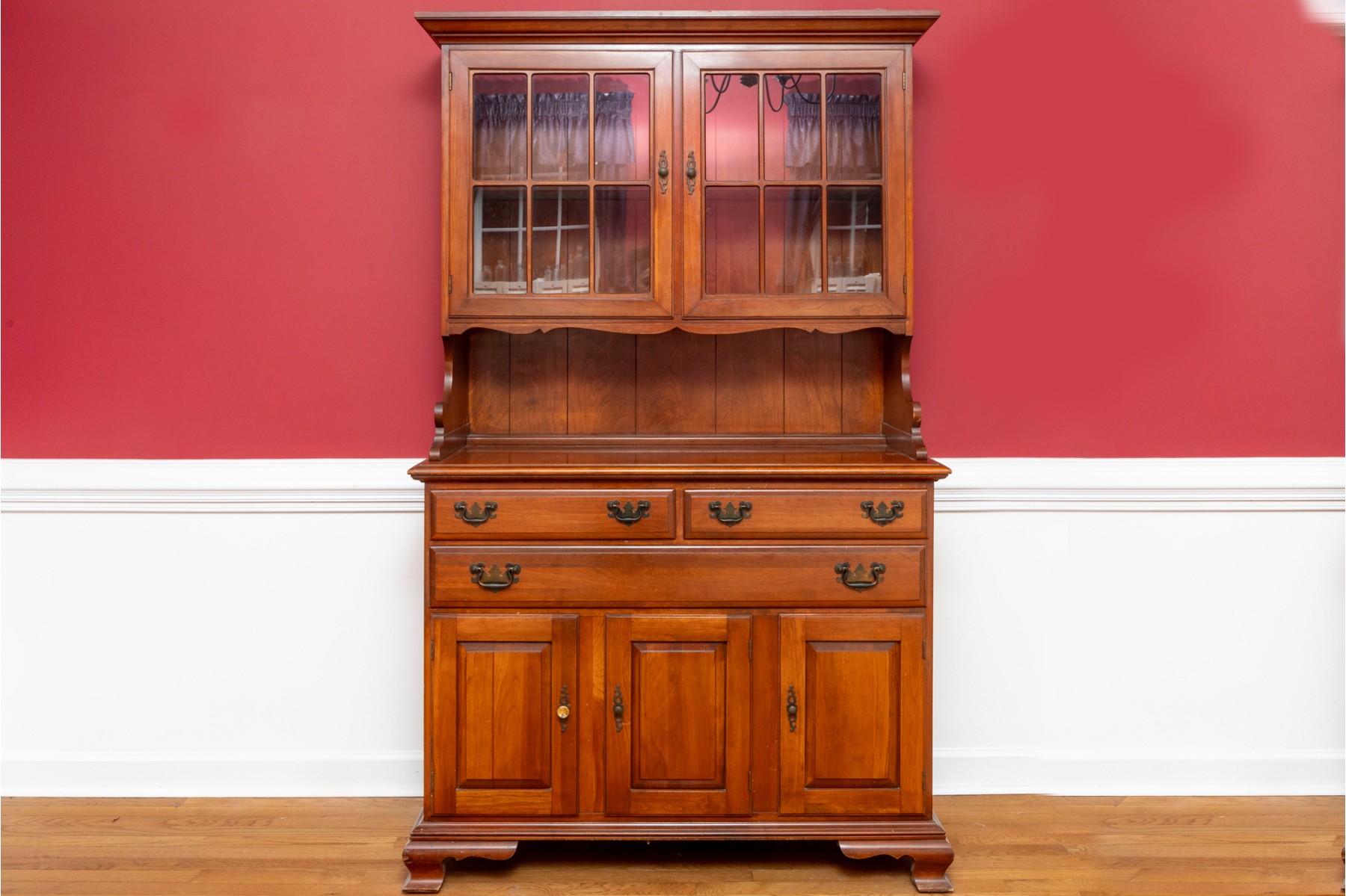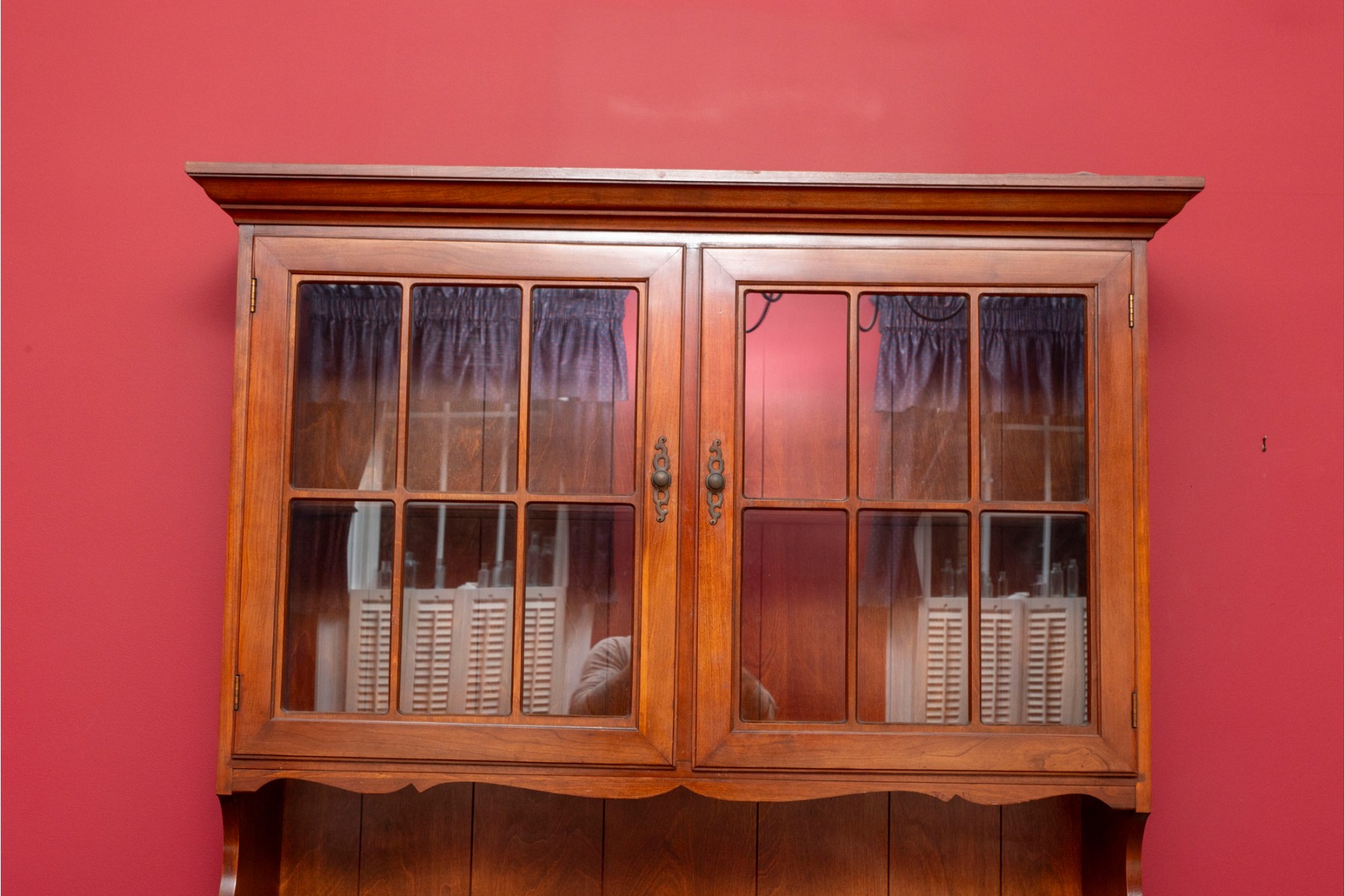 A wonderful, traditional two-piece hutch cupboard in richly hued, warm-toned medium brown cherry, displaying a glass-paned double door hutch over a cupboard of three dovetail drawers and three cabinet doors. The top right drawer is lined in green velvet and contains cutlery compartments.