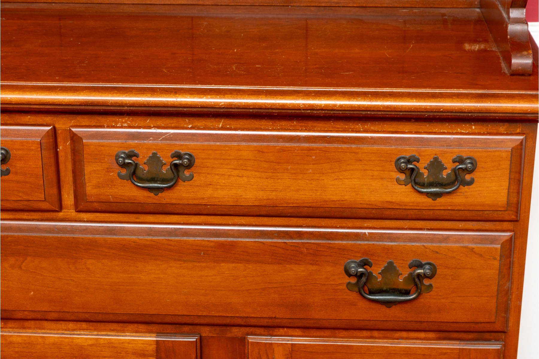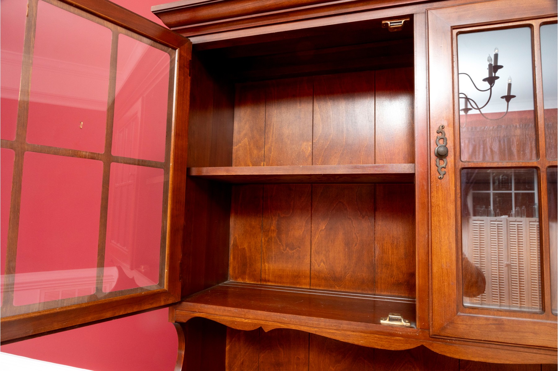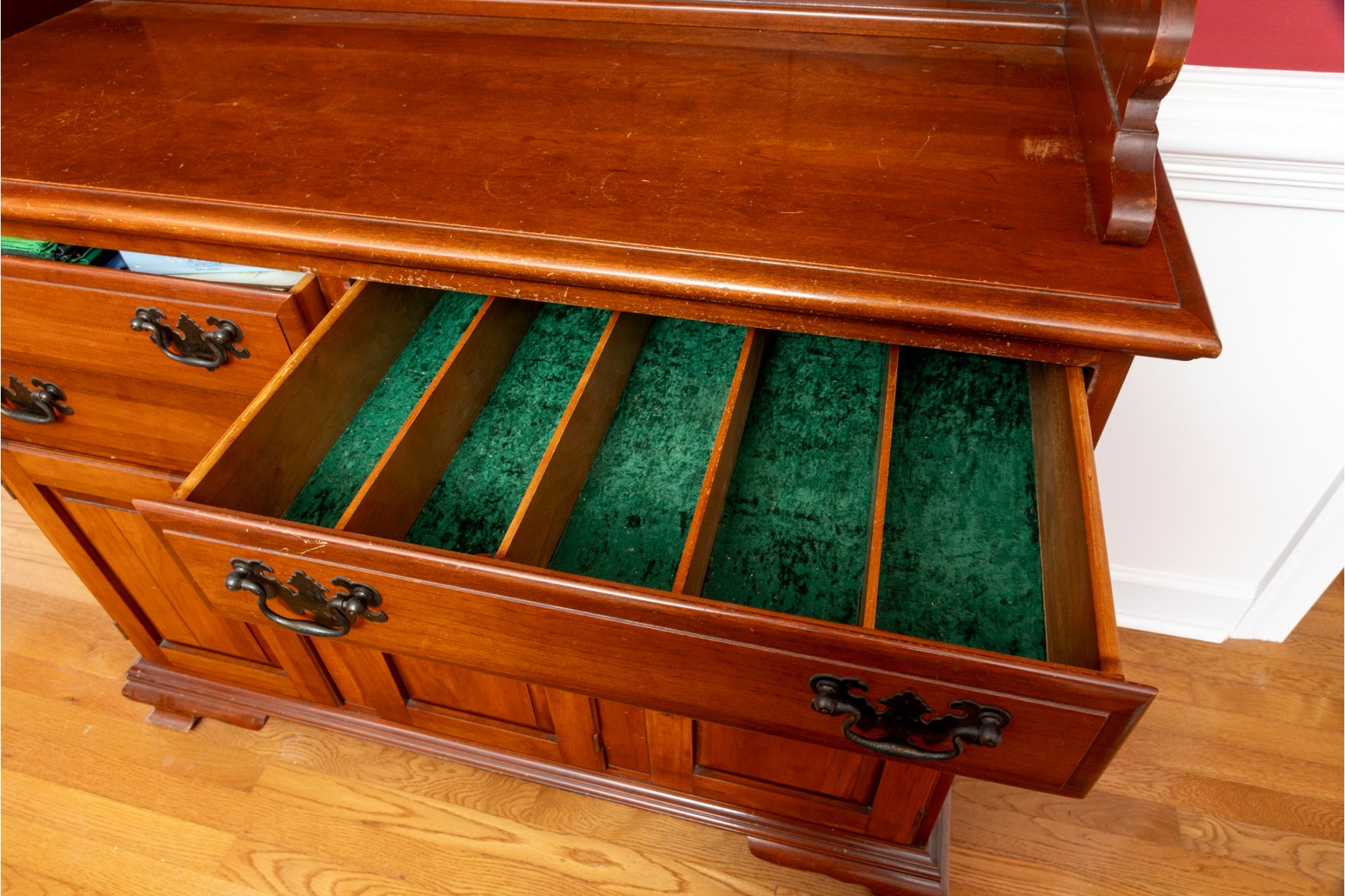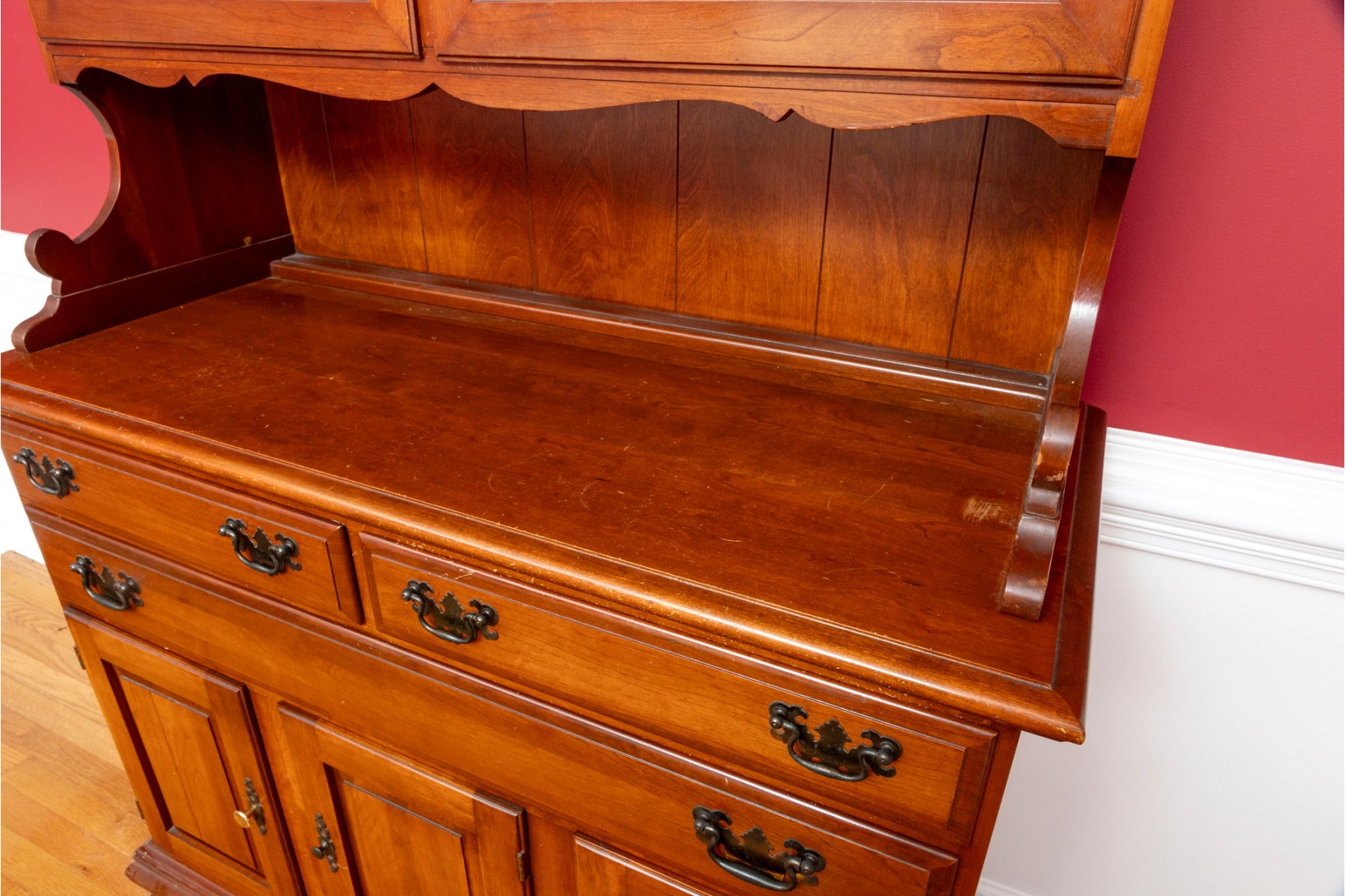 A wonderful, traditional two-piece hutch cupboard in richly hued, warm-toned medium brown cherry, displaying a glass-paned double door hutch over a cupboard of three dovetail drawers and three cabinet doors. The top right drawer is lined in green velvet and contains cutlery compartments.