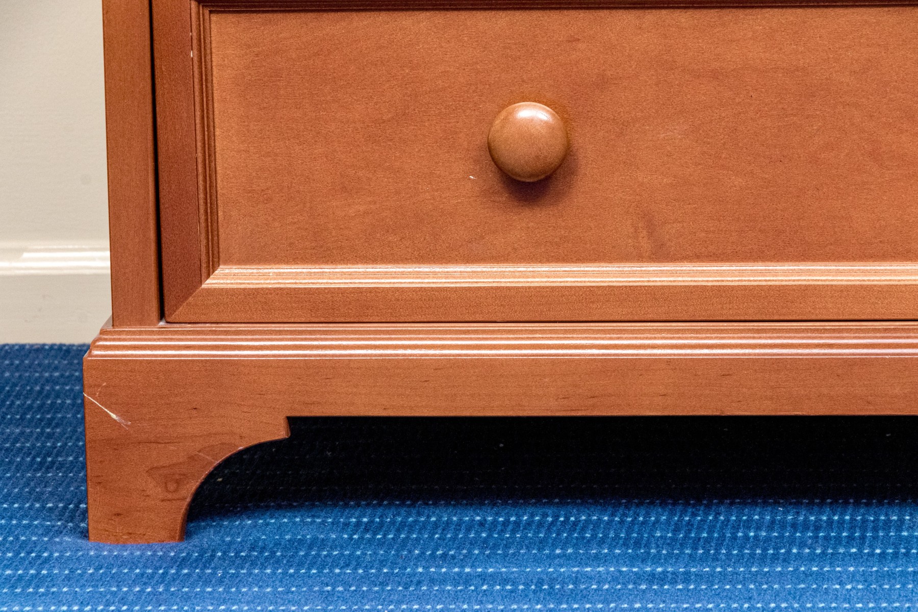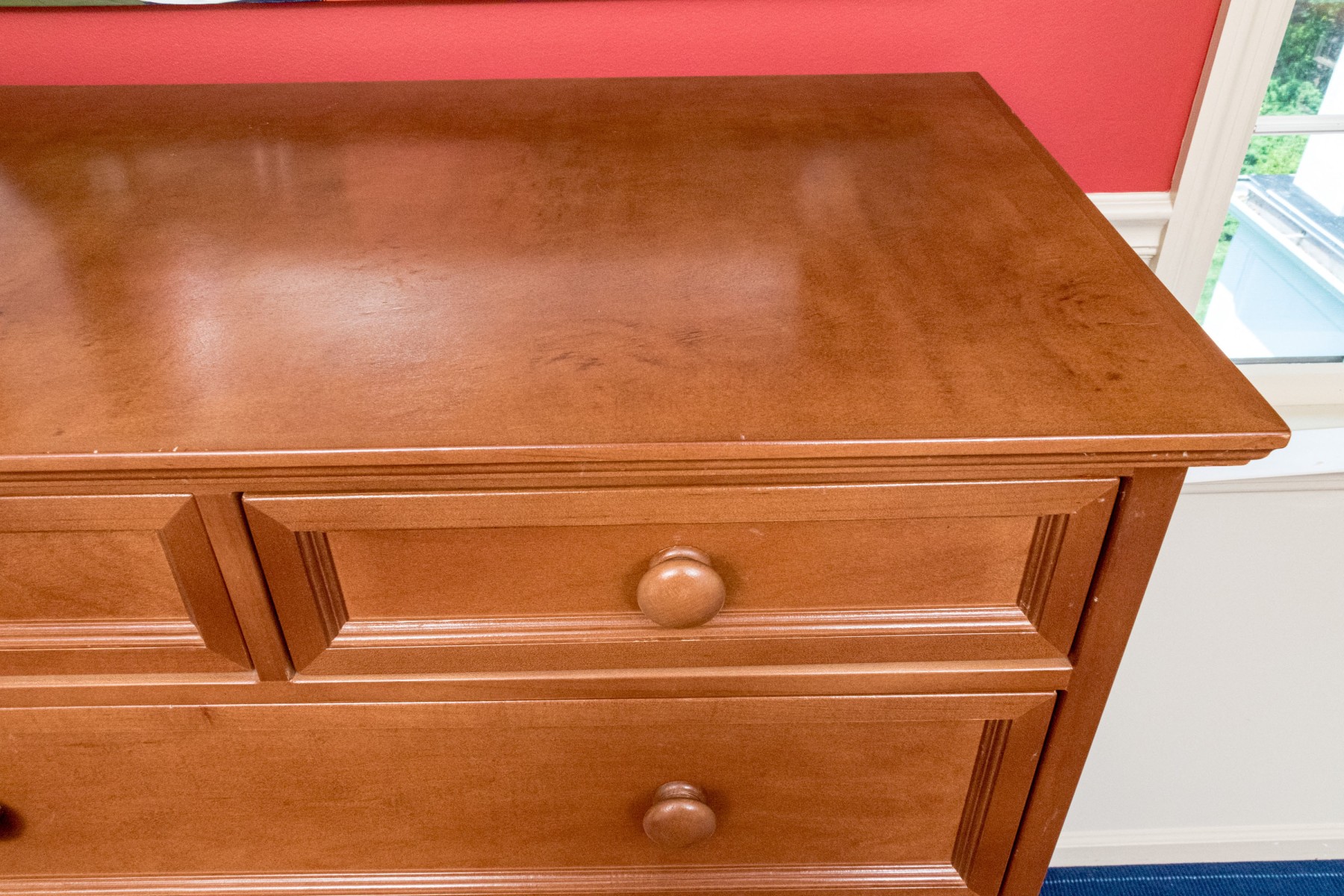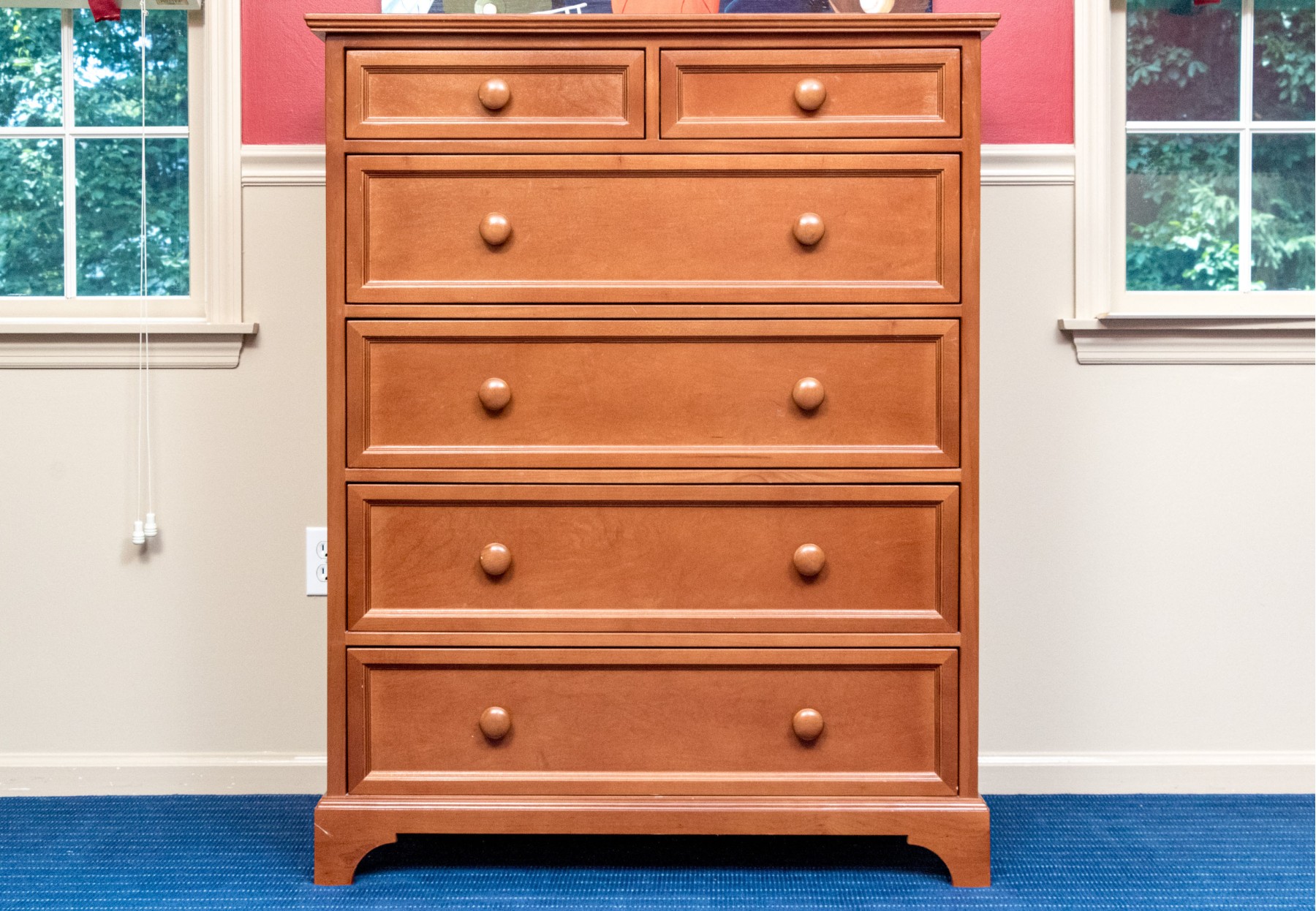 A traditional chest of drawers with a two-over-four arrangement of drawers in a handsome honeyed medium brown finish.