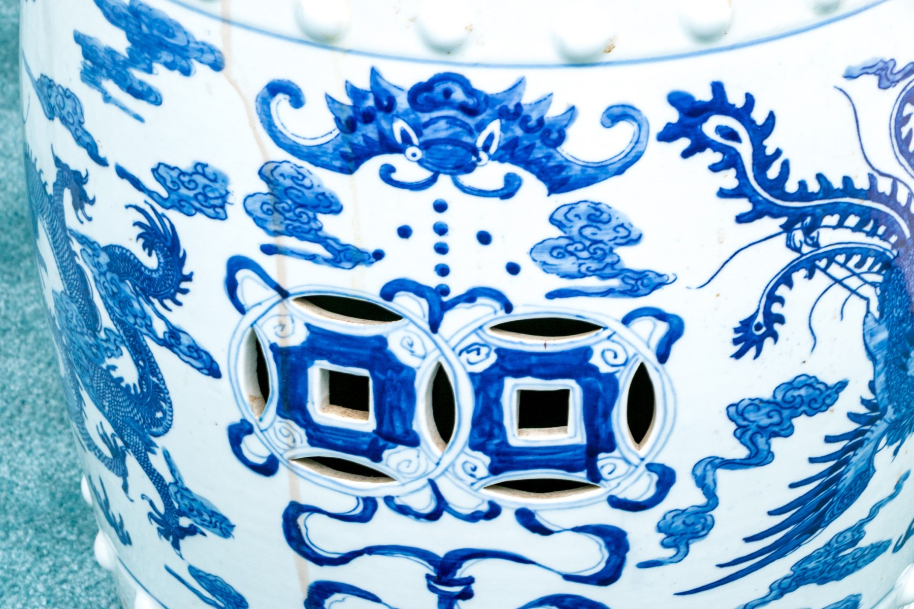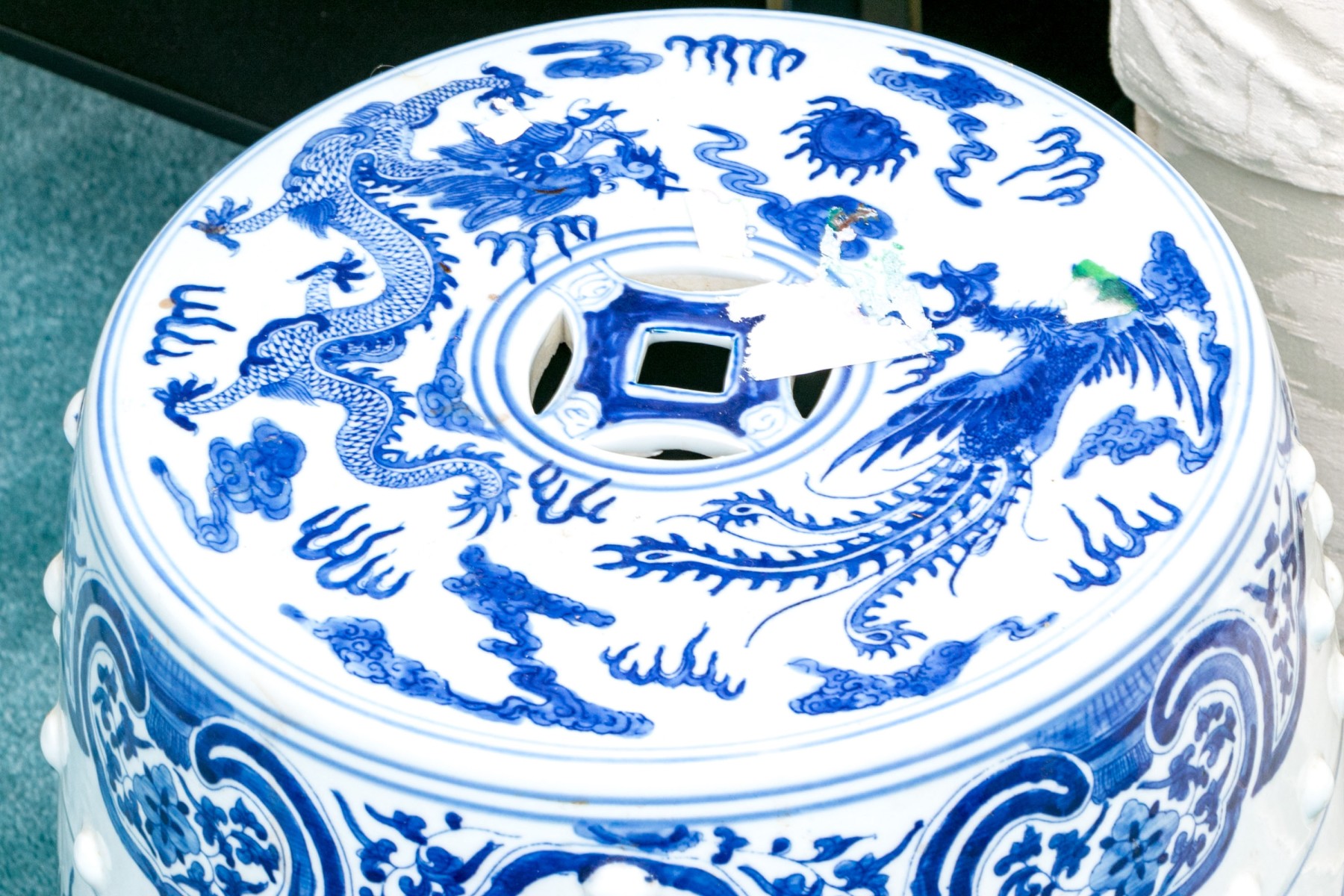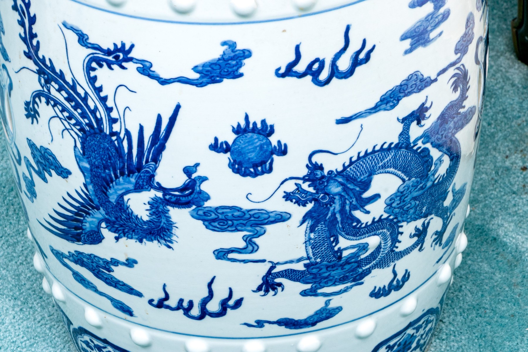 Raised embossed motif with dragon and phoenix motif.