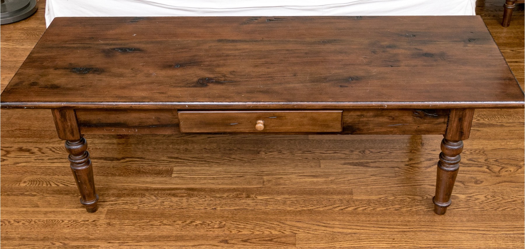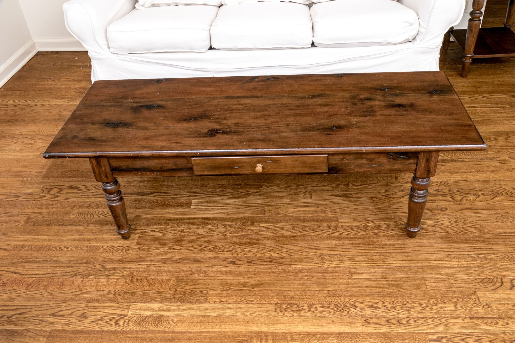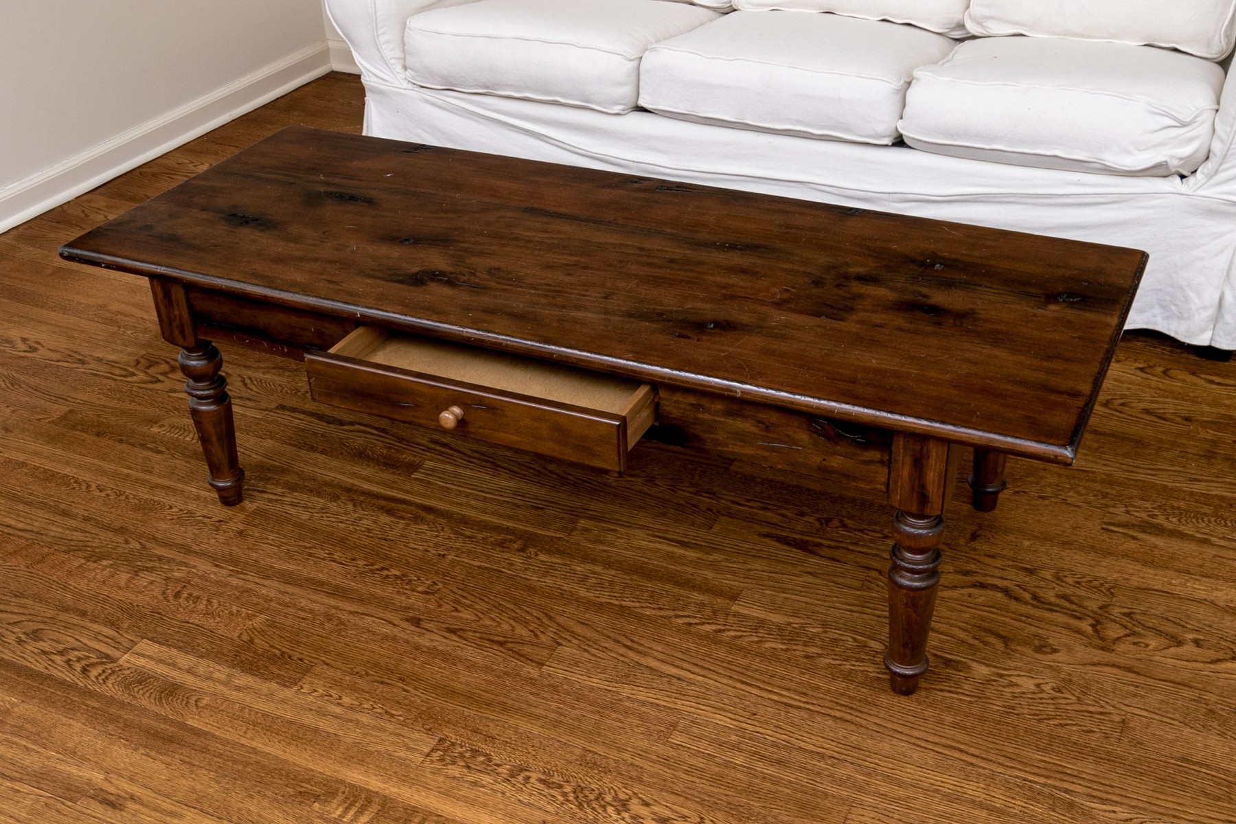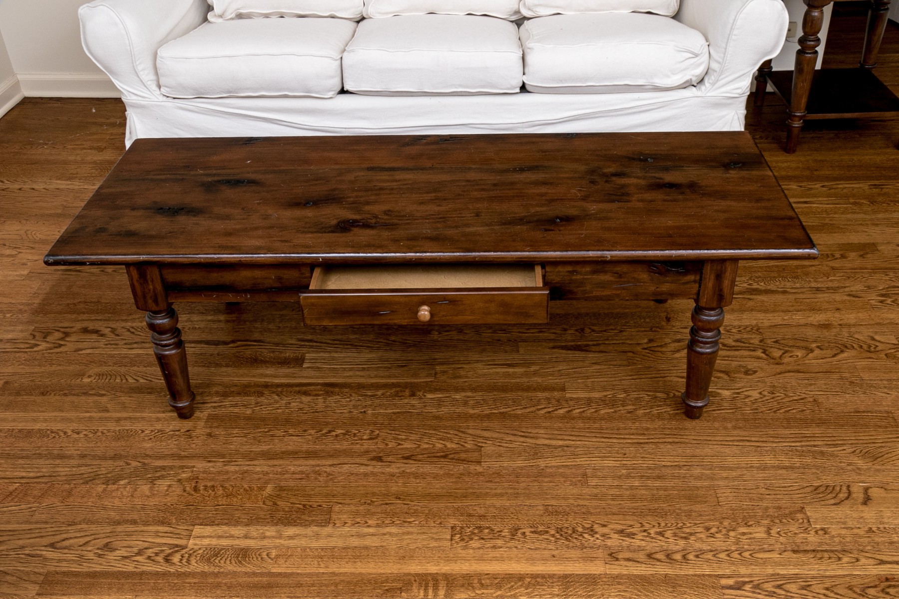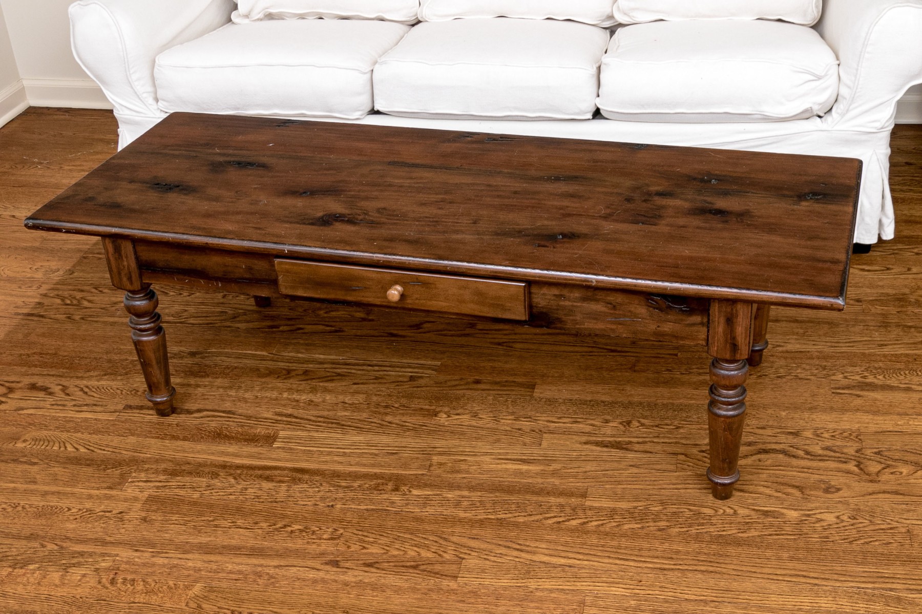 A fabulous cocktail table simply and elegantly designed with great traditional, French country, and farmhouse appeal. Well constructed with a medium-dark brown finish, the table showcases a long rectangular top overhanging a straight apron with a single drawer adorned with a simple circular knob. Raised over nicely turned and banded legs subtly tapering to the feet.