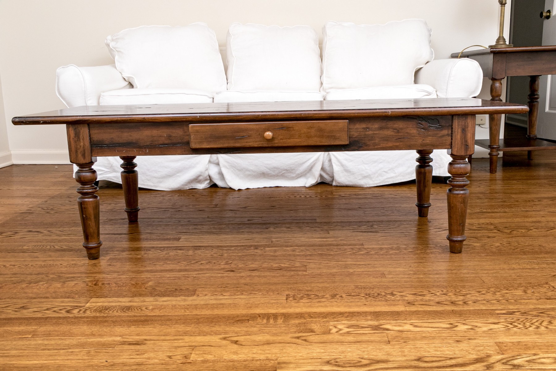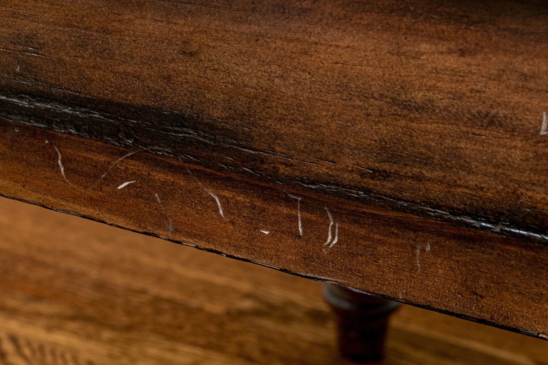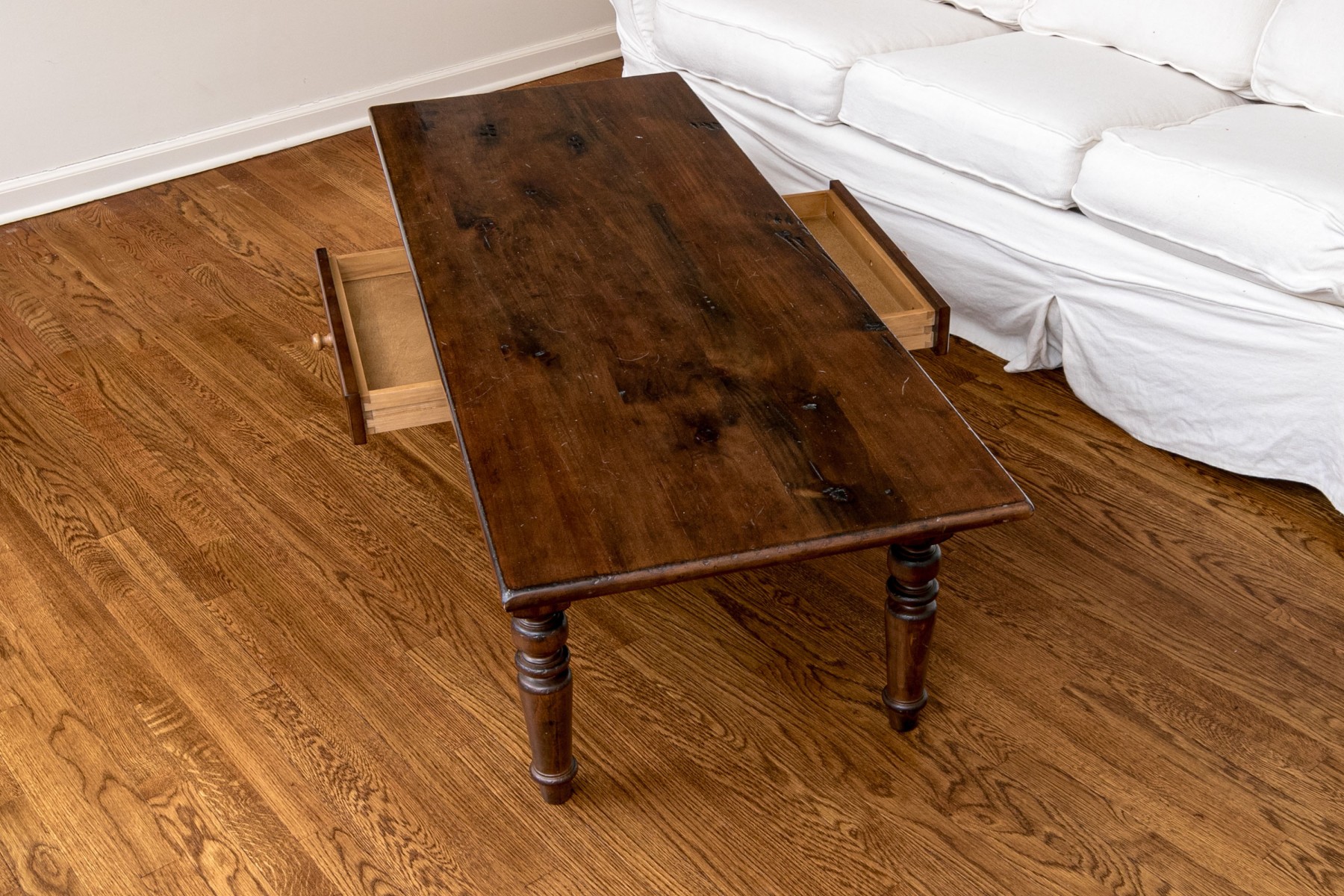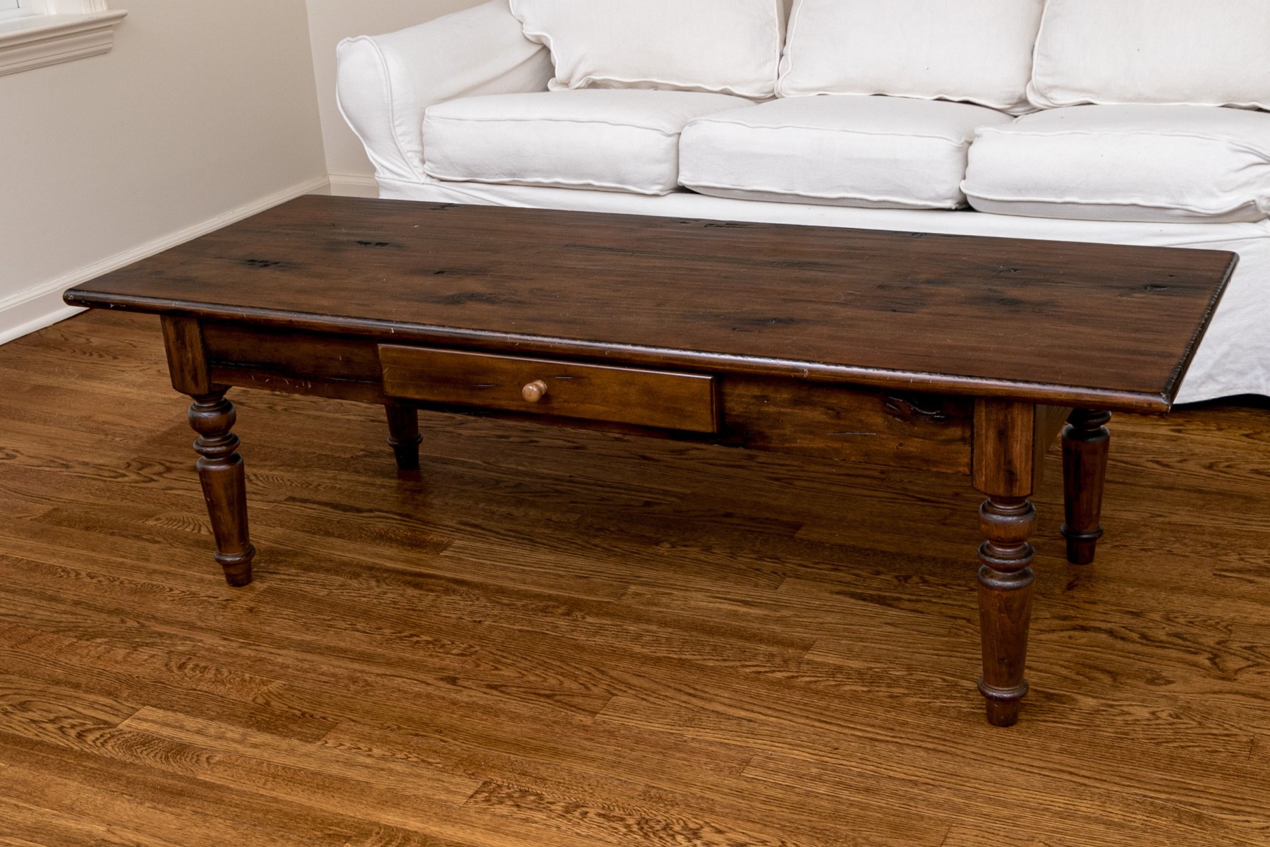 A fabulous cocktail table simply and elegantly designed with great traditional, French country, and farmhouse appeal. Well constructed with a medium-dark brown finish, the table showcases a long rectangular top overhanging a straight apron with a single drawer adorned with a simple circular knob. Raised over nicely turned and banded legs subtly tapering to the feet.