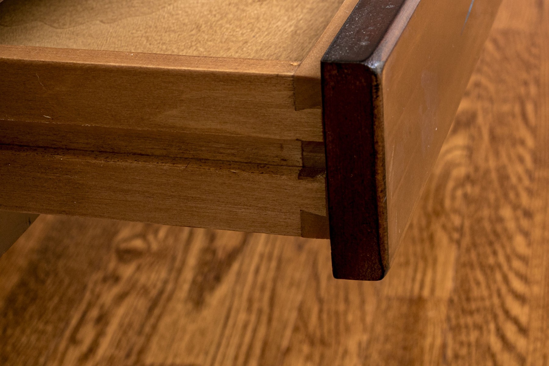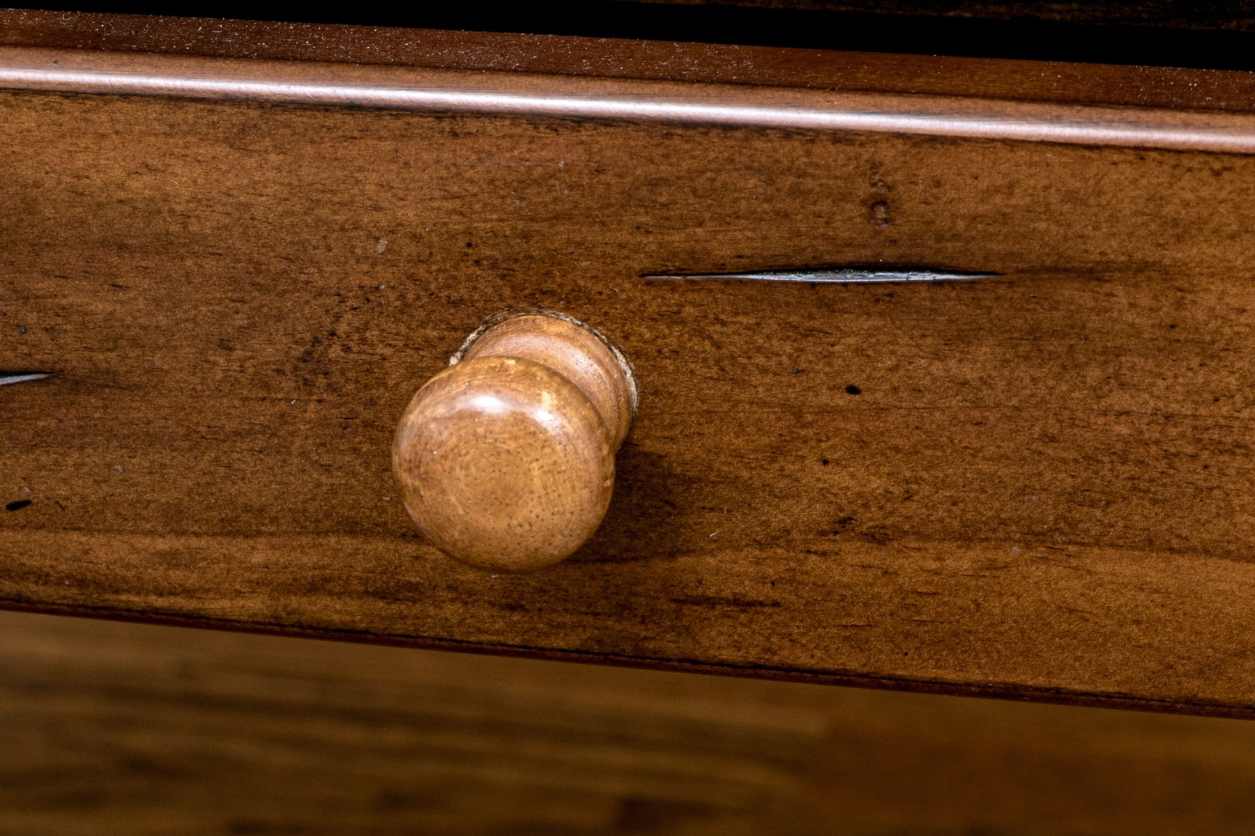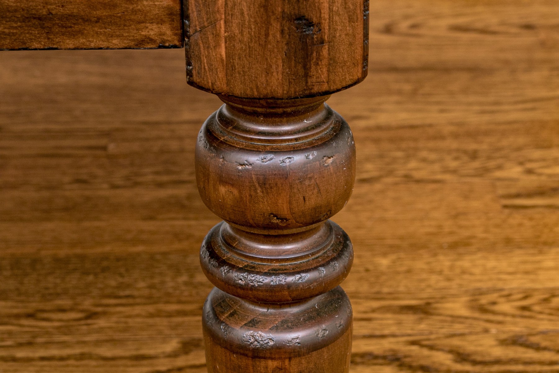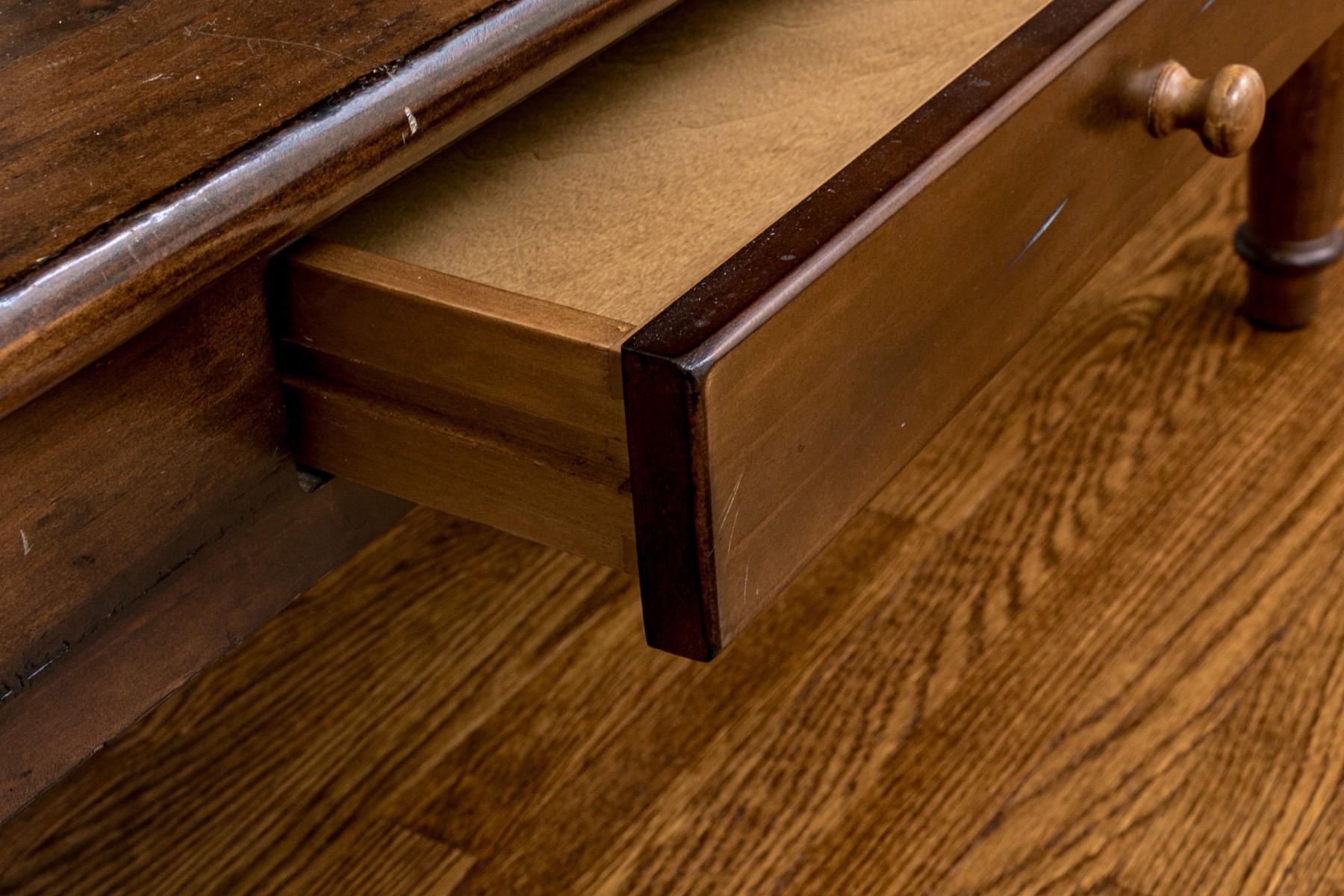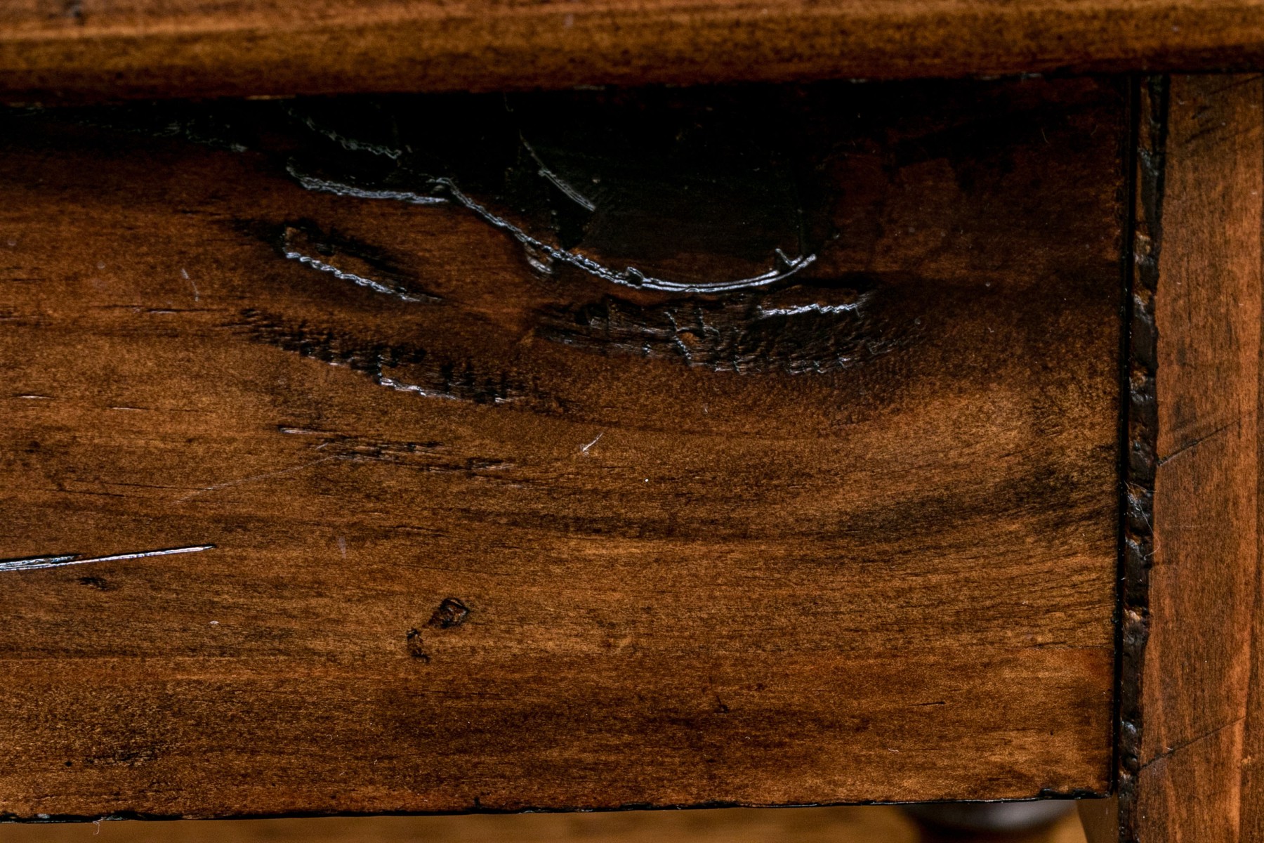 A fabulous cocktail table simply and elegantly designed with great traditional, French country, and farmhouse appeal. Well constructed with a medium-dark brown finish, the table showcases a long rectangular top overhanging a straight apron with a single drawer adorned with a simple circular knob. Raised over nicely turned and banded legs subtly tapering to the feet.