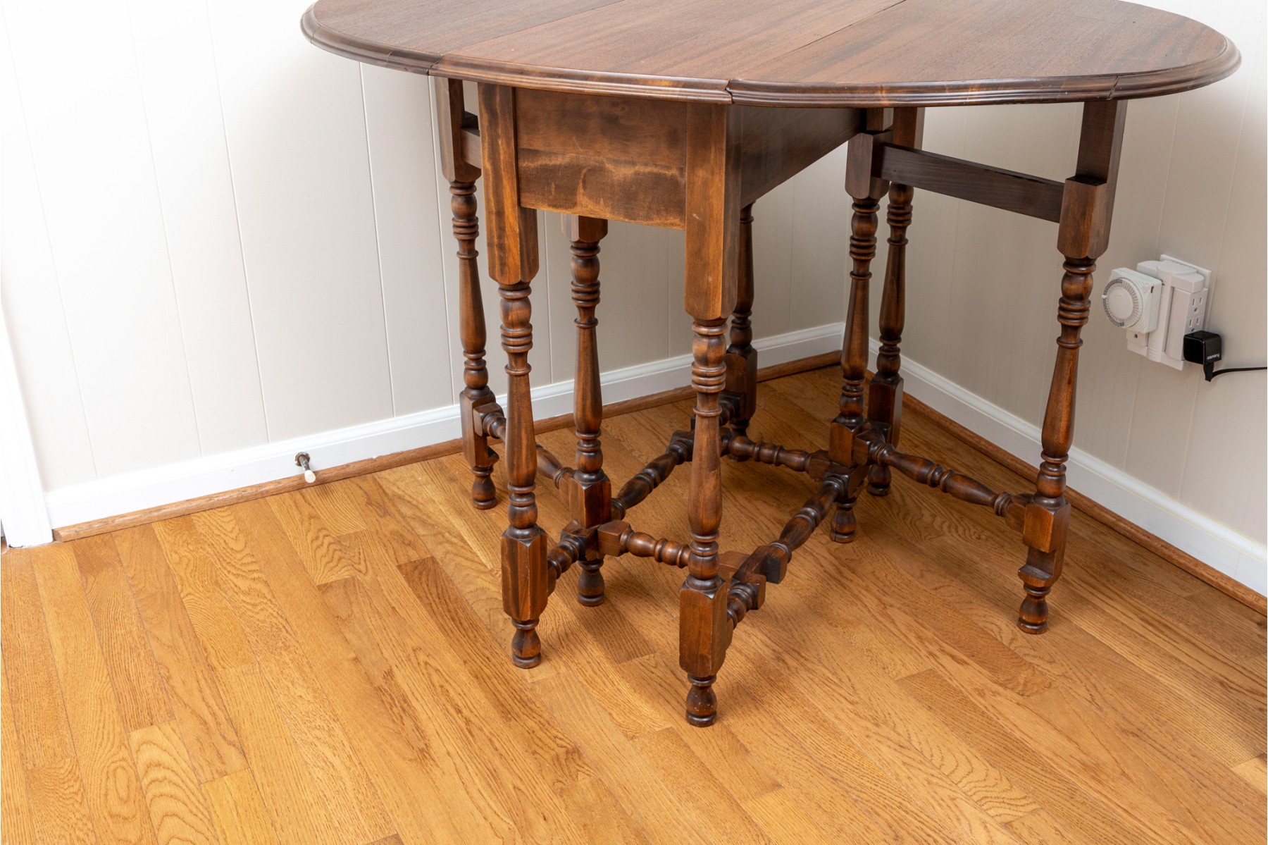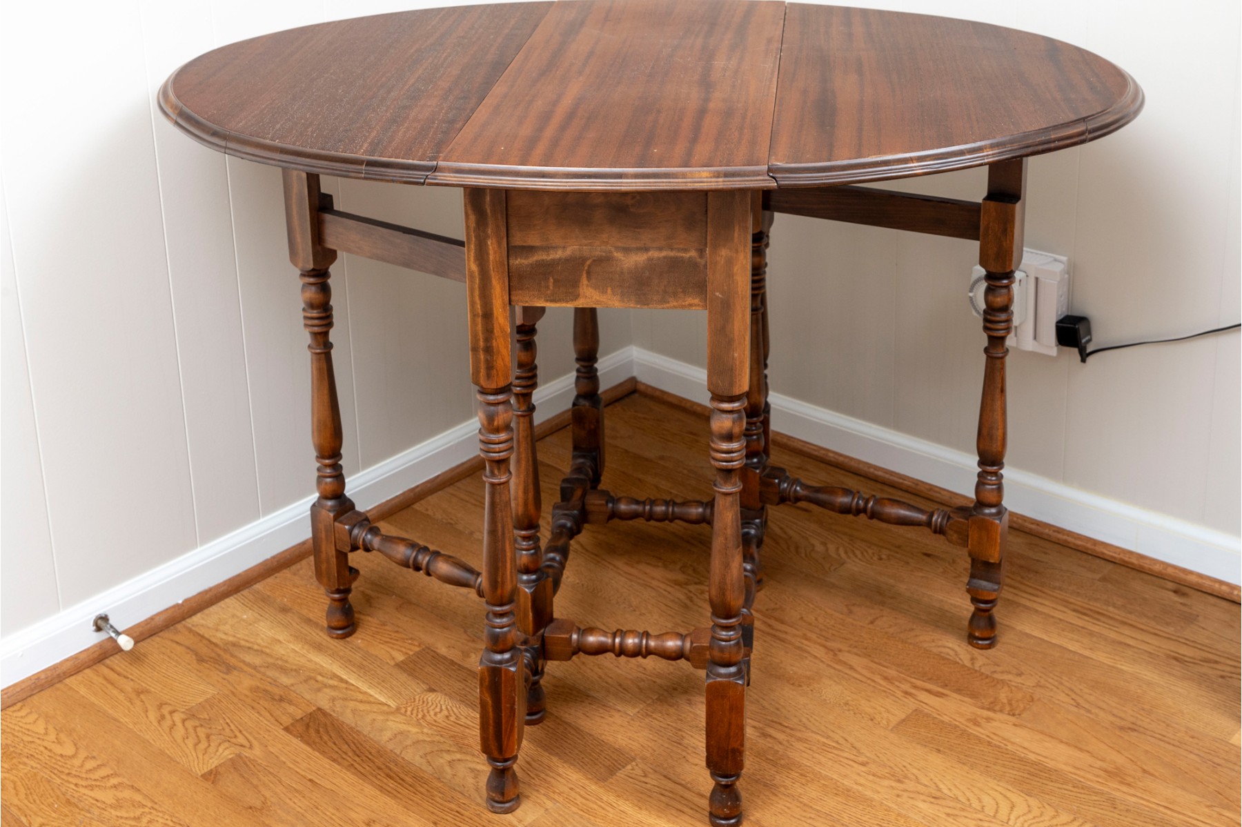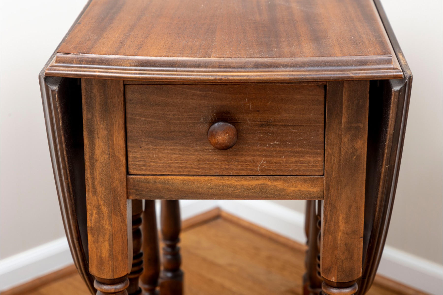 A traditional English gateleg table in beautiful warm medium brown wood. Features a single long drawer and nicely turned legs.