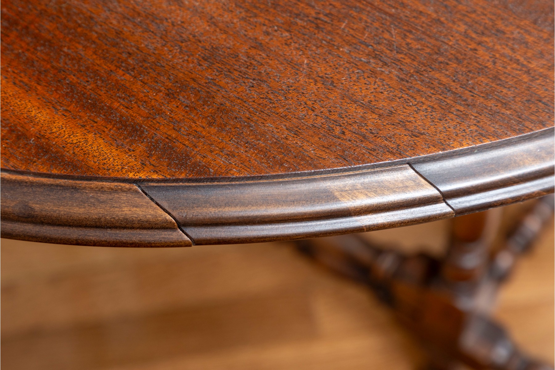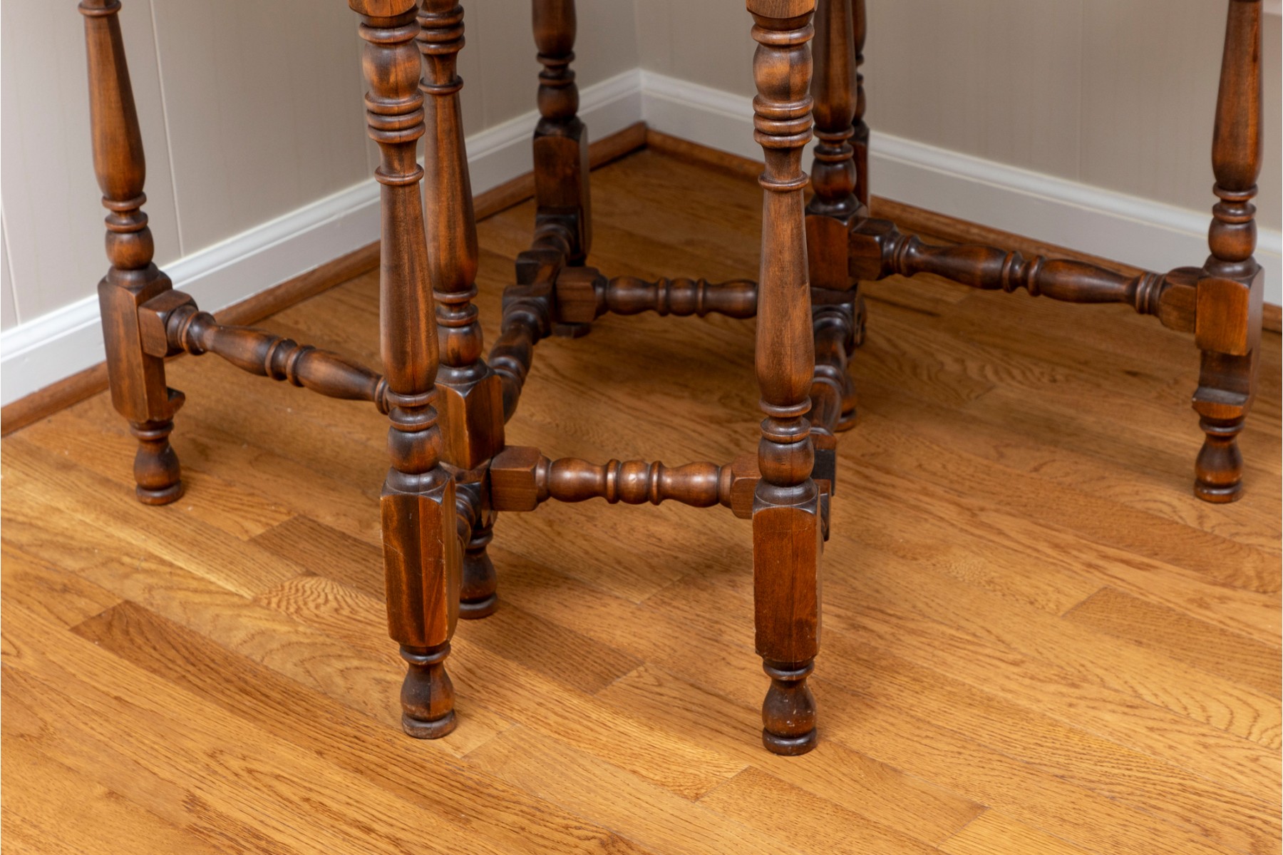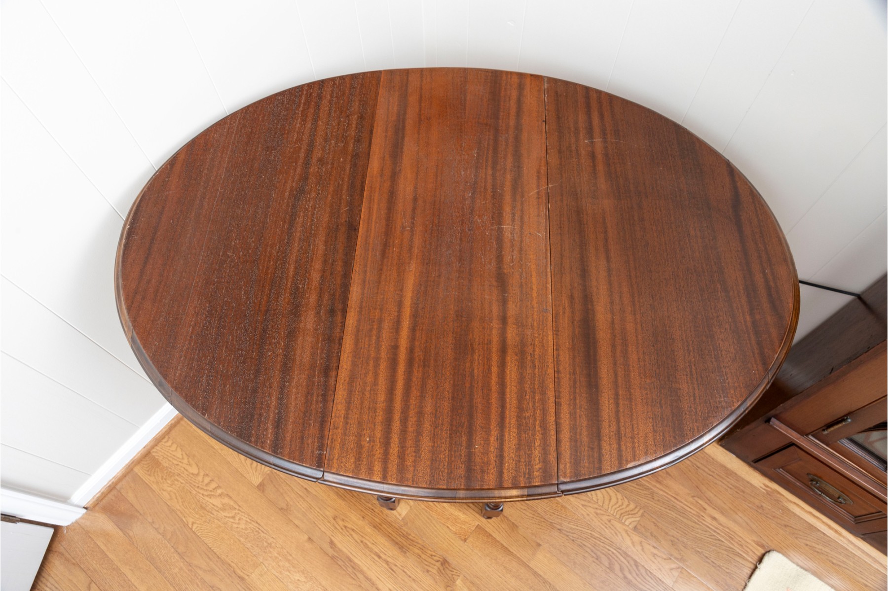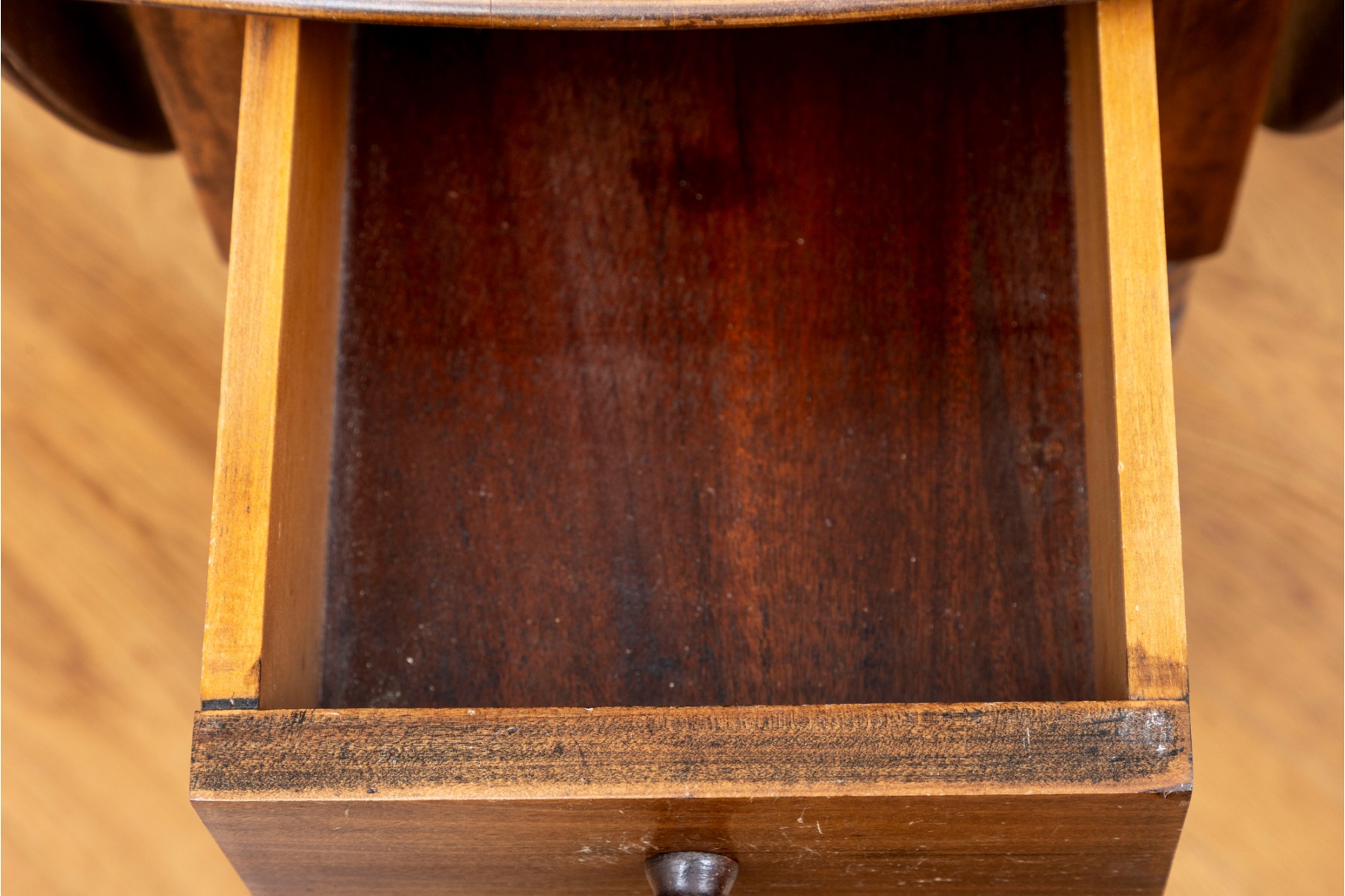 A traditional English gateleg table in beautiful warm medium brown wood. Features a single long drawer and nicely turned legs.