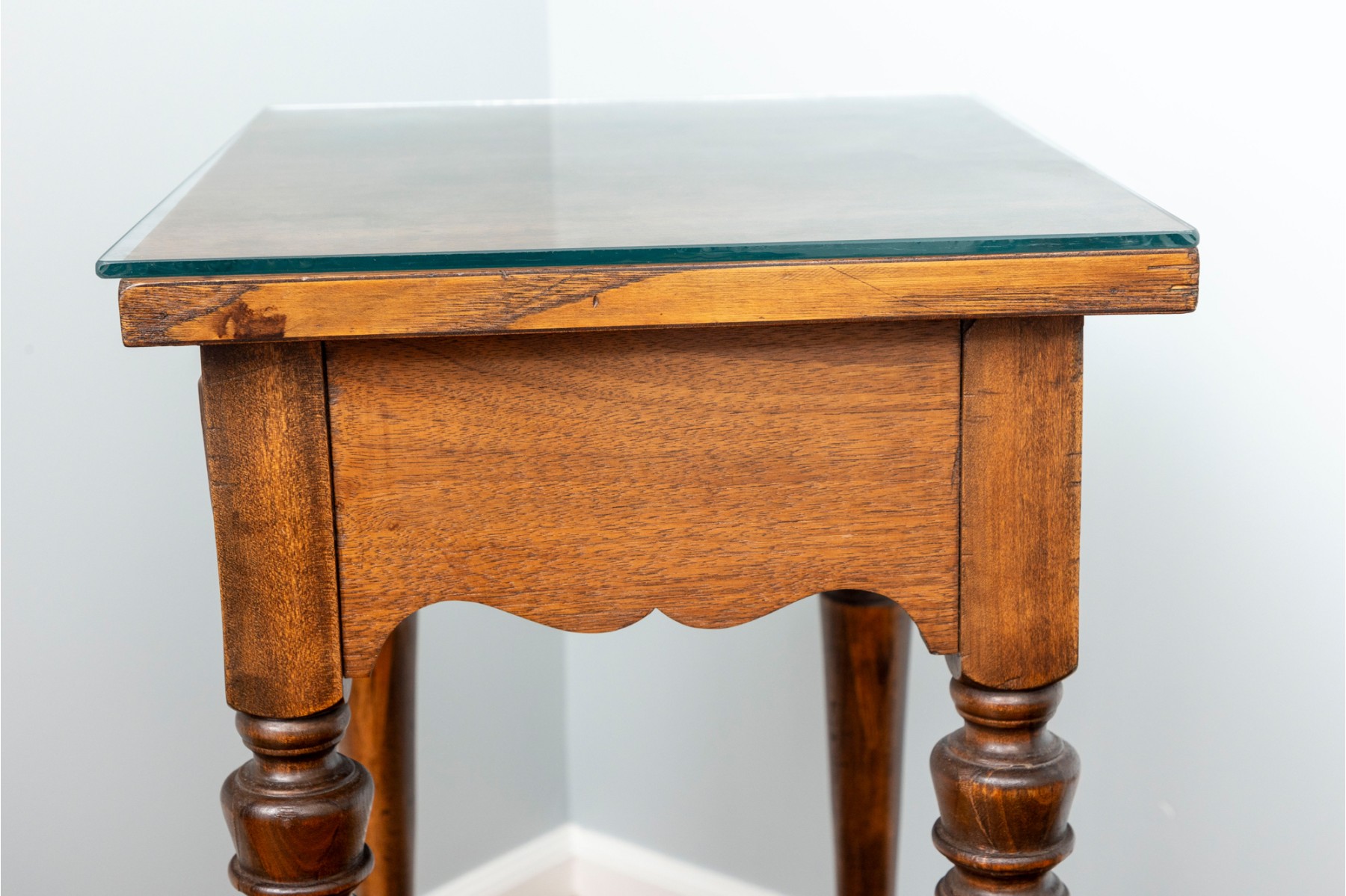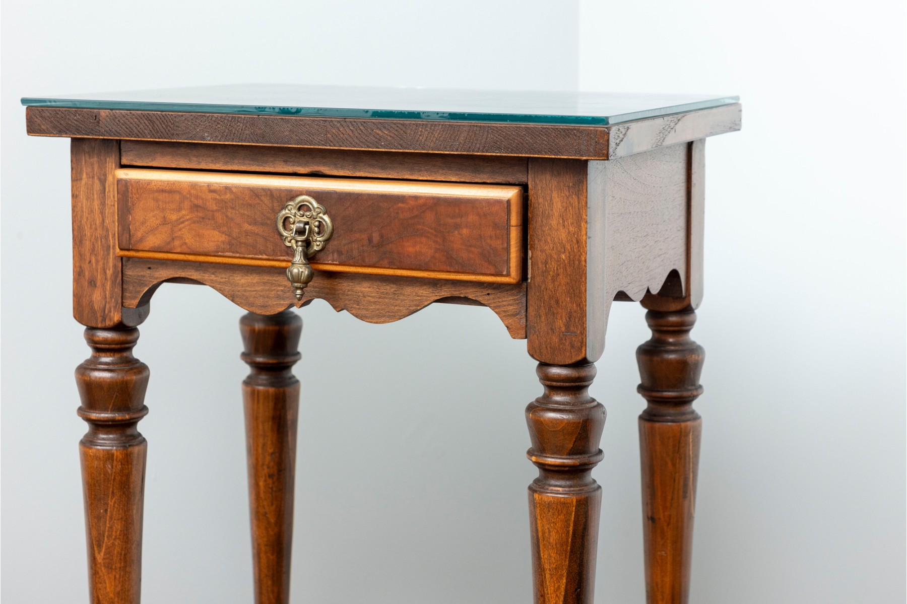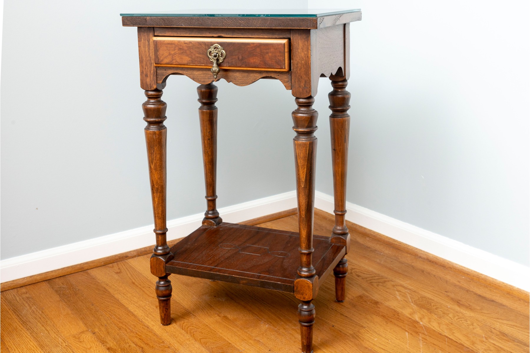 A lovely traditional nightstand in warm medium-light brown wood, displaying a rectangular glass top over a single drawer with a figured veneer. Features a scalloped apron flanked by turned and tapered legs around an open lower shelf.