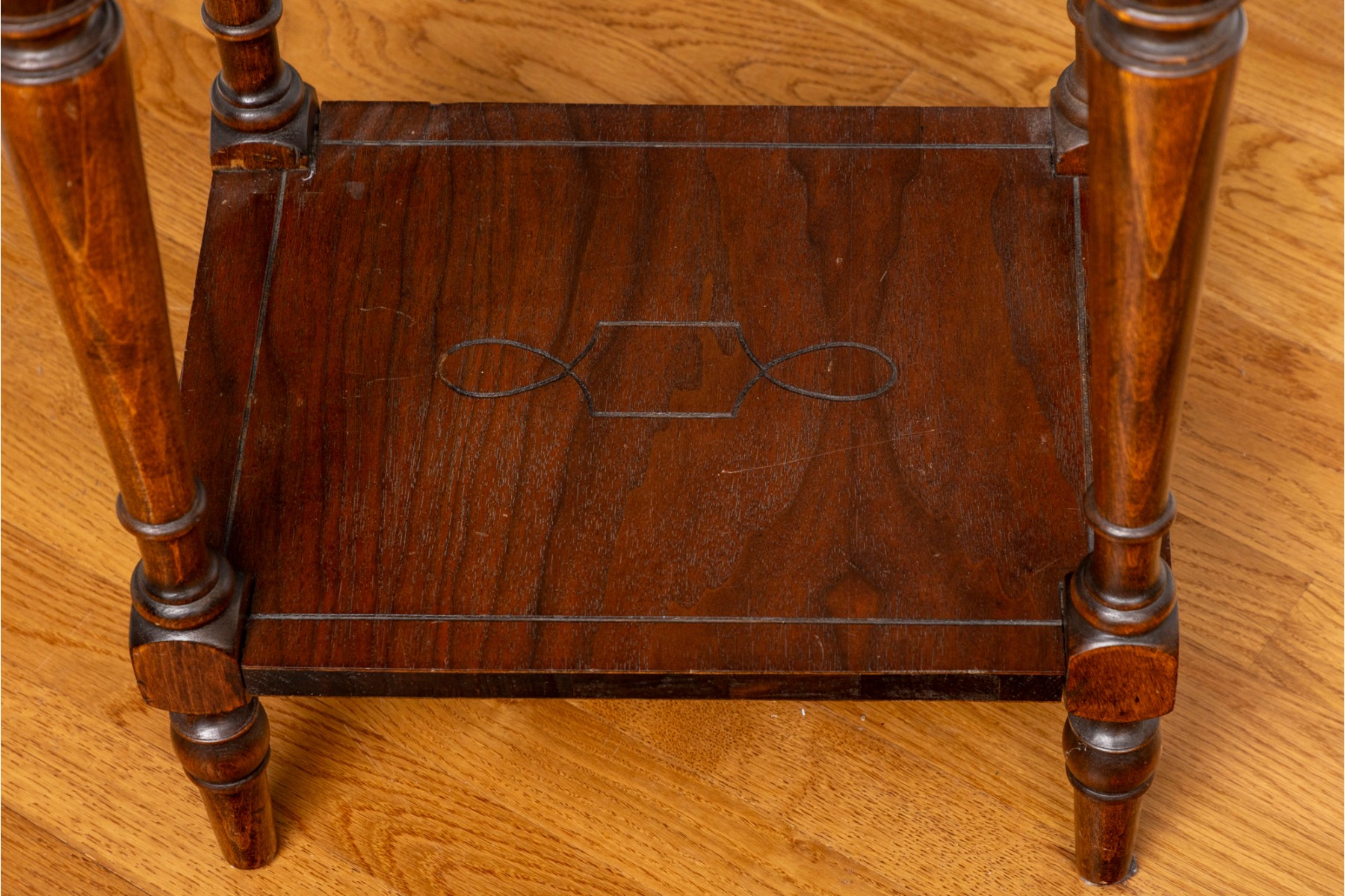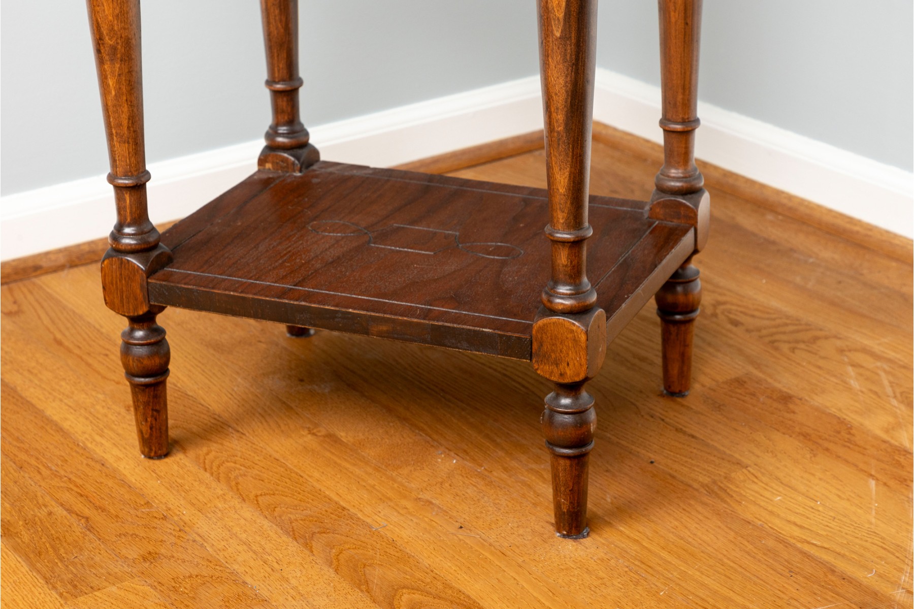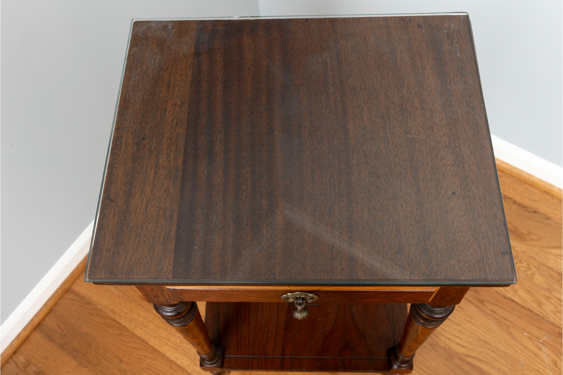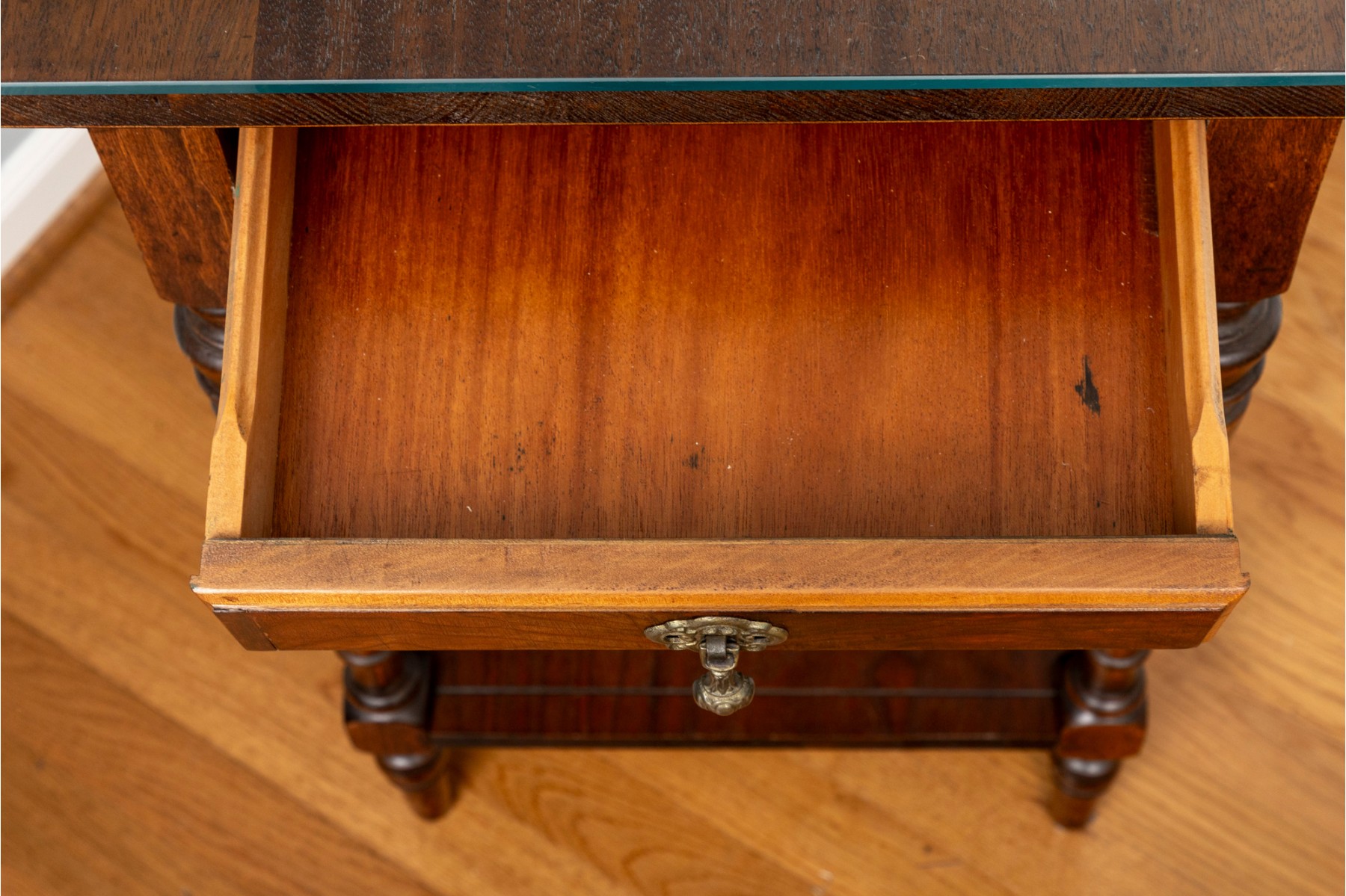 A lovely traditional nightstand in warm medium-light brown wood, displaying a rectangular glass top over a single drawer with a figured veneer. Features a scalloped apron flanked by turned and tapered legs around an open lower shelf.