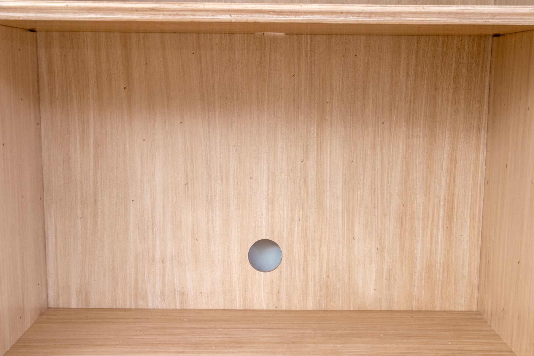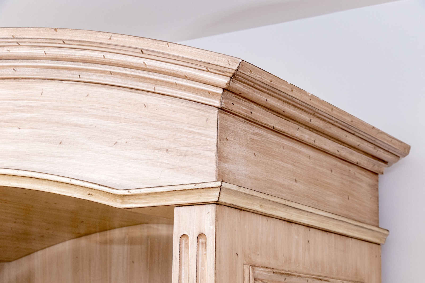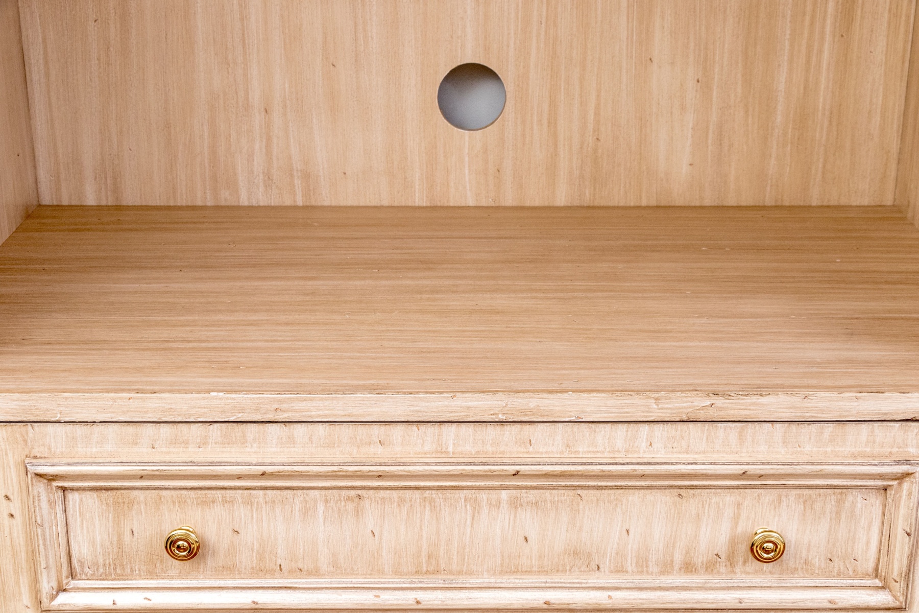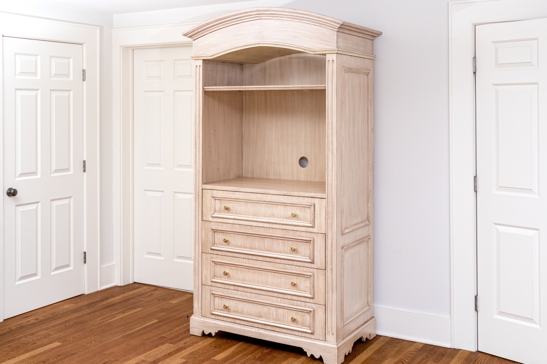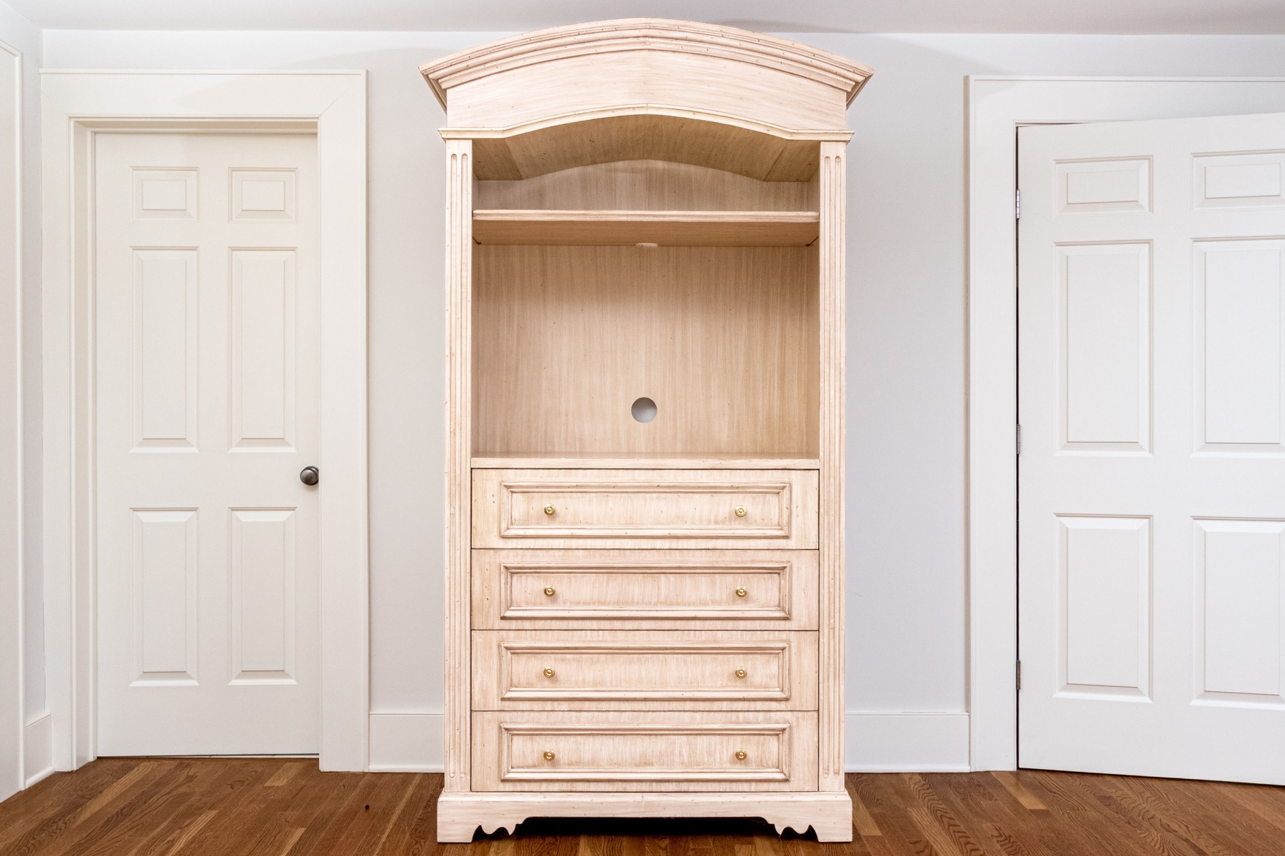A wonderful media cabinet combining farmhouse chic, transitional, and neoclassical flair for a stylish and versatile aesthetic. The cabinet features an arched crown over an open compartment with a high upper shelf and a pierced backboard for media use, leading down to a case of four drawers each adorned with double brass knobs. Nicely fluted posts add a columnar appearance, while shapely bracket legs add to the elegant appearance.