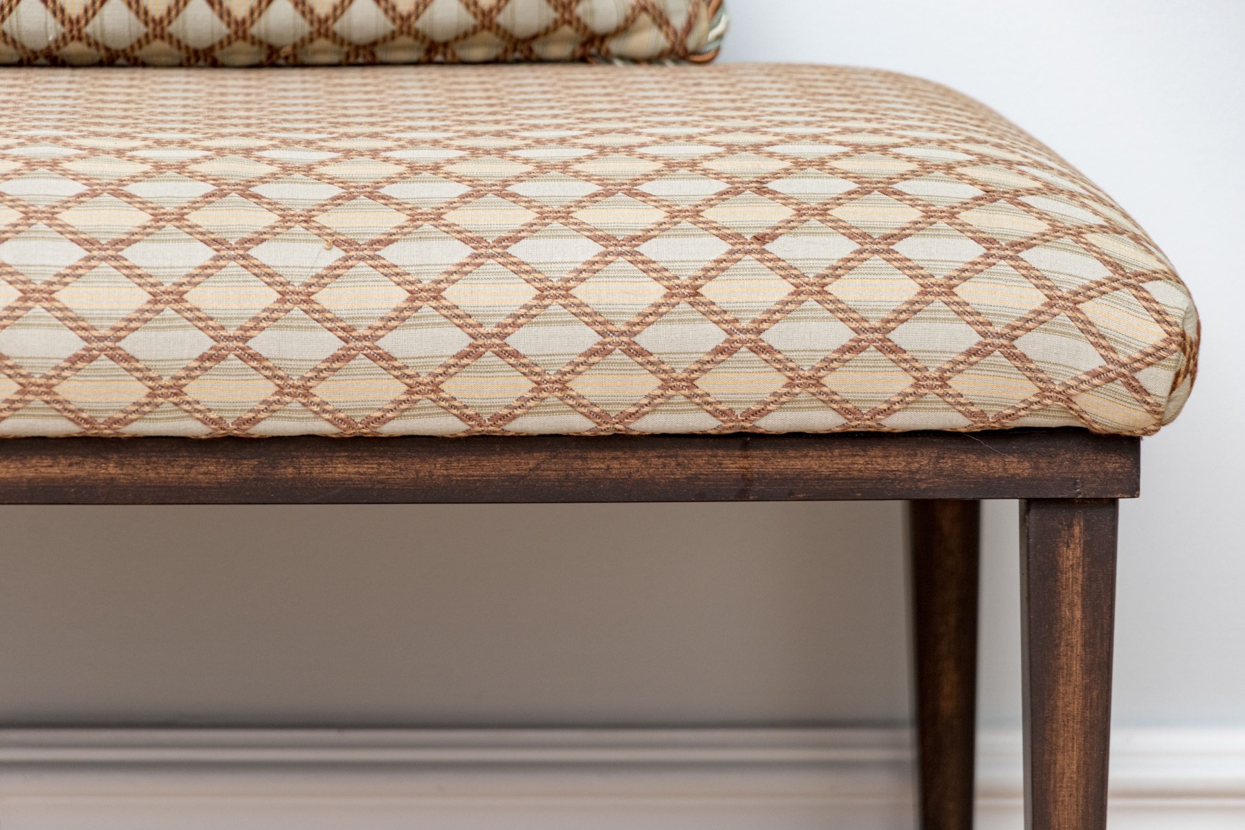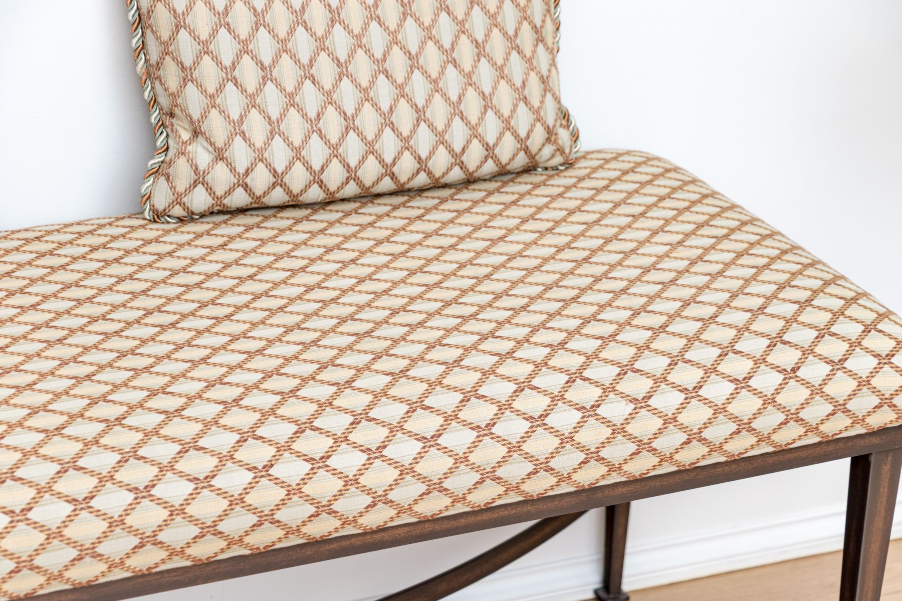 An elegant transitional-style bench featuring a slender, bronzed metal frame with gently tapered legs and an X-stretcher support. The bench is upholstered in a cream fabric with a repeating diamond lattice pattern in a warm tan tone, and includes two matching accent pillows