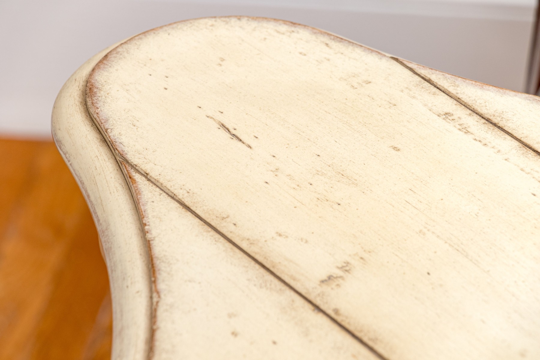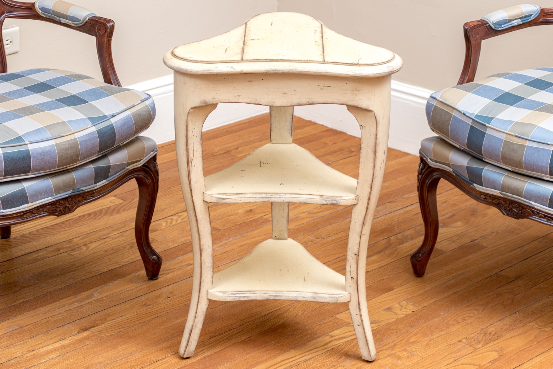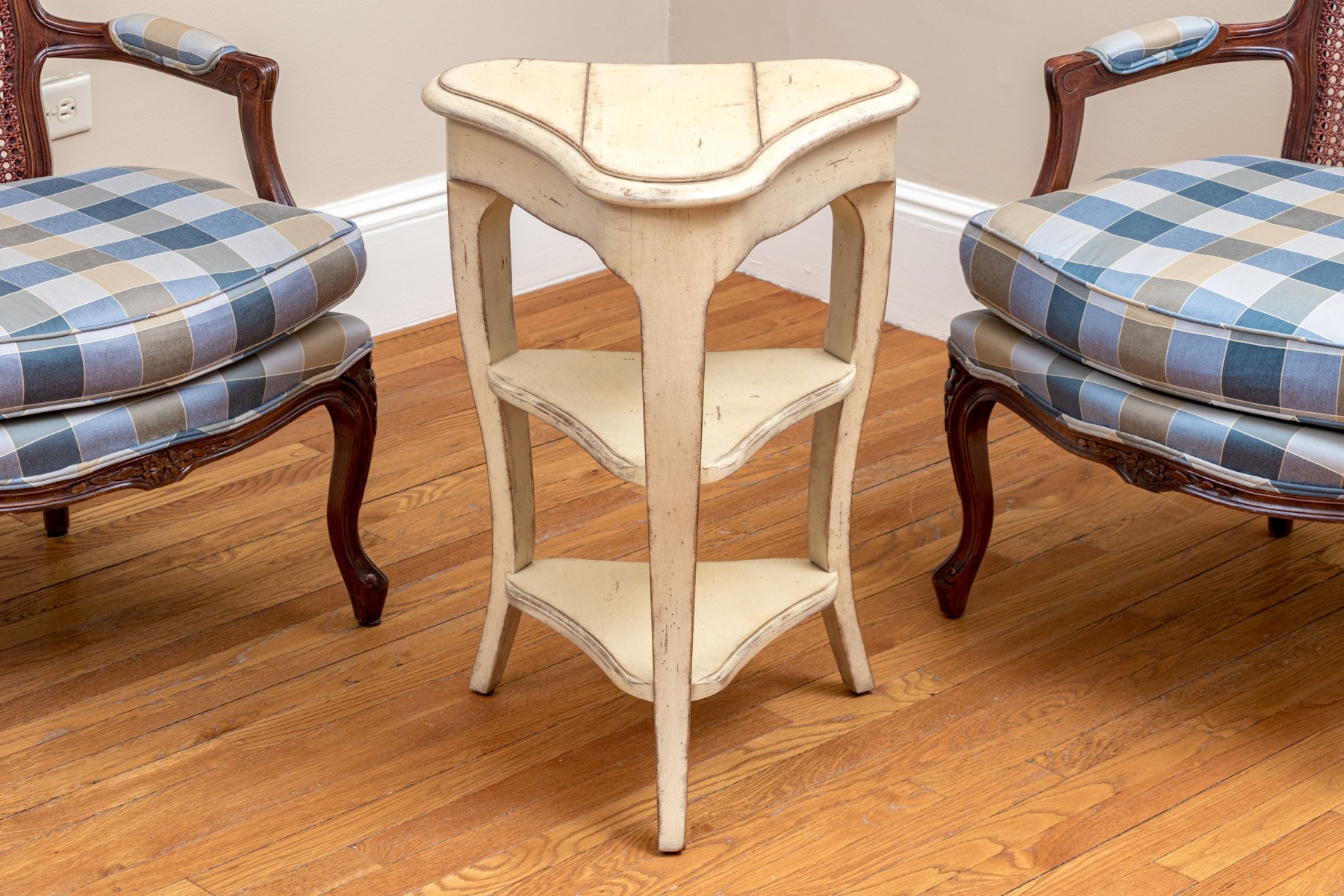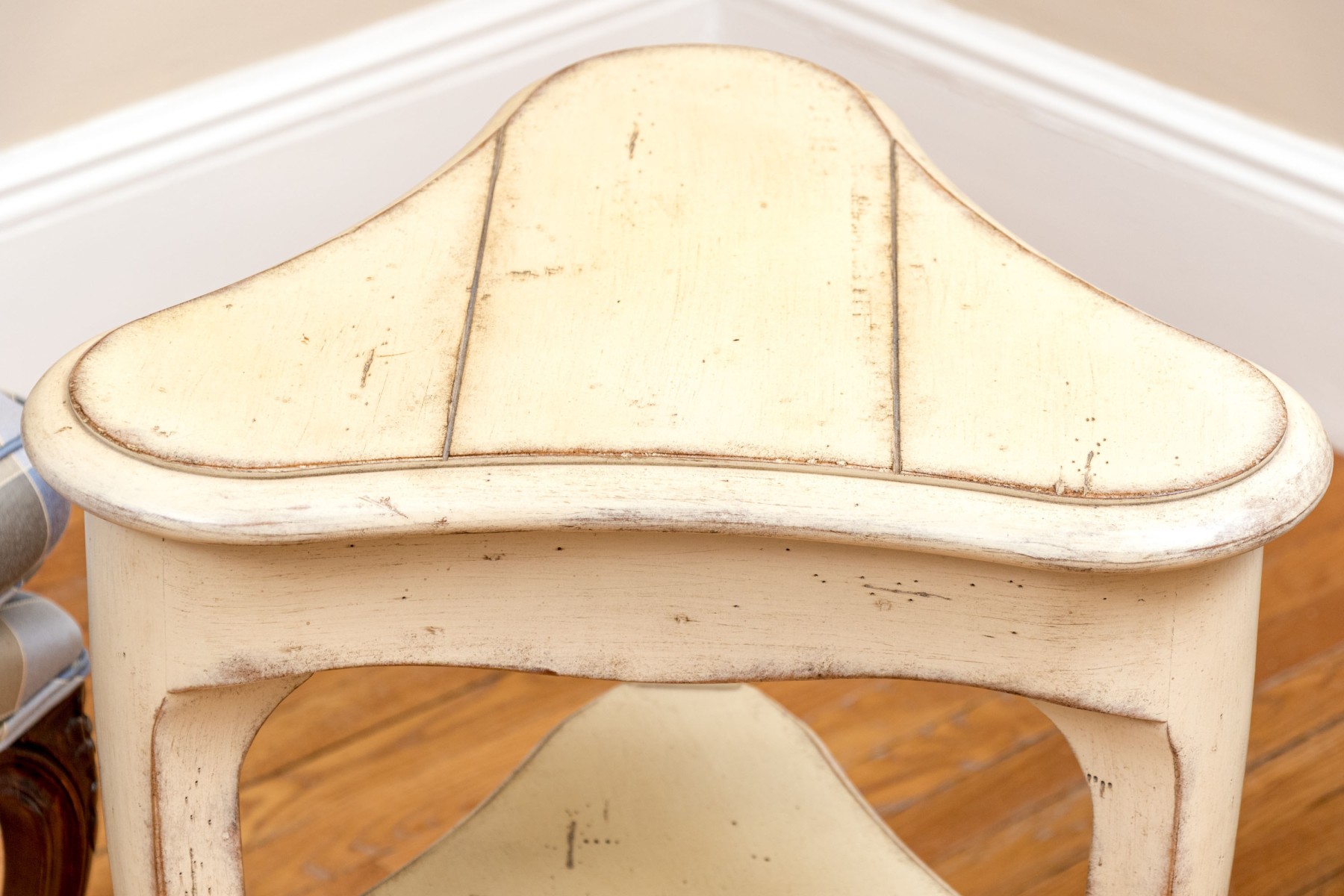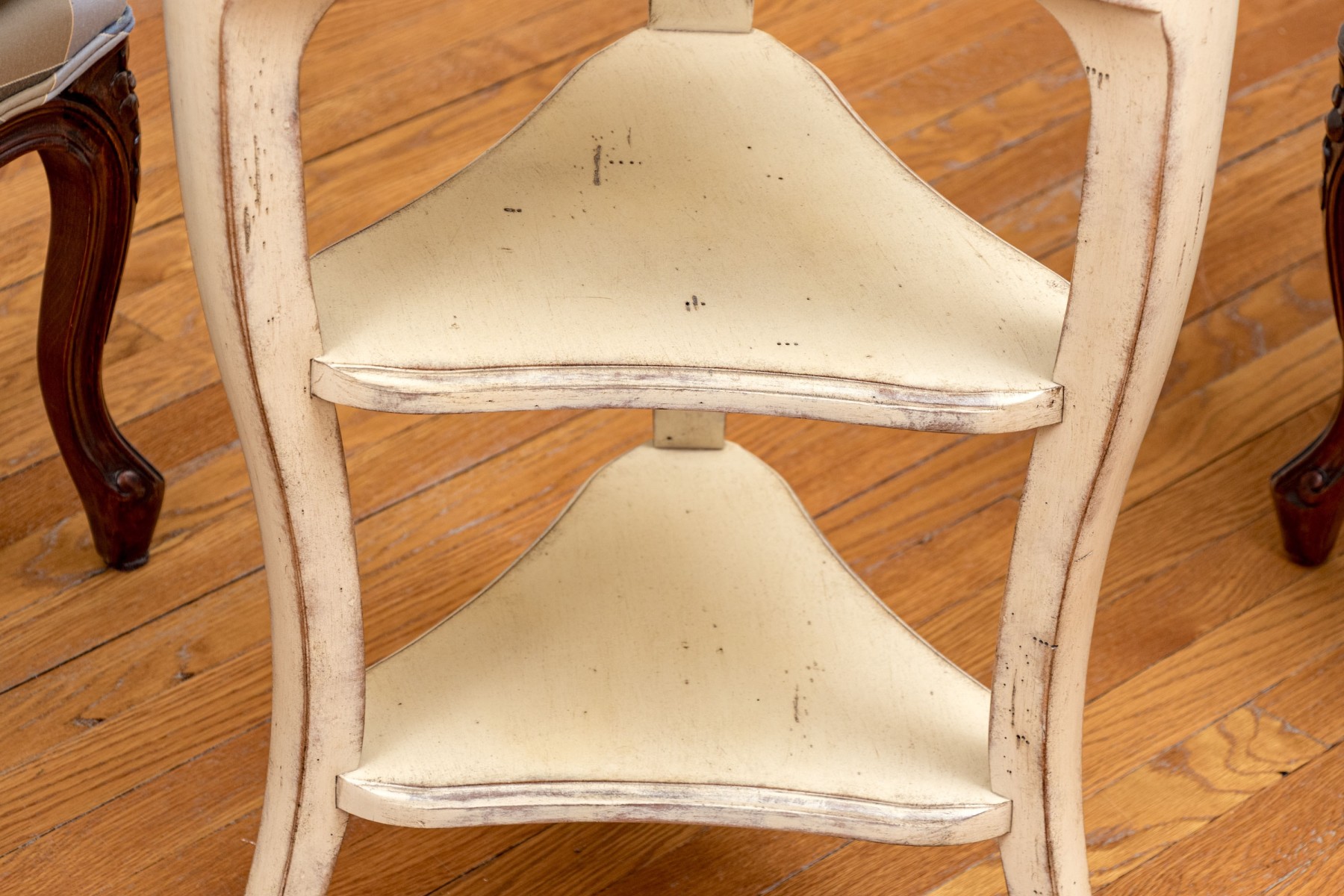 A delightful French country chic accent table painted rustic cream white over a paneled trefoil top, leading down to two lower tiers between three cabriole legs.