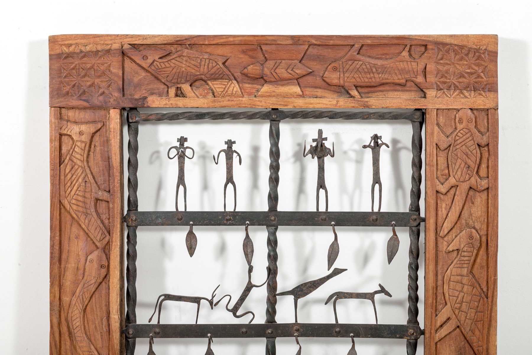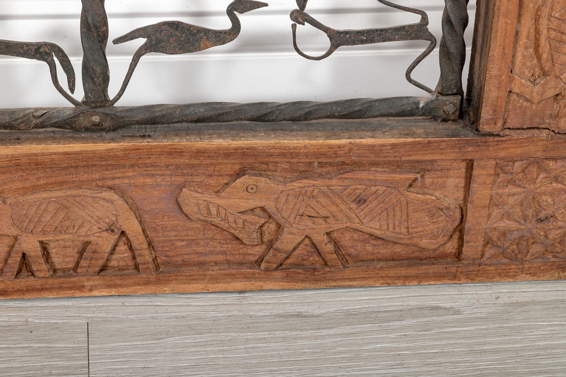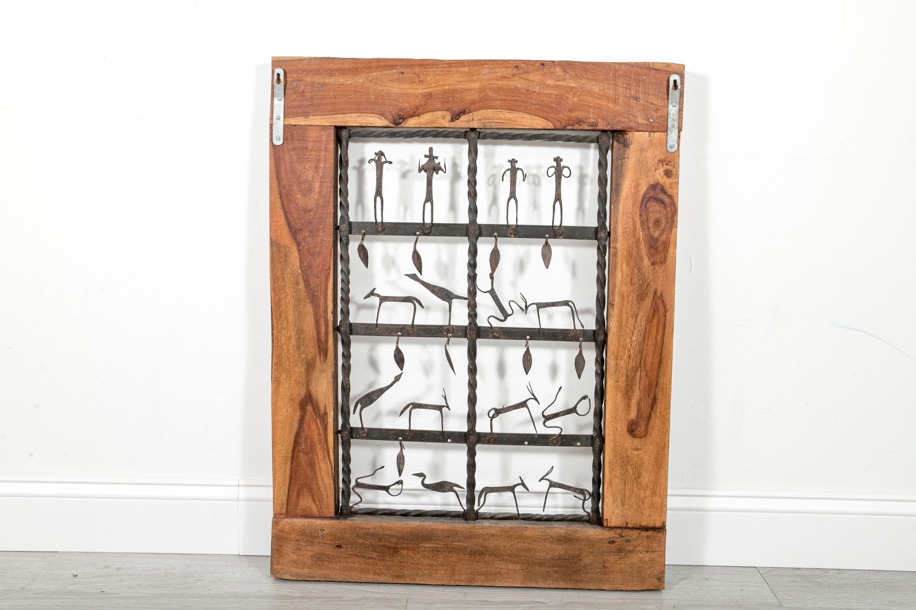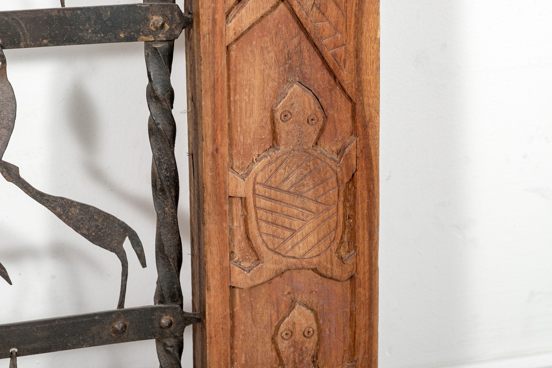 A fantastic Indian wall art piece displaying wrought iron figures and animals surrounded by a carved wood frame depicting fish, snakes, and turtles.