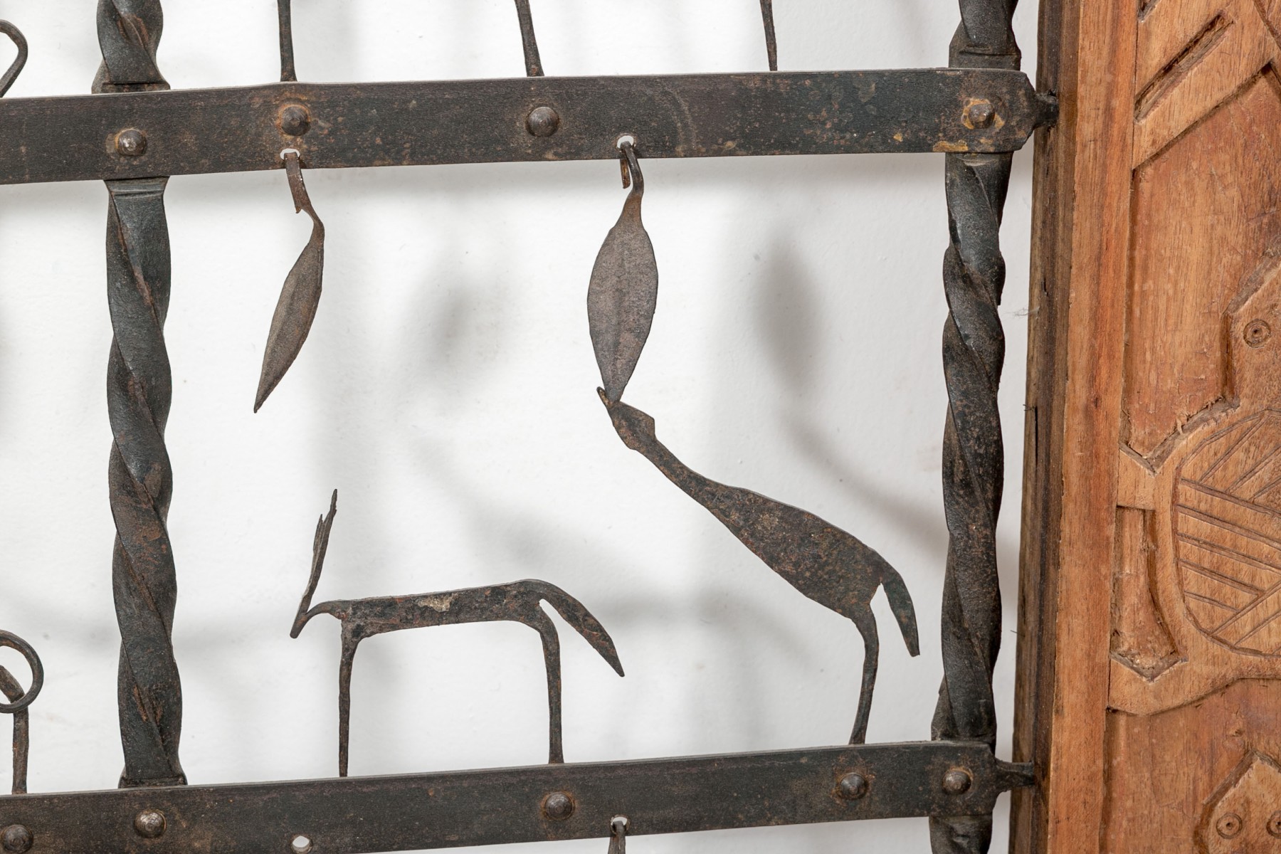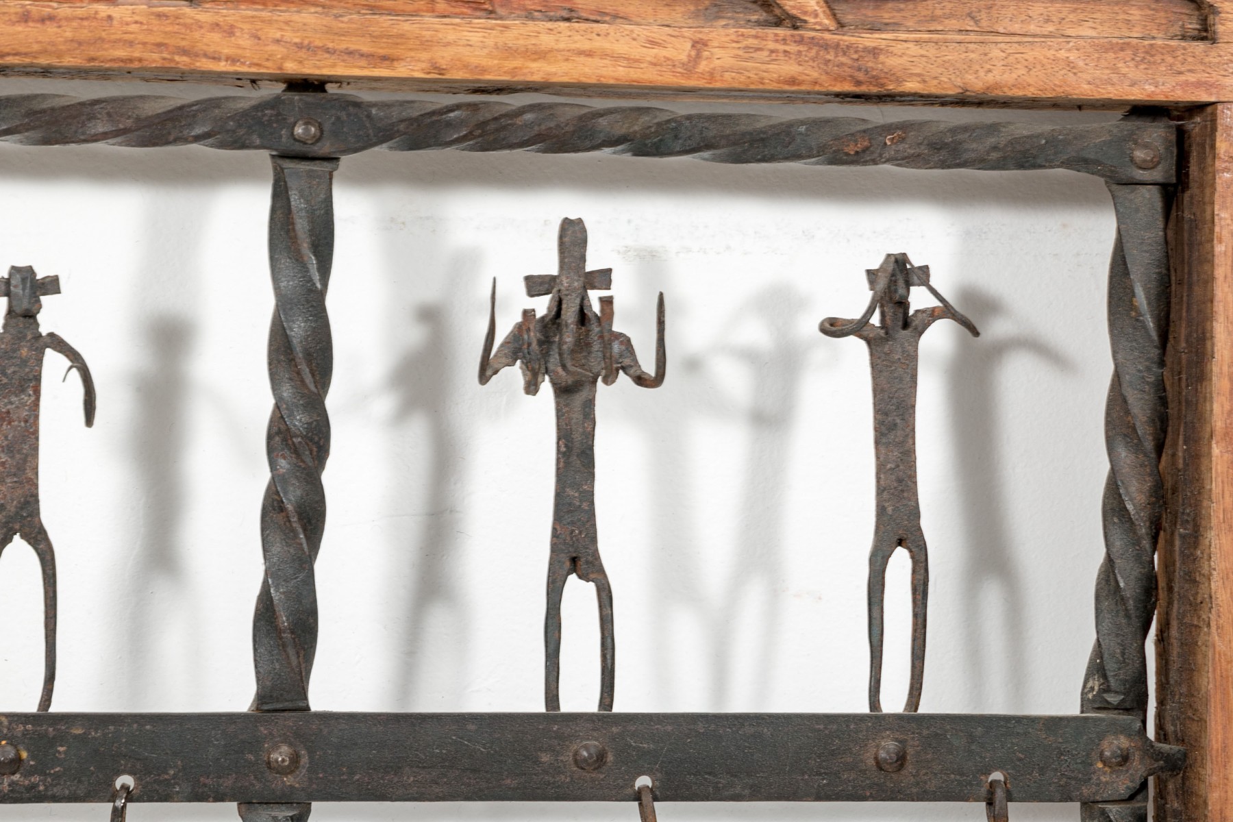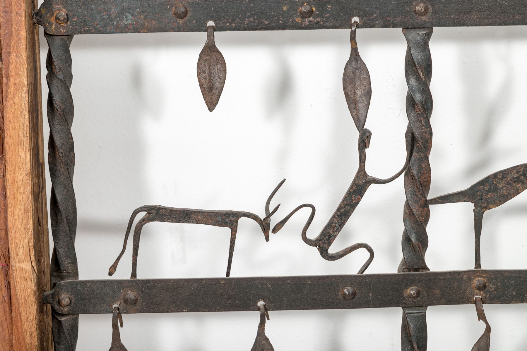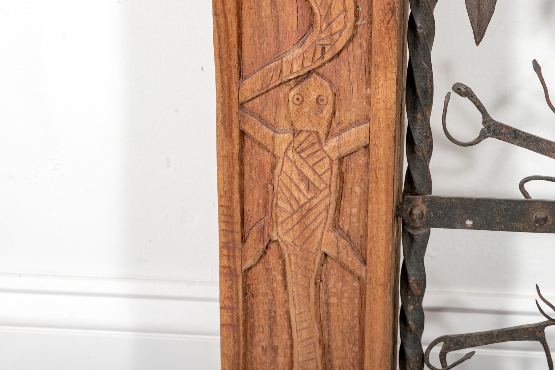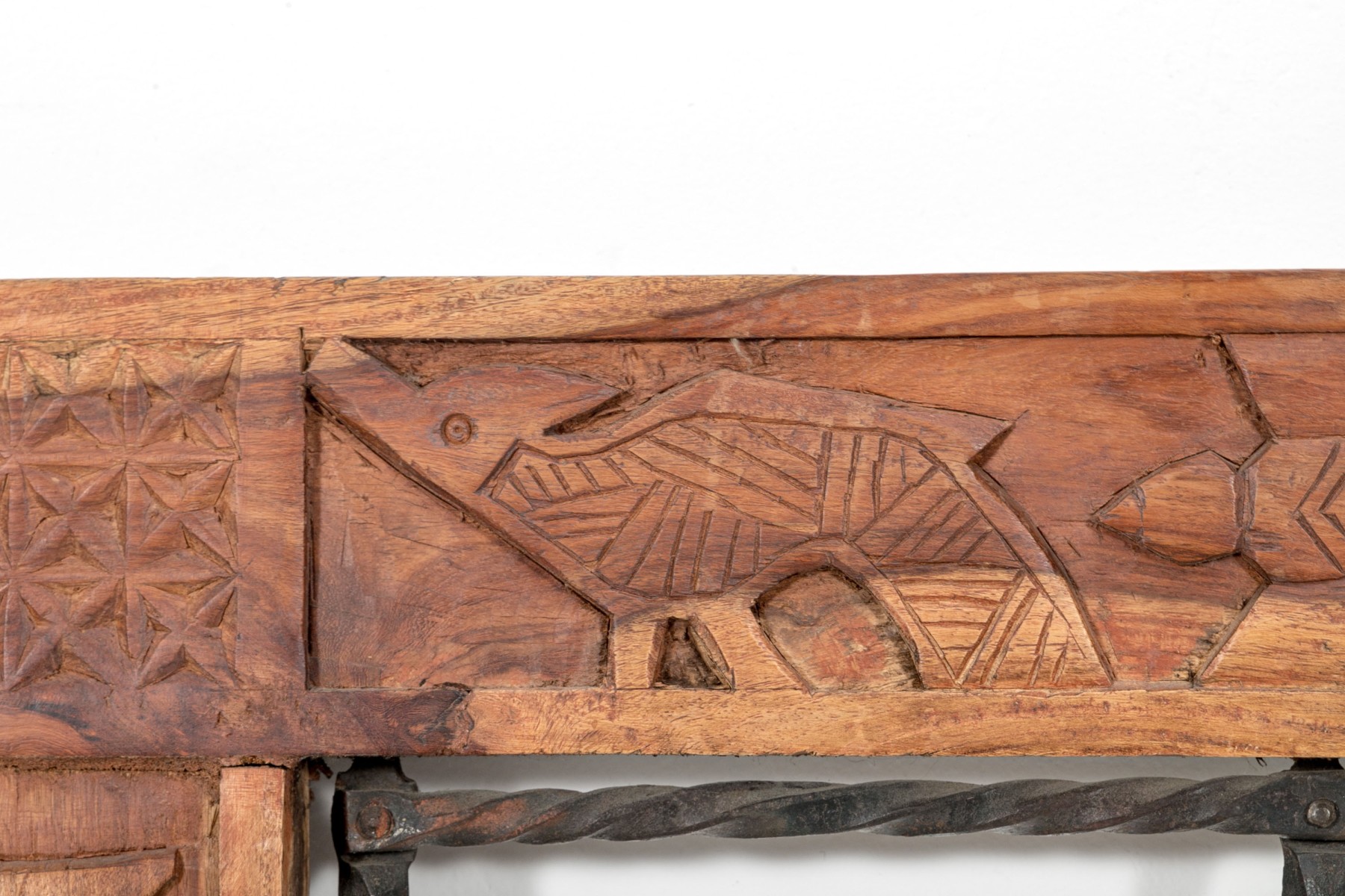 A fantastic Indian wall art piece displaying wrought iron figures and animals surrounded by a carved wood frame depicting fish, snakes, and turtles.