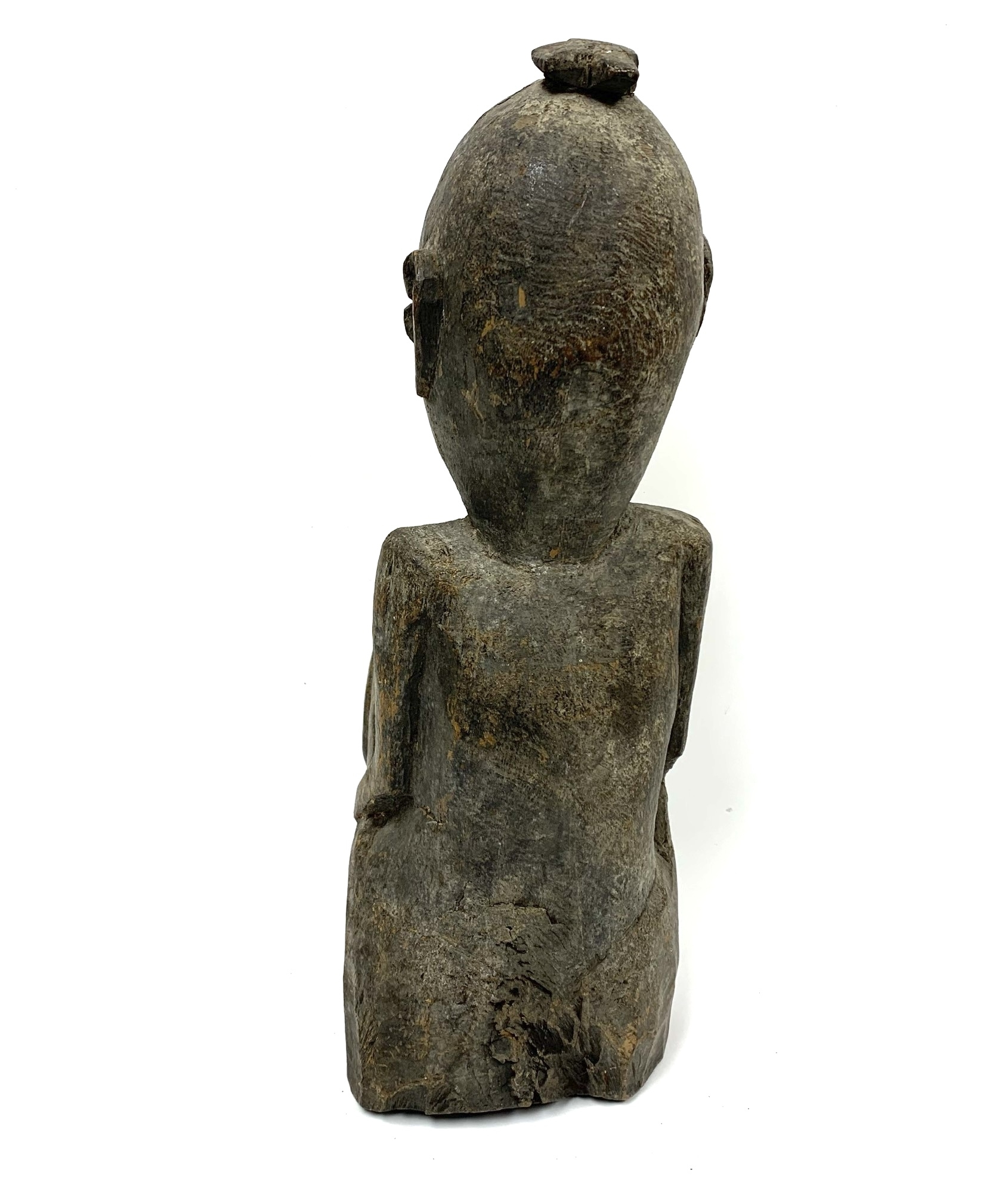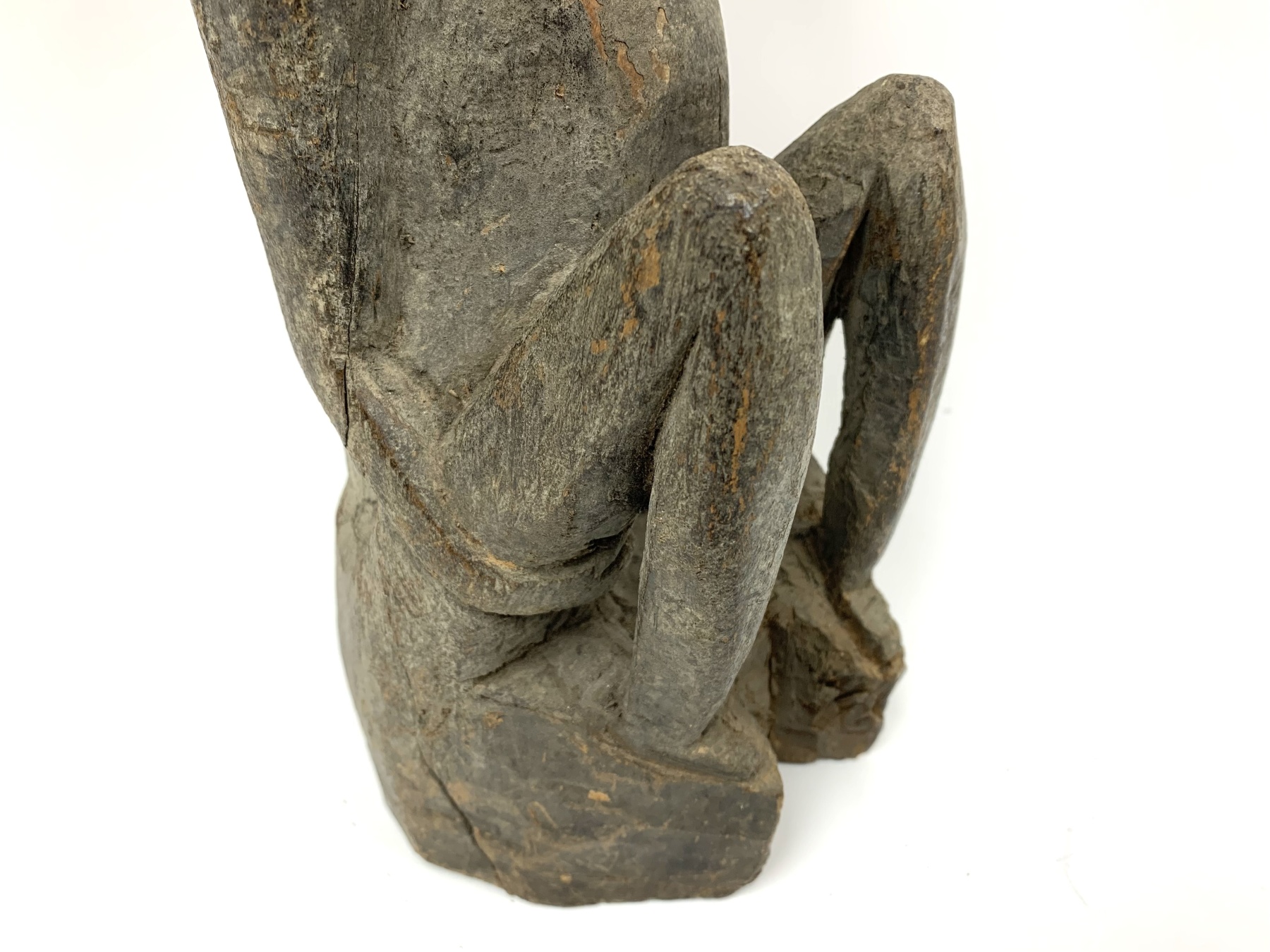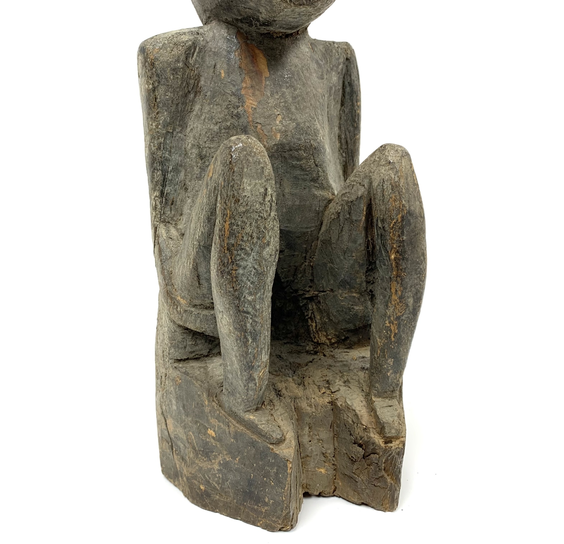 A compact figural sculpture of a man squatting with hands clasping his thighs, and is likely a protective charm or Guardian figure. Faintly smiling, the figure displays well defined eye, ears and mouth and wears either a top knot or hat atop his head and originally was stained or painted. The Sculpture is hand-carved, in original condition and believed to be from either Indonesia or Africa and dating to the Mid 20th Century.