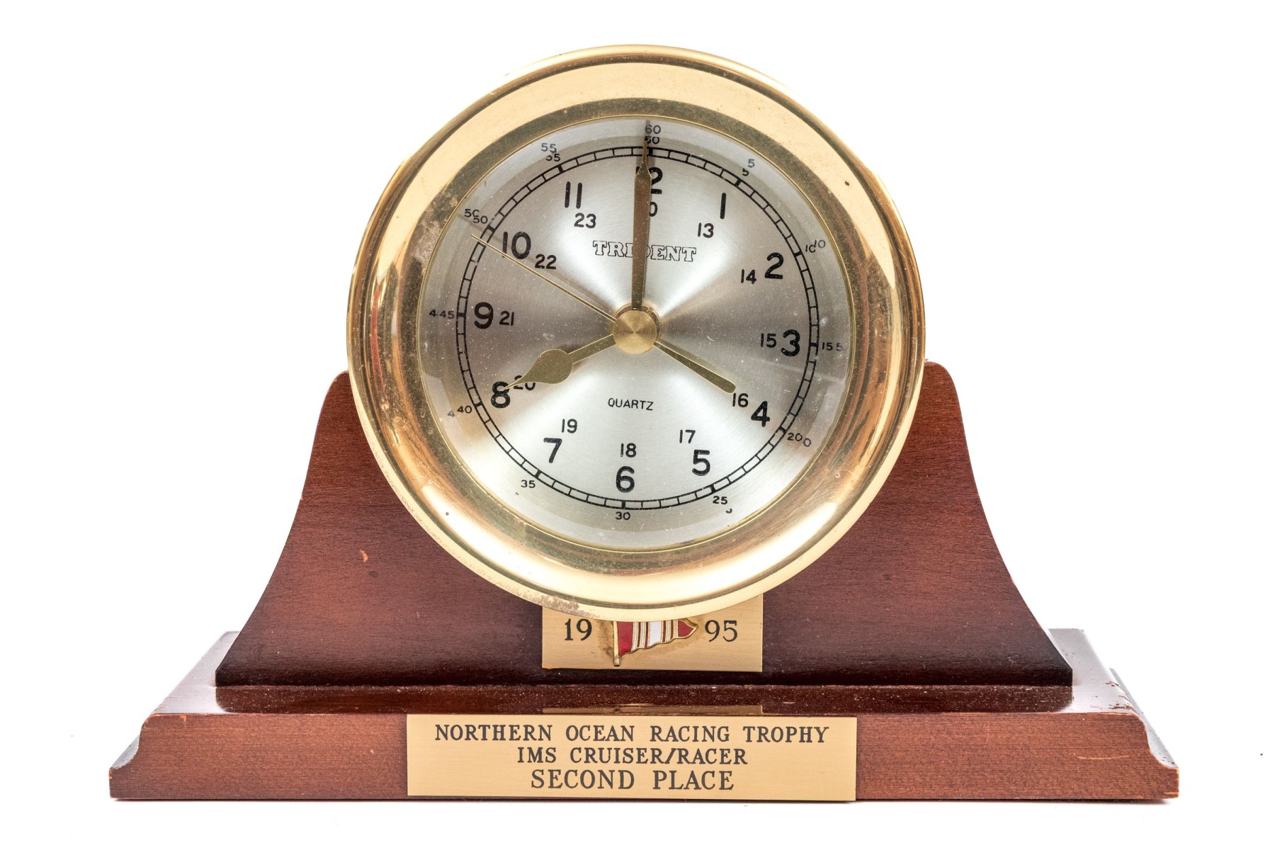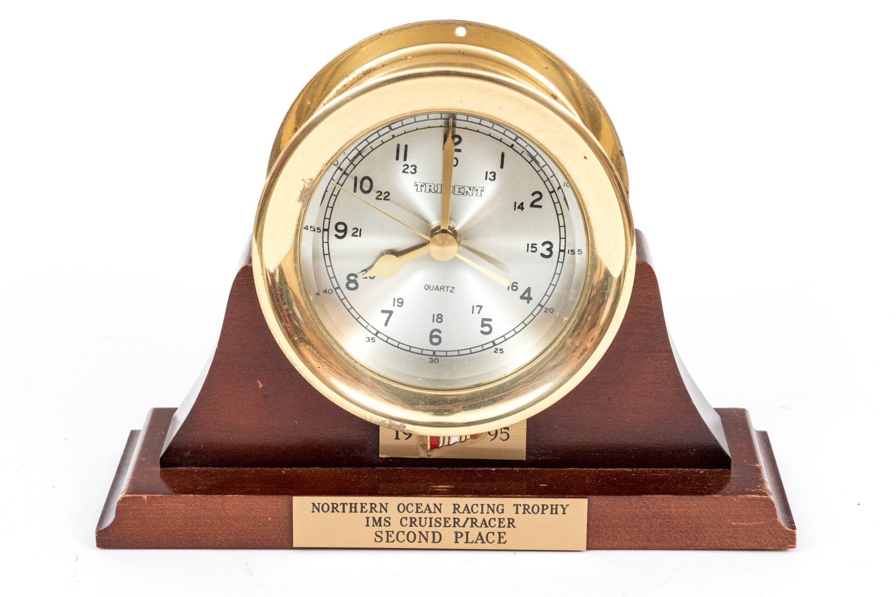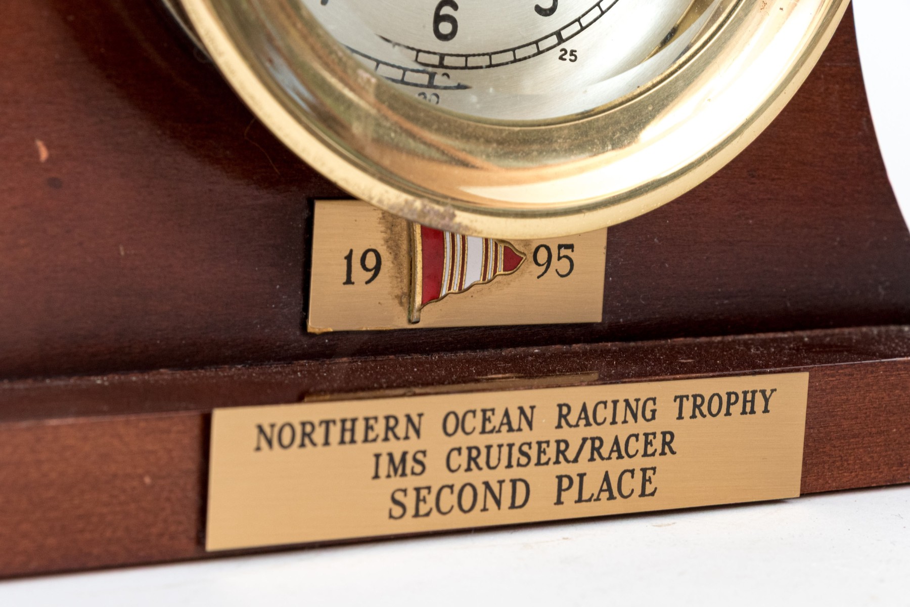 Wood stand with plaques "Northern Ocean Racing Trophy / IMS Cruiser/Racer / Second Place // 1995. Brass nautical porthole form clock which can lift off the wooden cradle base.