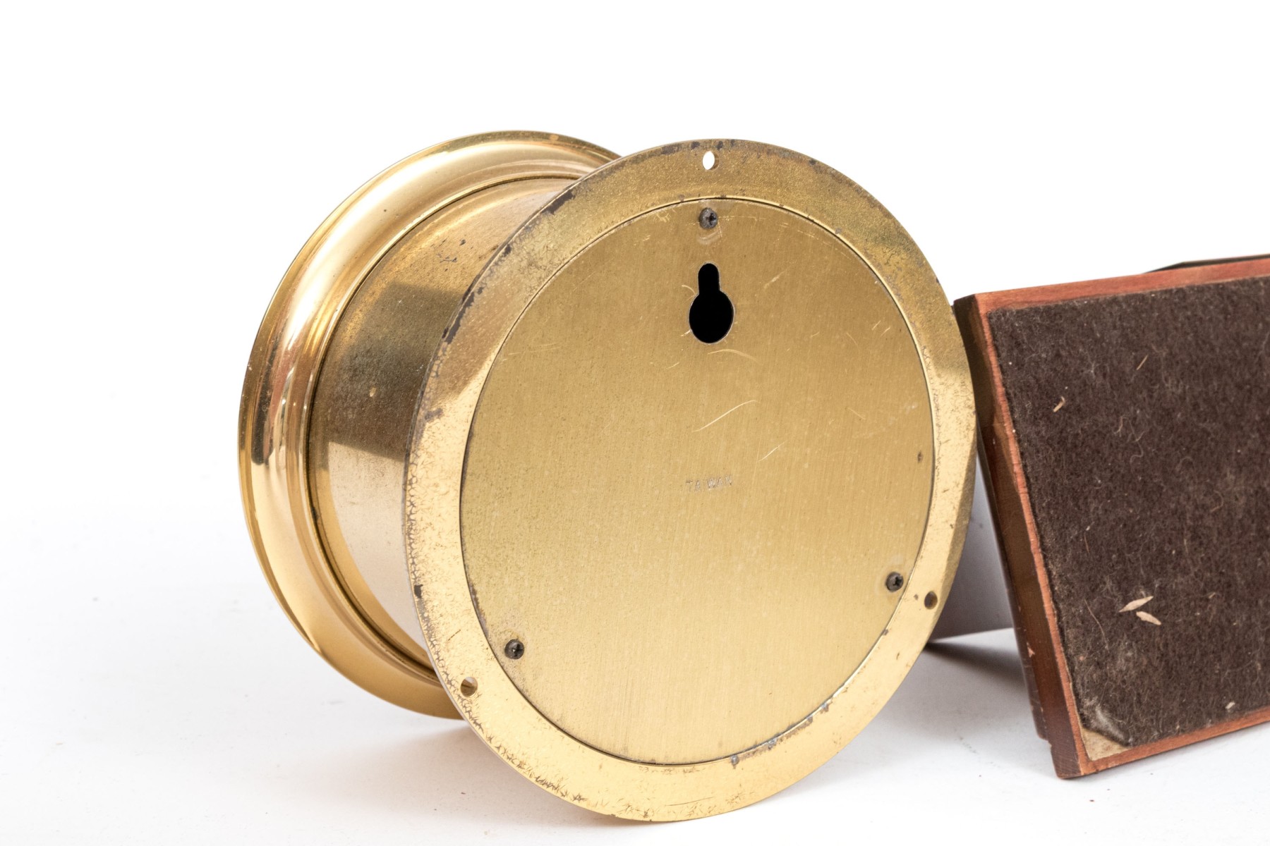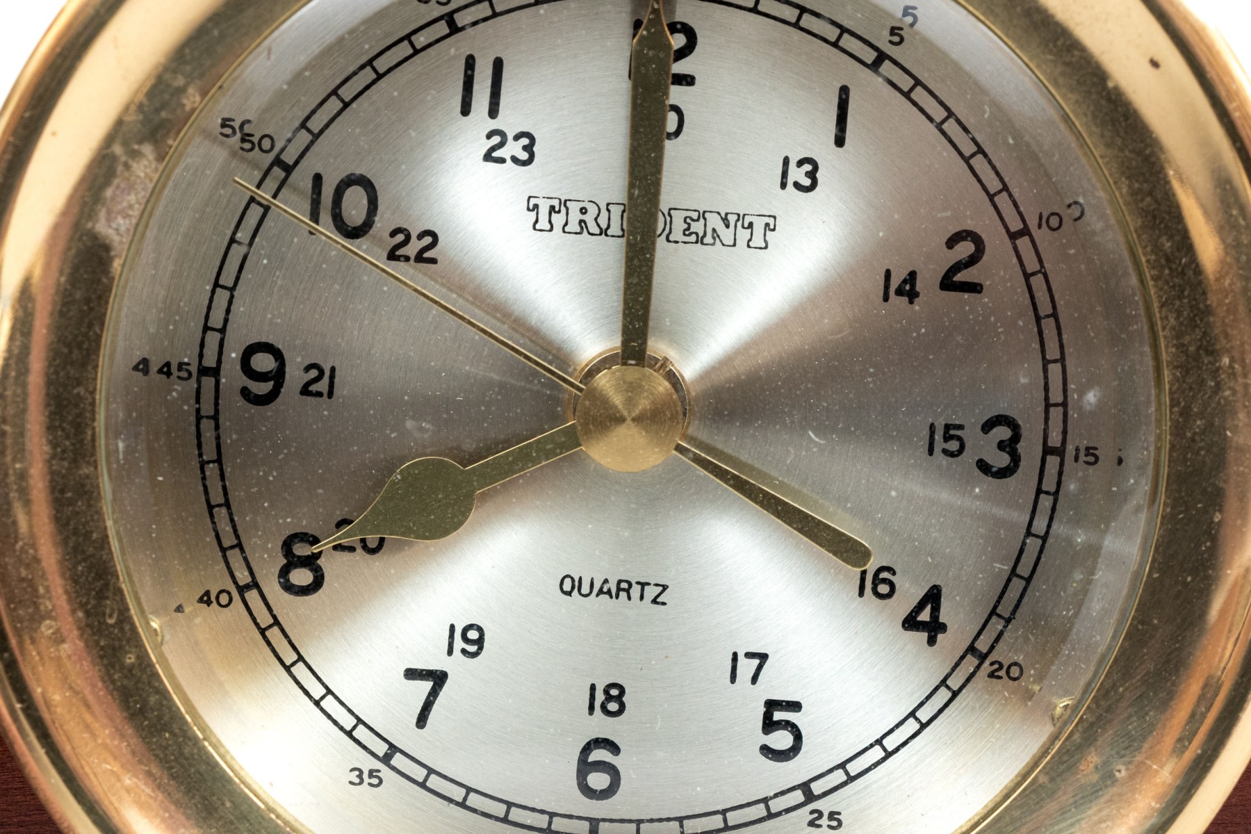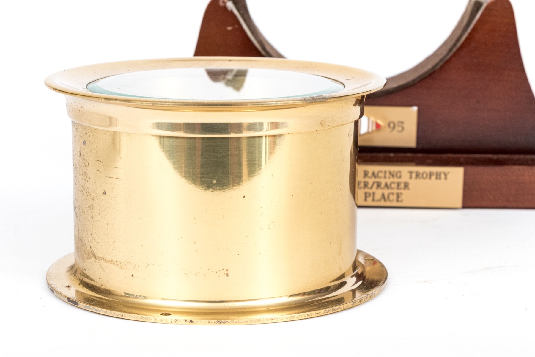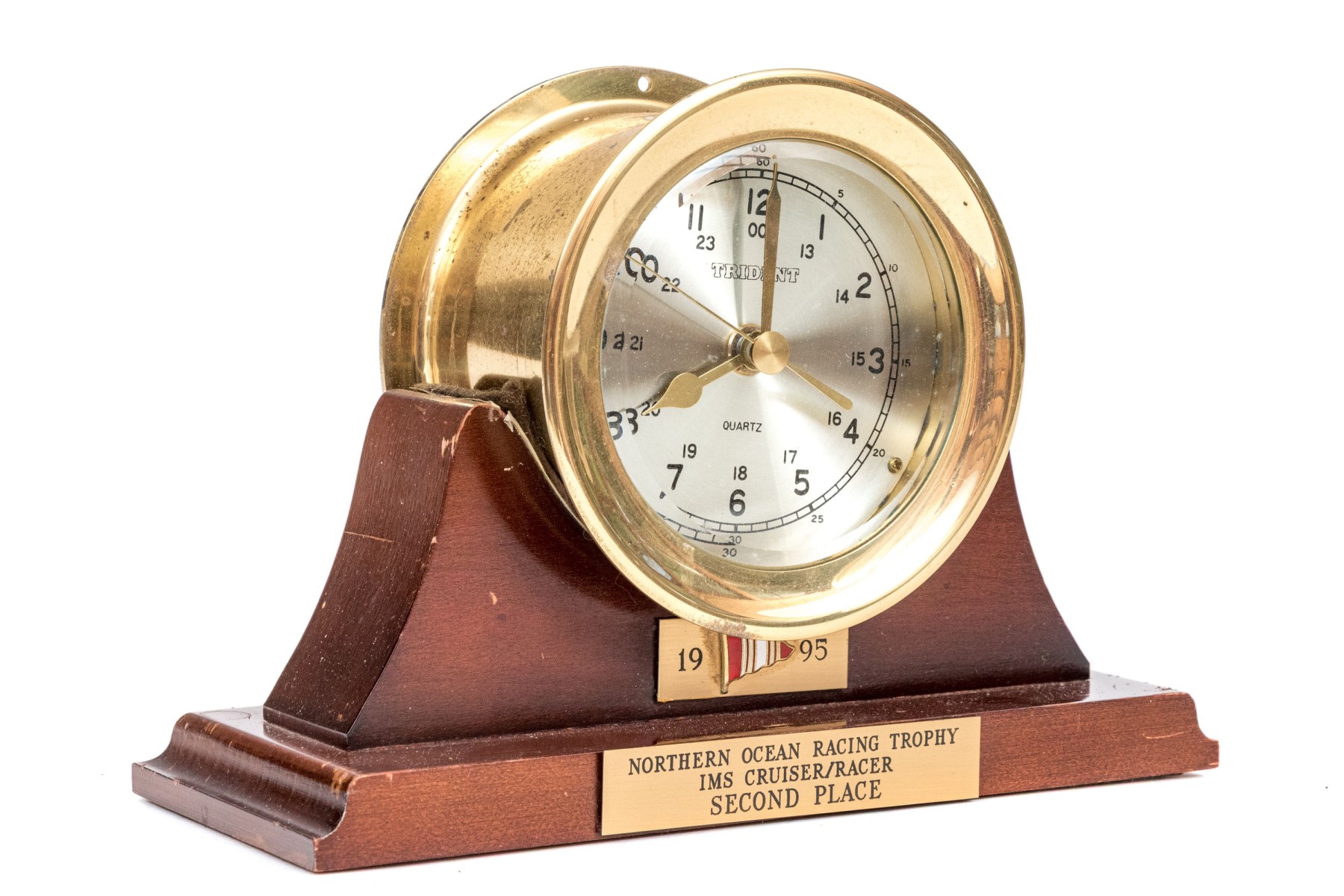 Wood stand with plaques "Northern Ocean Racing Trophy / IMS Cruiser/Racer / Second Place // 1995. Brass nautical porthole form clock which can lift off the wooden cradle base.