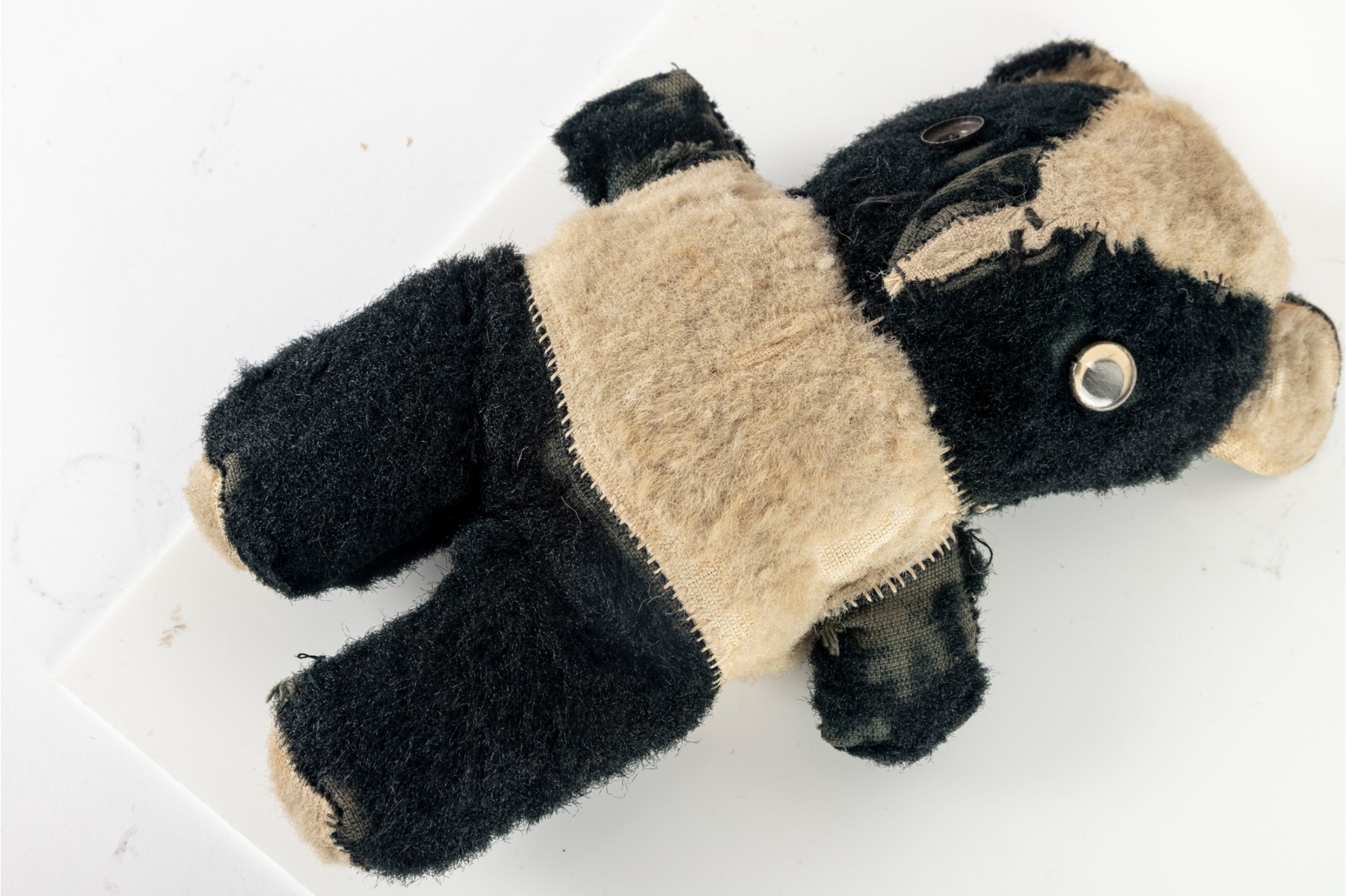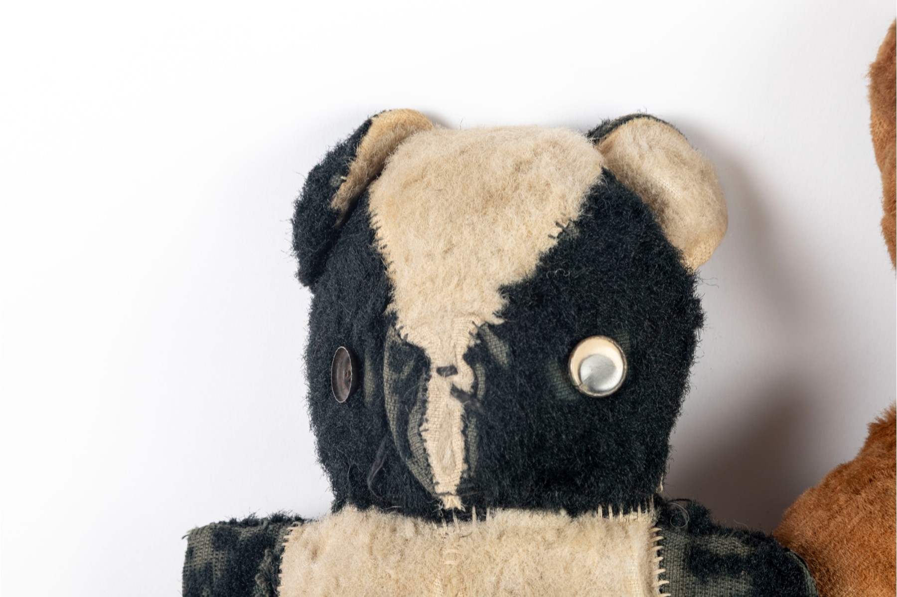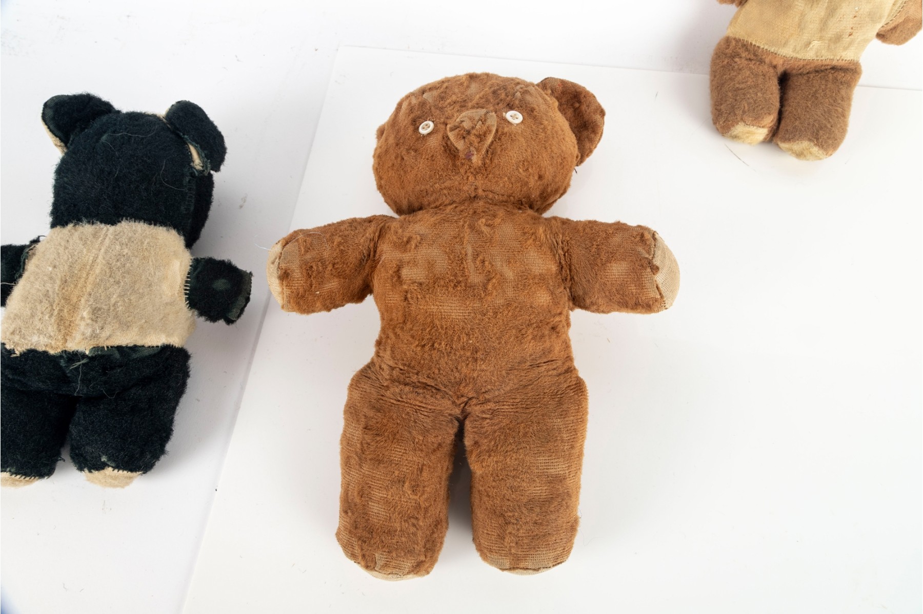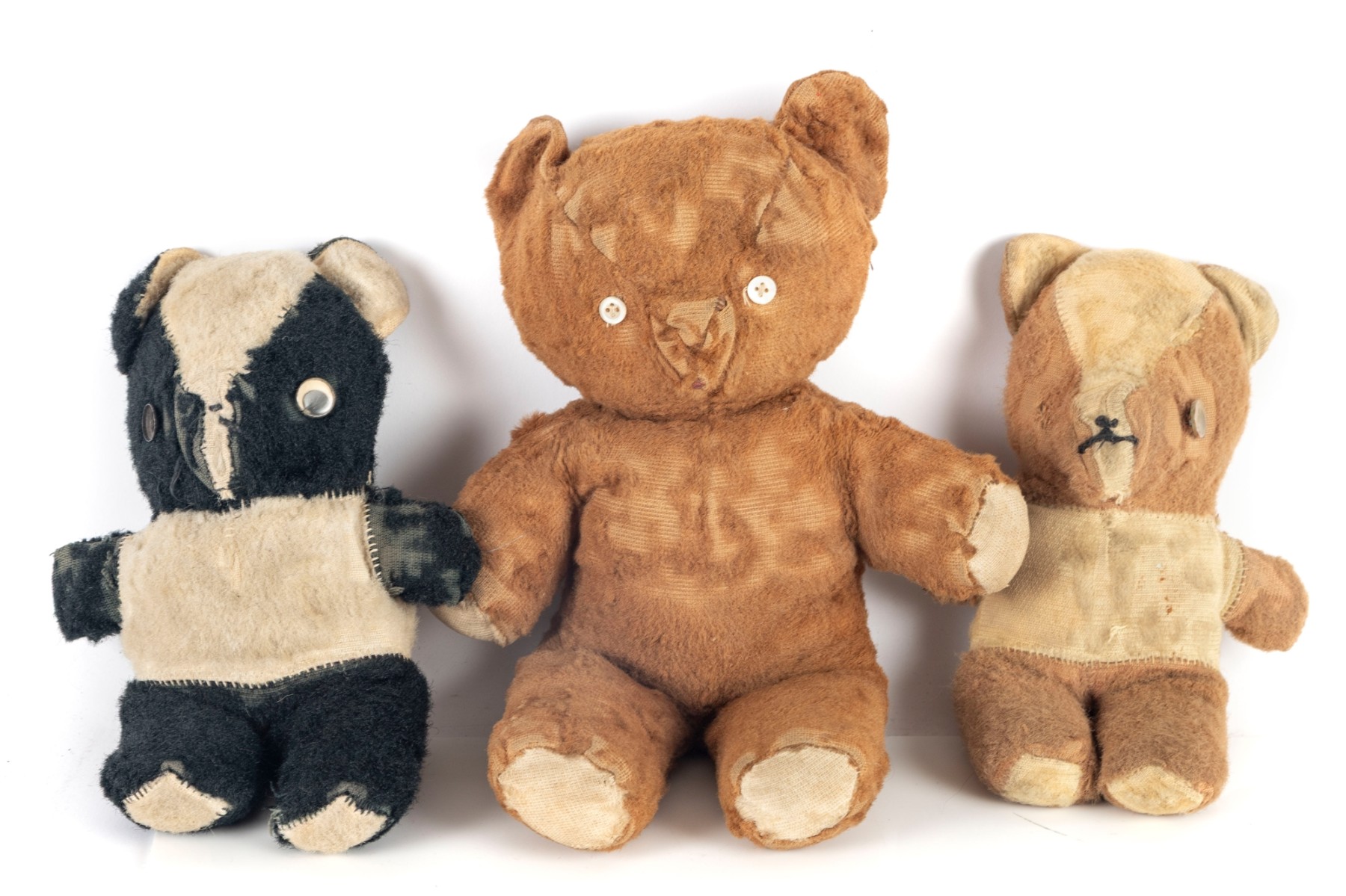 A charming trio of plush teddy bears in black and white, solid brown, and brown and white. One with googly eyes, the others with button eyes.