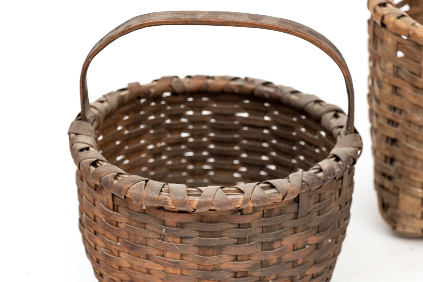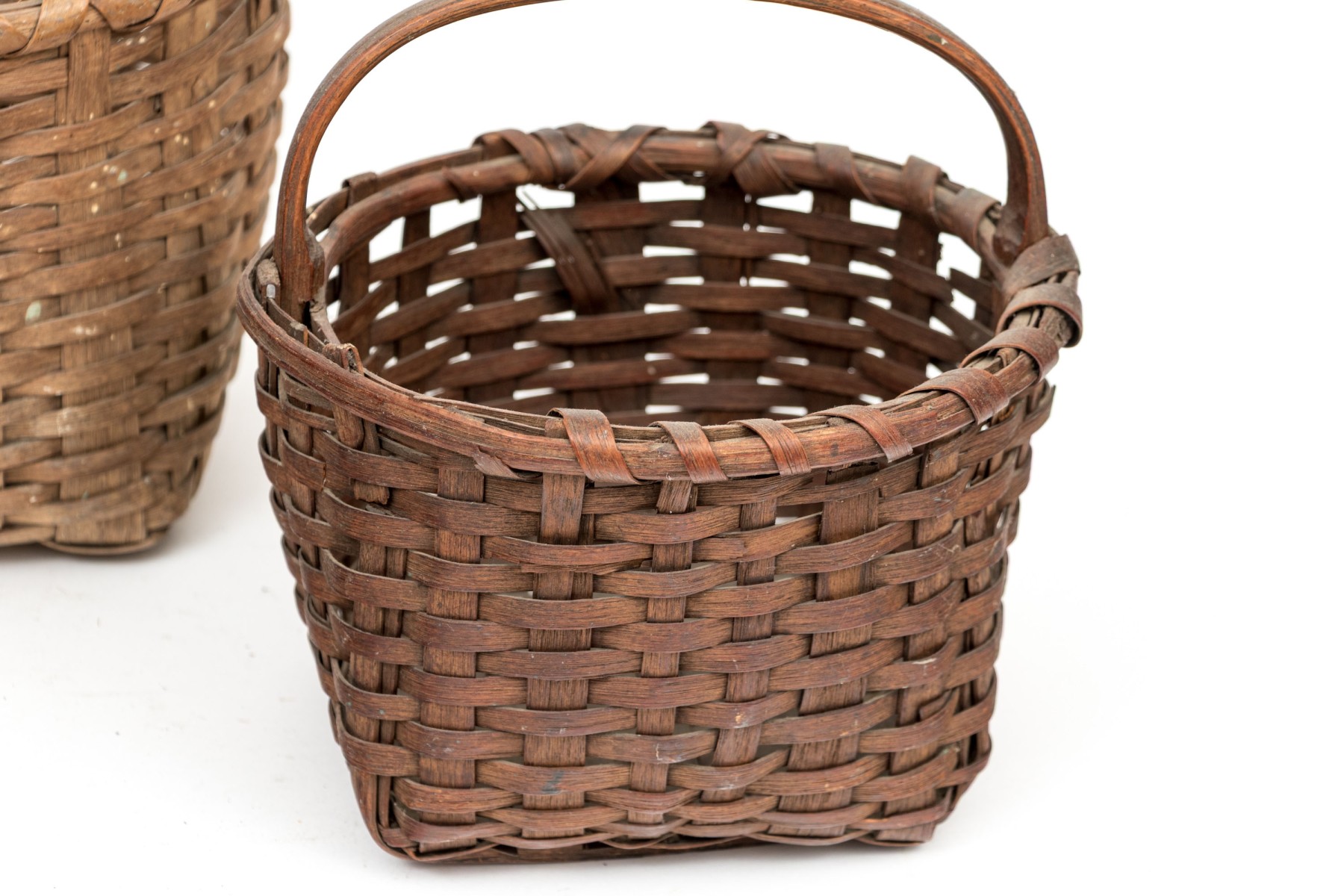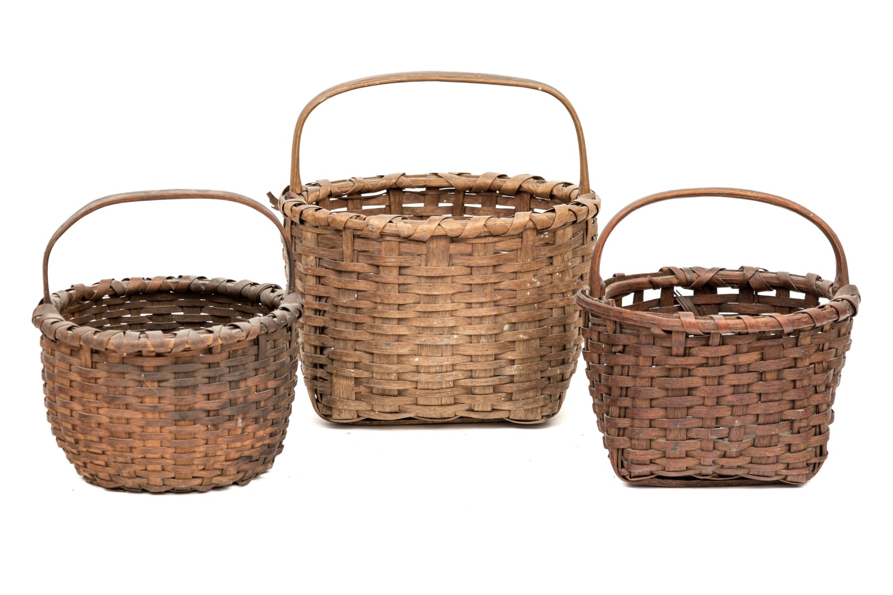 One is on a square foot with circular to oval form top with handle. Together with two circular splint basket with arched handles.