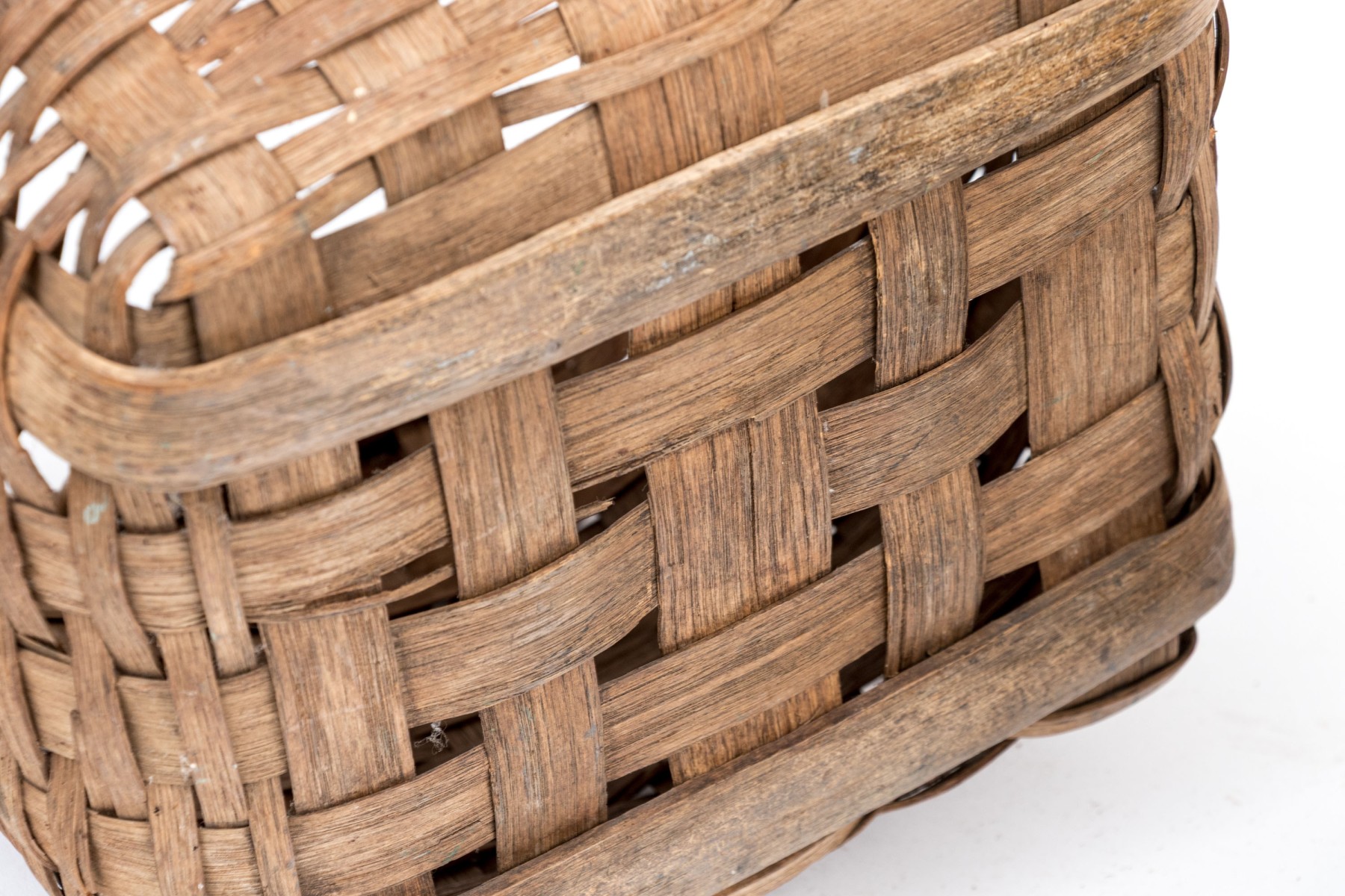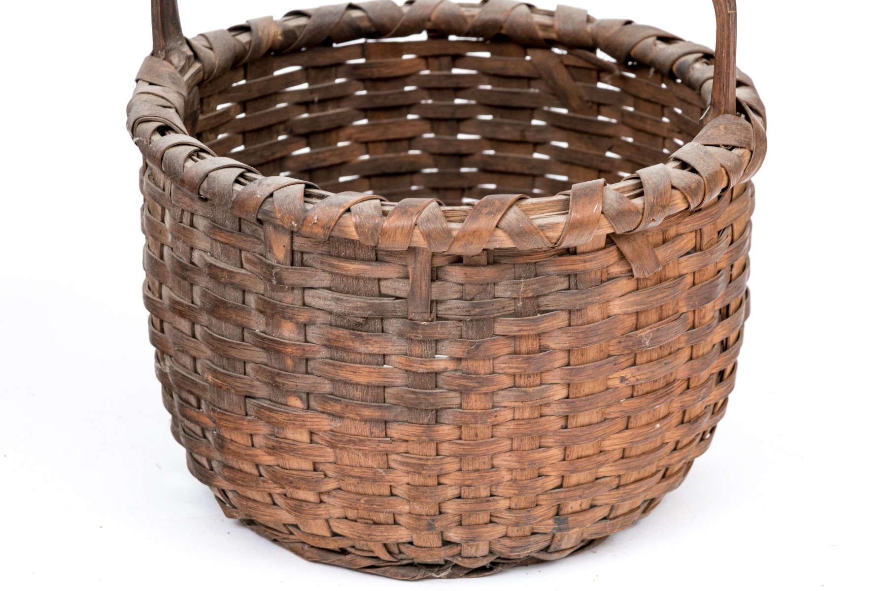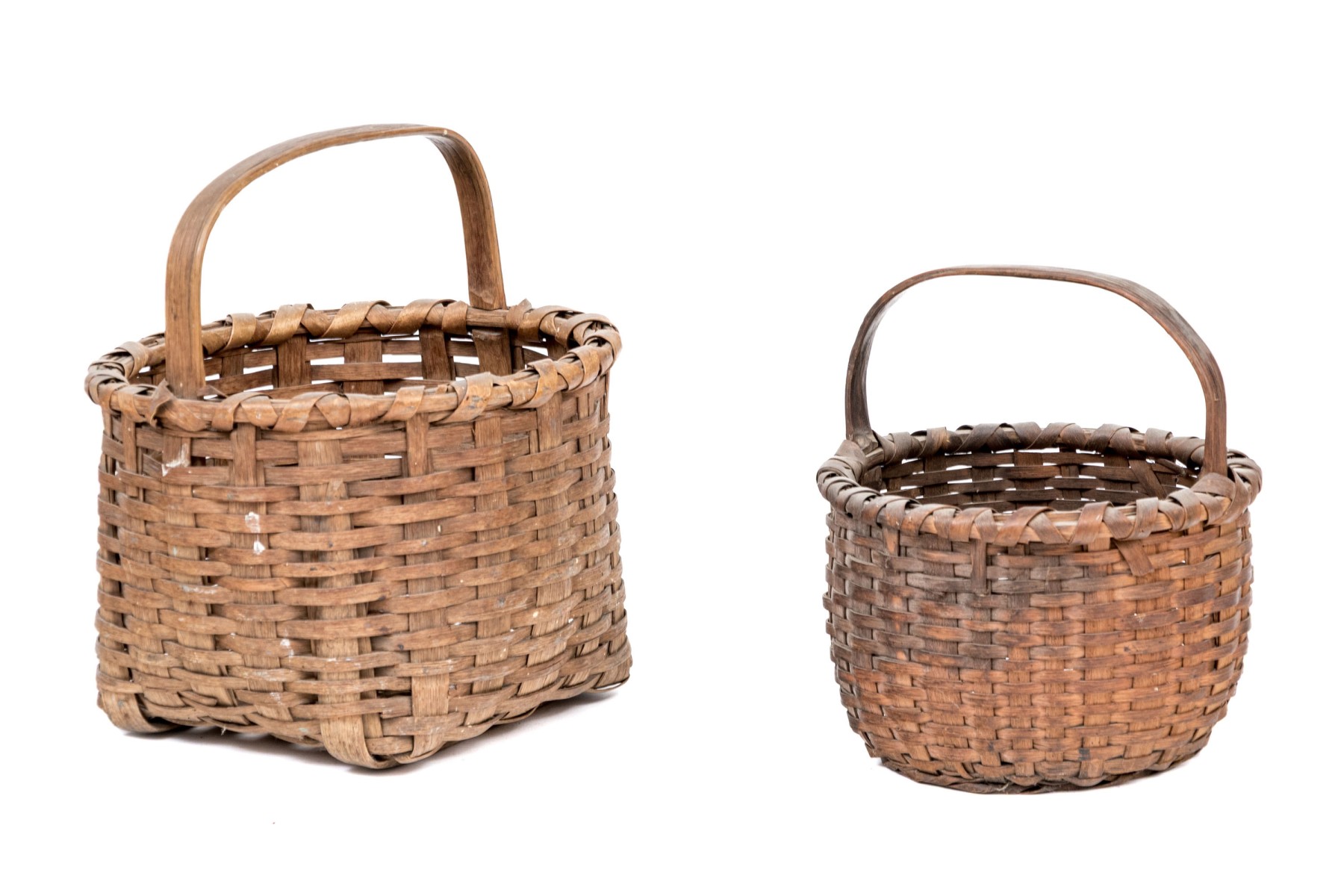 One is on a square foot with circular to oval form top with handle. Together with two circular splint basket with arched handles.