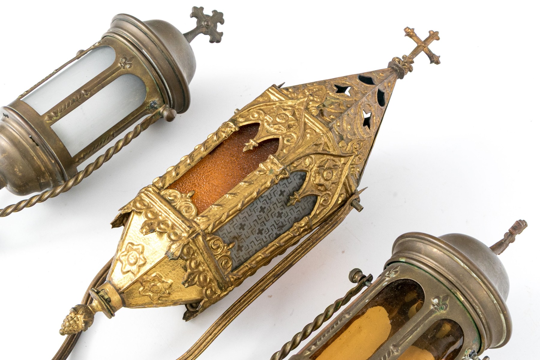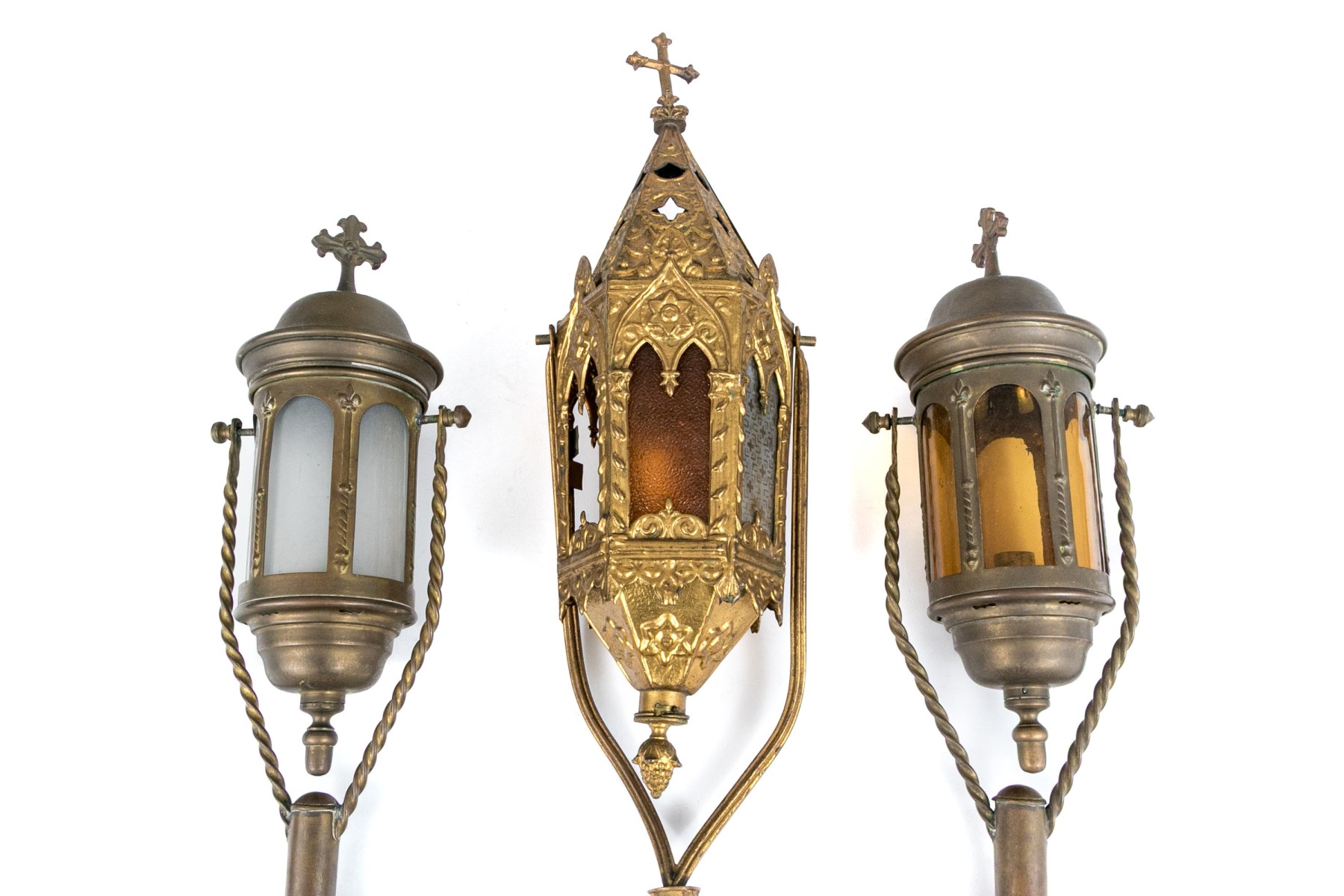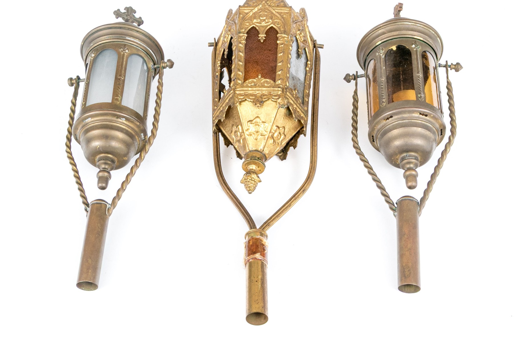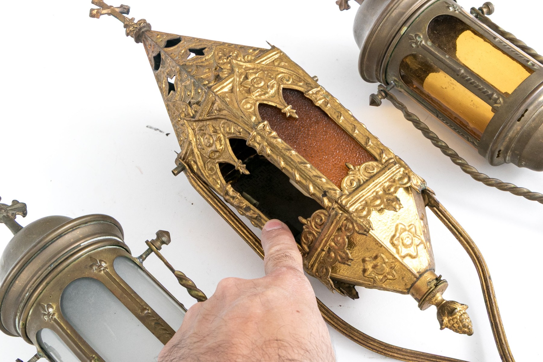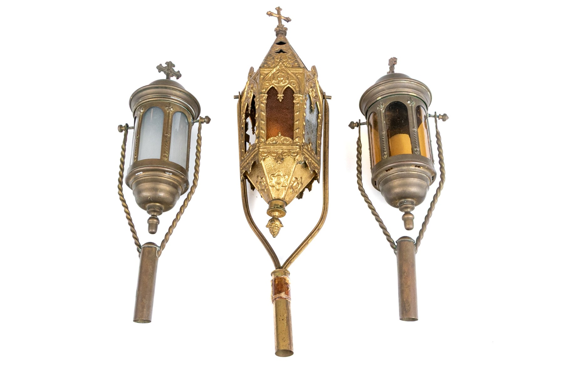 A beautiful trio of Christian brass procession lanterns with great French and Gothic designs. Two are in matching form with crosses over cylindrical bodies decorated with fleur-de-lis motifs, pivoting on spiraled supports. The third features a larger and more elaborate design with fine relief and arched, patterned glass panels.