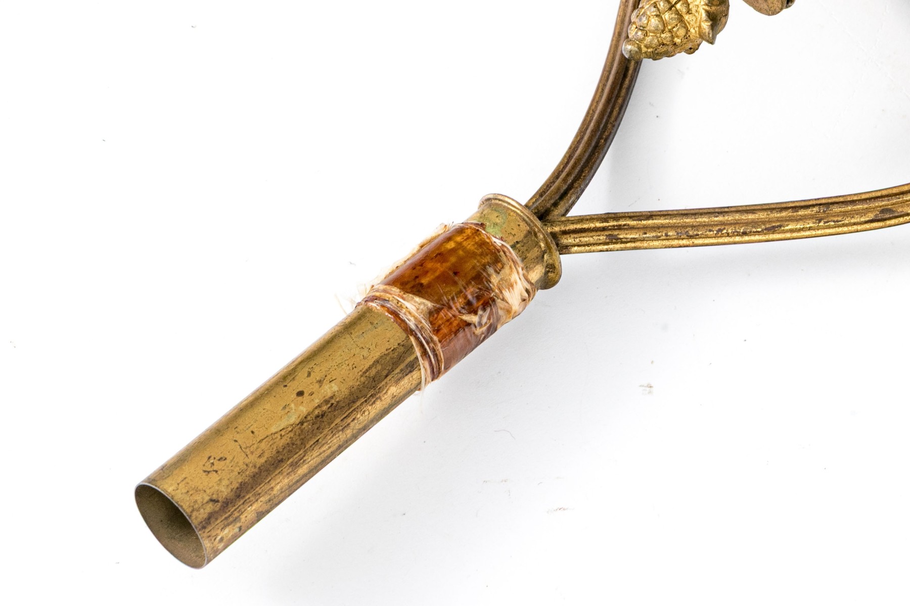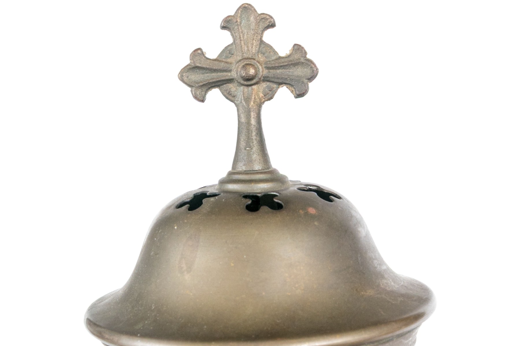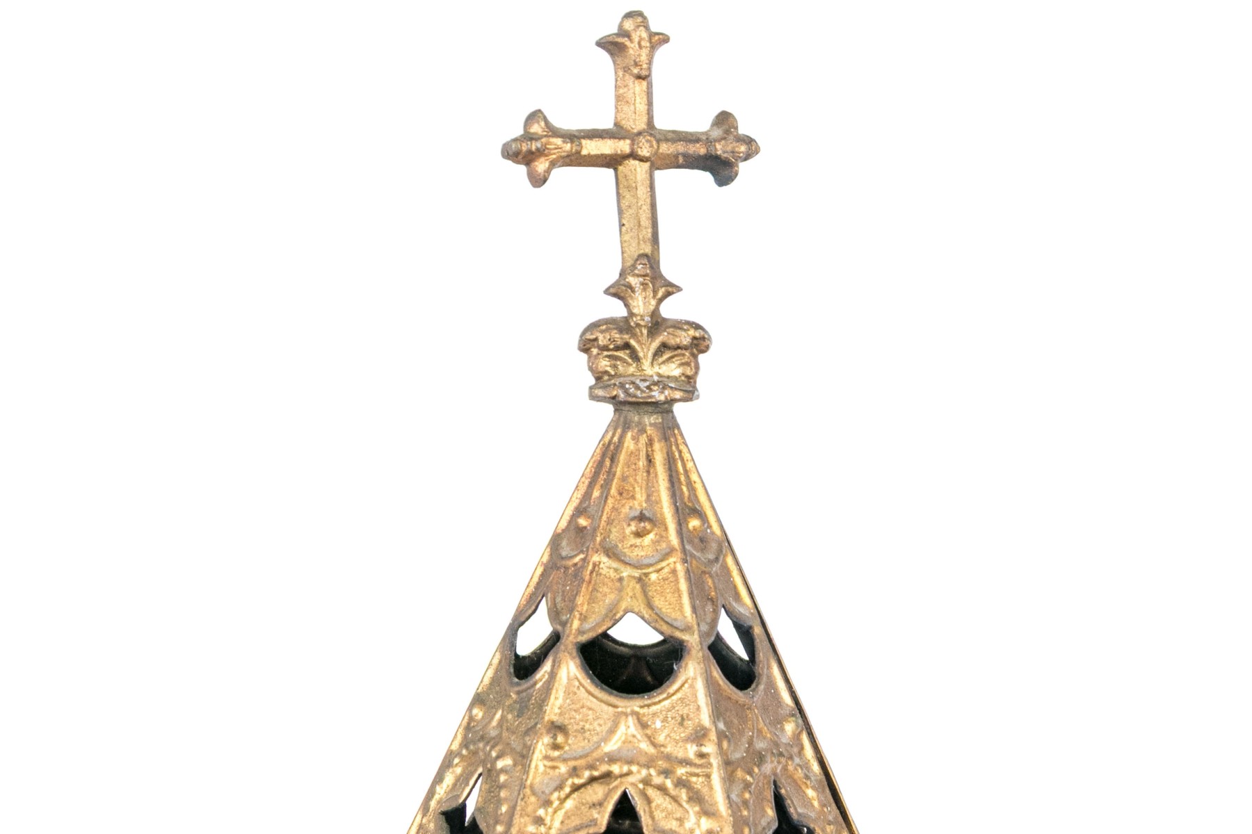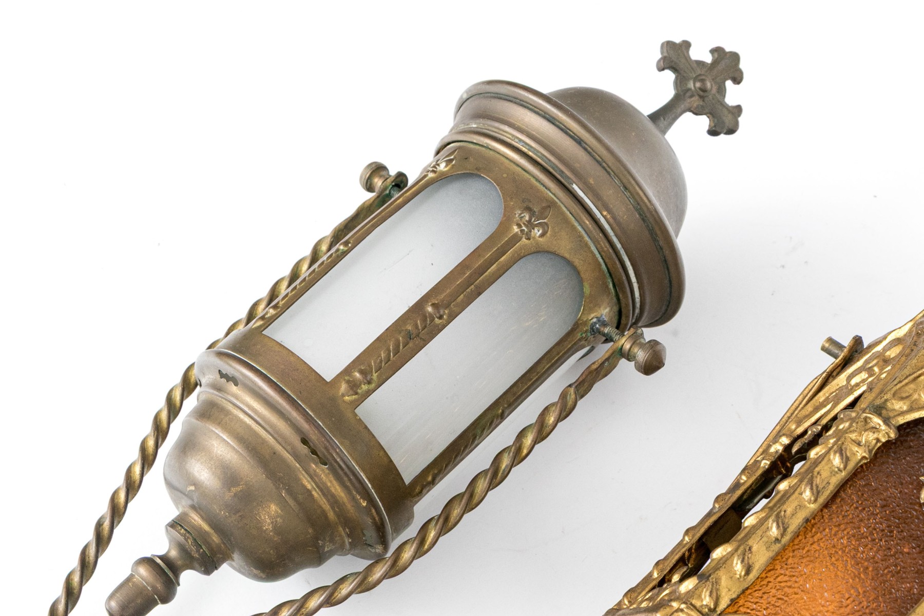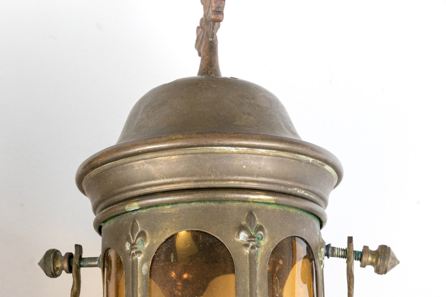 A beautiful trio of Christian brass procession lanterns with great French and Gothic designs. Two are in matching form with crosses over cylindrical bodies decorated with fleur-de-lis motifs, pivoting on spiraled supports. The third features a larger and more elaborate design with fine relief and arched, patterned glass panels.