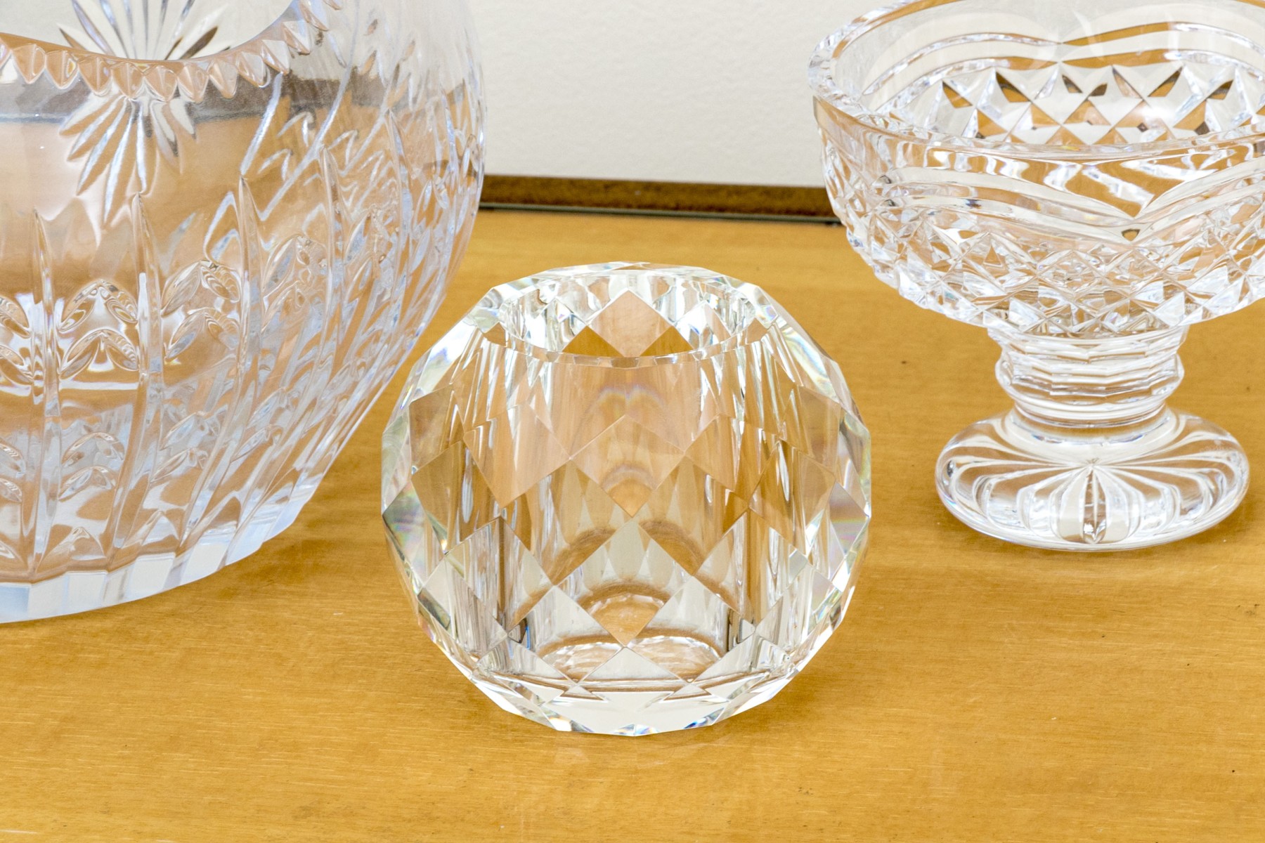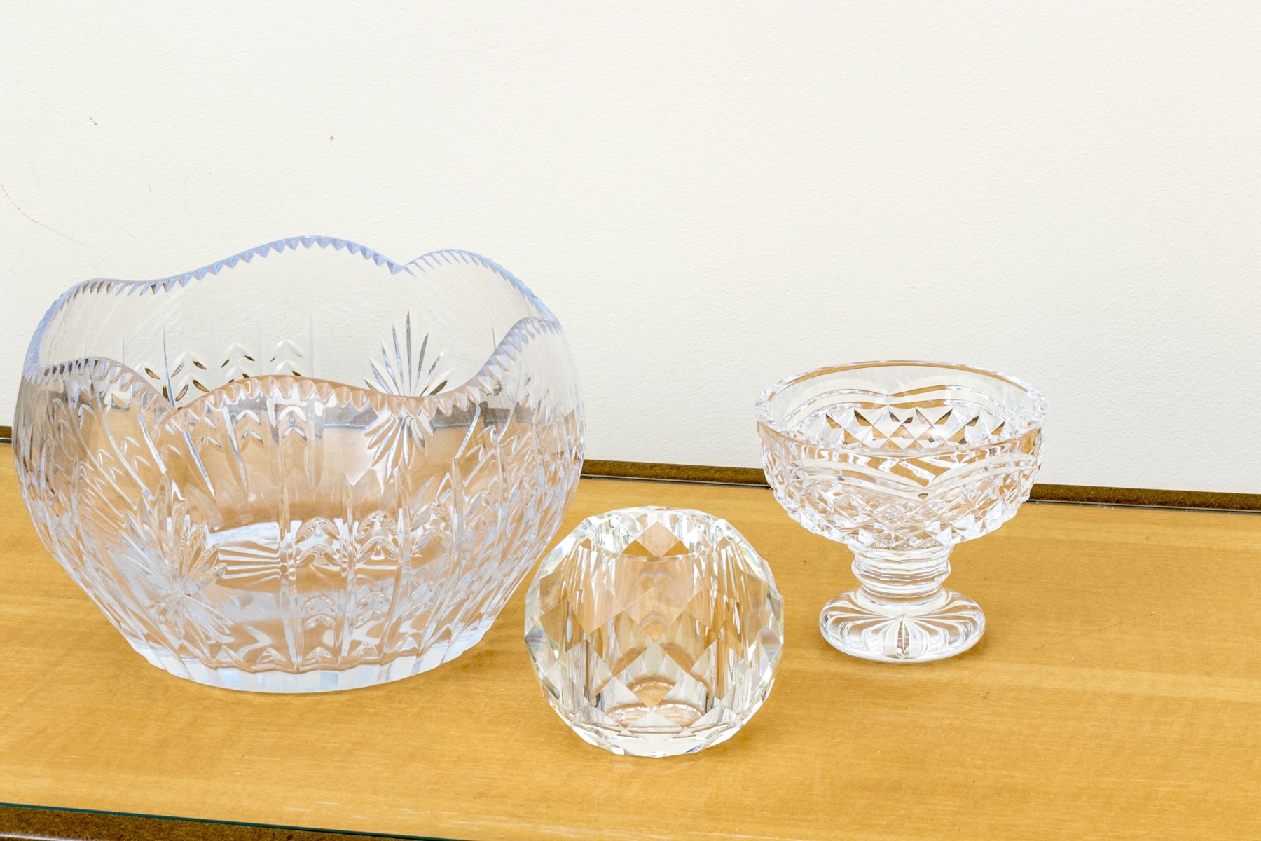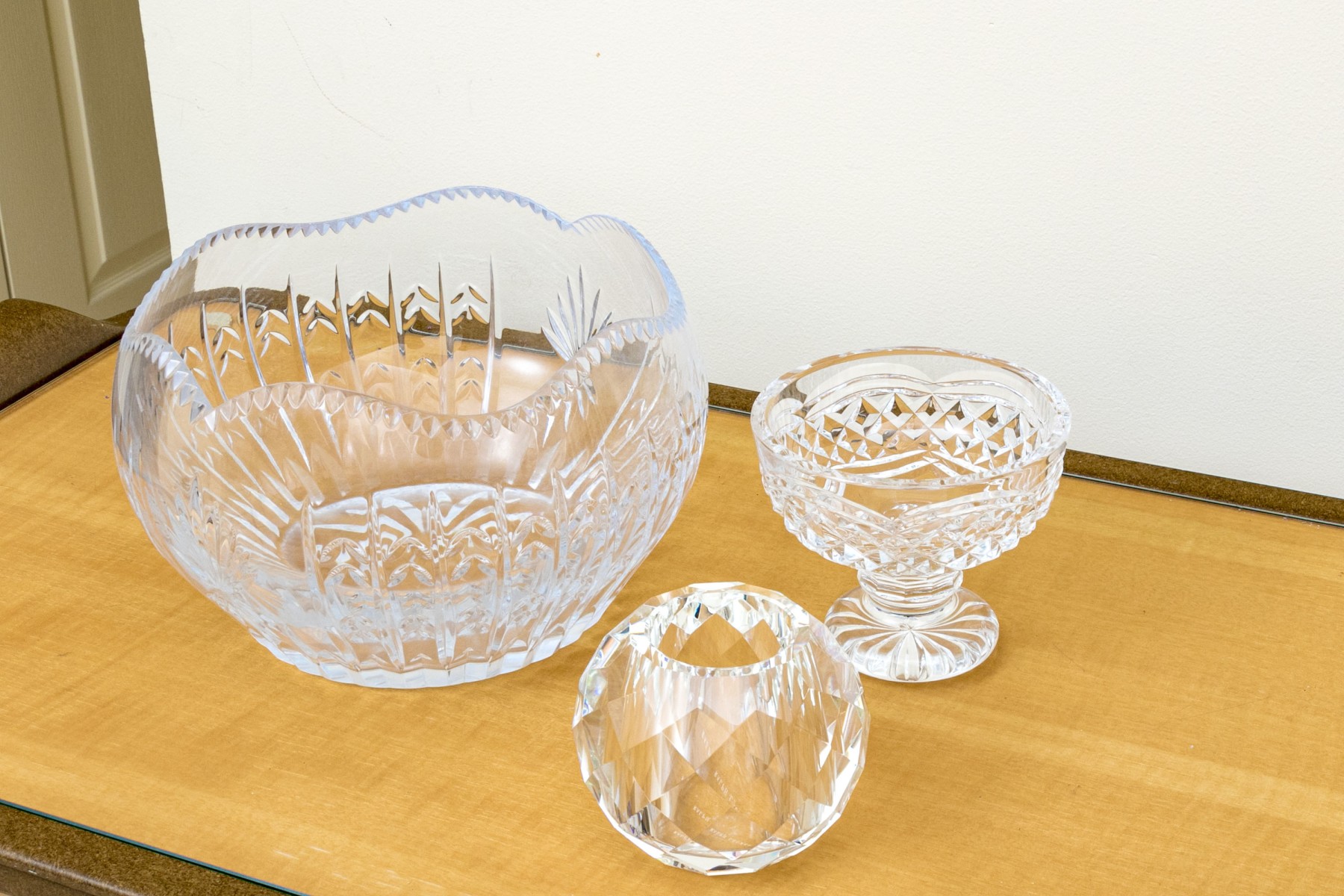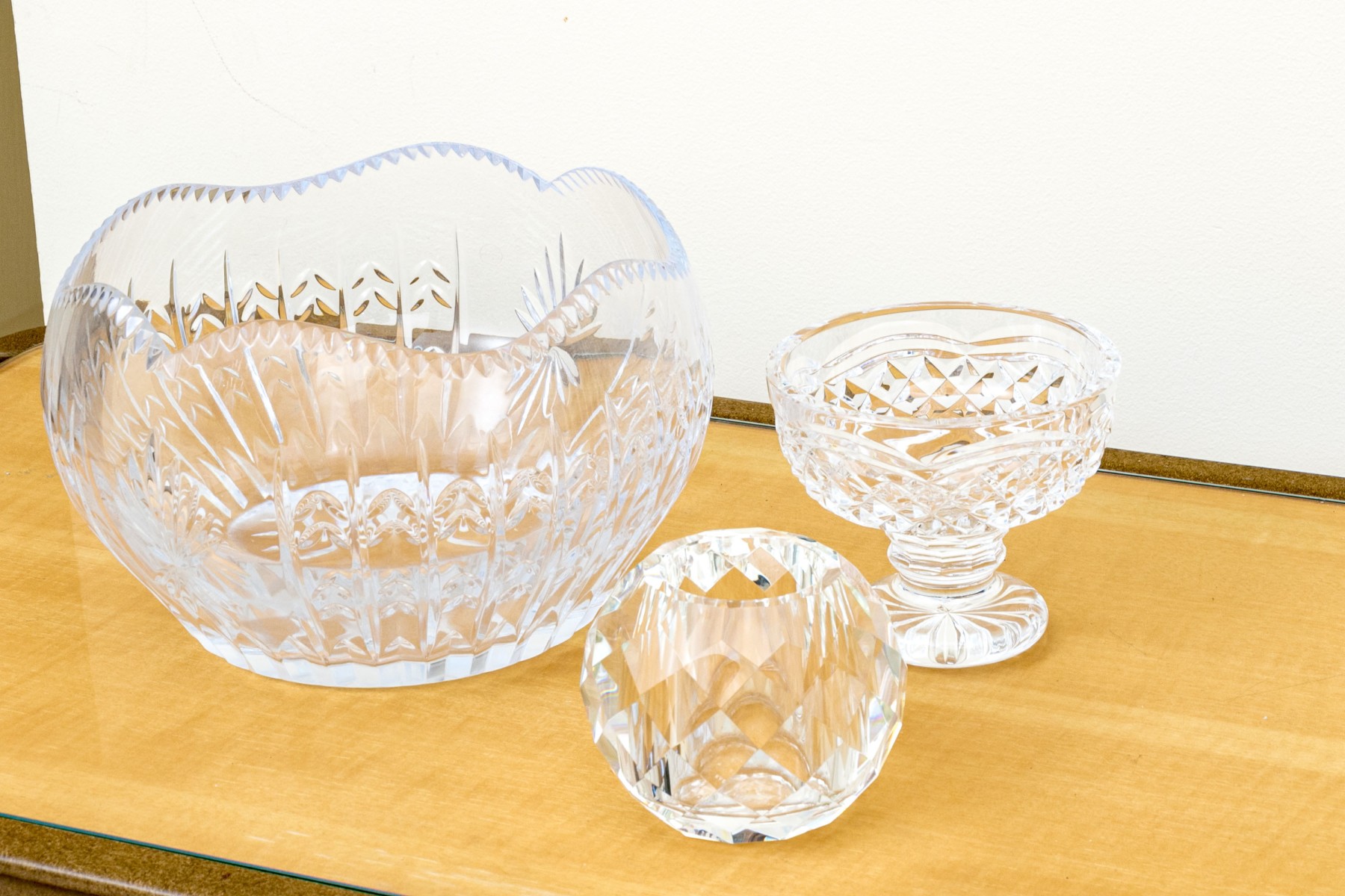 An excellent assortment of three crystal vessels. Comprised of a House of Igor Carl Faberge centerpiece bowl, a Waterford footed compote bowl, and a Ralph Lauren votive holder. All beautifully formed with decorative cut designs.