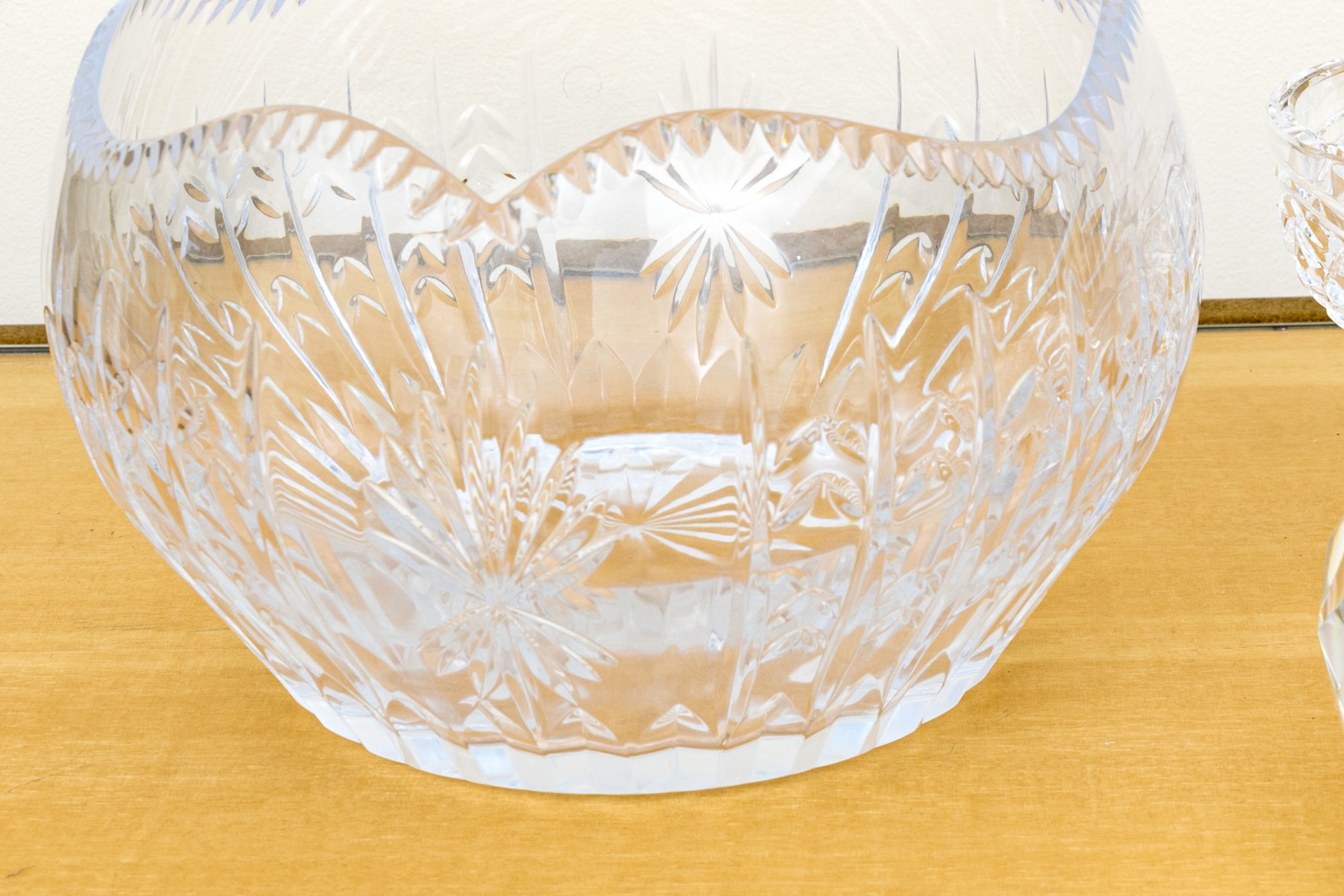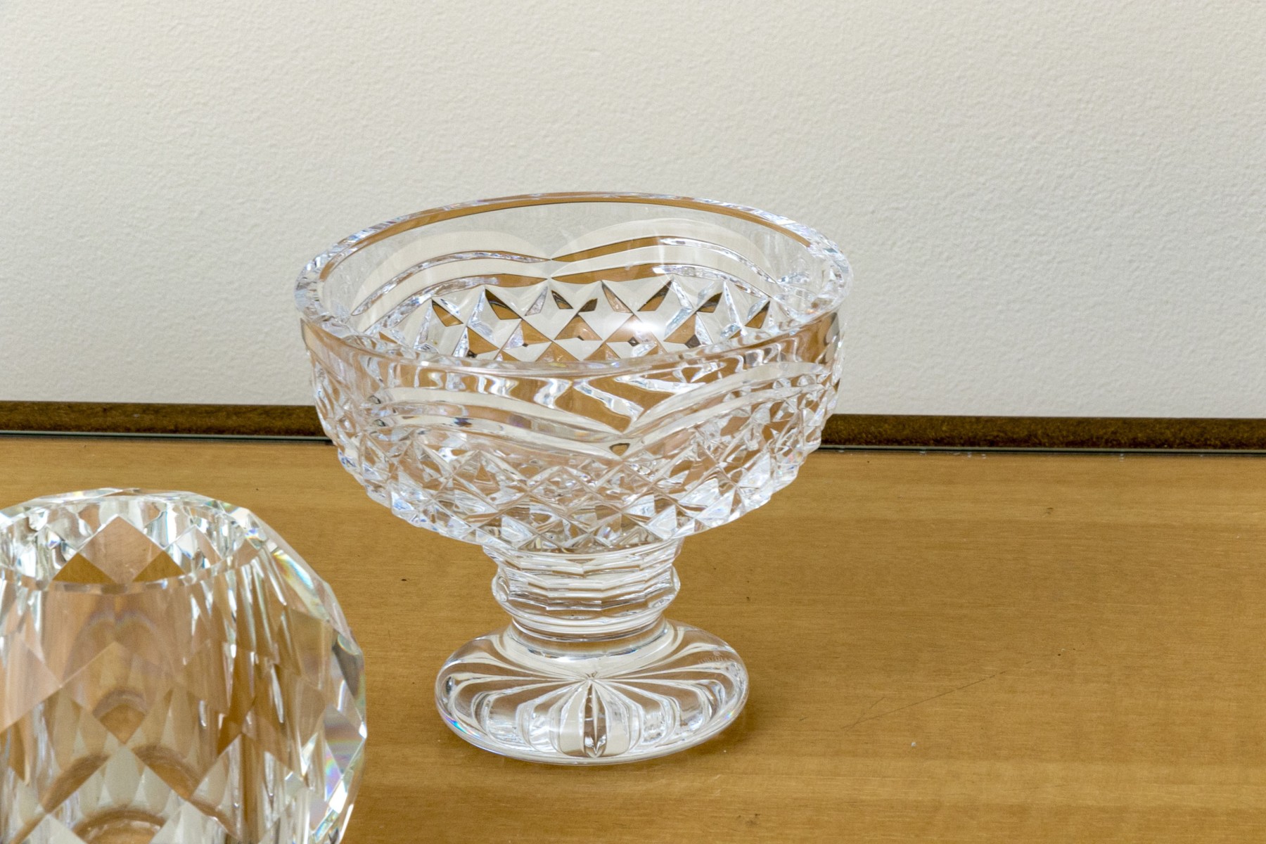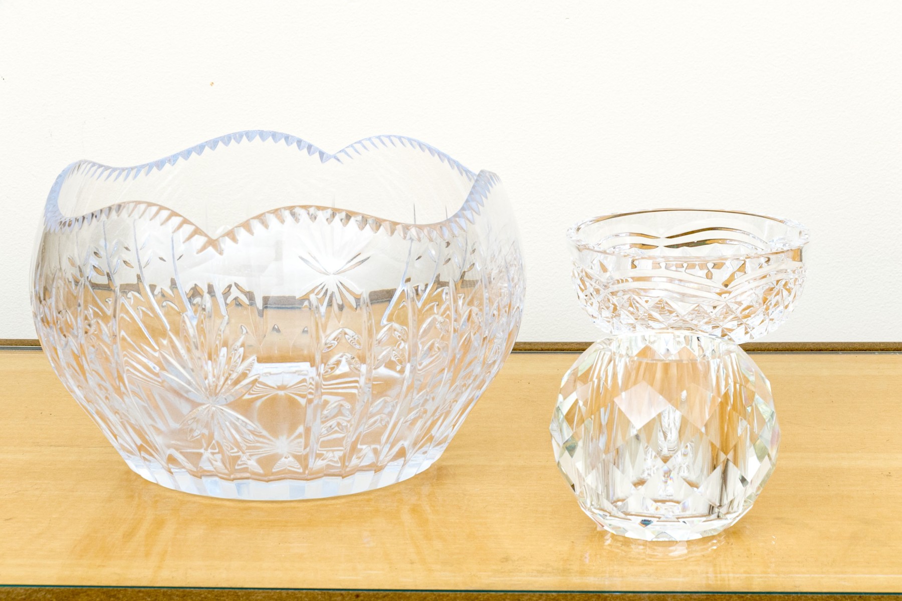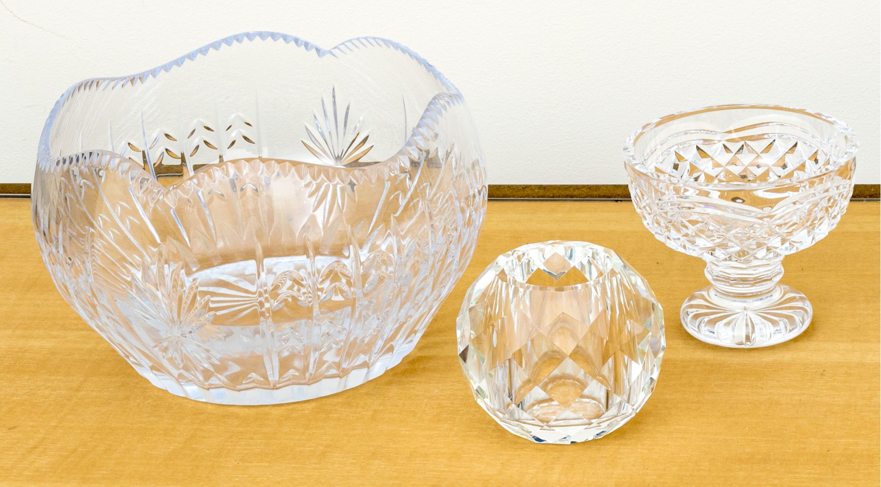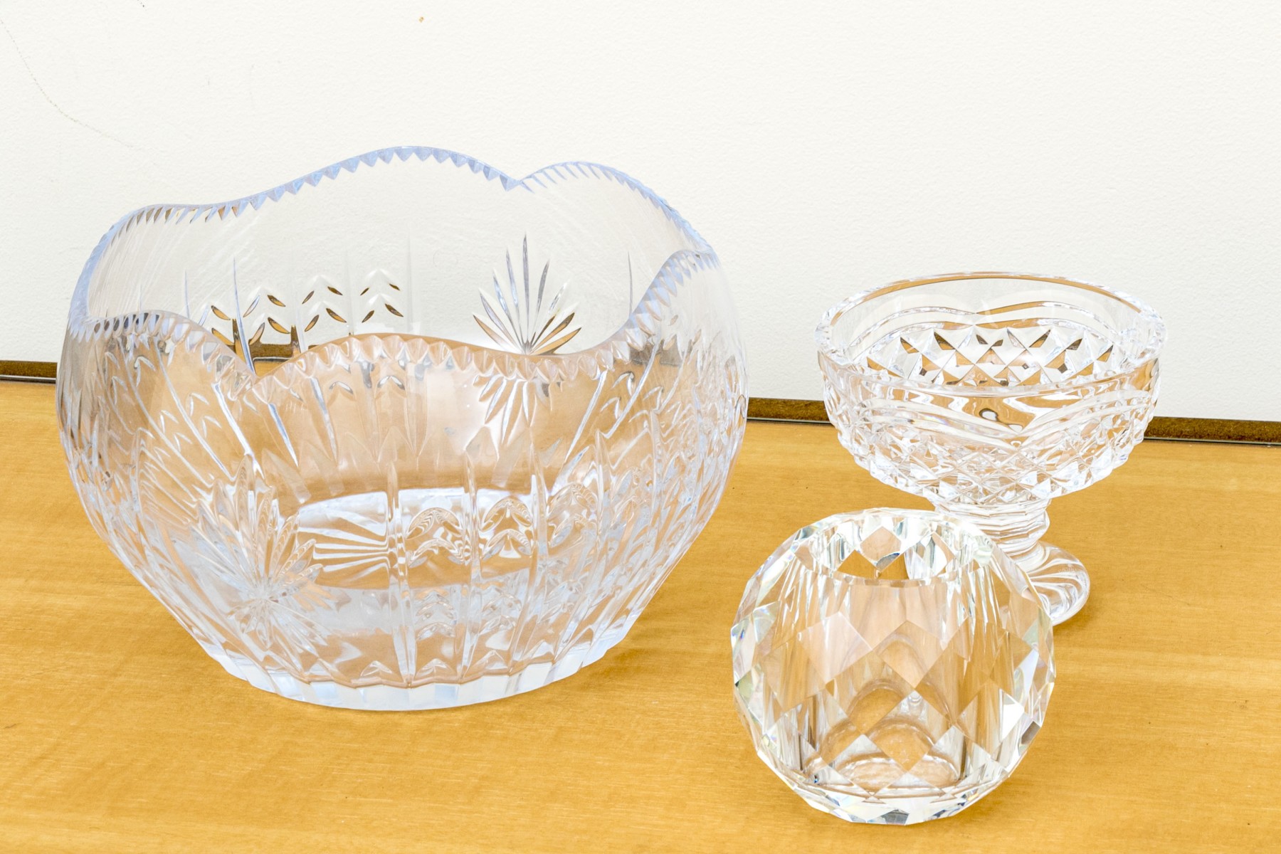 An excellent assortment of three crystal vessels. Comprised of a House of Igor Carl Faberge centerpiece bowl, a Waterford footed compote bowl, and a Ralph Lauren votive holder. All beautifully formed with decorative cut designs.