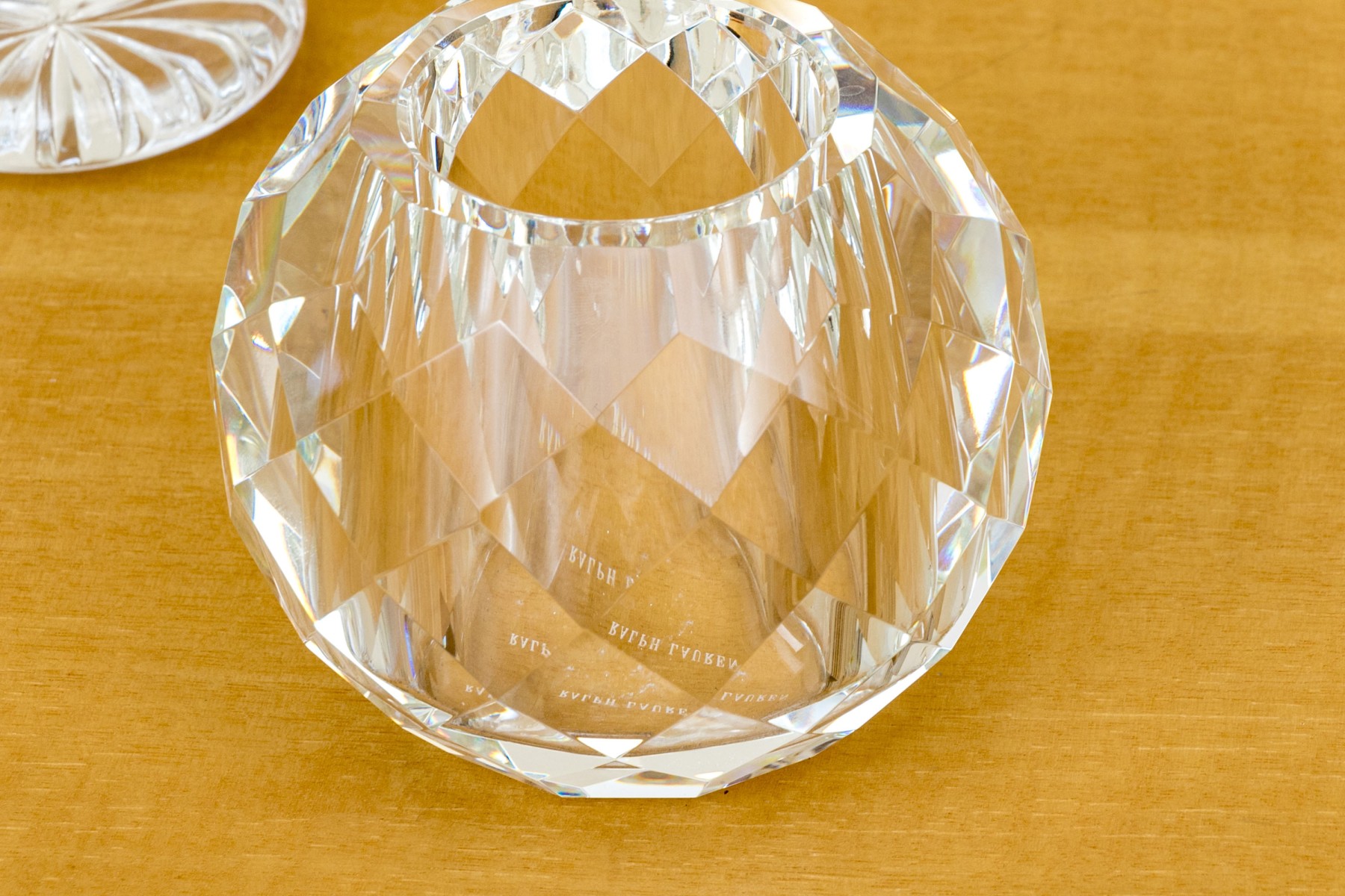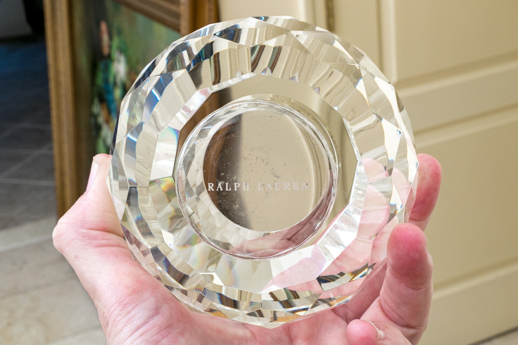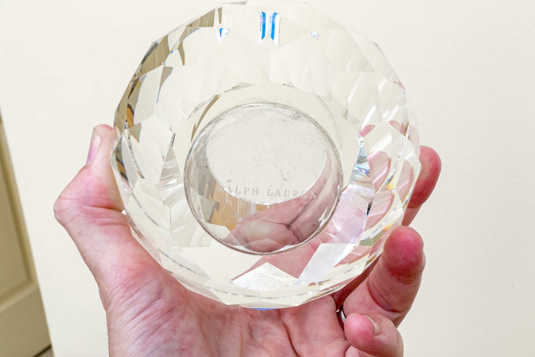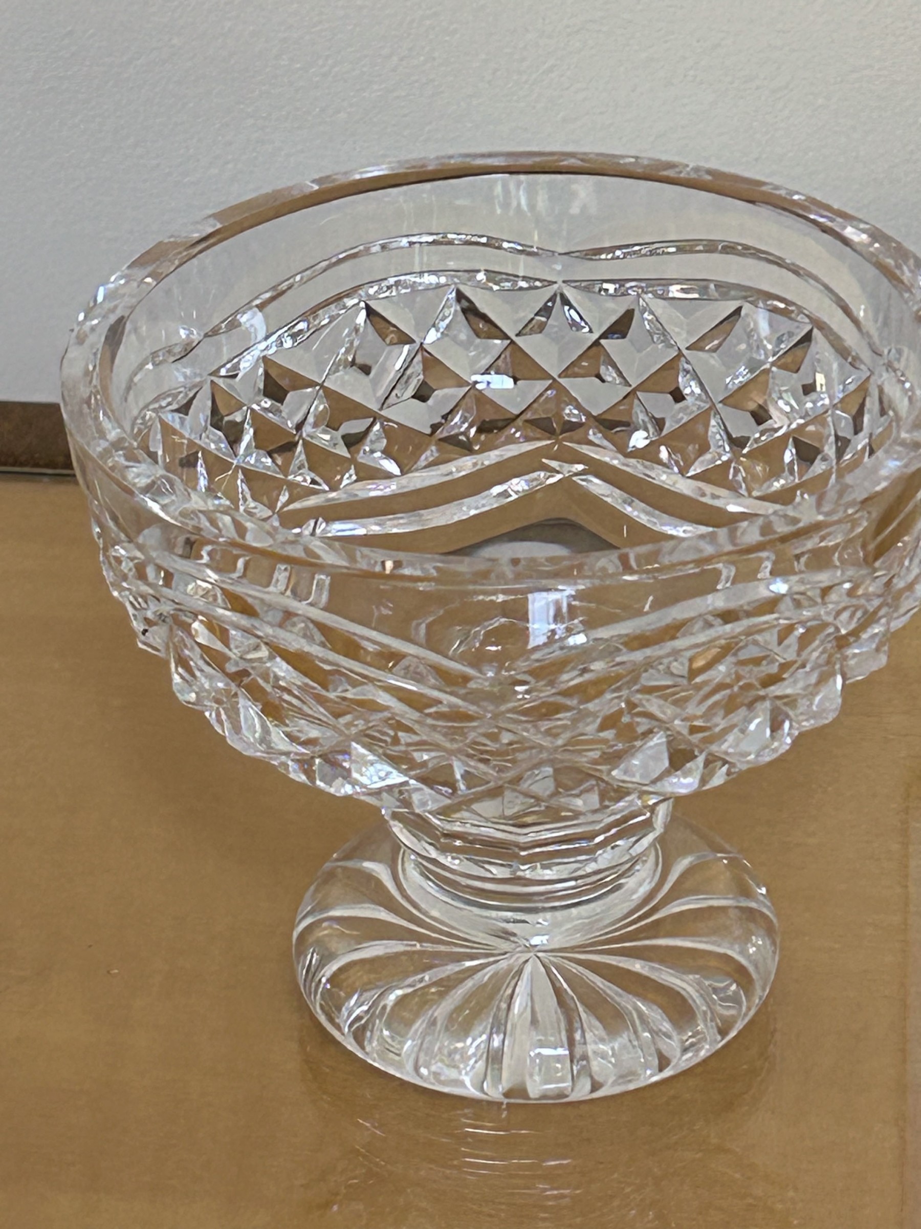 An excellent assortment of three crystal vessels. Comprised of a House of Igor Carl Faberge centerpiece bowl, a Waterford footed compote bowl, and a Ralph Lauren votive holder. All beautifully formed with decorative cut designs.