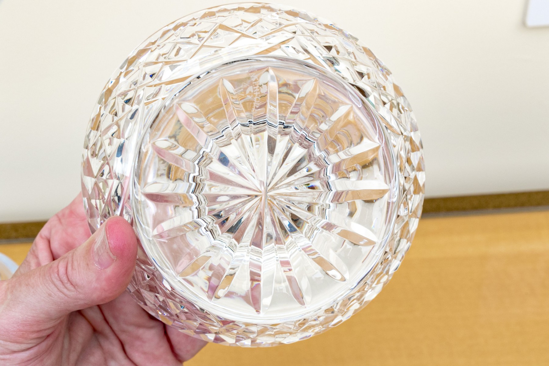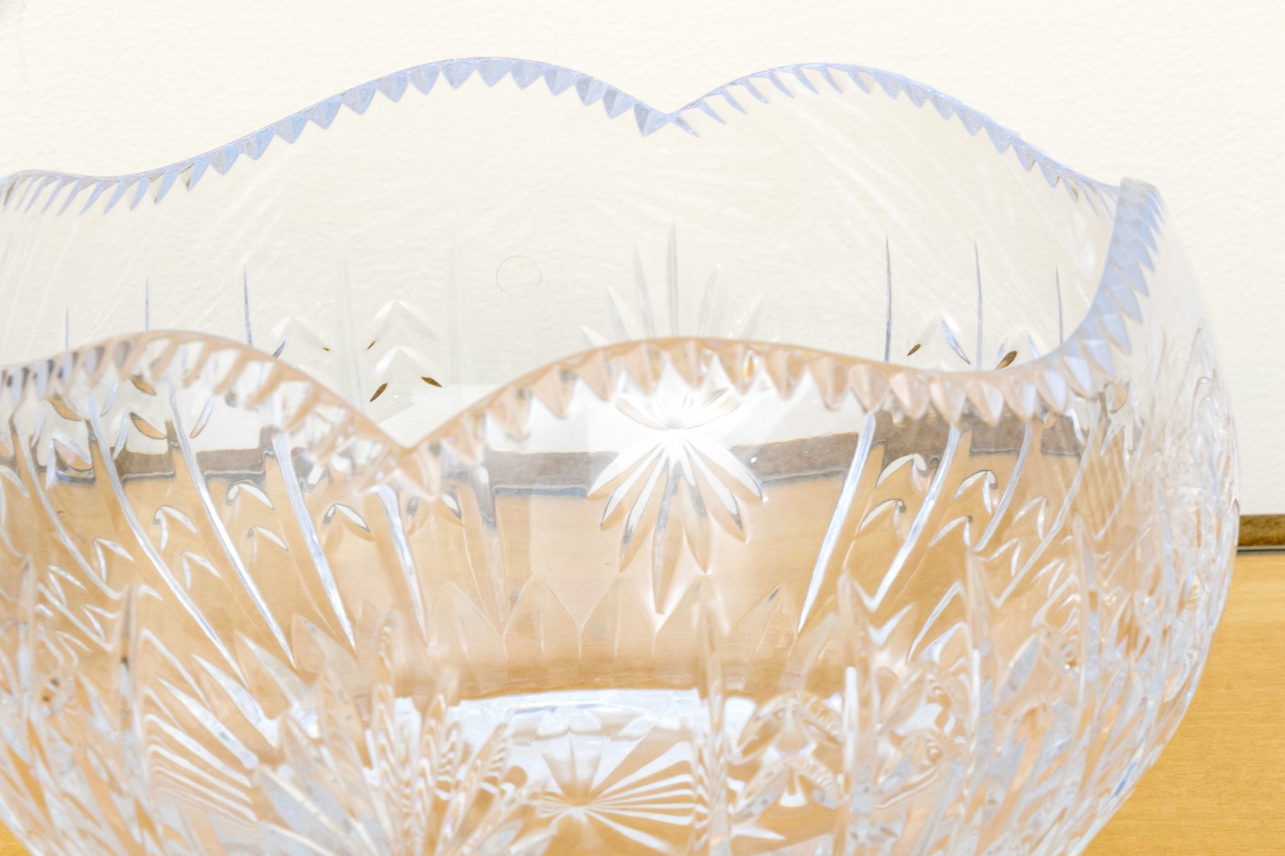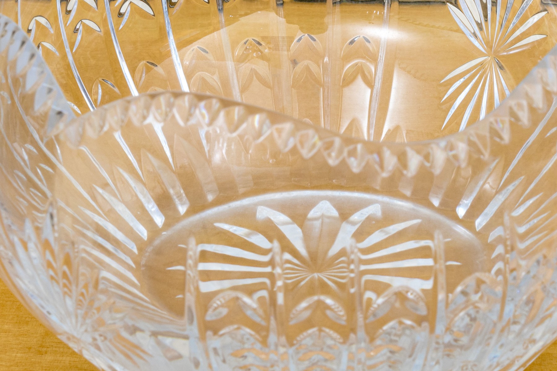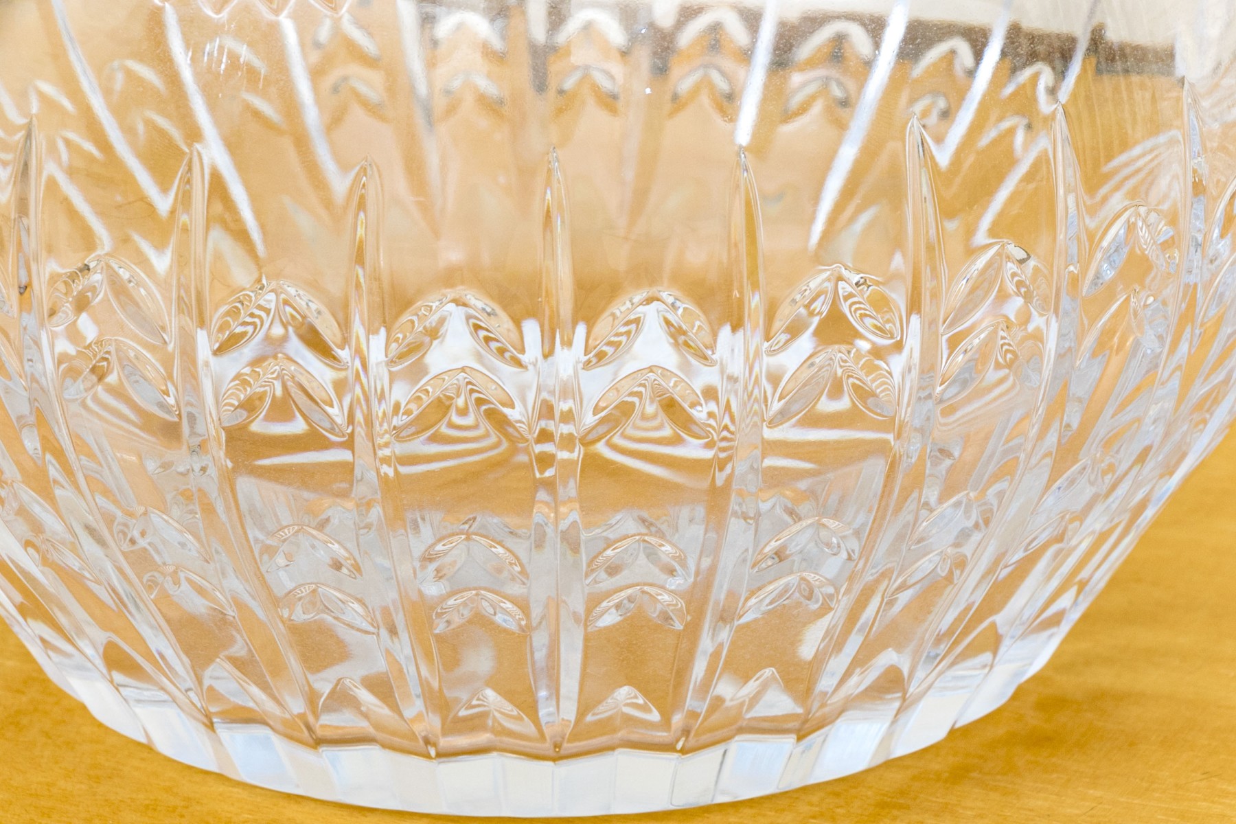 An excellent assortment of three crystal vessels. Comprised of a House of Igor Carl Faberge centerpiece bowl, a Waterford footed compote bowl, and a Ralph Lauren votive holder. All beautifully formed with decorative cut designs.