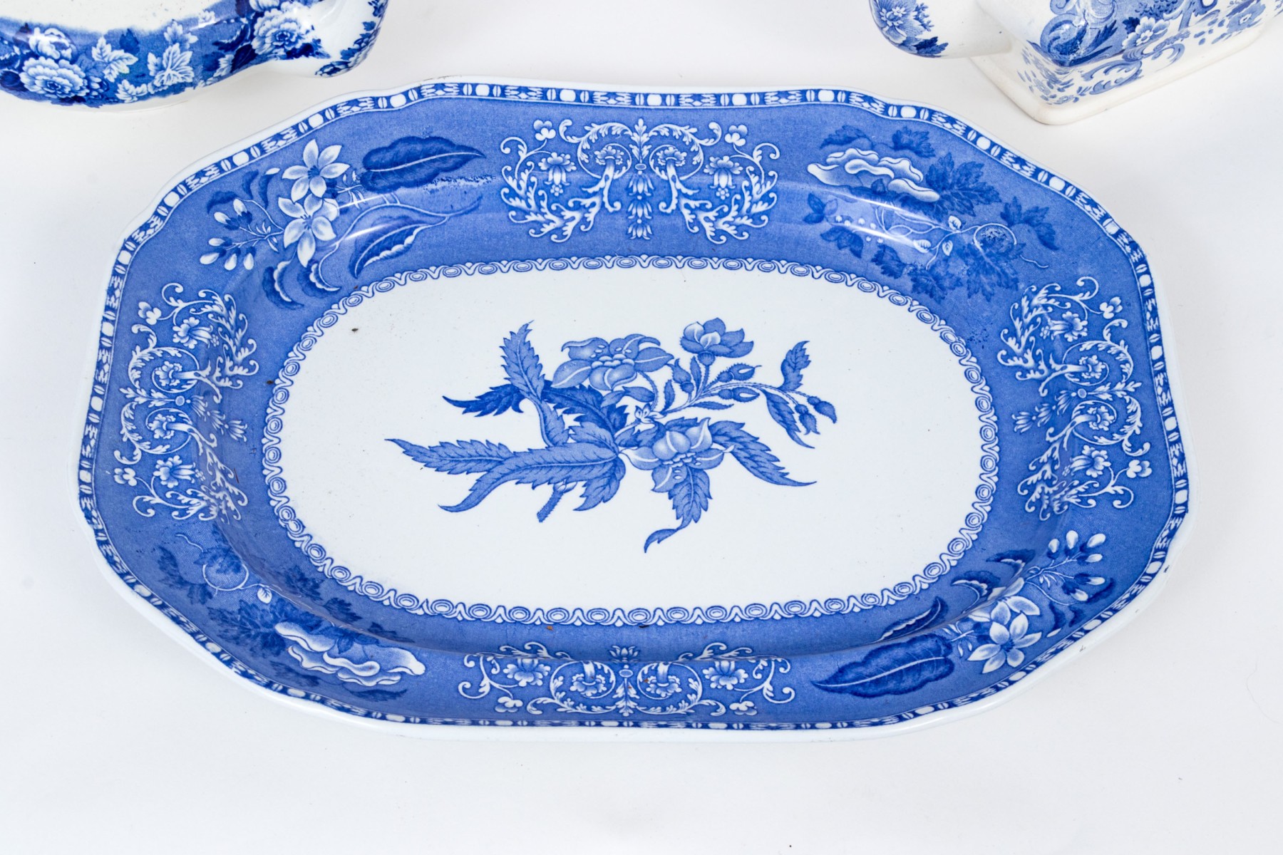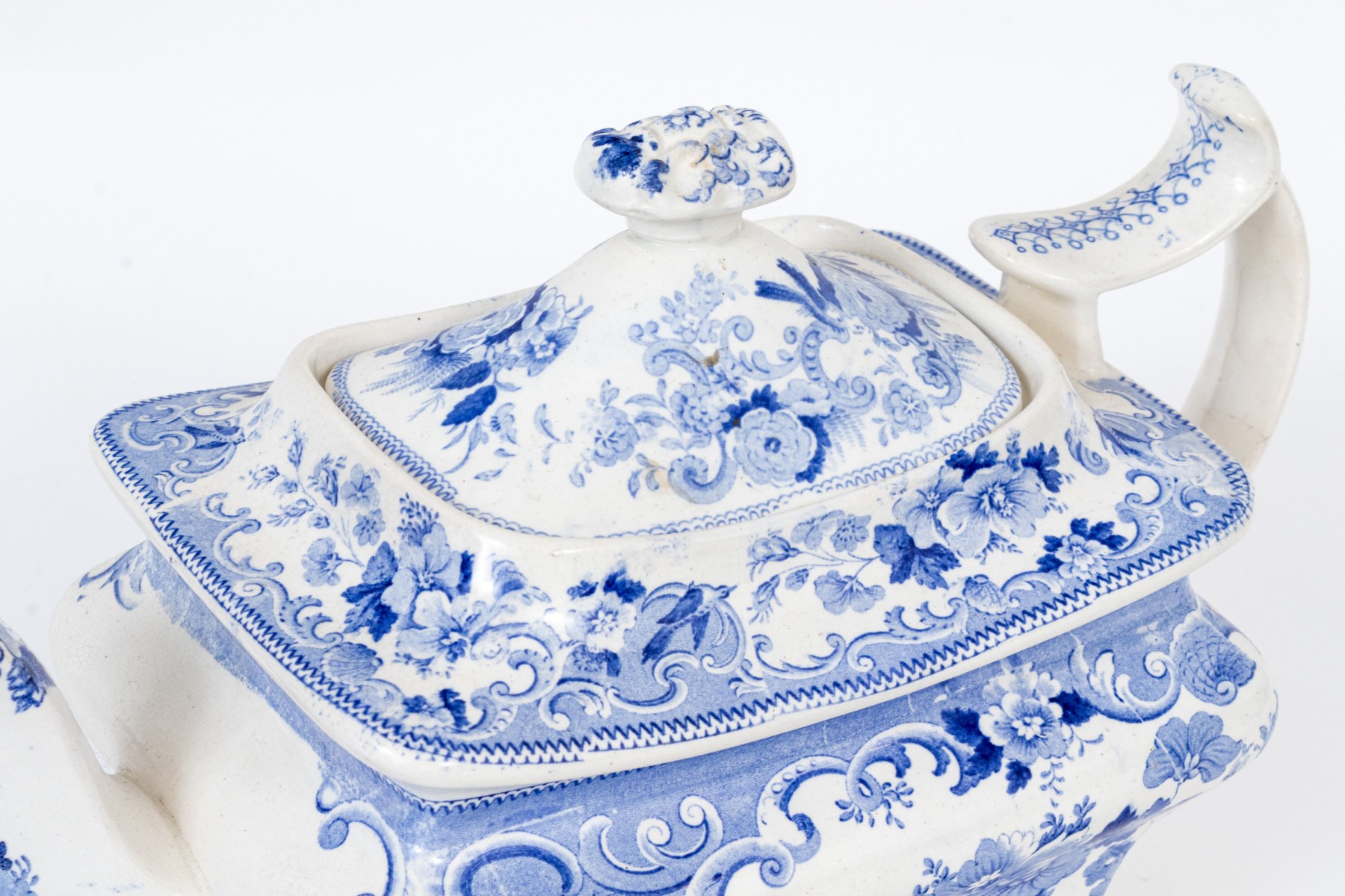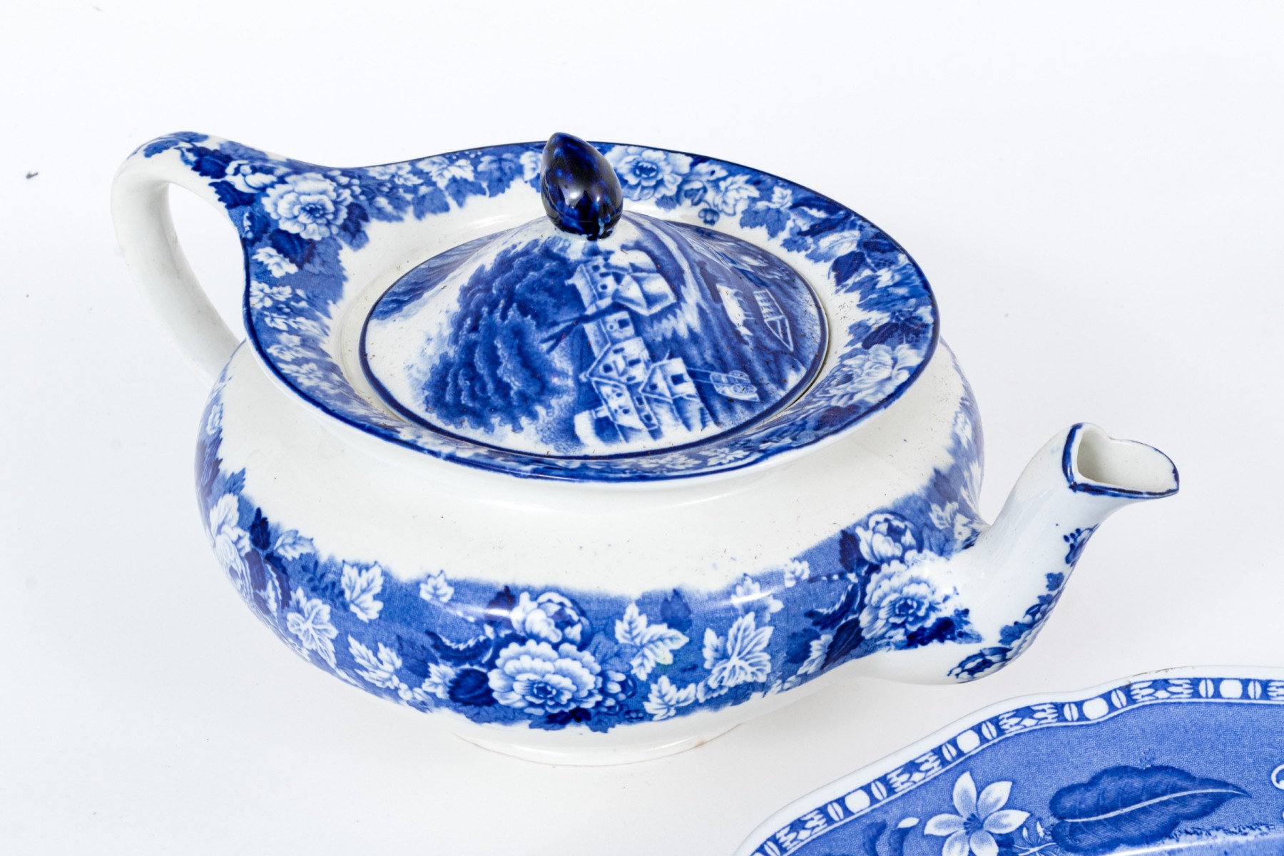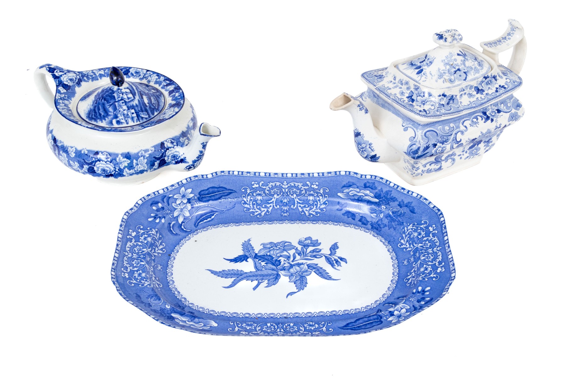 A fabulous trio of English blue and white ceramics including an Enoch Wood tea kettle, an unmarked bombe form kettle, and a Spode Copeland "Camilla" serving platter.