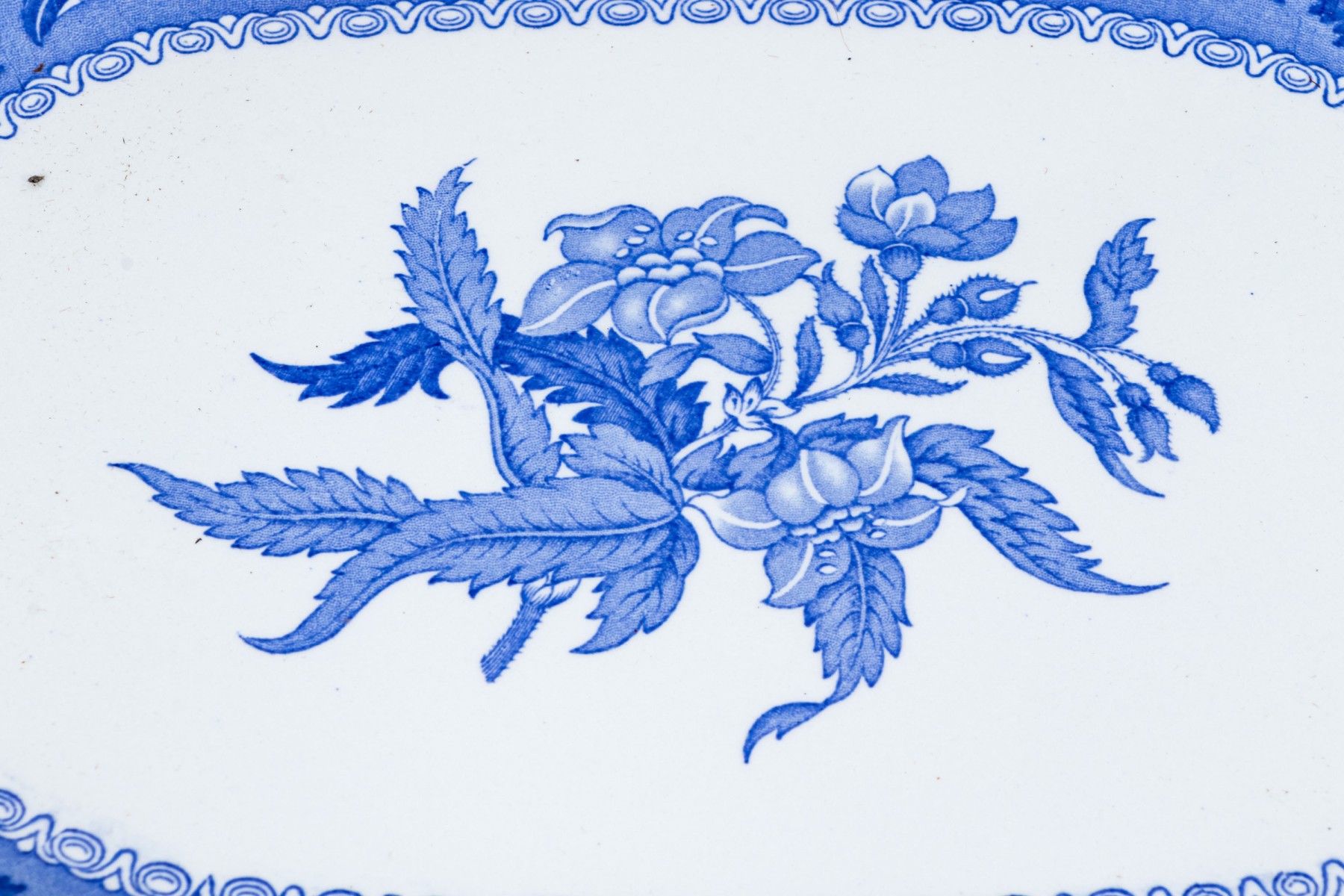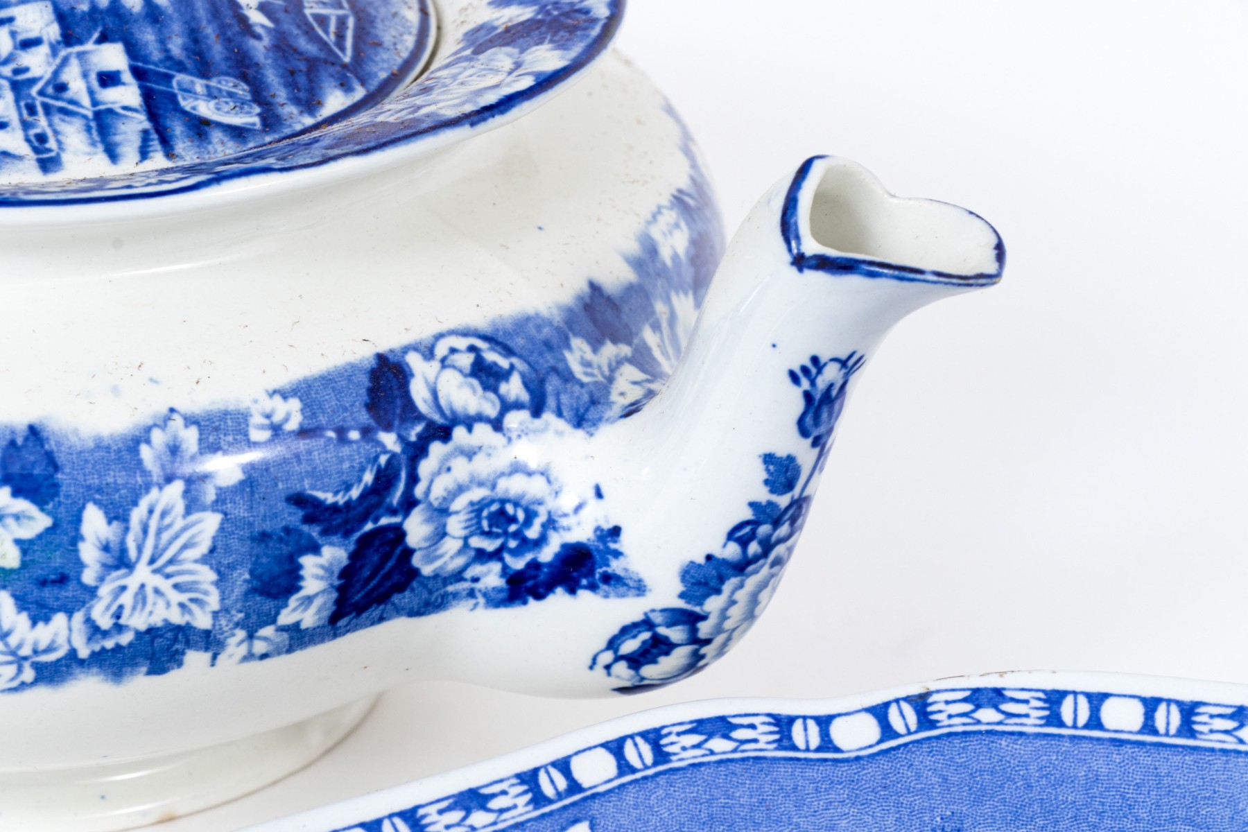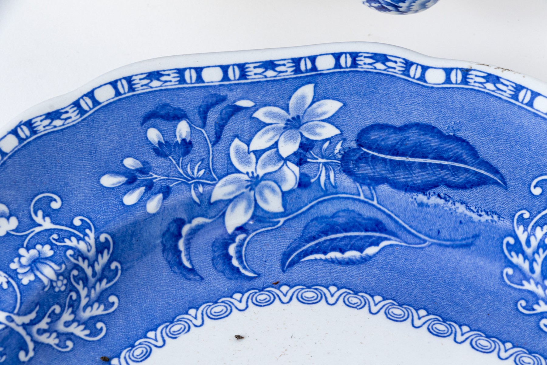 A fabulous trio of English blue and white ceramics including an Enoch Wood tea kettle, an unmarked bombe form kettle, and a Spode Copeland "Camilla" serving platter.
