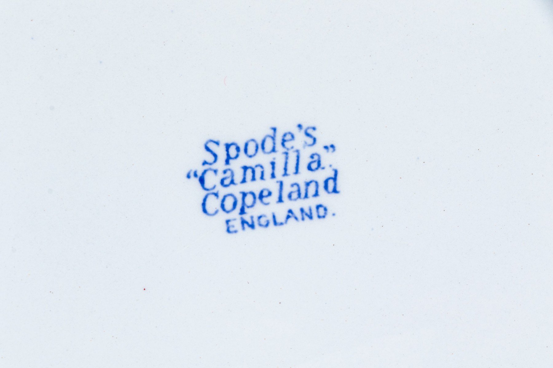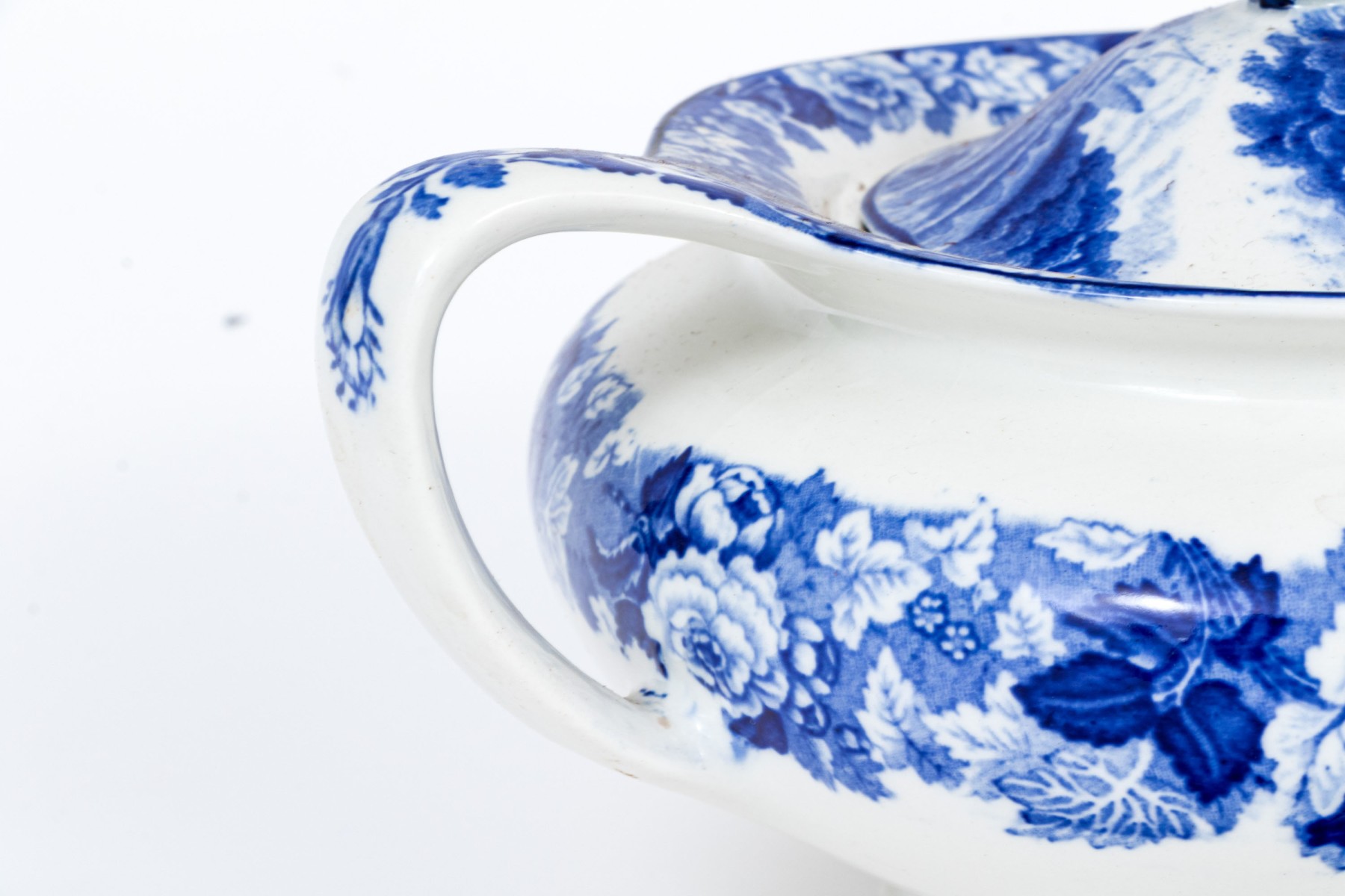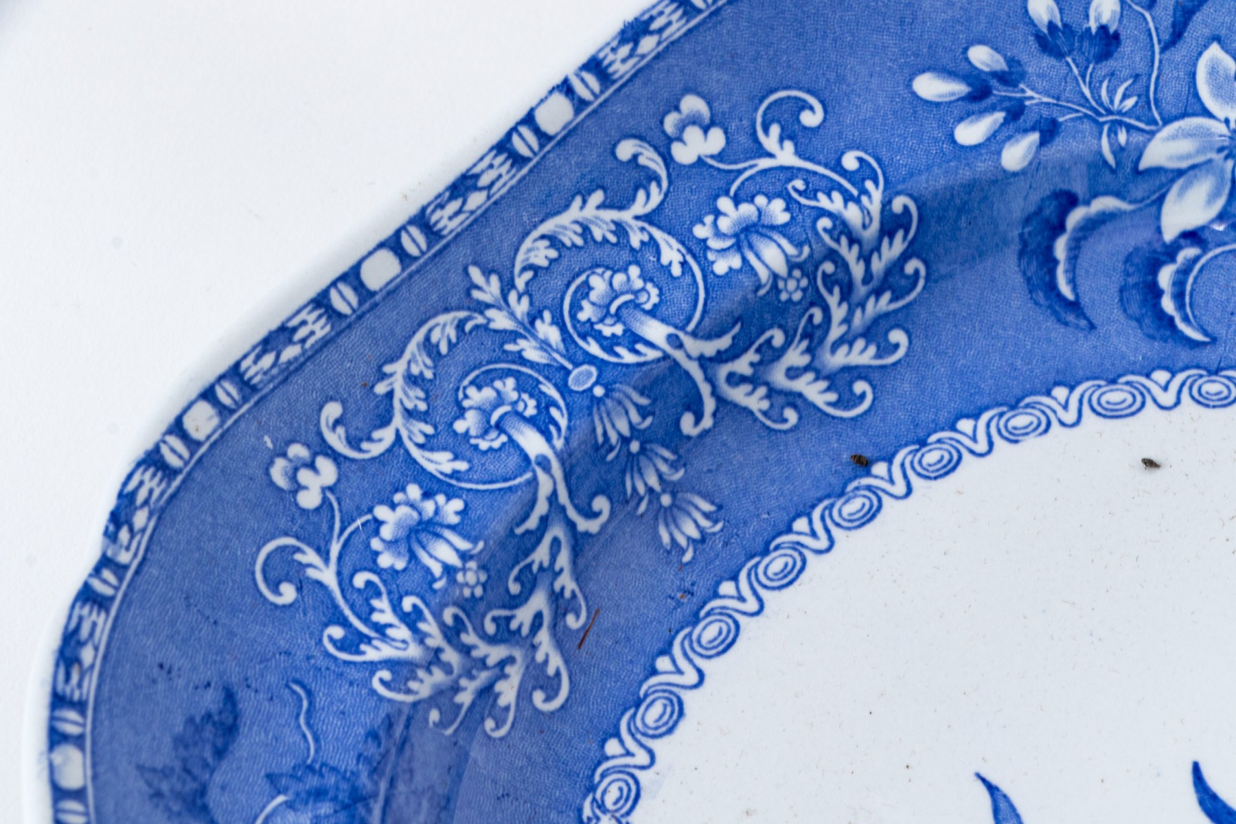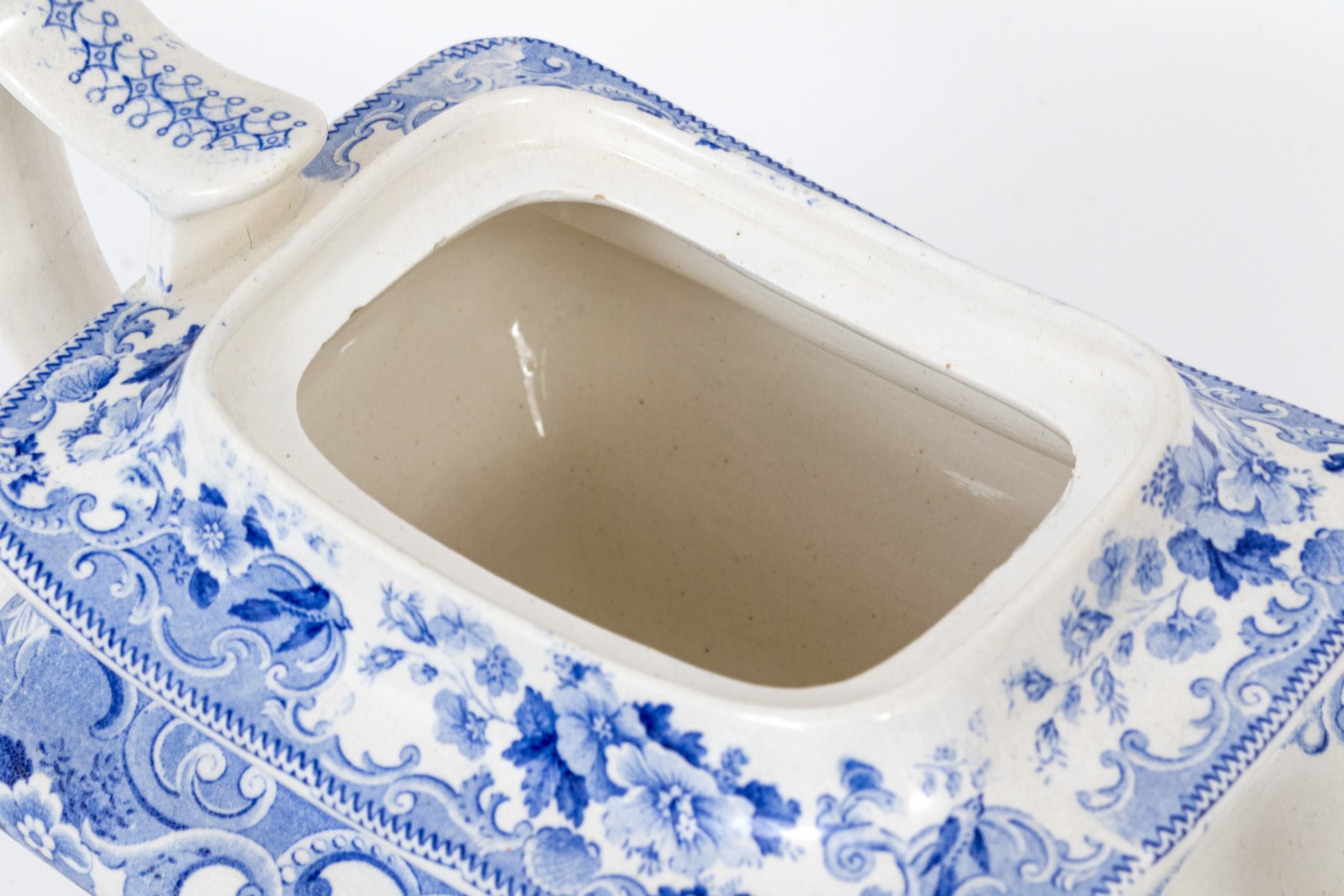 A fabulous trio of English blue and white ceramics including an Enoch Wood tea kettle, an unmarked bombe form kettle, and a Spode Copeland "Camilla" serving platter.