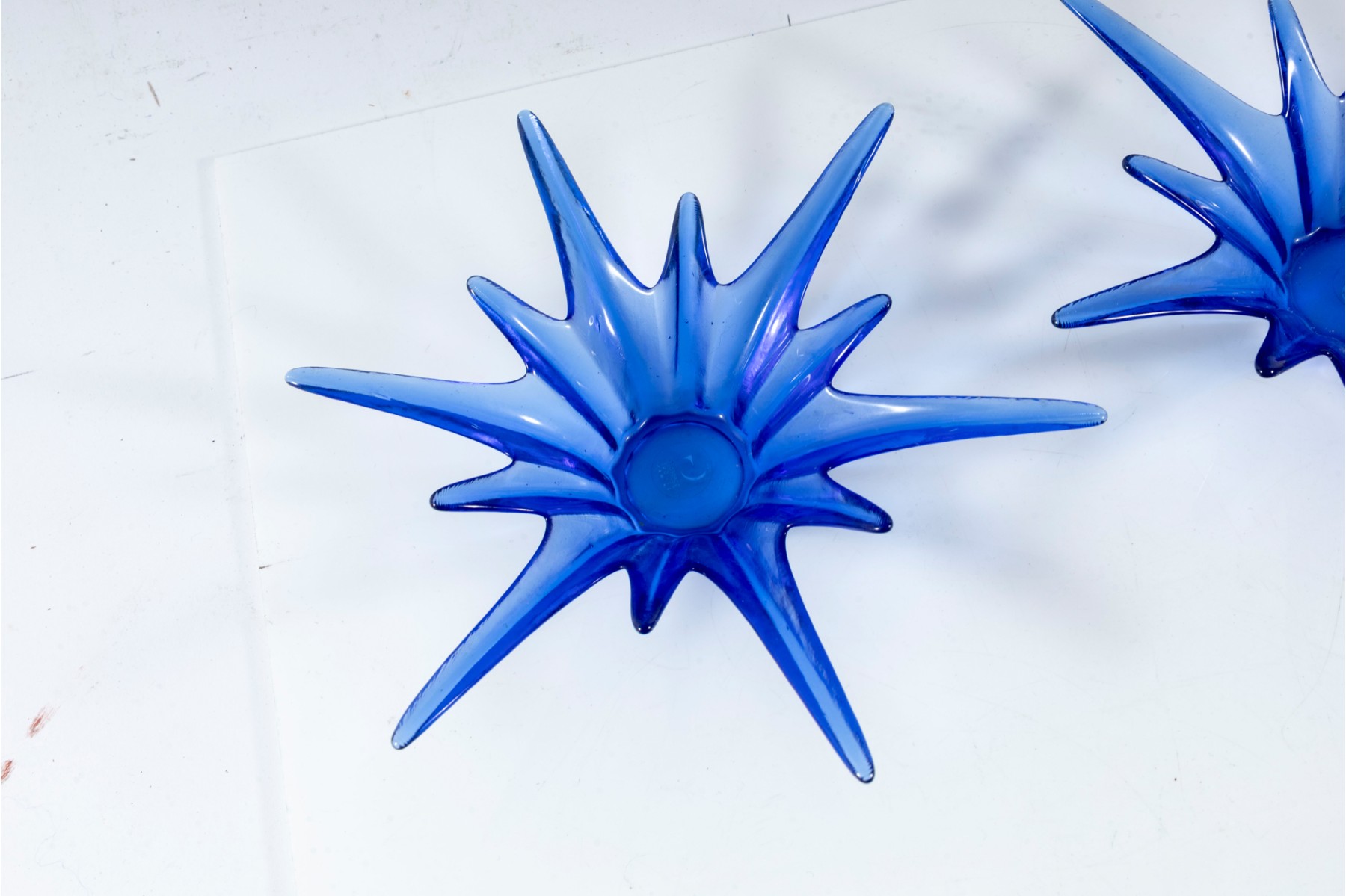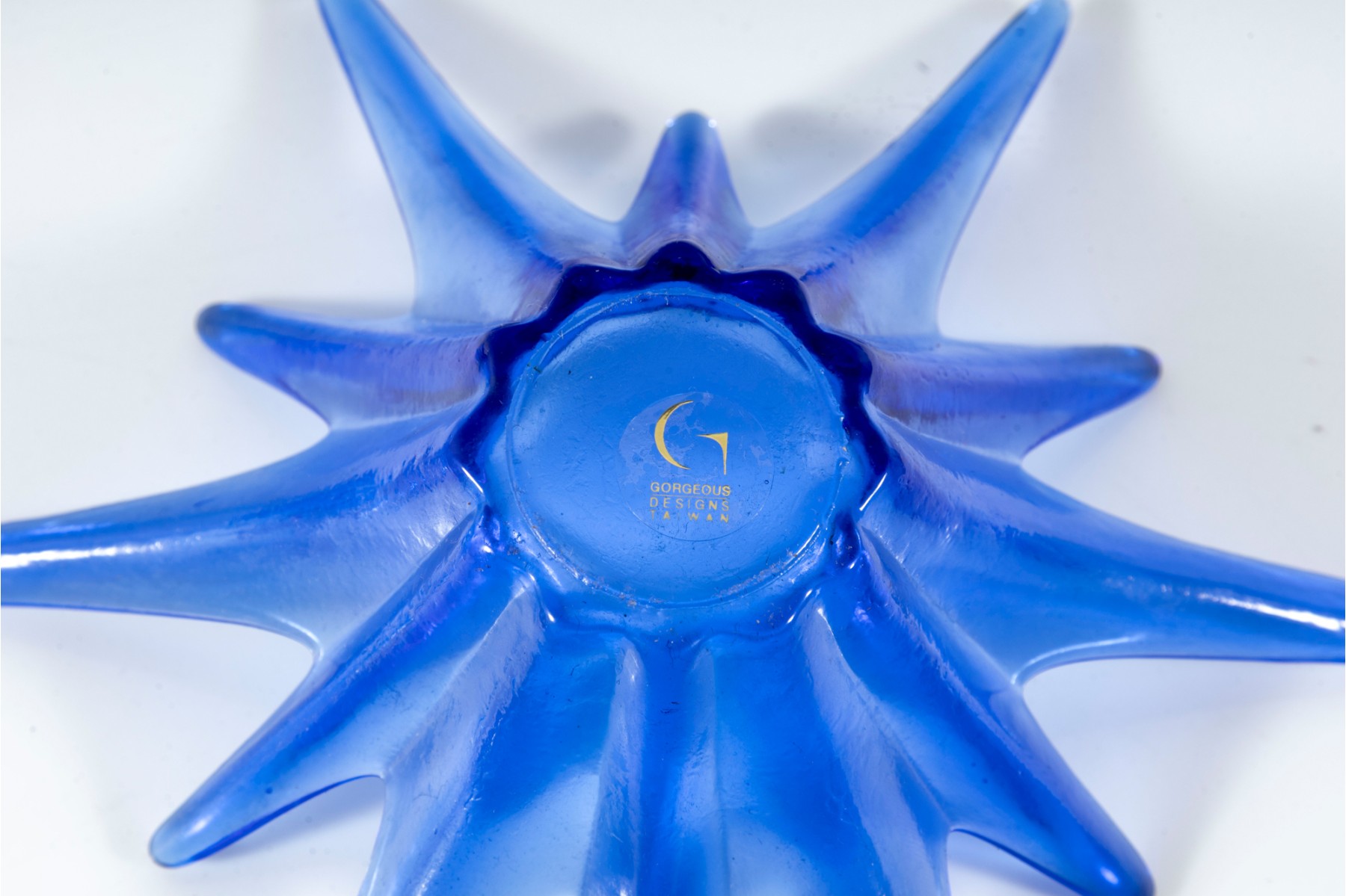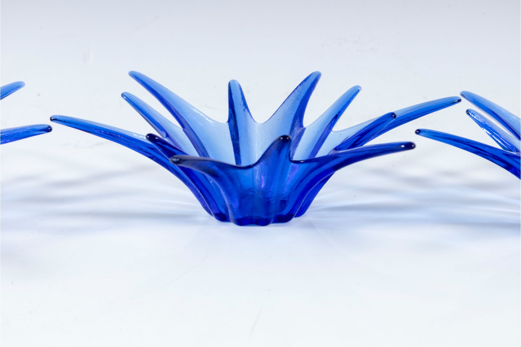 A set of three 'starburst' pattern cobalt glass votive/candy dishes produced by Gorgeous Designs, Taiwan.