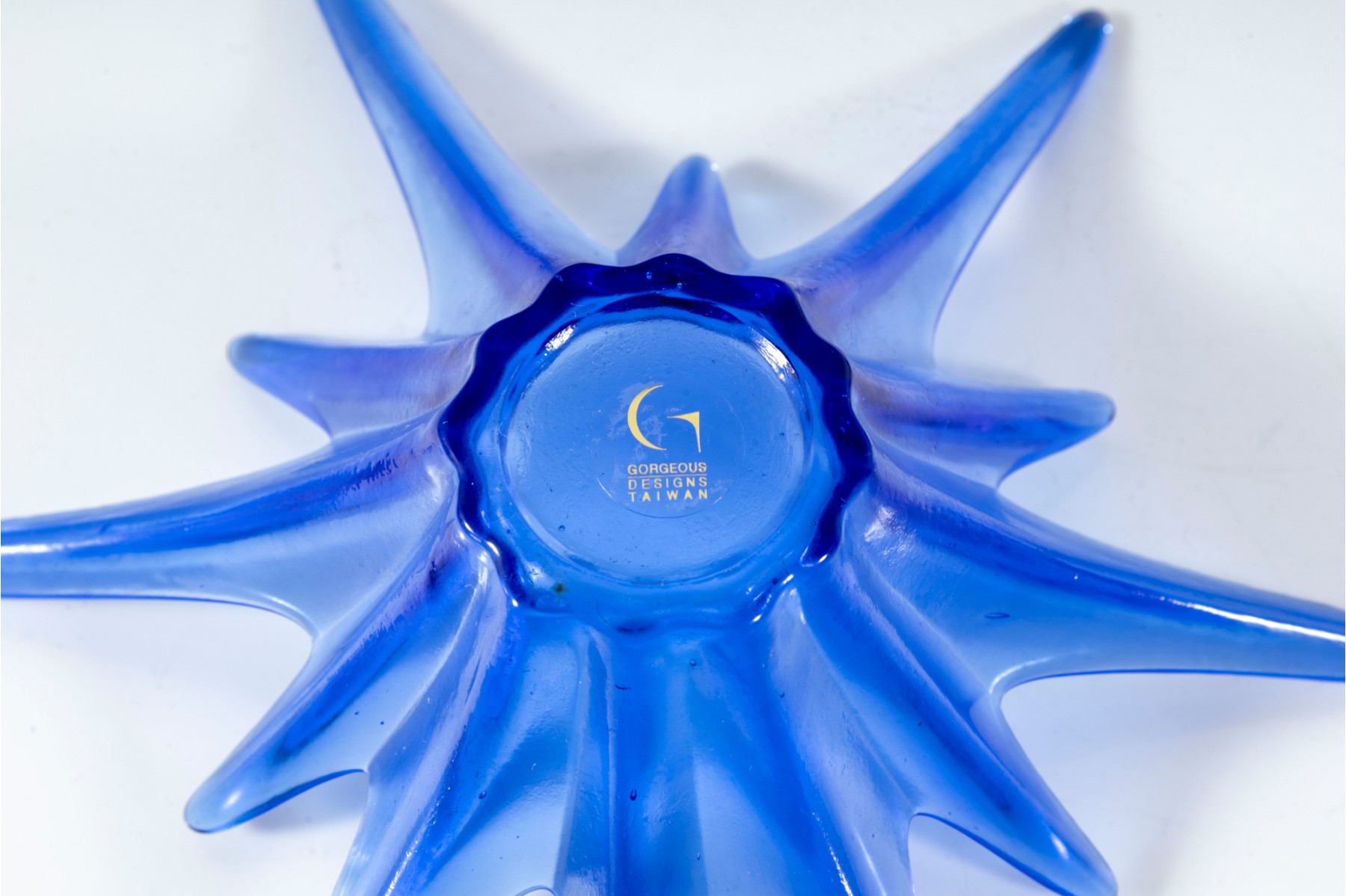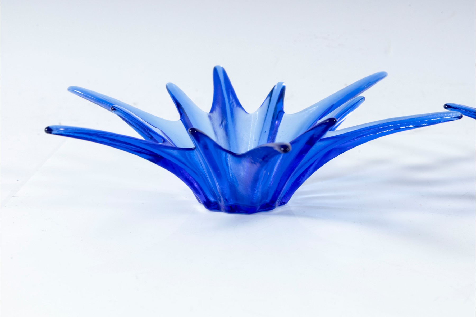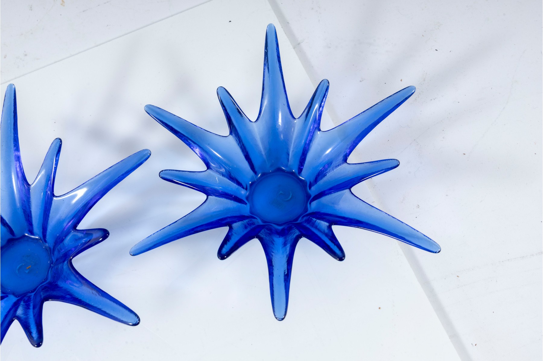 A set of three 'starburst' pattern cobalt glass votive/candy dishes produced by Gorgeous Designs, Taiwan.