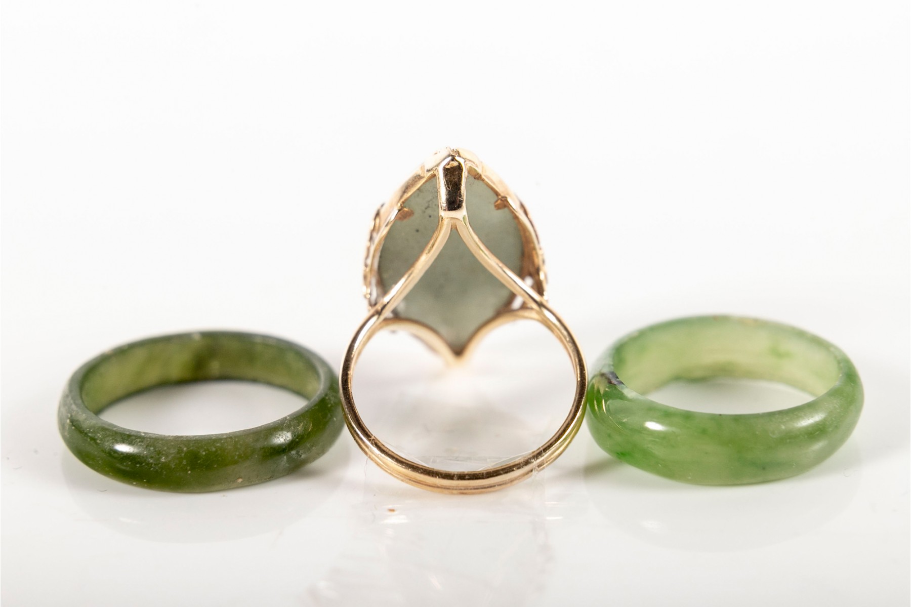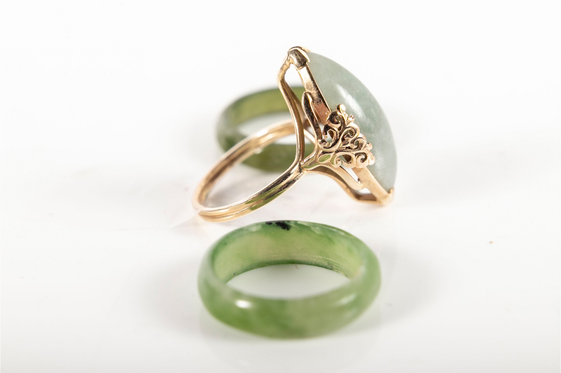A wonderful trio of jade rings. Two rings come in light and green infinity forms, size 6 and 4.75. The third ring displays a marquise icy green cabochon, with dainty pierced scrolls at the sides; size 4.5.
