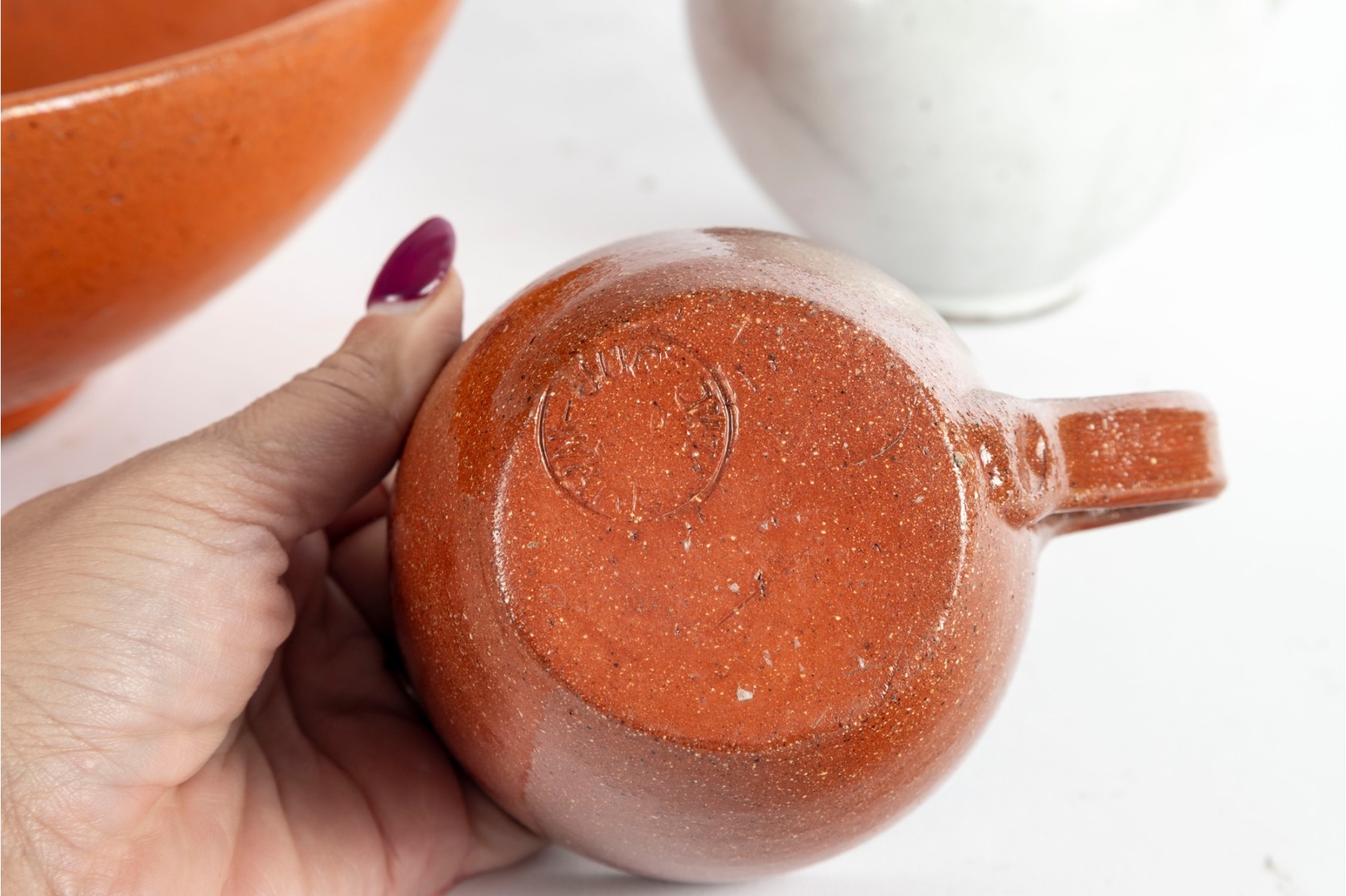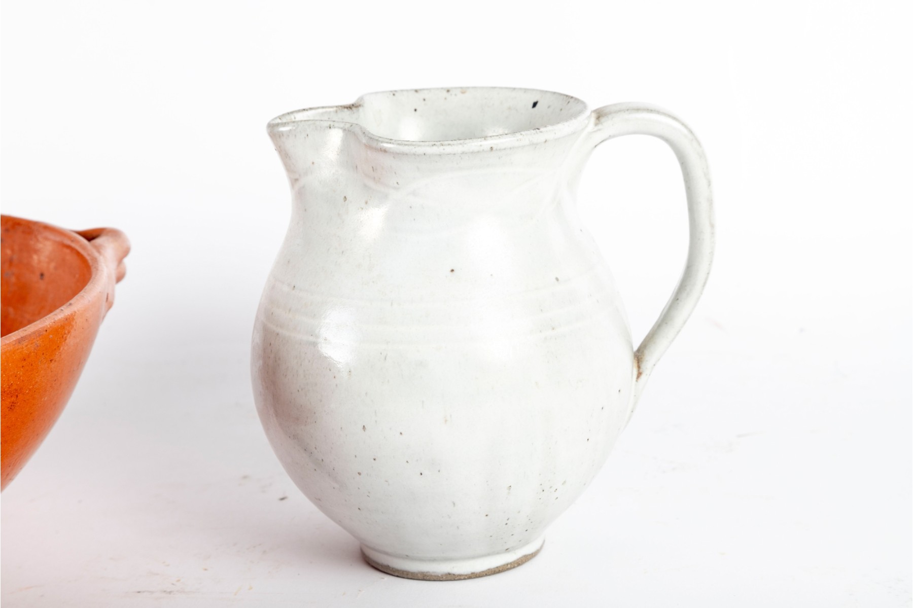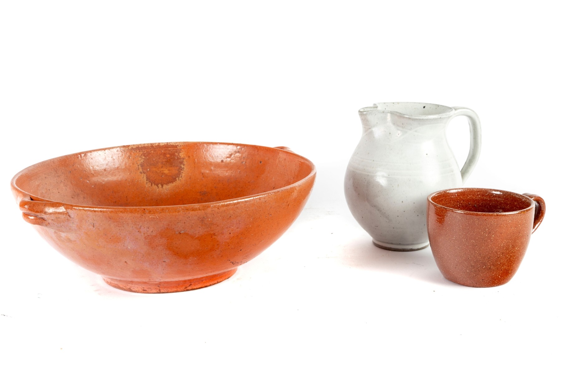 A wonderful trio of Jugtown Pottery ceramics including an orange serving or center bowl with stout twin handles, an orange mug with a rounded handle, and a white pitcher with a pinched spout and rounded handle. All marked underfoot.