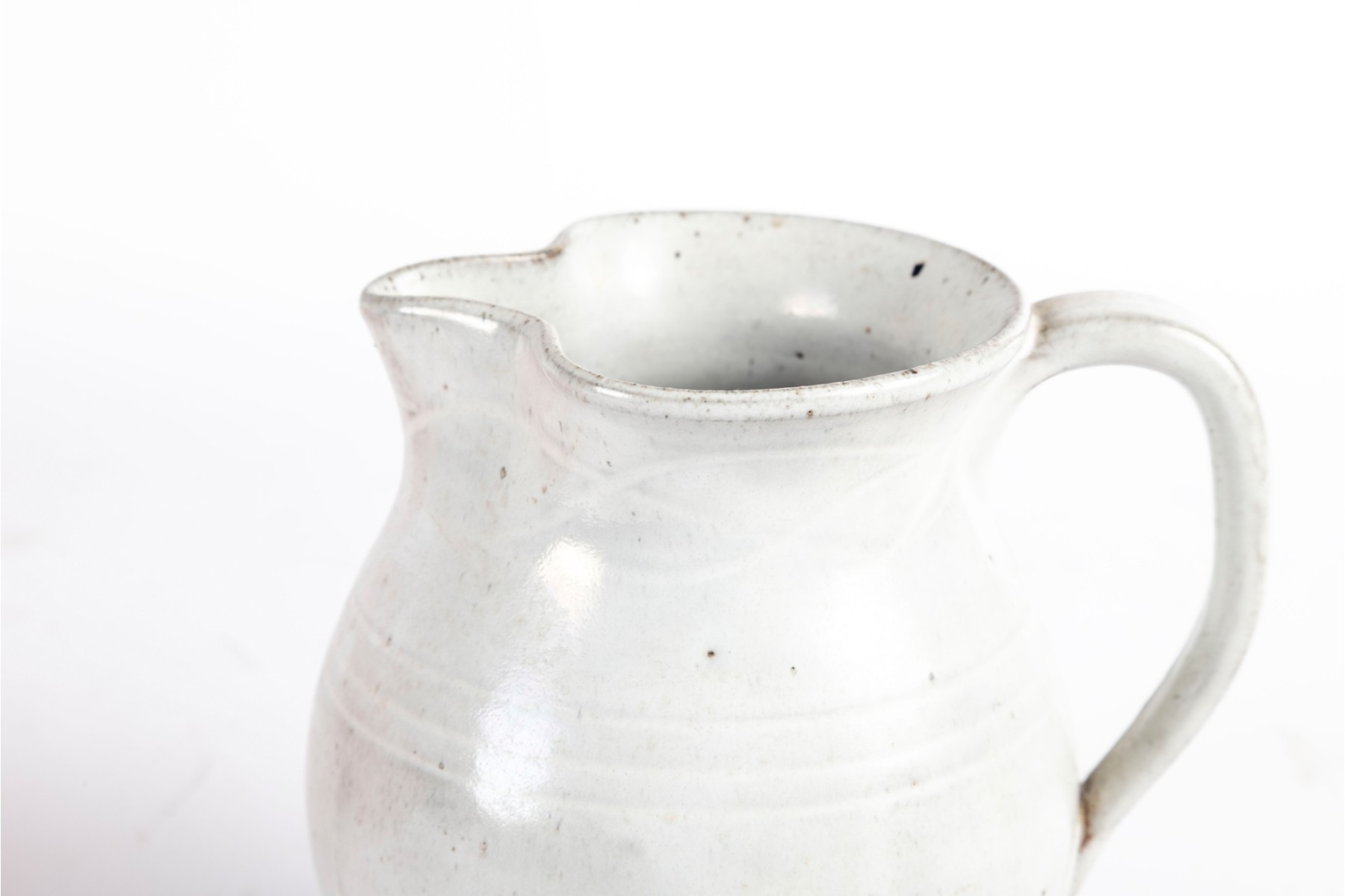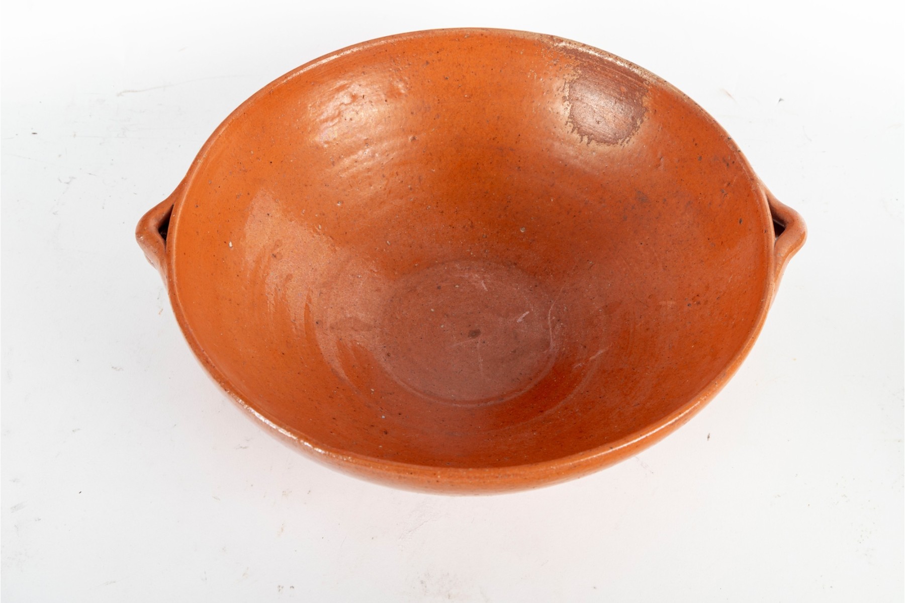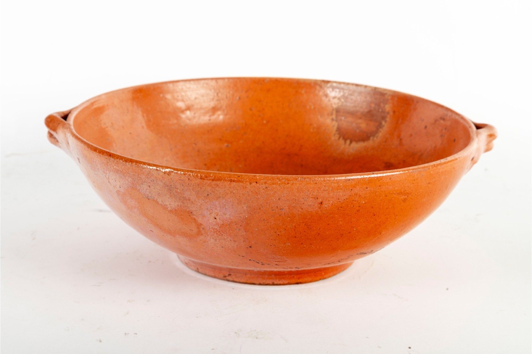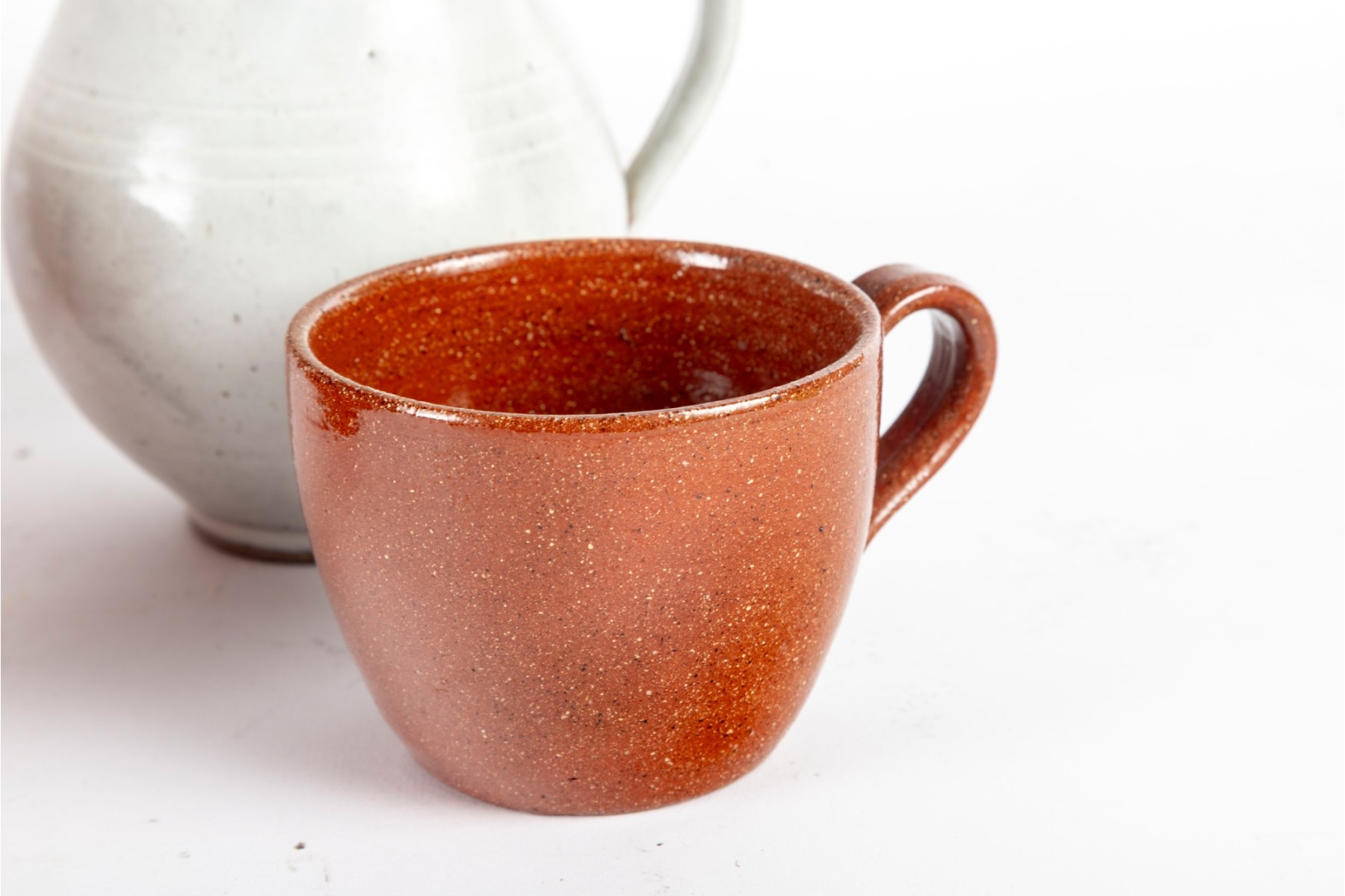 A wonderful trio of Jugtown Pottery ceramics including an orange serving or center bowl with stout twin handles, an orange mug with a rounded handle, and a white pitcher with a pinched spout and rounded handle. All marked underfoot.