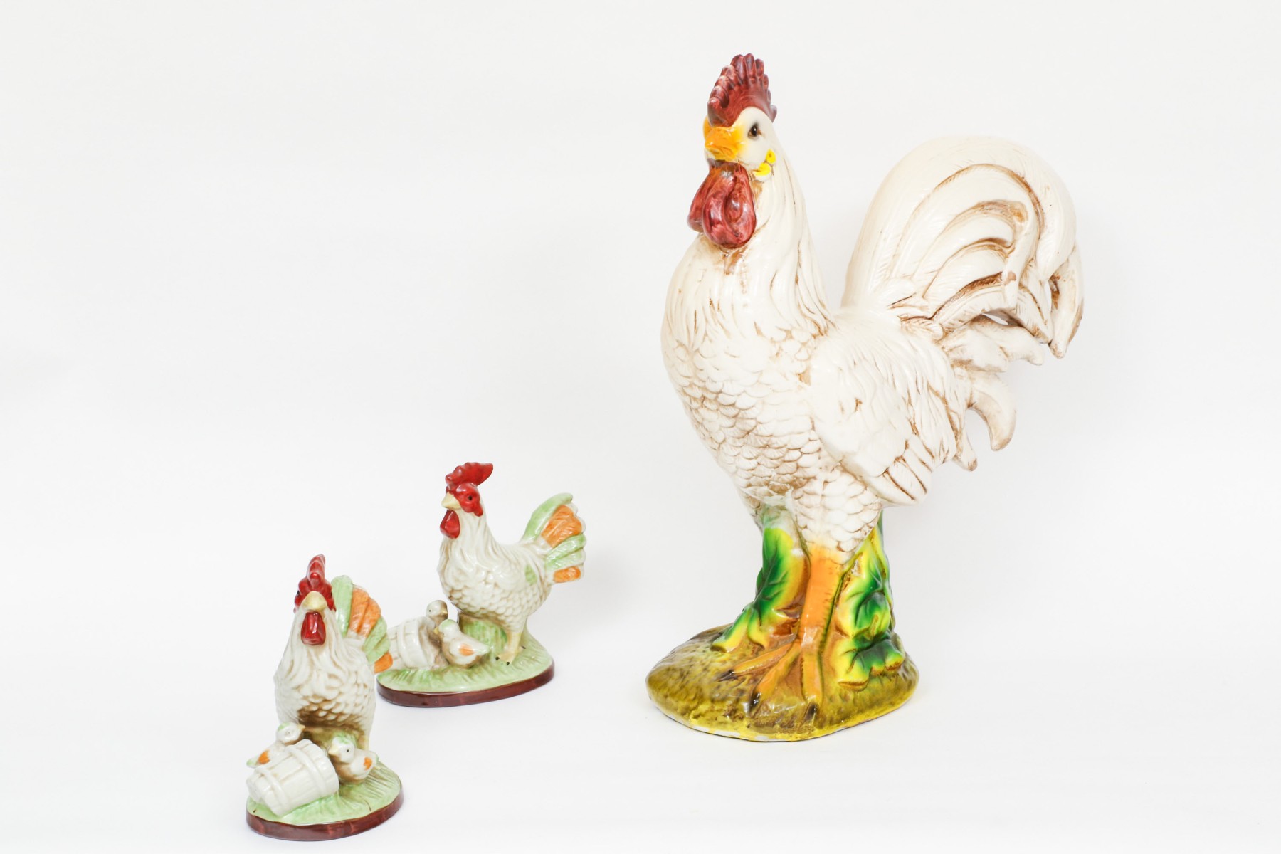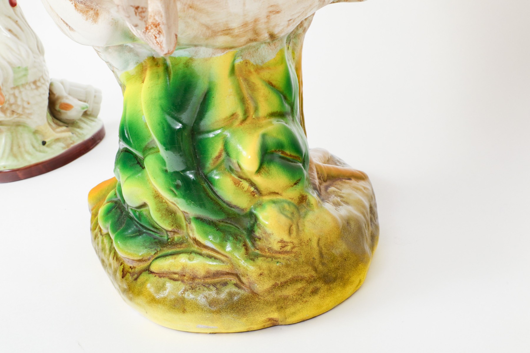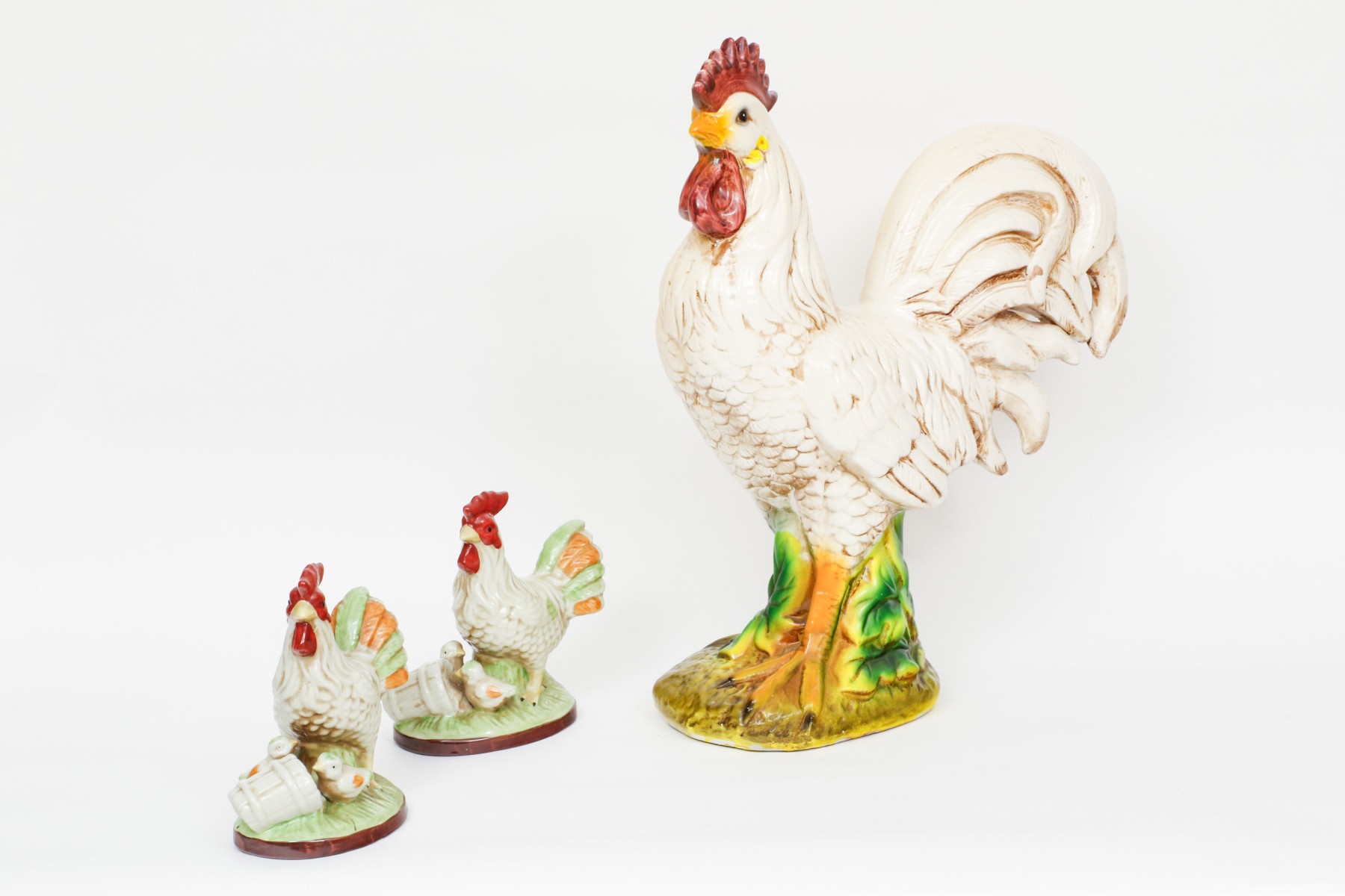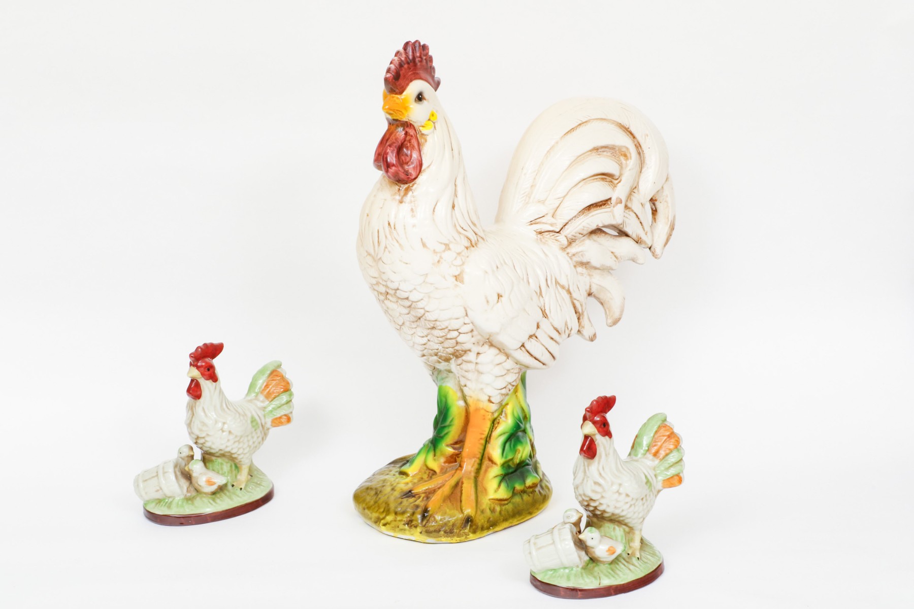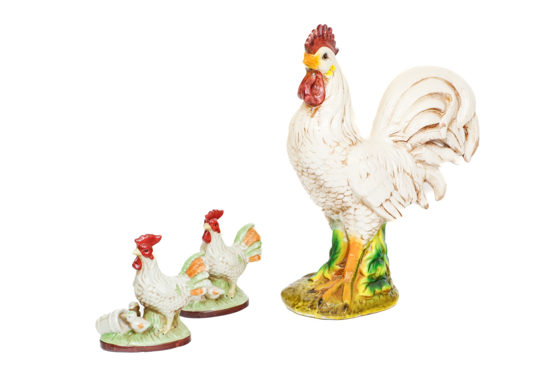 A wonderful garniture trio of Majolica style ceramic rooster figures. Includes two small matching figures and one large statue.